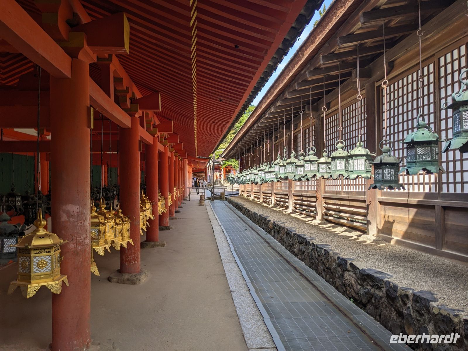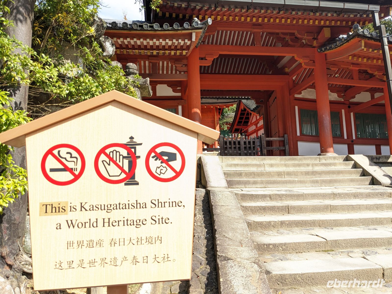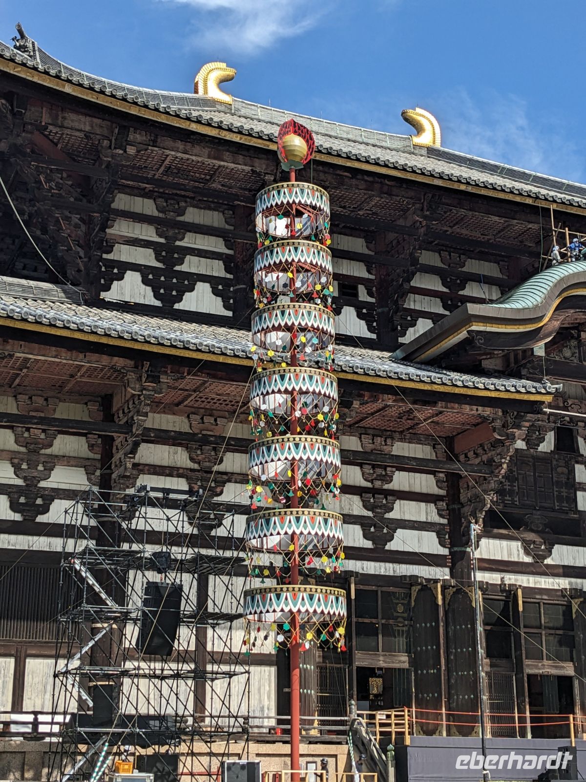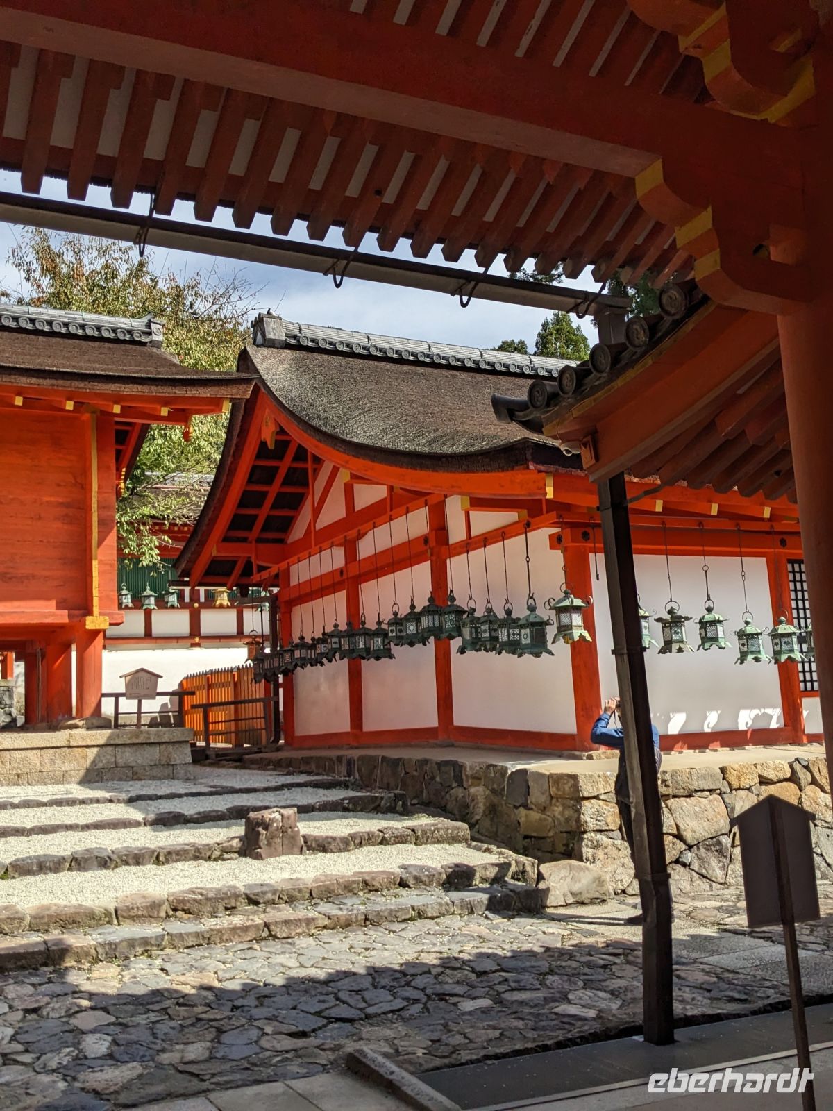 Unser letzter Ausflugstag barg nochmal ein ganz besonderes Highlight: das UNESCO-Dörfchen Nara, unweit von Kyoto. Mit dem Zug und Taxis erreichten wir das Gelände und wurden sogleich von den zahmen und teilweise sogar zudringlichen tierischen Bewohnern begrüßt. Von Scheu war hier keine Spur und die süßen Rehe hielten gespannt Ausschau, ob wir nicht doch irgendwo etwas zu essen dabei hätten. Es machte Spaß die Vierbeiner zu beobachten, doch nachdem wir alle mit den Taxis eingetroffen waren, machten wir uns sogleich auf den Weg die größte bronzene Buddhastatue der Welt zu bestaunen, welche sich zudem in dem größten Holzgebäude der Welt befand - also gleich doppelt beeindruckend. Hier wurde gerade ein großes Fest vorbereitet, welches das Jubiläum der Anlage zelebrieren sollte. In der Halle angekommen, sahen wir die gigantischen Ausmaße der Statue und legten einen kleinen Rundgang ein. Am hinteren Ende des Raumes befand sich eine Säule, durch die ein Loch geschlagen war. Viele Leute, vor allem Schüler, standen an, um sich durch dieses Loch hindurchziehen zu lassen - Schnappschüsse durften hier natürlich auch nicht fehlen. Etwas skurril, aber laut Masayo sollte dies den Teilnehmenden Glück bringen. Anschließend spazierten wir weiter durch den Park und legten schließlich eine Mittagspause ein. Dabei ging ein Teil der Gruppe mit Masayo und probierte eine landestypische Nudelsuppe, während ich mit dem zweiten Teil Quiche sowie Kuchen in einem naheliegenden Restaurant aß. Beide Gruppen waren sehr zufrieden und gestärkt machten wir uns dann gemeinsam auf den Weg zum Kasugataisha-Schrein. Von dort liefen wir zum Parkplatz, wo sich viele bei dem schönen Wetter noch ein Eis holten und wir dann den Bus zum Bahnhof nahmen. Es ging zurück nach Kyoto. Nach einer kurzen Pause am Hotel fuhren wir zu unserem letzten gemeinsamen Abendessen in ein Restaurant, was beinahe einem Labyrinth glich, so verwinkelt war es. Aber trotz der Irrgänge fand das leckere Essen irgendwann schließlich zu uns und wir kamen nochmals in den Genuss einiger japanischen Köstlichkeiten. Ich nutzte die entspannte Atmosphäre für ein paar dankende Worte an Masayo und die Übergabe eines kleinen Geschenks im Namen von Eberhardt TRAVEL, womit meine liebe Gruppe hoffentlich Zuhause fleißig übt, sodass alle für die nächste Reise in den asiatischen Raum gewappnet sind. Zurück im Hotel hieß es erstmal packen und dann schnell ins Bett - schließlich mussten wir am nächsten Morgen früh raus...