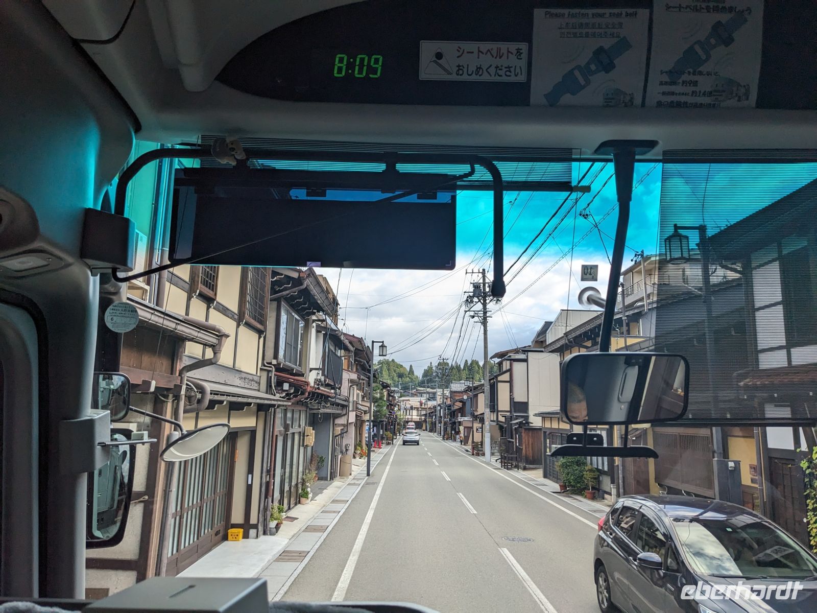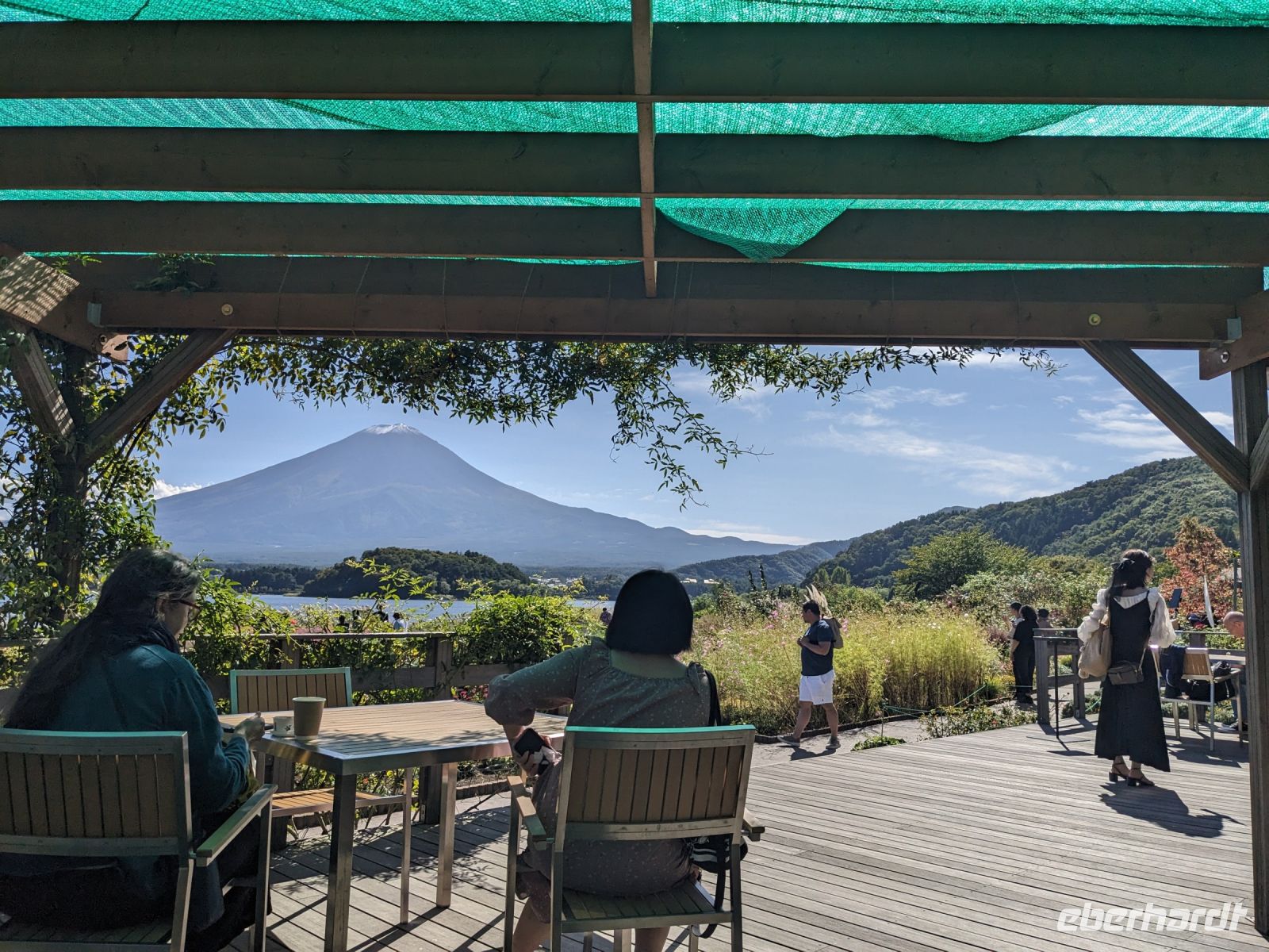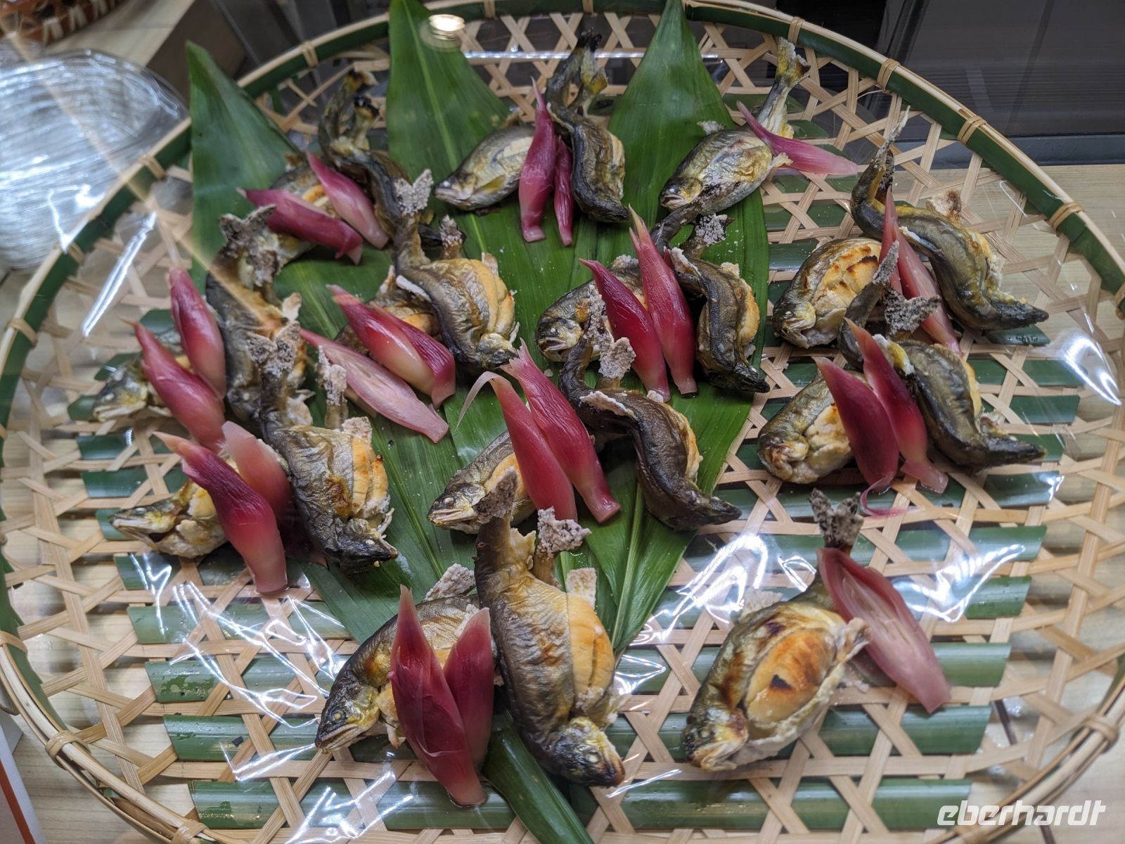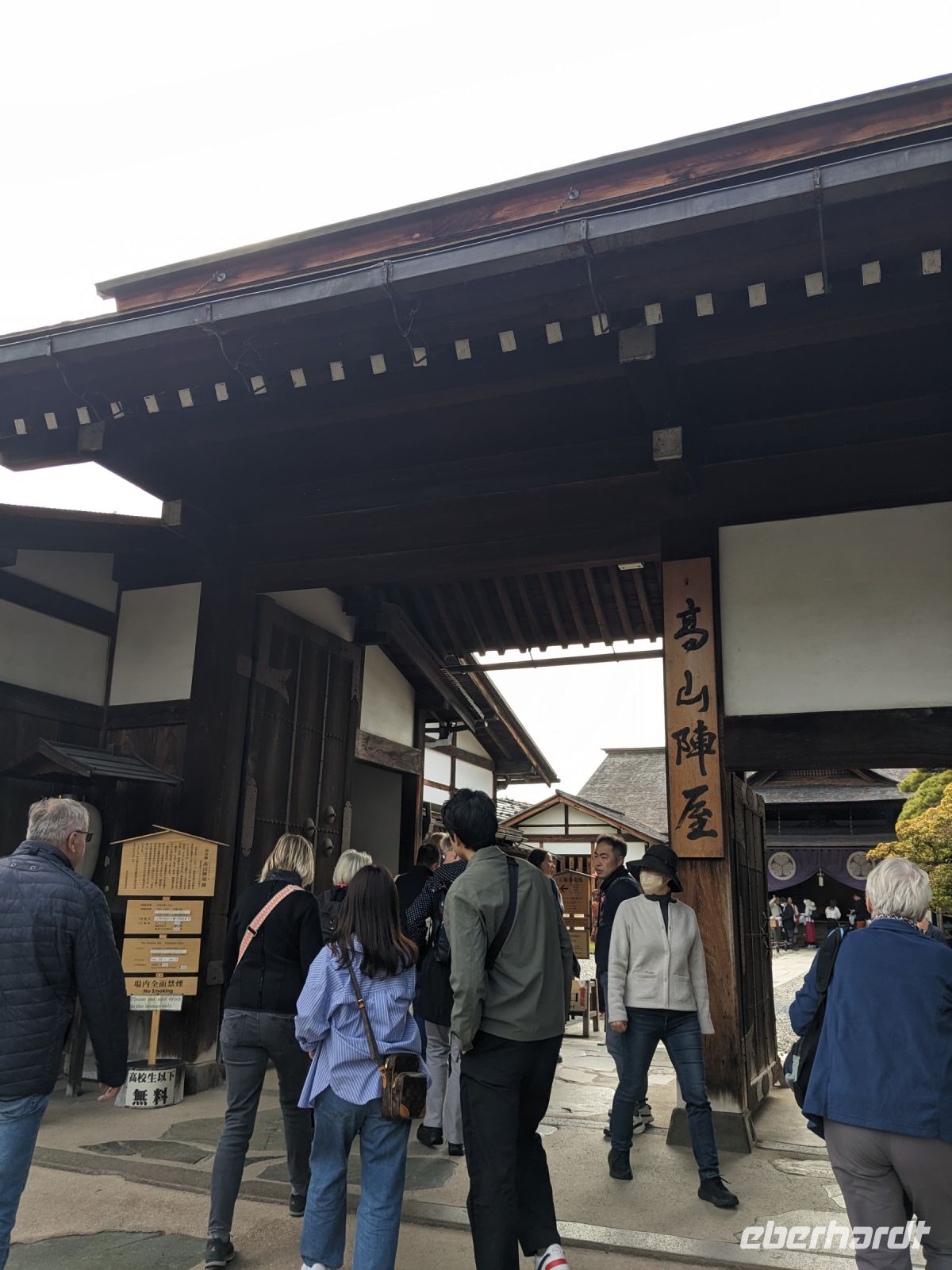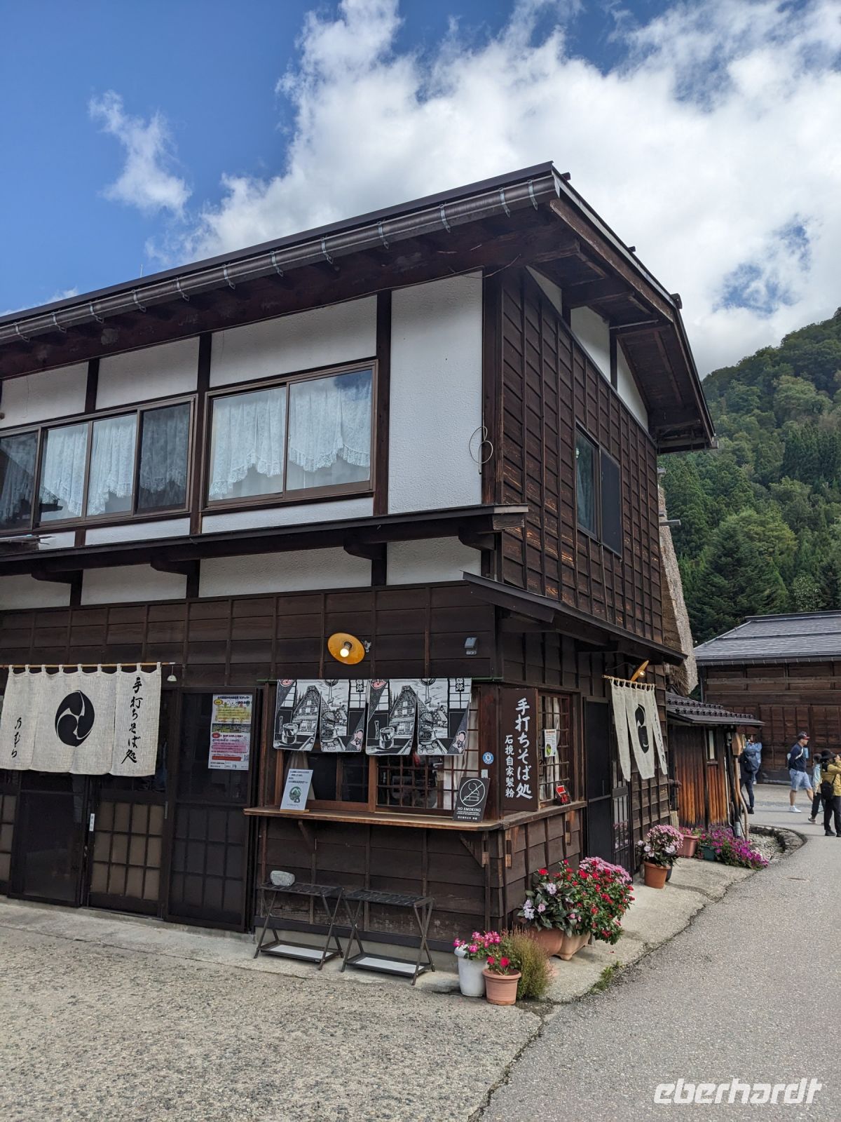 Der heutige Tag stand ganz im Sinne des Mount Fuji. Nach einer eher ungewöhnlicher Frühstücksauswahl am Morgen im Ryokan nahmen wir das Piratenschiff über den Ashi-See zur Seilbahnstation in der Bergregion von Hakone. Dabei erhielten wir bereits wunderbare Blicke auf das beeindruckende Massiv des Fuji. Masayo teilte uns mit, dass so eine gute Sicht für diese Jahreszeit eher ungewöhnlich sei, da solch eine klarer Blick meist nur im Winter zu beobachten wäre. Doch wir hatten Glück und uns wurde wahrlich eine Bilderbuch-Ansicht geboten! Einfach atemberaubend! Angekommen an der Seilbahnstation ging es hoch hinaus und dann sahen wir schon den Dampf und schließlich kam auch der Geruch dazu: Schwefel. Passend dazu wurden an der Verkaufsstelle oben Schwarze Eier, sogenannte Teufelseier, verkauft. Dabei handelt es sich um normale Hühnereier, welche in Schwefel gekocht, ihre dunkle Farbe erhalten. Als Kostprobe kaufte ich meiner Gruppe welche im Namen von Eberhardt TRAVEL. Unser Fazit: Geschmacklich kein Unterschied zu normalen hartgekochten Eiern, aber interessant war es trotzdem, die ungewöhnlichen Eier einmal zu probieren. Mit dem Bus fuhren wir dann durch die wunderschöne Berglandschaft zu einem sagenhaften Aussichtspunkt. Davor legten wir noch einen kurzen Stopp in einem Supermarkt ein, um individuell Snacks für eine Mittagsrast zu holen. Diese genossen wir dann mit Blick auf ein Blütenmeer mit dahinterliegendem See und dem Mount Fuji als krönende Umrandung. Hier bot sich aller paar Meter ein neues Fotomotiv. Die verschiedenen Blumen bewegten sich im Wind, von weiter her vernahm man Kindergesang aus einer Schule, die Sonne strahlte auf uns herab und die Welt schien in dem Moment einfach einmal stillzustehen. Ein leckeres Traubeneis, typisch für die Region, kann ich zudem auf jeden Fall weiterempfehlen. Doch irgendwann drehte die Uhr sich dann doch weiter und es hieß Abschied zu nehmen vom Mount Fuji. Unser Reisebus brachte uns weiter nach Takayama, wo wir in unser Hotel eincheckten und anschließend ein traditionelles Hida Rindfleisch-Abendessen zu uns nahmen.