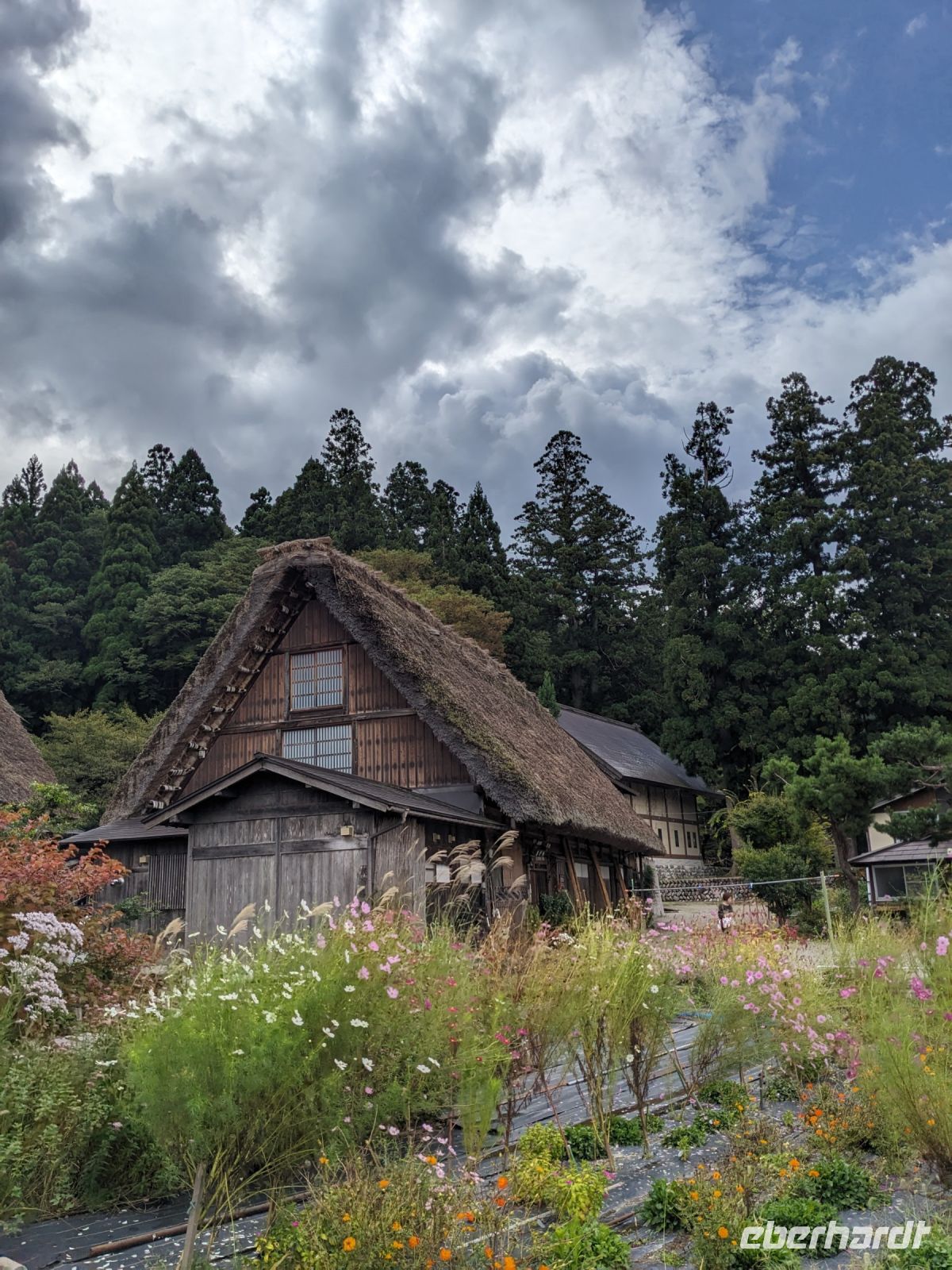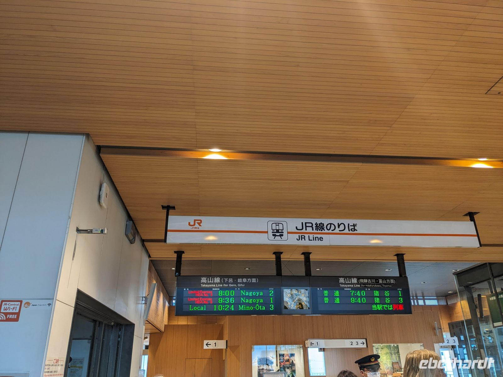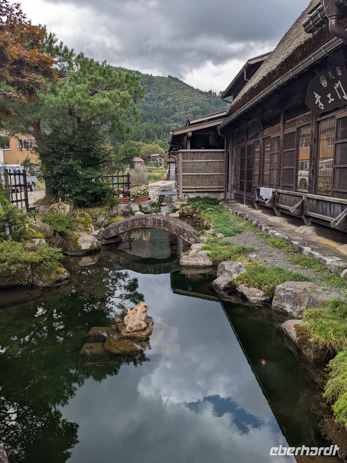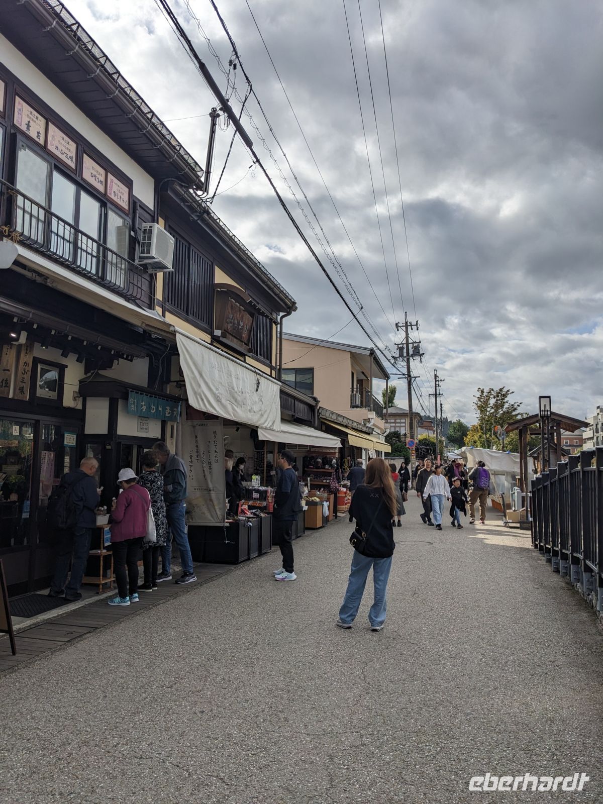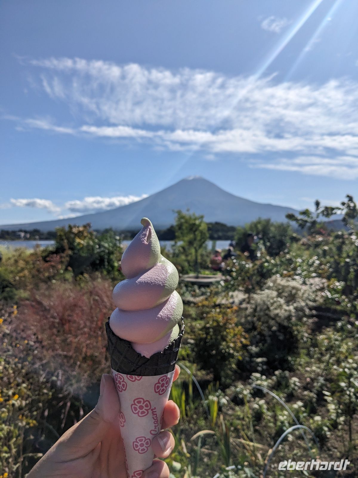 Der heutige Tag stand ganz im Sinne des Mount Fuji. Nach einer eher ungewöhnlicher Frühstücksauswahl am Morgen im Ryokan nahmen wir das Piratenschiff über den Ashi-See zur Seilbahnstation in der Bergregion von Hakone. Dabei erhielten wir bereits wunderbare Blicke auf das beeindruckende Massiv des Fuji. Masayo teilte uns mit, dass so eine gute Sicht für diese Jahreszeit eher ungewöhnlich sei, da solch eine klarer Blick meist nur im Winter zu beobachten wäre. Doch wir hatten Glück und uns wurde wahrlich eine Bilderbuch-Ansicht geboten! Einfach atemberaubend! Angekommen an der Seilbahnstation ging es hoch hinaus und dann sahen wir schon den Dampf und schließlich kam auch der Geruch dazu: Schwefel. Passend dazu wurden an der Verkaufsstelle oben Schwarze Eier, sogenannte Teufelseier, verkauft. Dabei handelt es sich um normale Hühnereier, welche in Schwefel gekocht, ihre dunkle Farbe erhalten. Als Kostprobe kaufte ich meiner Gruppe welche im Namen von Eberhardt TRAVEL. Unser Fazit: Geschmacklich kein Unterschied zu normalen hartgekochten Eiern, aber interessant war es trotzdem, die ungewöhnlichen Eier einmal zu probieren. Mit dem Bus fuhren wir dann durch die wunderschöne Berglandschaft zu einem sagenhaften Aussichtspunkt. Davor legten wir noch einen kurzen Stopp in einem Supermarkt ein, um individuell Snacks für eine Mittagsrast zu holen. Diese genossen wir dann mit Blick auf ein Blütenmeer mit dahinterliegendem See und dem Mount Fuji als krönende Umrandung. Hier bot sich aller paar Meter ein neues Fotomotiv. Die verschiedenen Blumen bewegten sich im Wind, von weiter her vernahm man Kindergesang aus einer Schule, die Sonne strahlte auf uns herab und die Welt schien in dem Moment einfach einmal stillzustehen. Ein leckeres Traubeneis, typisch für die Region, kann ich zudem auf jeden Fall weiterempfehlen. Doch irgendwann drehte die Uhr sich dann doch weiter und es hieß Abschied zu nehmen vom Mount Fuji. Unser Reisebus brachte uns weiter nach Takayama, wo wir in unser Hotel eincheckten und anschließend ein traditionelles Hida Rindfleisch-Abendessen zu uns nahmen.