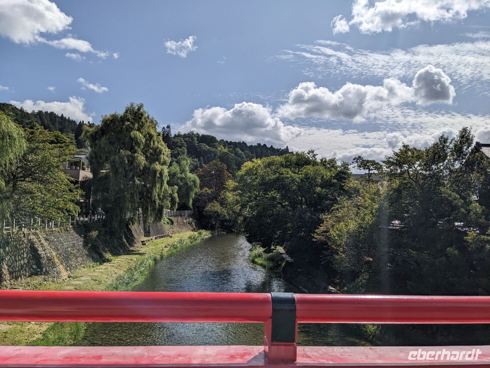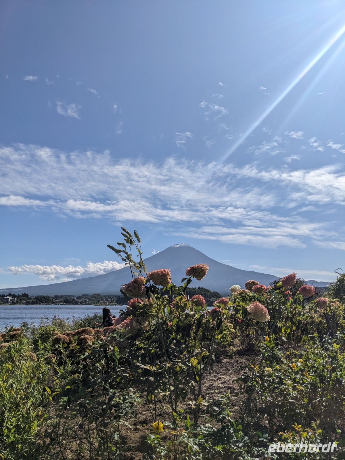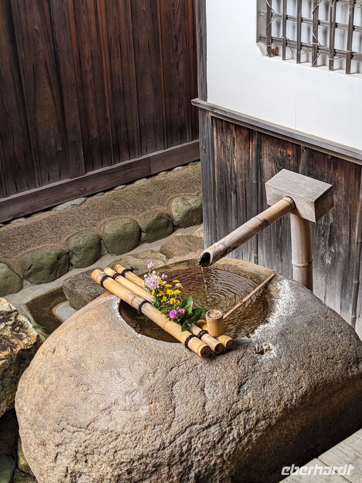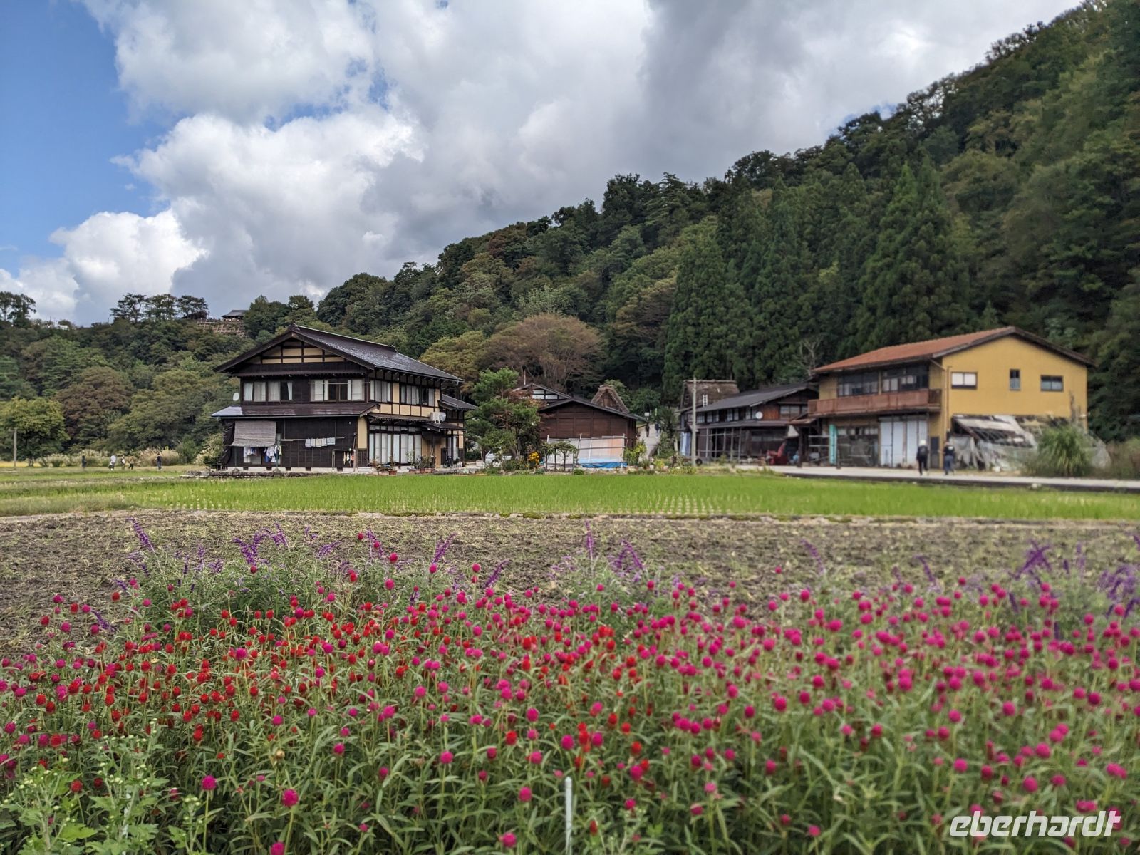 Der heutige Tag stand ganz im Sinne des Mount Fuji. Nach einer eher ungewöhnlicher Frühstücksauswahl am Morgen im Ryokan nahmen wir das Piratenschiff über den Ashi-See zur Seilbahnstation in der Bergregion von Hakone. Dabei erhielten wir bereits wunderbare Blicke auf das beeindruckende Massiv des Fuji. Masayo teilte uns mit, dass so eine gute Sicht für diese Jahreszeit eher ungewöhnlich sei, da solch eine klarer Blick meist nur im Winter zu beobachten wäre. Doch wir hatten Glück und uns wurde wahrlich eine Bilderbuch-Ansicht geboten! Einfach atemberaubend! Angekommen an der Seilbahnstation ging es hoch hinaus und dann sahen wir schon den Dampf und schließlich kam auch der Geruch dazu: Schwefel. Passend dazu wurden an der Verkaufsstelle oben Schwarze Eier, sogenannte Teufelseier, verkauft. Dabei handelt es sich um normale Hühnereier, welche in Schwefel gekocht, ihre dunkle Farbe erhalten. Als Kostprobe kaufte ich meiner Gruppe welche im Namen von Eberhardt TRAVEL. Unser Fazit: Geschmacklich kein Unterschied zu normalen hartgekochten Eiern, aber interessant war es trotzdem, die ungewöhnlichen Eier einmal zu probieren. Mit dem Bus fuhren wir dann durch die wunderschöne Berglandschaft zu einem sagenhaften Aussichtspunkt. Davor legten wir noch einen kurzen Stopp in einem Supermarkt ein, um individuell Snacks für eine Mittagsrast zu holen. Diese genossen wir dann mit Blick auf ein Blütenmeer mit dahinterliegendem See und dem Mount Fuji als krönende Umrandung. Hier bot sich aller paar Meter ein neues Fotomotiv. Die verschiedenen Blumen bewegten sich im Wind, von weiter her vernahm man Kindergesang aus einer Schule, die Sonne strahlte auf uns herab und die Welt schien in dem Moment einfach einmal stillzustehen. Ein leckeres Traubeneis, typisch für die Region, kann ich zudem auf jeden Fall weiterempfehlen. Doch irgendwann drehte die Uhr sich dann doch weiter und es hieß Abschied zu nehmen vom Mount Fuji. Unser Reisebus brachte uns weiter nach Takayama, wo wir in unser Hotel eincheckten und anschließend ein traditionelles Hida Rindfleisch-Abendessen zu uns nahmen.