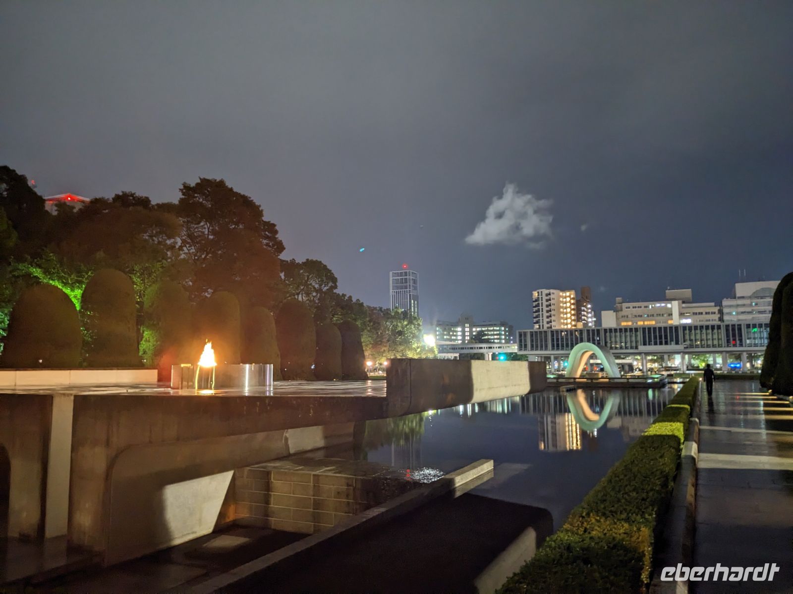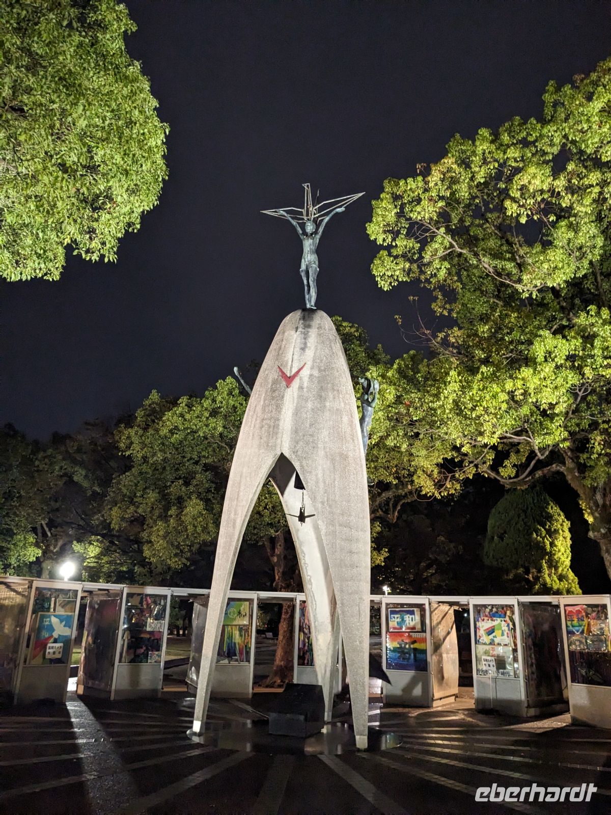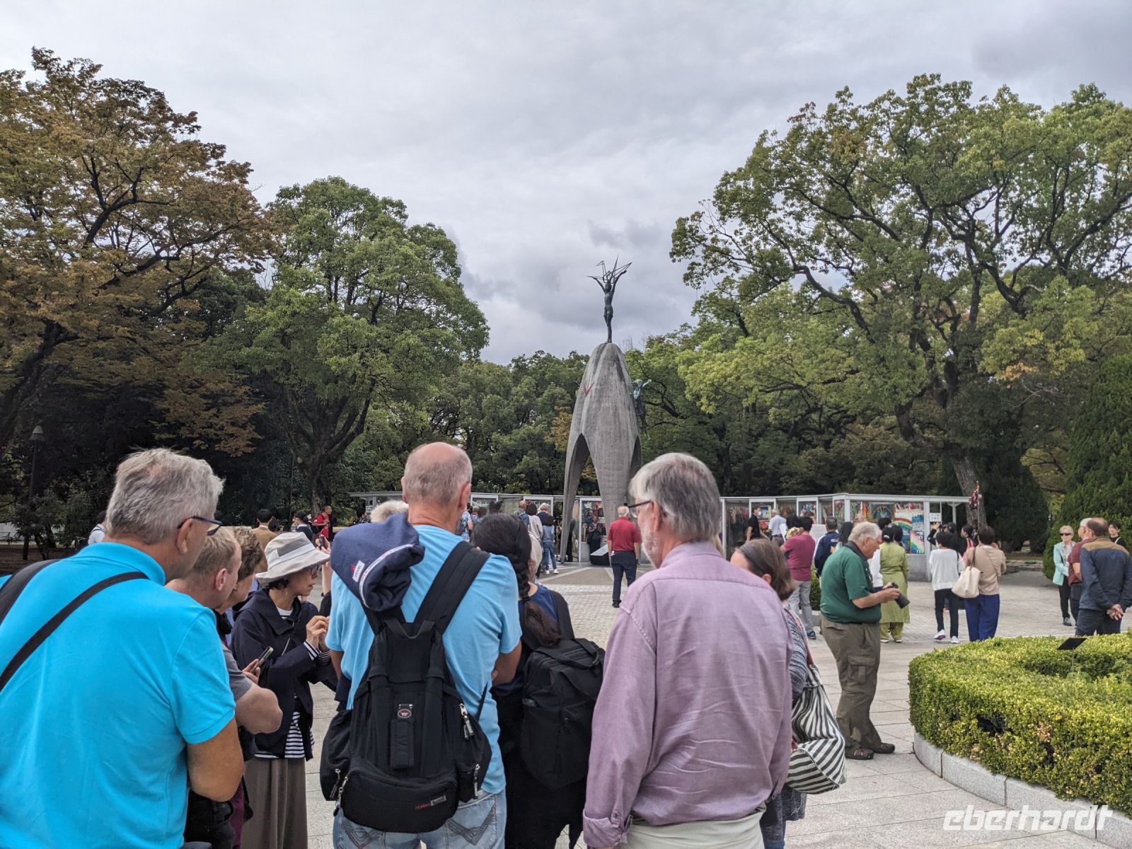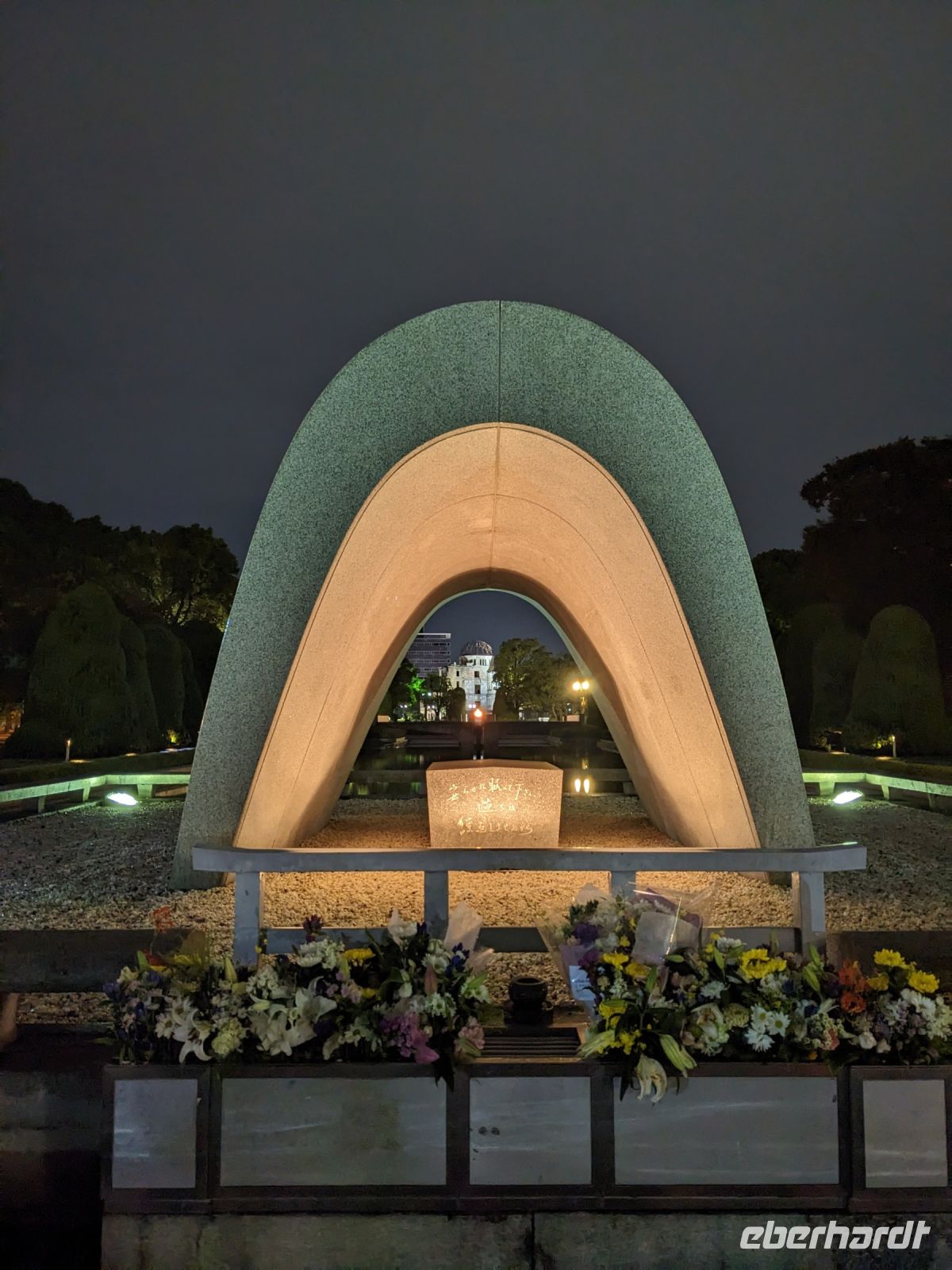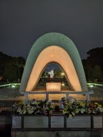 Am nächsten Morgen gaben wir unsere Koffer an der Rezeption ab und machten uns nur mit unserem Handgepäck auf den Weg zum Bahnhof in Takayama. Wir fuhren nach Nagoya und von dort ging es dann schließlich mit dem Shinkansen nach Himeji. Mit durchschnittlich 180 km/h Geschwindigkeit überbrückten wir die Distanz innerhalb kürzester Zeit. Der Schnellzug ist bekannt für seine Pünktlichkeit und seinen Komfort. Wir fühlten uns dort sehr gut aufgehoben - die vorbeibrausende Landschaft lud zum Träumen ein, man hatte genügend Beinfreiheit und auch kostenfreies WLAN war vorhanden. Angekommen in Himeji hinterlegten wir unser Gepäck in einen Spind und spazierten zur bekannten Burganlage. Auf dem Weg begegneten uns zahlreiche Kunstinstallationen, vor allem Skulpturen. Im Hintergrund aufragend erkannten wir schon aus weiter Entfernung die riesige UNESCO-Weltkulturerbestätte. Nach etwa einer halben Stunde erreichten wir die Burg und suchten uns zunächst erstmal eine Sitzgelegenheit für ein kleines Picknick. Anschließend brachen wir auf, um die Anlage von innen zu besichtigen. Erst schlängelte sich der Weg nur leicht bergauf - im Haus selbst kamen dann die Treppen. Hoch hinaus überblickten wir schließlich Himeji und die Umgebung. Der Aufstieg hatte sich gelohnt, auch wenn es uns viele gleichtaten - doch typisch japanisch hatten alle, geordnet in einer Schlange, die Möglichkeit, nacheinander durch die Fenster zu schauen. Wieder unten hatte es mittlerweile angefangen, leicht zu nieseln, sodass die Regenschirme wieder zum Einsatz kamen. Doch auf dem Weg zurück zum Bahnhof hörte es auf und bei unserer Zugfahrt von Himeji nach Hiroshima mit dem Shinkansen konnten wir die vorbeiziehende Landschaft ohne Regen genießen. In Hiroshima checkten wir zunächst einmal in unserem Hotel ein und liefen dann gemeinsam zu einem Restaurant, in dem uns japanische "Pizza" serviert wurde. An sich hatte dieses Gericht bis auf die runde Form aber so gar nichts mit Pizza gemein, schmeckte aber dennoch sehr lecker. Für alle, die wollten, unternahm ich noch einen Spaziergang zum Friedenspark von Hiroshima, den wir schön beleuchtet und fast für uns allein auf uns wirken lassen konnten.