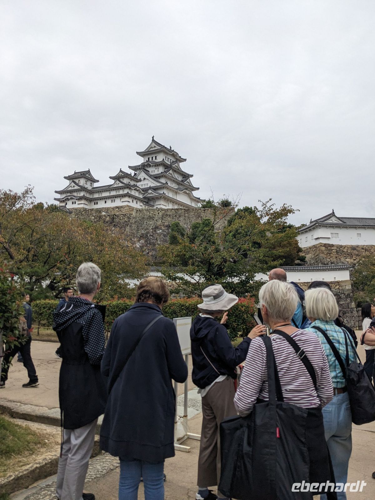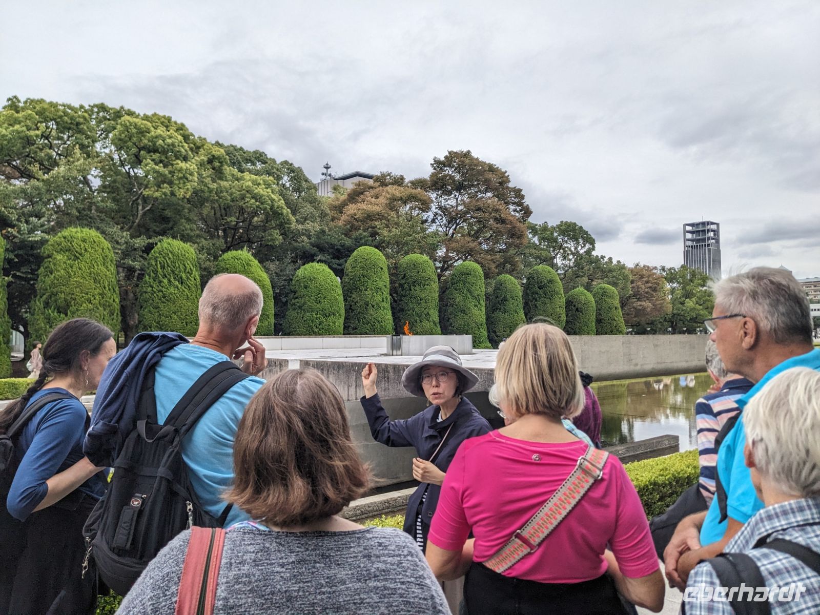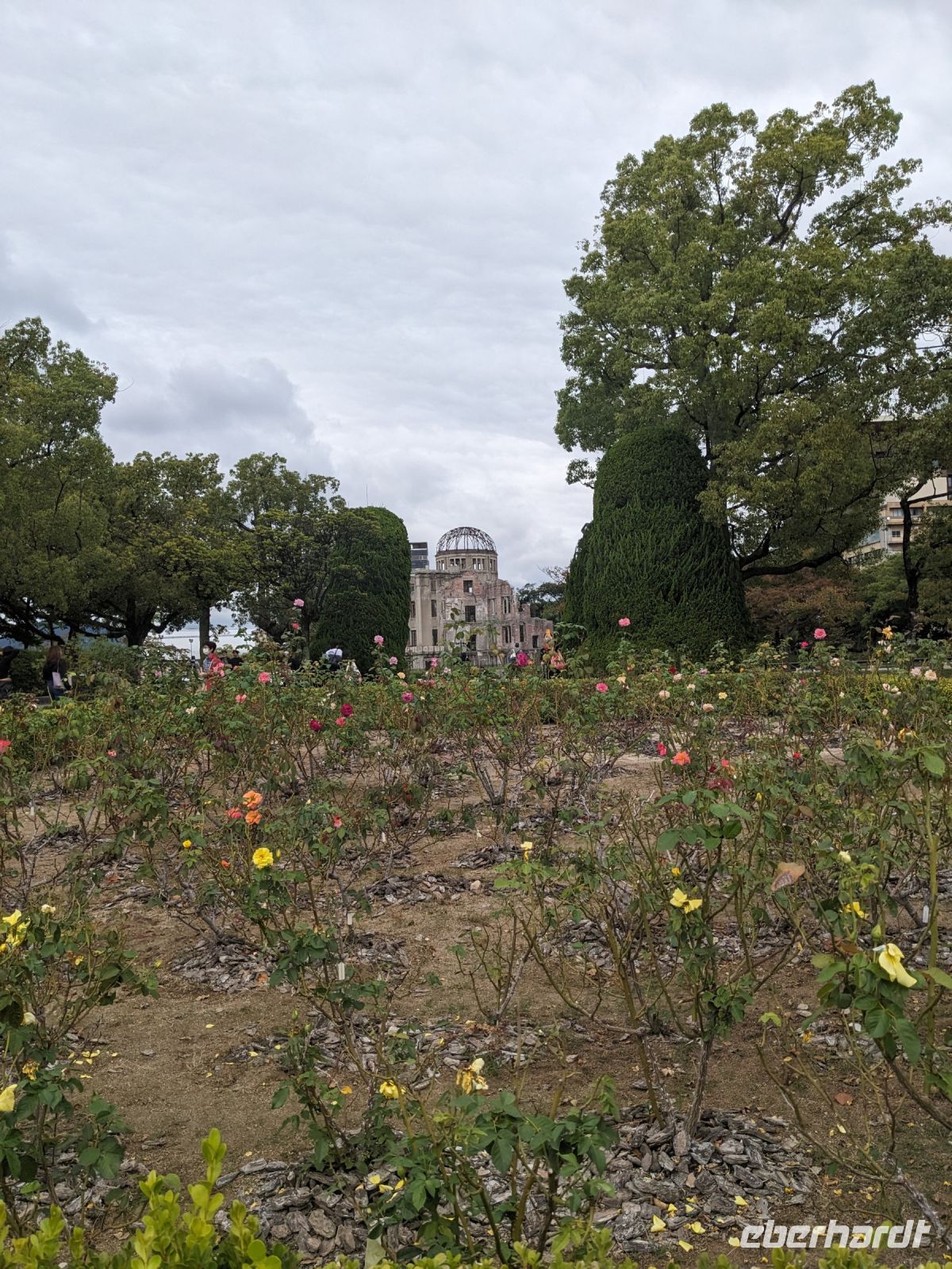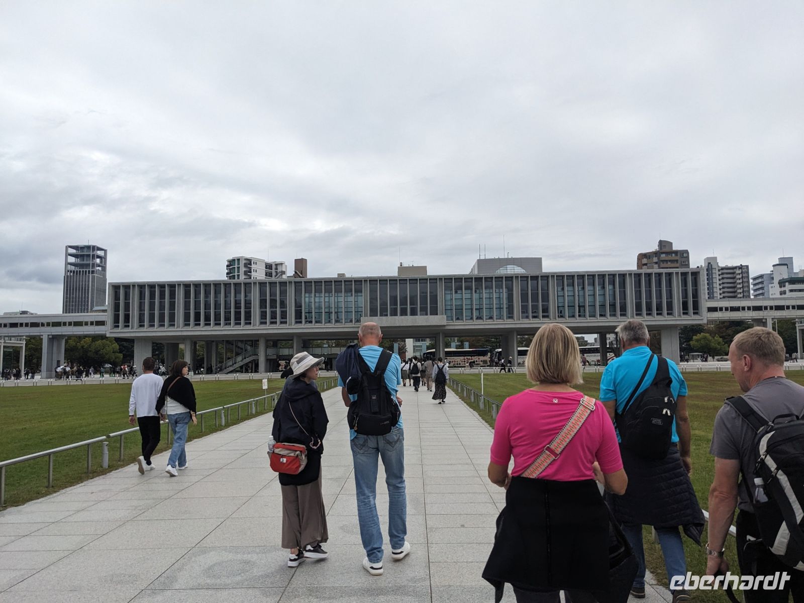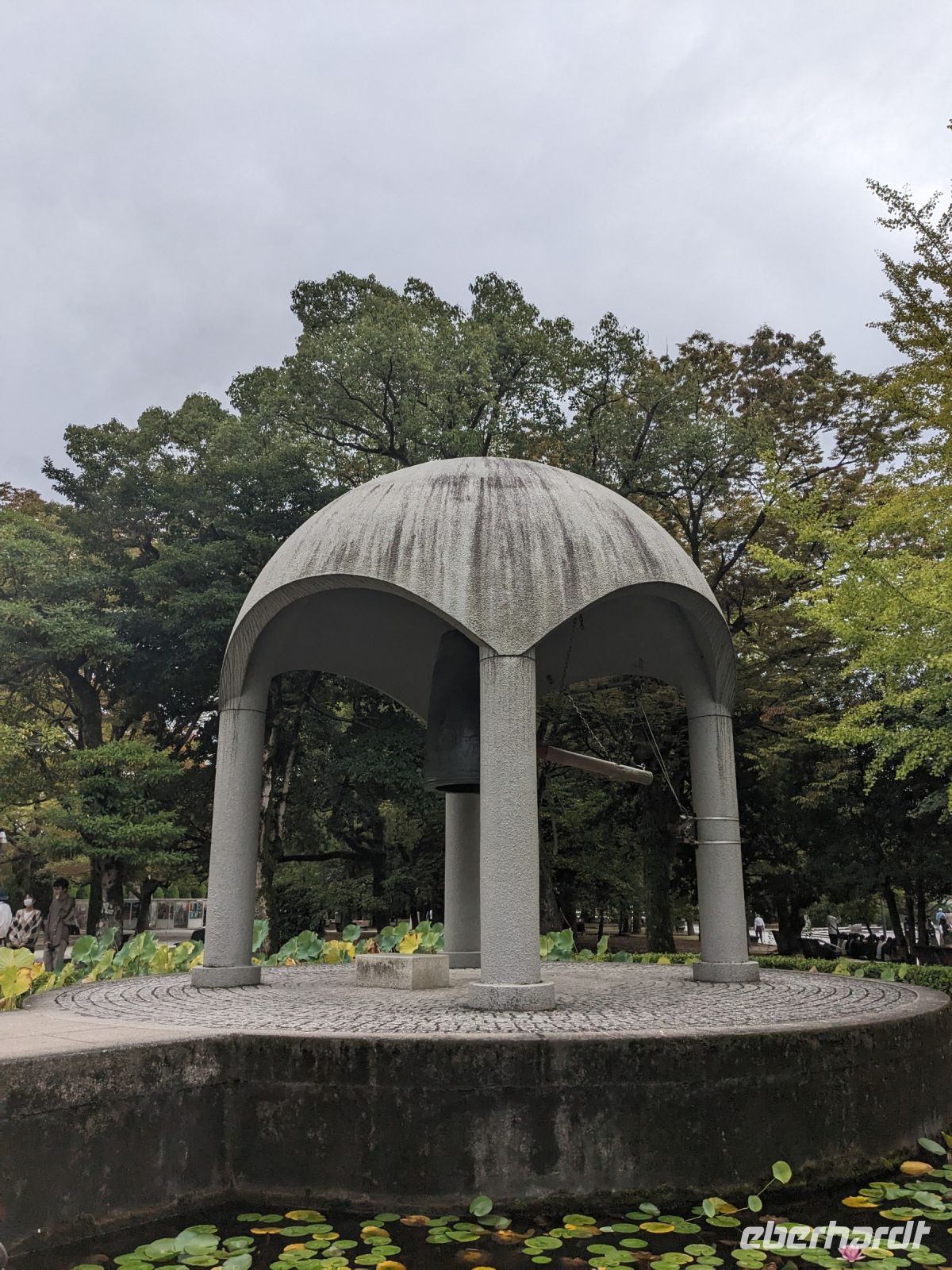 Am nächsten Morgen gaben wir unsere Koffer an der Rezeption ab und machten uns nur mit unserem Handgepäck auf den Weg zum Bahnhof in Takayama. Wir fuhren nach Nagoya und von dort ging es dann schließlich mit dem Shinkansen nach Himeji. Mit durchschnittlich 180 km/h Geschwindigkeit überbrückten wir die Distanz innerhalb kürzester Zeit. Der Schnellzug ist bekannt für seine Pünktlichkeit und seinen Komfort. Wir fühlten uns dort sehr gut aufgehoben - die vorbeibrausende Landschaft lud zum Träumen ein, man hatte genügend Beinfreiheit und auch kostenfreies WLAN war vorhanden. Angekommen in Himeji hinterlegten wir unser Gepäck in einen Spind und spazierten zur bekannten Burganlage. Auf dem Weg begegneten uns zahlreiche Kunstinstallationen, vor allem Skulpturen. Im Hintergrund aufragend erkannten wir schon aus weiter Entfernung die riesige UNESCO-Weltkulturerbestätte. Nach etwa einer halben Stunde erreichten wir die Burg und suchten uns zunächst erstmal eine Sitzgelegenheit für ein kleines Picknick. Anschließend brachen wir auf, um die Anlage von innen zu besichtigen. Erst schlängelte sich der Weg nur leicht bergauf - im Haus selbst kamen dann die Treppen. Hoch hinaus überblickten wir schließlich Himeji und die Umgebung. Der Aufstieg hatte sich gelohnt, auch wenn es uns viele gleichtaten - doch typisch japanisch hatten alle, geordnet in einer Schlange, die Möglichkeit, nacheinander durch die Fenster zu schauen. Wieder unten hatte es mittlerweile angefangen, leicht zu nieseln, sodass die Regenschirme wieder zum Einsatz kamen. Doch auf dem Weg zurück zum Bahnhof hörte es auf und bei unserer Zugfahrt von Himeji nach Hiroshima mit dem Shinkansen konnten wir die vorbeiziehende Landschaft ohne Regen genießen. In Hiroshima checkten wir zunächst einmal in unserem Hotel ein und liefen dann gemeinsam zu einem Restaurant, in dem uns japanische "Pizza" serviert wurde. An sich hatte dieses Gericht bis auf die runde Form aber so gar nichts mit Pizza gemein, schmeckte aber dennoch sehr lecker. Für alle, die wollten, unternahm ich noch einen Spaziergang zum Friedenspark von Hiroshima, den wir schön beleuchtet und fast für uns allein auf uns wirken lassen konnten.