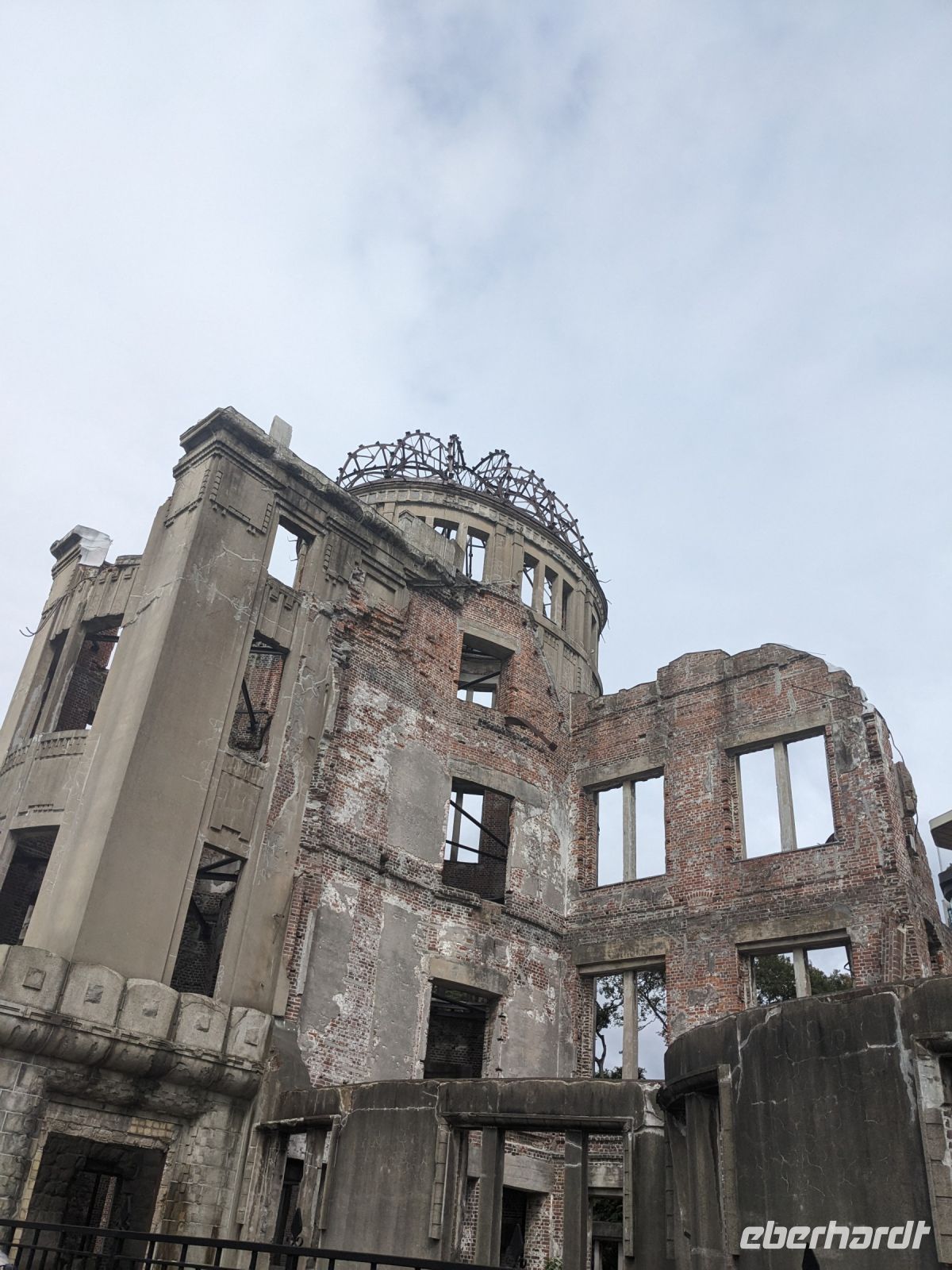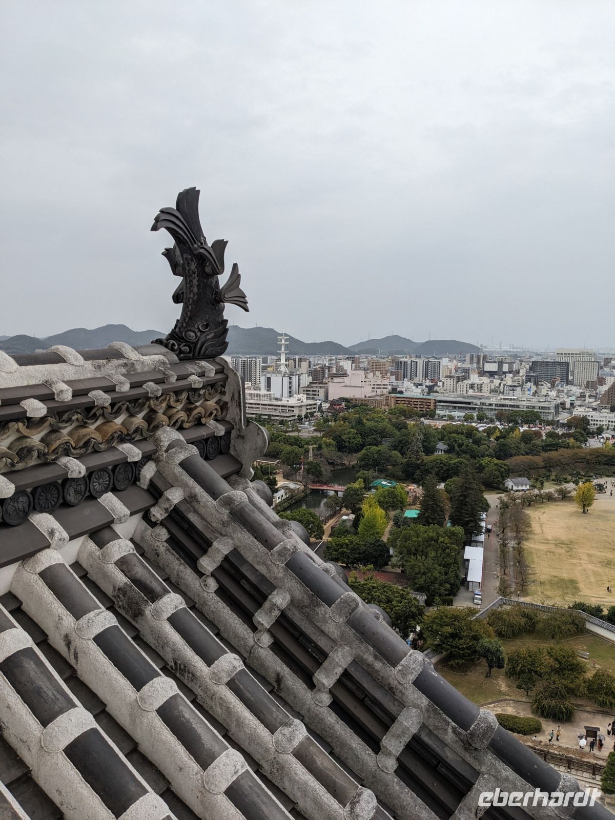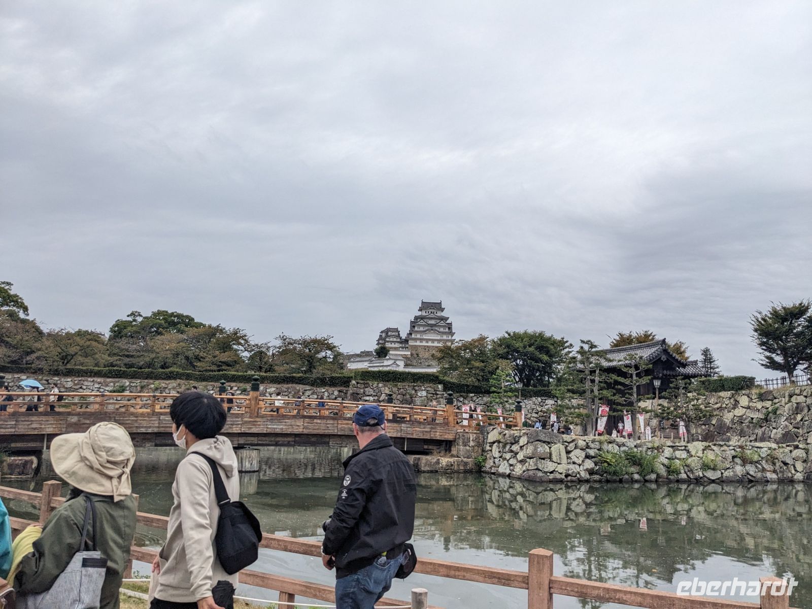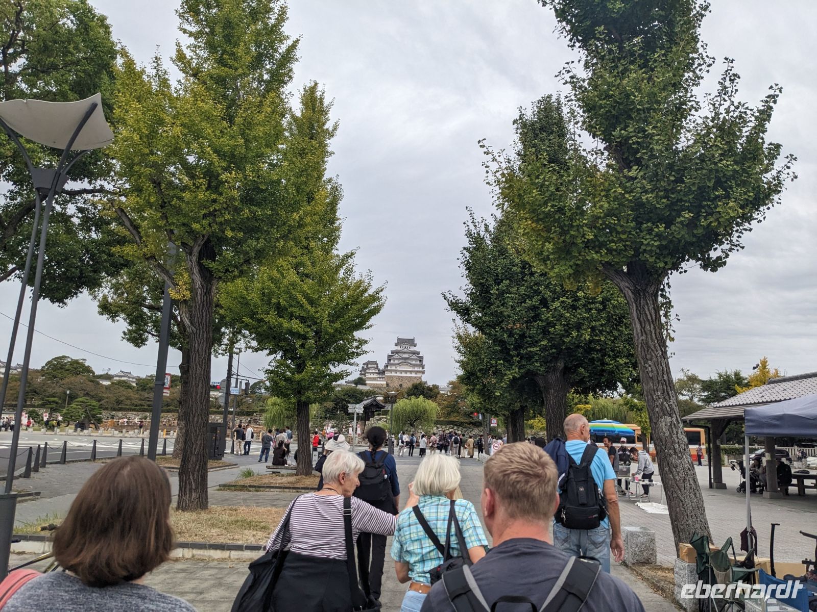 Am nächsten Morgen gaben wir unsere Koffer an der Rezeption ab und machten uns nur mit unserem Handgepäck auf den Weg zum Bahnhof in Takayama. Wir fuhren nach Nagoya und von dort ging es dann schließlich mit dem Shinkansen nach Himeji. Mit durchschnittlich 180 km/h Geschwindigkeit überbrückten wir die Distanz innerhalb kürzester Zeit. Der Schnellzug ist bekannt für seine Pünktlichkeit und seinen Komfort. Wir fühlten uns dort sehr gut aufgehoben - die vorbeibrausende Landschaft lud zum Träumen ein, man hatte genügend Beinfreiheit und auch kostenfreies WLAN war vorhanden. Angekommen in Himeji hinterlegten wir unser Gepäck in einen Spind und spazierten zur bekannten Burganlage. Auf dem Weg begegneten uns zahlreiche Kunstinstallationen, vor allem Skulpturen. Im Hintergrund aufragend erkannten wir schon aus weiter Entfernung die riesige UNESCO-Weltkulturerbestätte. Nach etwa einer halben Stunde erreichten wir die Burg und suchten uns zunächst erstmal eine Sitzgelegenheit für ein kleines Picknick. Anschließend brachen wir auf, um die Anlage von innen zu besichtigen. Erst schlängelte sich der Weg nur leicht bergauf - im Haus selbst kamen dann die Treppen. Hoch hinaus überblickten wir schließlich Himeji und die Umgebung. Der Aufstieg hatte sich gelohnt, auch wenn es uns viele gleichtaten - doch typisch japanisch hatten alle, geordnet in einer Schlange, die Möglichkeit, nacheinander durch die Fenster zu schauen. Wieder unten hatte es mittlerweile angefangen, leicht zu nieseln, sodass die Regenschirme wieder zum Einsatz kamen. Doch auf dem Weg zurück zum Bahnhof hörte es auf und bei unserer Zugfahrt von Himeji nach Hiroshima mit dem Shinkansen konnten wir die vorbeiziehende Landschaft ohne Regen genießen. In Hiroshima checkten wir zunächst einmal in unserem Hotel ein und liefen dann gemeinsam zu einem Restaurant, in dem uns japanische "Pizza" serviert wurde. An sich hatte dieses Gericht bis auf die runde Form aber so gar nichts mit Pizza gemein, schmeckte aber dennoch sehr lecker. Für alle, die wollten, unternahm ich noch einen Spaziergang zum Friedenspark von Hiroshima, den wir schön beleuchtet und fast für uns allein auf uns wirken lassen konnten.
