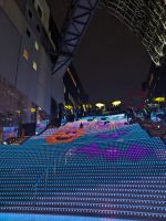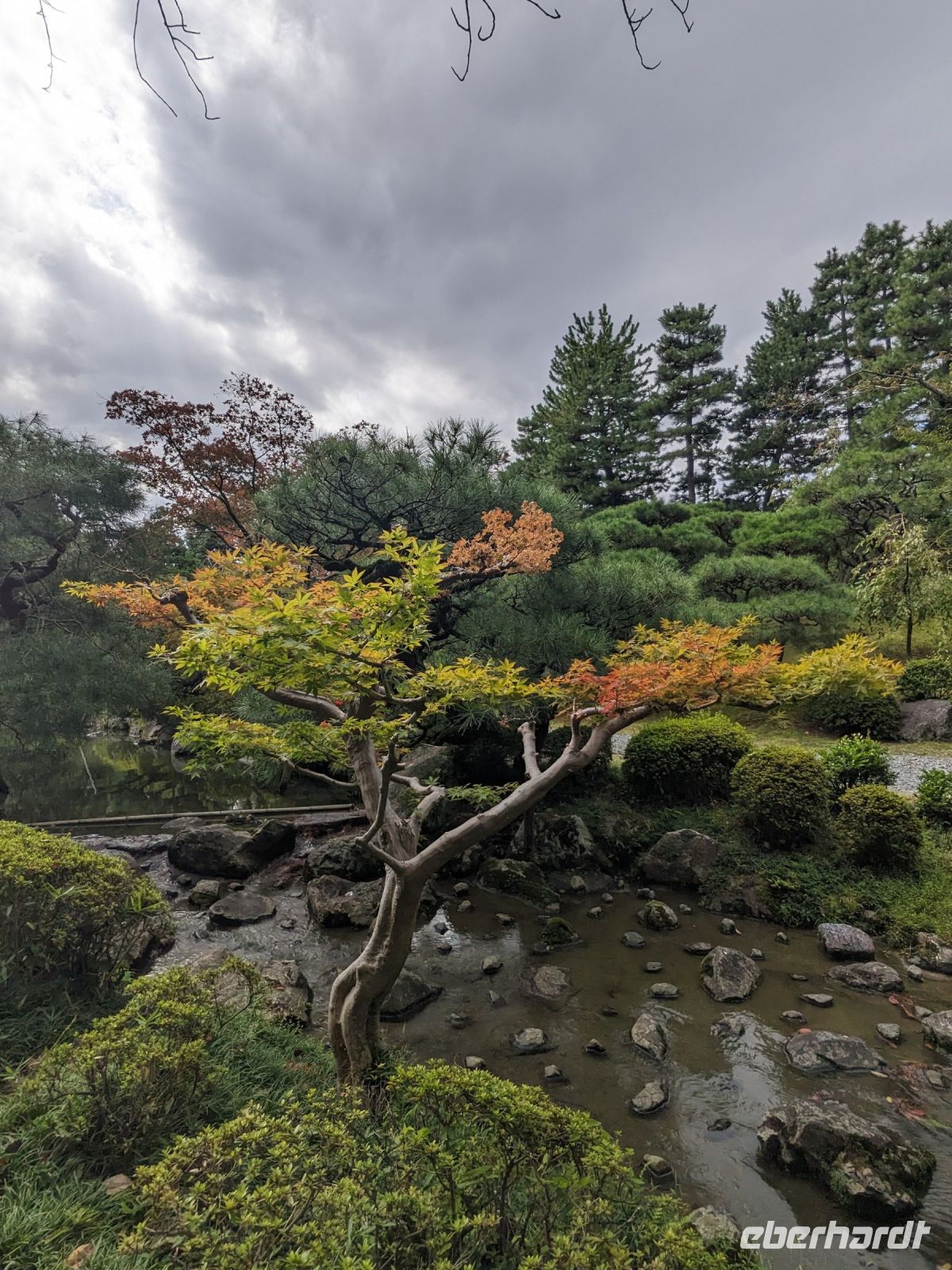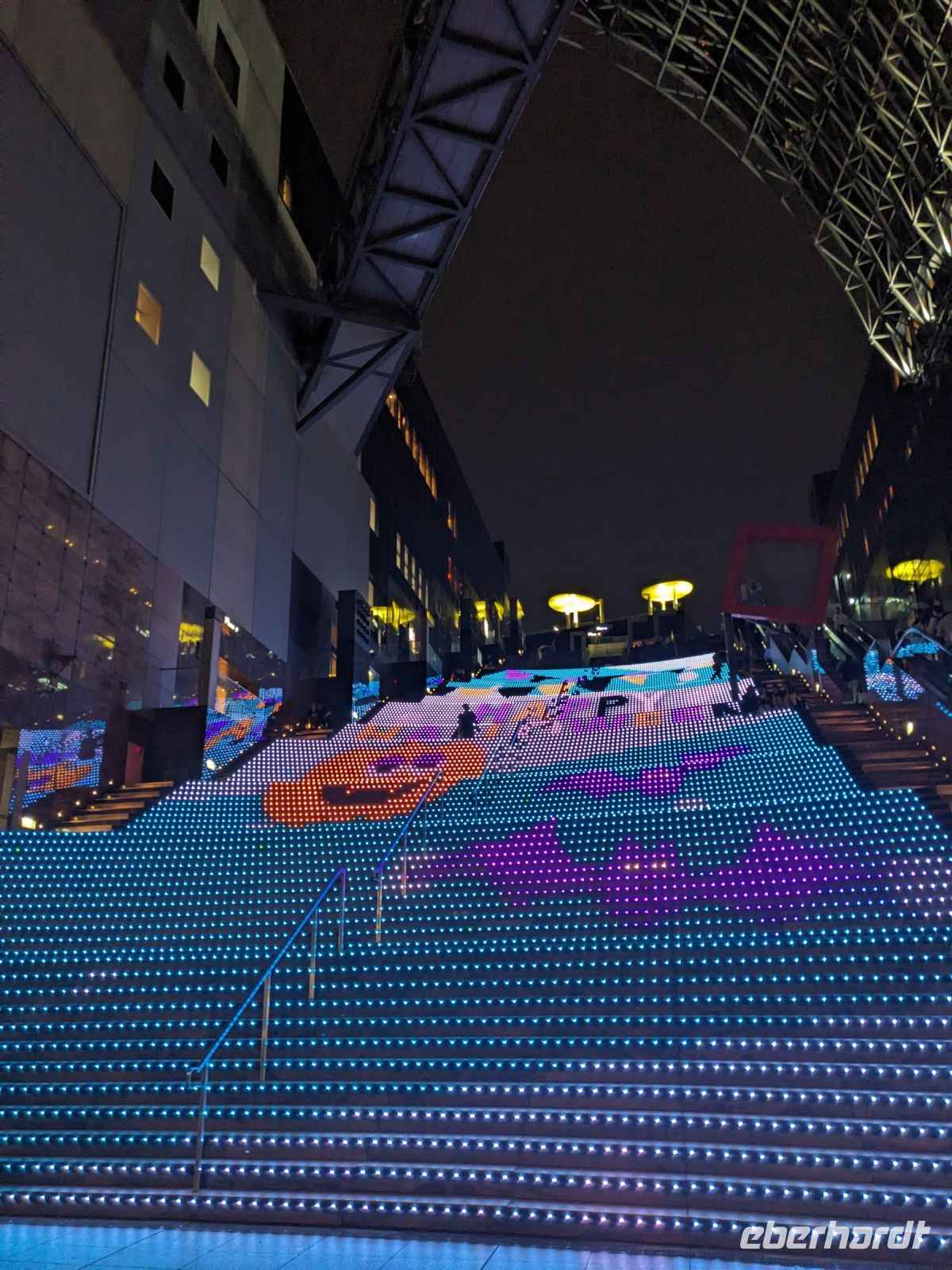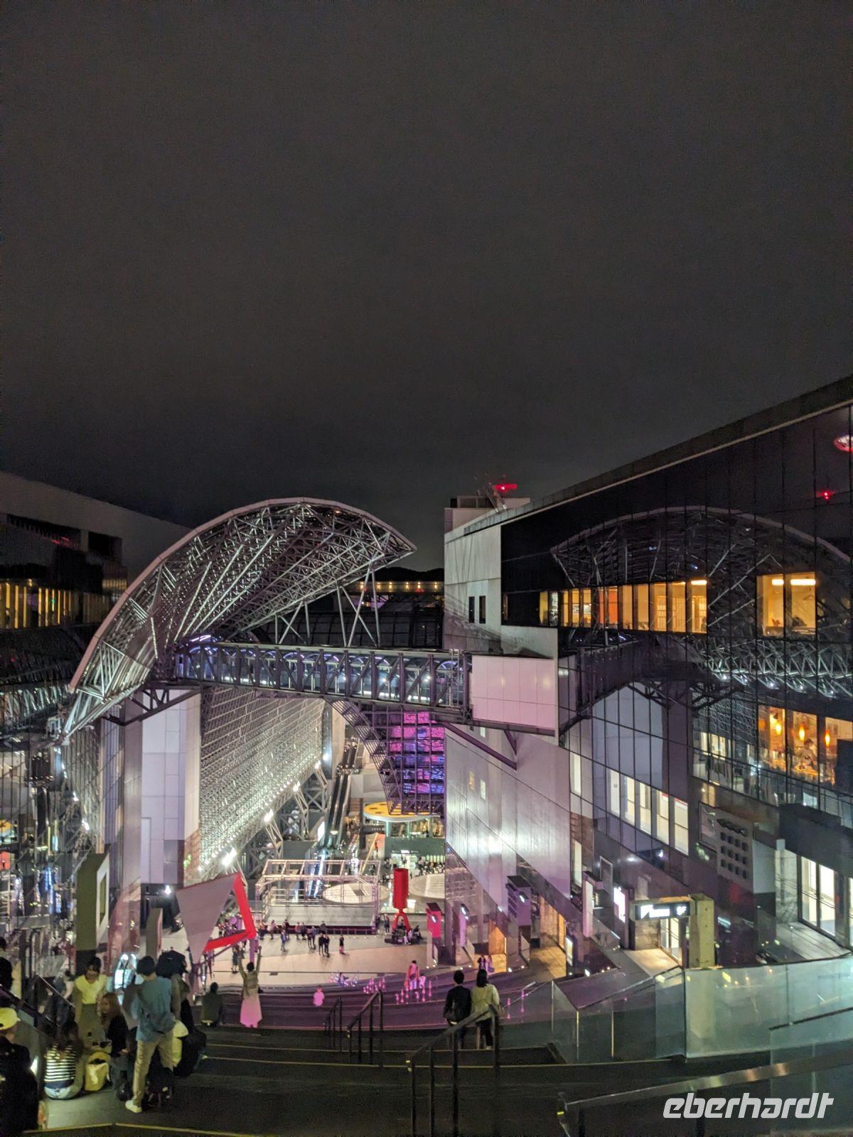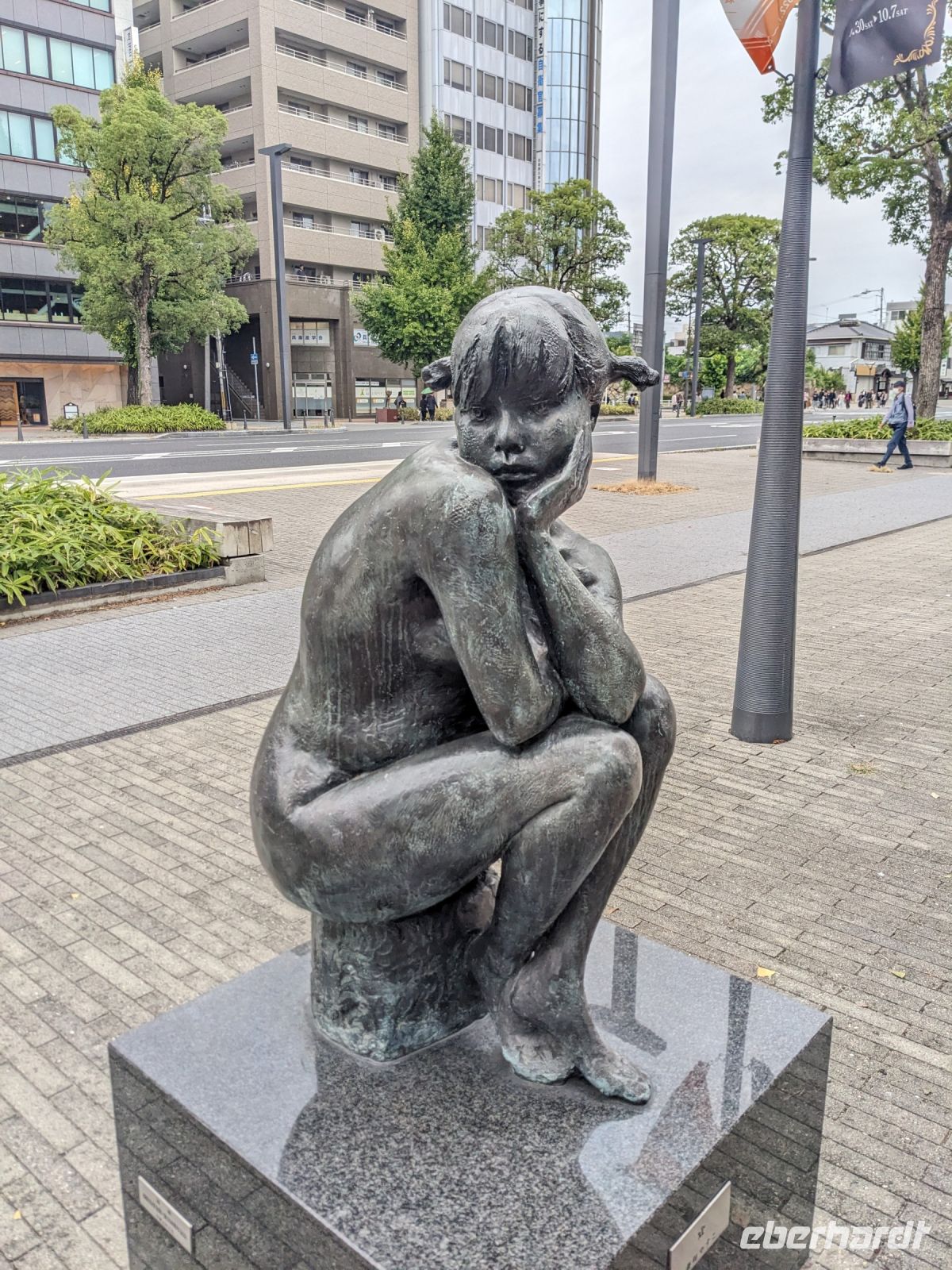 Am nächsten Morgen gaben wir unsere Koffer an der Rezeption ab und machten uns nur mit unserem Handgepäck auf den Weg zum Bahnhof in Takayama. Wir fuhren nach Nagoya und von dort ging es dann schließlich mit dem Shinkansen nach Himeji. Mit durchschnittlich 180 km/h Geschwindigkeit überbrückten wir die Distanz innerhalb kürzester Zeit. Der Schnellzug ist bekannt für seine Pünktlichkeit und seinen Komfort. Wir fühlten uns dort sehr gut aufgehoben - die vorbeibrausende Landschaft lud zum Träumen ein, man hatte genügend Beinfreiheit und auch kostenfreies WLAN war vorhanden. Angekommen in Himeji hinterlegten wir unser Gepäck in einen Spind und spazierten zur bekannten Burganlage. Auf dem Weg begegneten uns zahlreiche Kunstinstallationen, vor allem Skulpturen. Im Hintergrund aufragend erkannten wir schon aus weiter Entfernung die riesige UNESCO-Weltkulturerbestätte. Nach etwa einer halben Stunde erreichten wir die Burg und suchten uns zunächst erstmal eine Sitzgelegenheit für ein kleines Picknick. Anschließend brachen wir auf, um die Anlage von innen zu besichtigen. Erst schlängelte sich der Weg nur leicht bergauf - im Haus selbst kamen dann die Treppen. Hoch hinaus überblickten wir schließlich Himeji und die Umgebung. Der Aufstieg hatte sich gelohnt, auch wenn es uns viele gleichtaten - doch typisch japanisch hatten alle, geordnet in einer Schlange, die Möglichkeit, nacheinander durch die Fenster zu schauen. Wieder unten hatte es mittlerweile angefangen, leicht zu nieseln, sodass die Regenschirme wieder zum Einsatz kamen. Doch auf dem Weg zurück zum Bahnhof hörte es auf und bei unserer Zugfahrt von Himeji nach Hiroshima mit dem Shinkansen konnten wir die vorbeiziehende Landschaft ohne Regen genießen. In Hiroshima checkten wir zunächst einmal in unserem Hotel ein und liefen dann gemeinsam zu einem Restaurant, in dem uns japanische "Pizza" serviert wurde. An sich hatte dieses Gericht bis auf die runde Form aber so gar nichts mit Pizza gemein, schmeckte aber dennoch sehr lecker. Für alle, die wollten, unternahm ich noch einen Spaziergang zum Friedenspark von Hiroshima, den wir schön beleuchtet und fast für uns allein auf uns wirken lassen konnten.