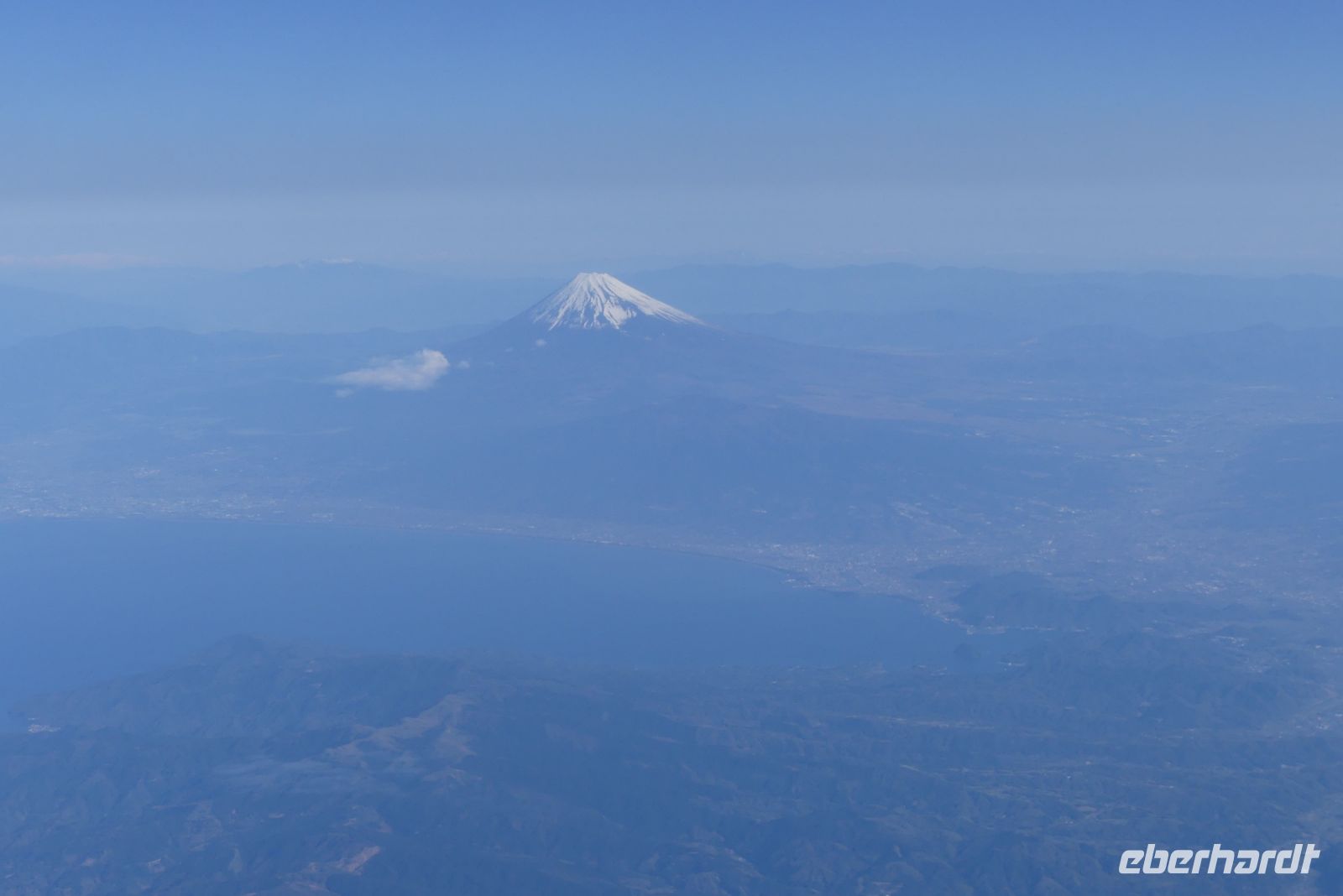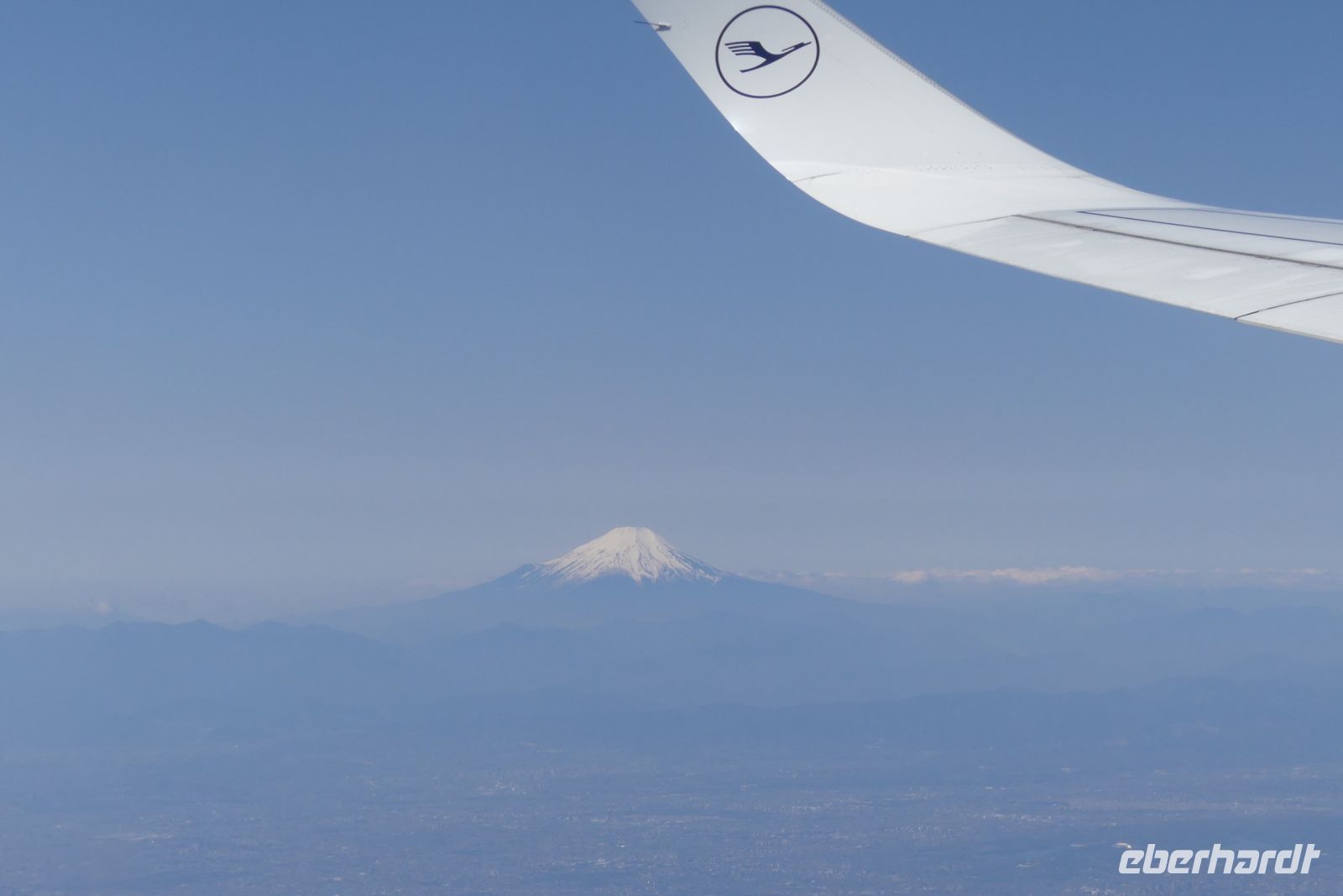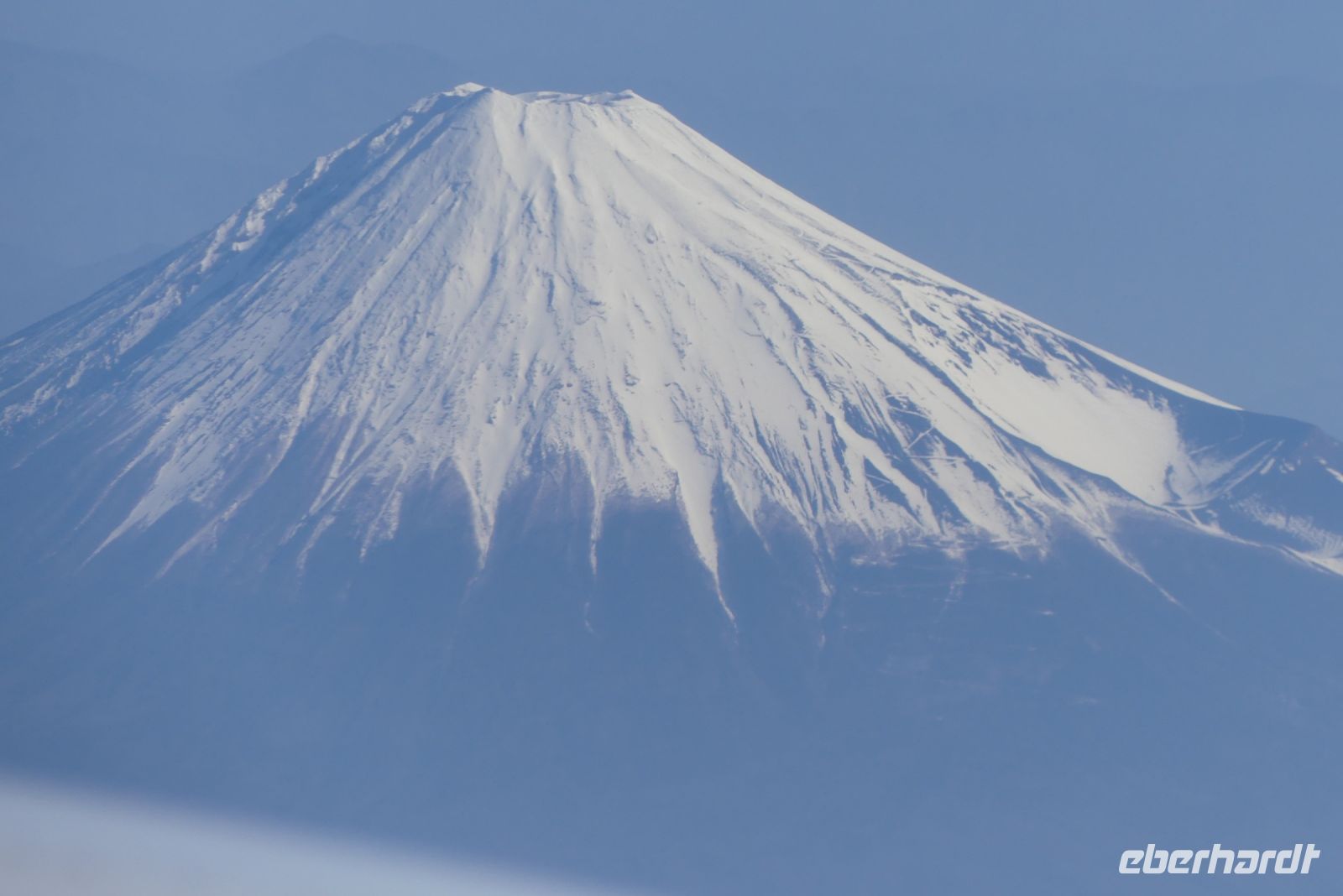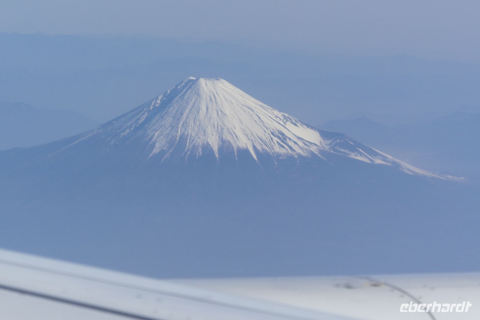 Guten Morgen Japan! Die Uhr stelle ich jetzt 8 Stunden nach vorn. Ein Blick aus dem Flugzeugfenster auf der linken Seite sorgt für ein freudiges Lächeln – Japan zeigt sich von seiner sonnigen Seite mit dem Schnee bedeckten Fuji voraus.