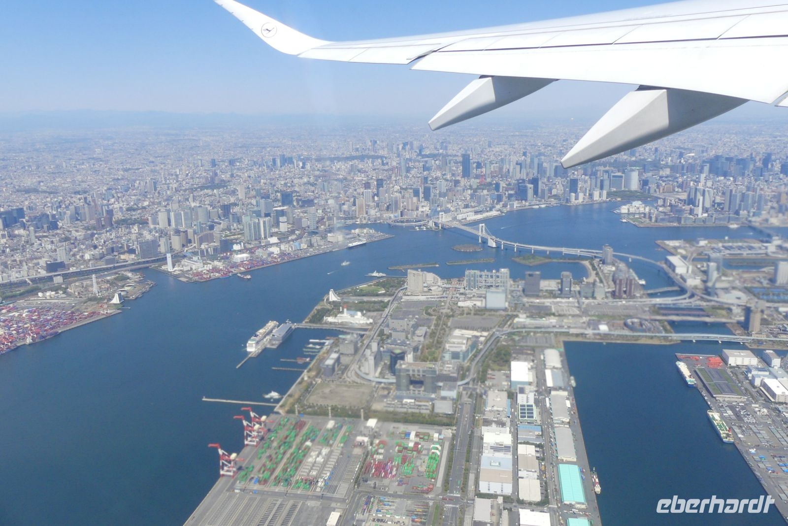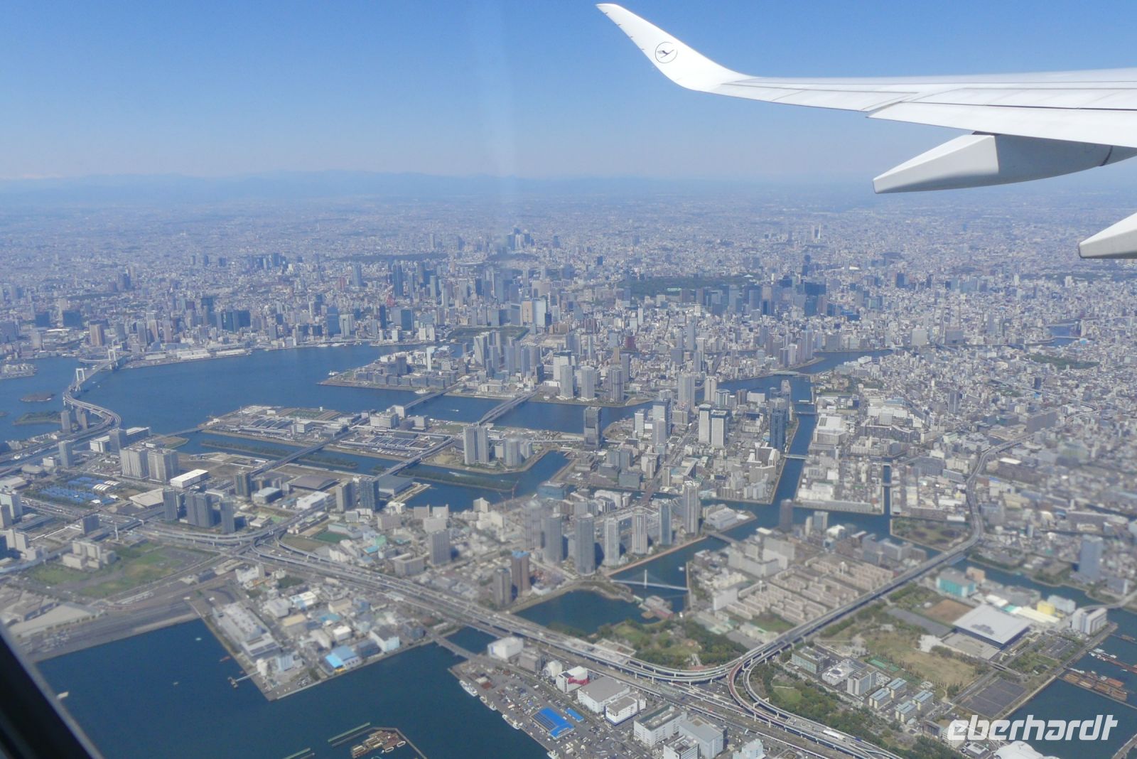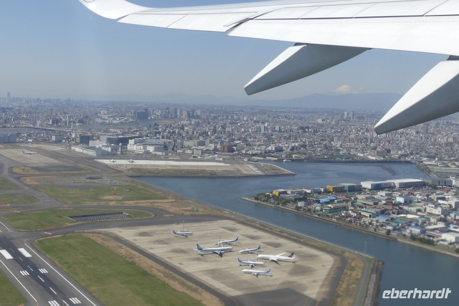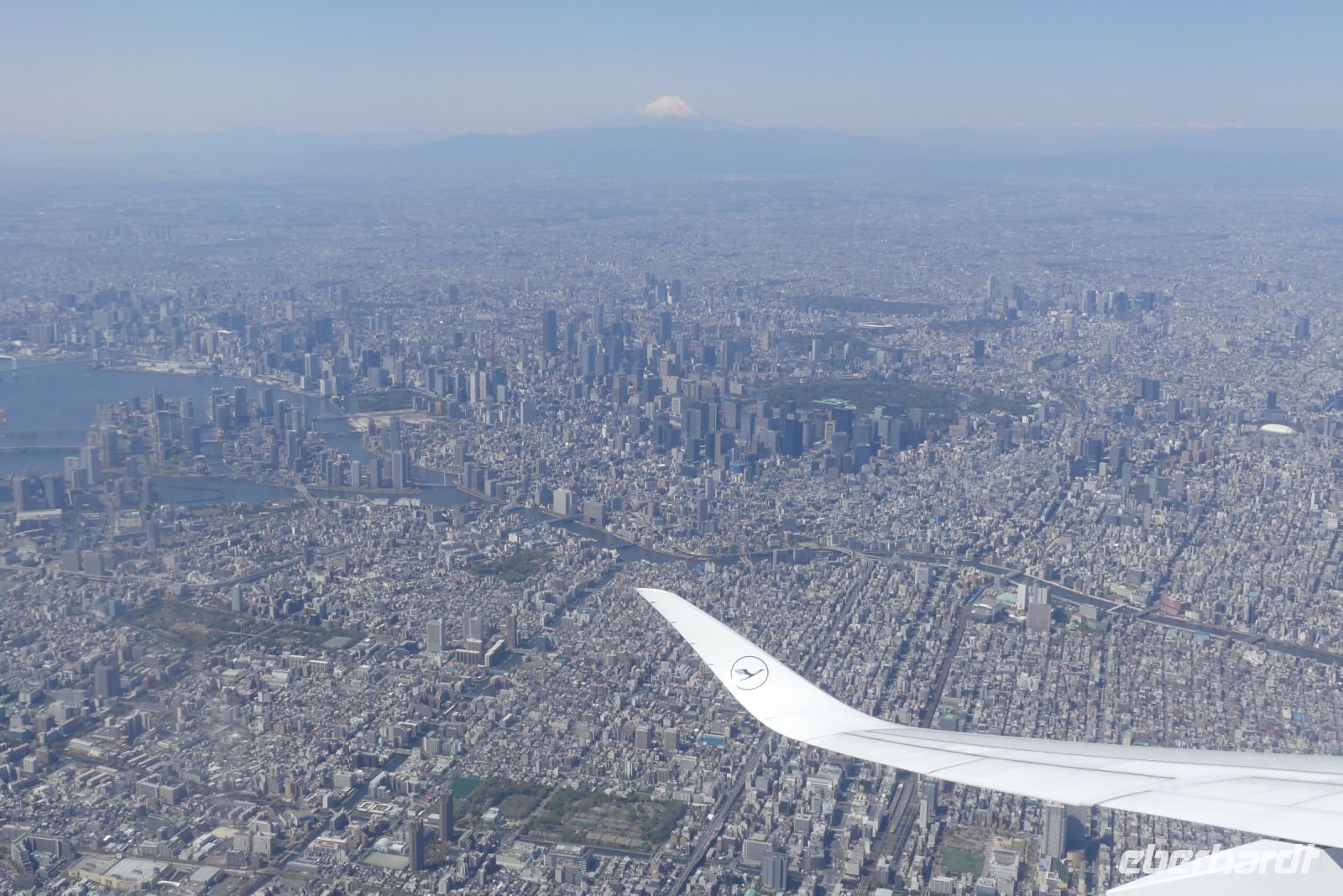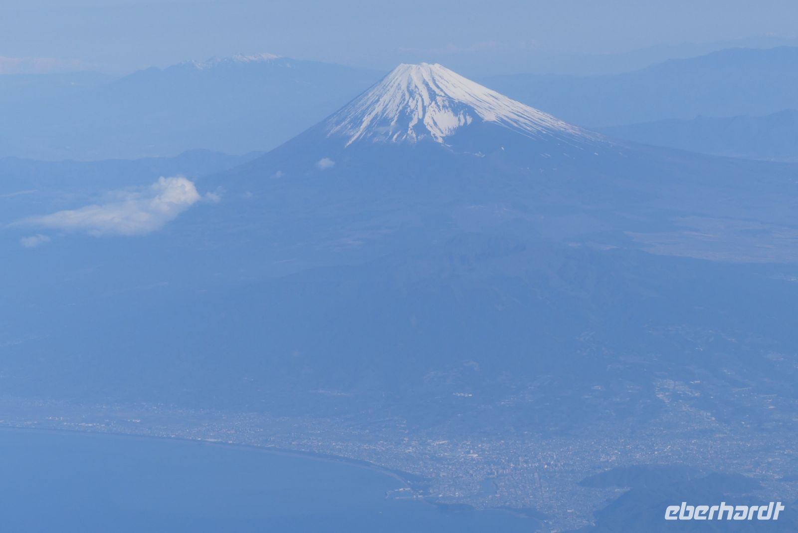 Guten Morgen Japan! Die Uhr stelle ich jetzt 8 Stunden nach vorn. Ein Blick aus dem Flugzeugfenster auf der linken Seite sorgt für ein freudiges Lächeln – Japan zeigt sich von seiner sonnigen Seite mit dem Schnee bedeckten Fuji voraus.