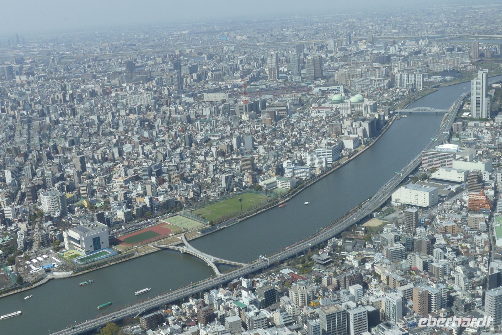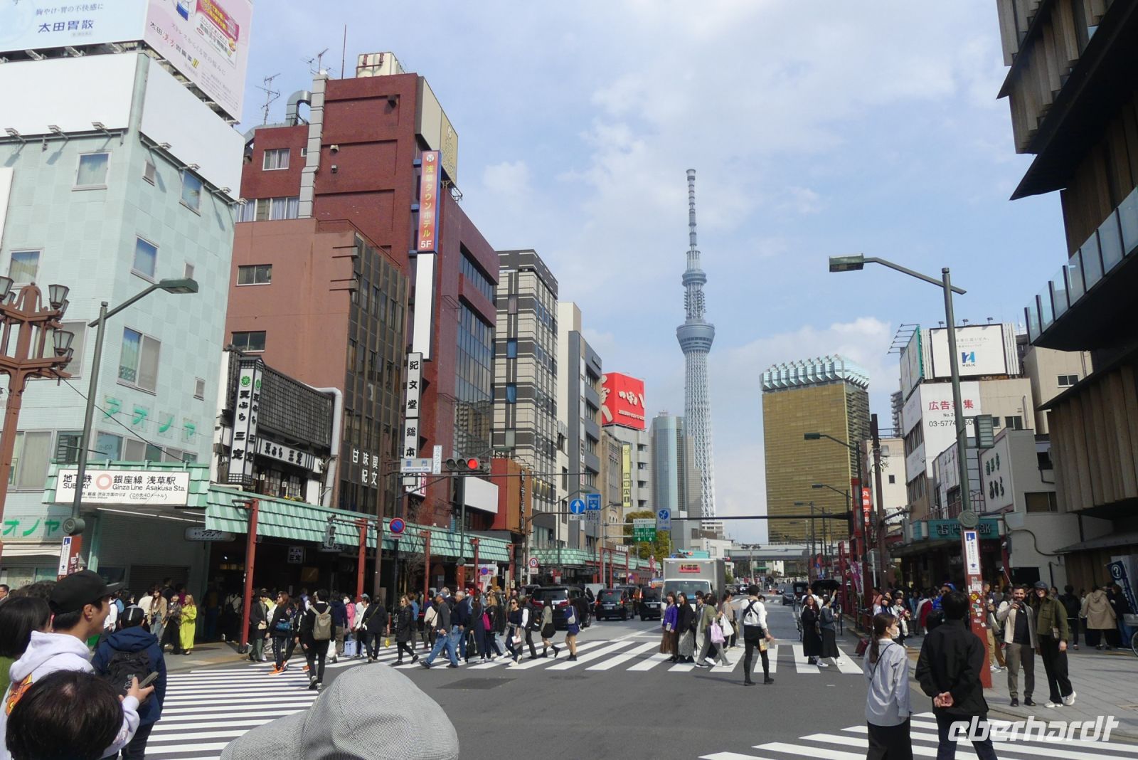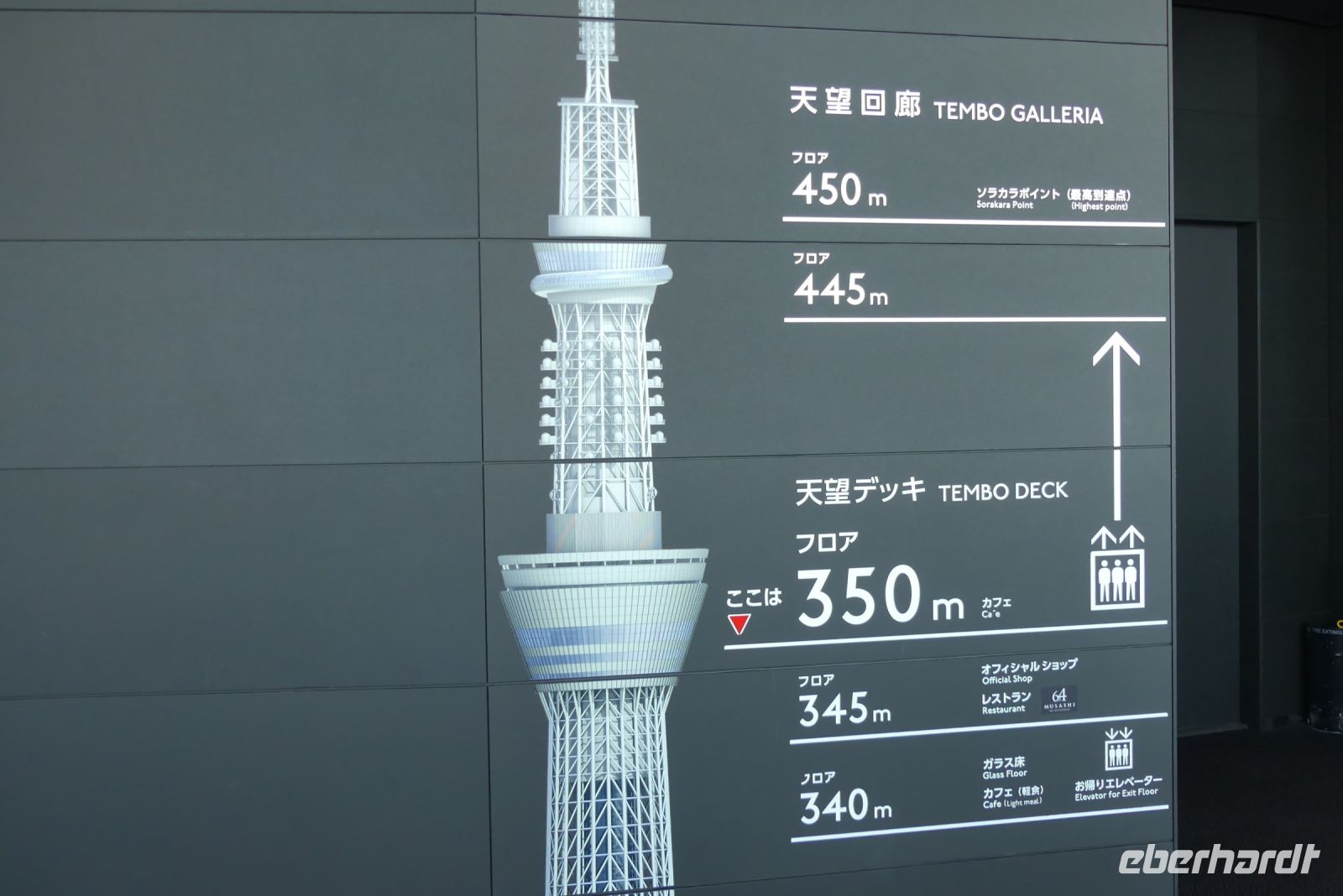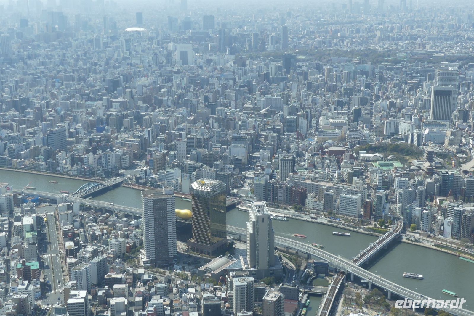 In Tokio geht es zum Anfang gleich hoch hinaus: nach einer kurzen Mittagspause fahren wir auf die 350 m hohe Aussichtsplattform des Skytrees. Dieser ist mit 634 m Höhe das derzeit dritthöchste Gebäude der Welt. Von hier oben bekommt man eine grobe Vorstellung von der riesigen Ausdehnung der Stadt. Obwohl es sonnig ist, können wir den über 100 km entfernten Fuji durch den Dunst allerdings nicht sehen.