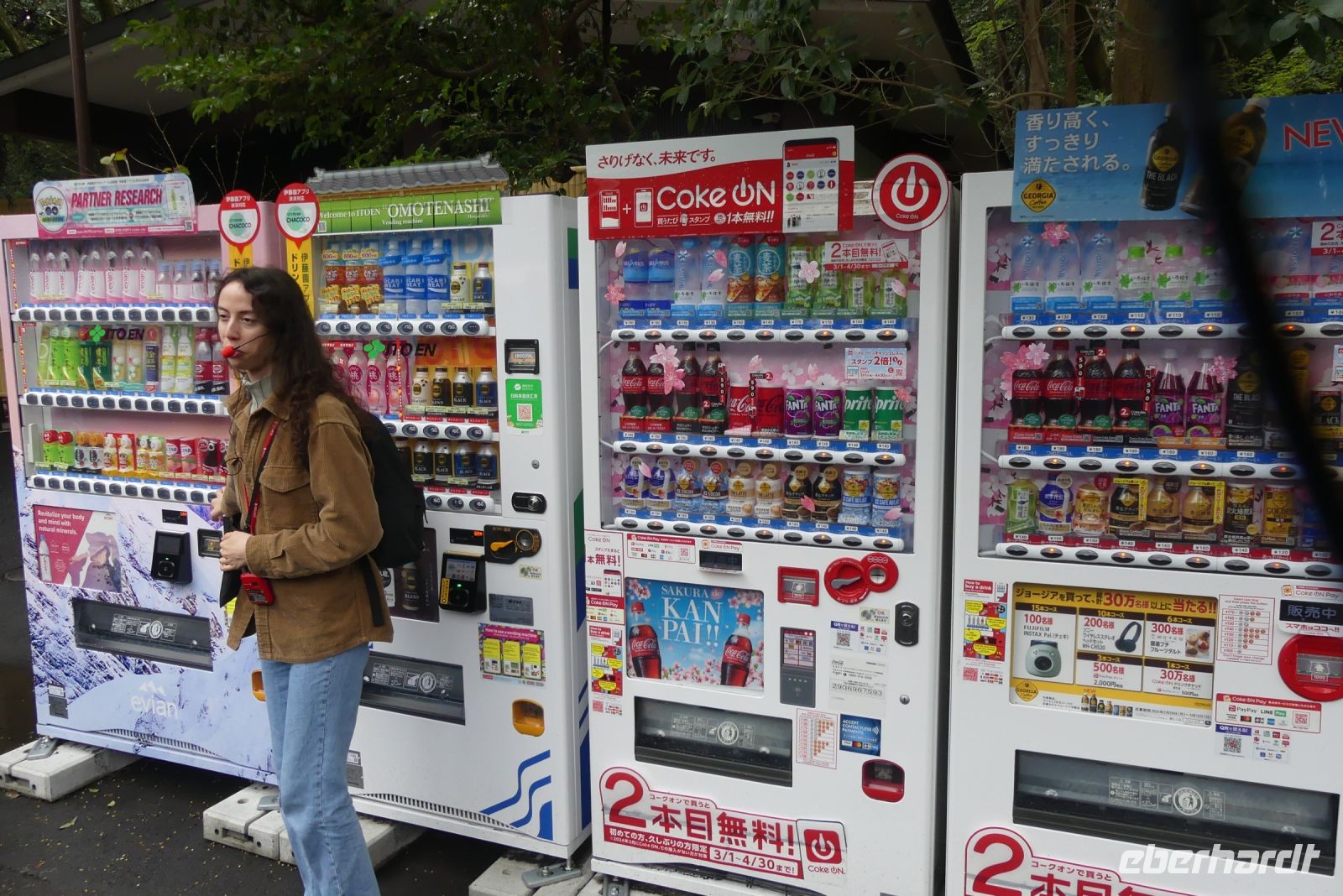Unsere Stadtbesichtigung von Tokio beginnen wir am Meiji-Schrein. Doch zuvor gibt es von Samira eine Einführung zur Bedienung von japanischen Getränkeautomaten: eigentlich ganz einfach, wenn man beachtet, dass der Automat zuerst Geld haben möchte, erst dann kann ausgewählt werden. Kalt- und Heißgetränke sind entsprechend blau und rot gekennzeichnet. Also ganz einfach…