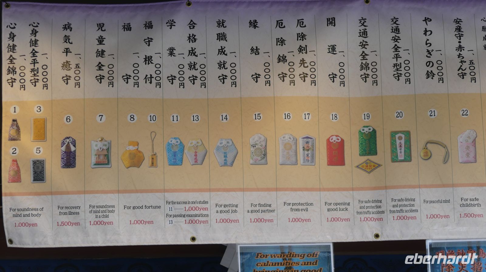 Im Prinzip werden fast an jeder Ecke und selbst in den heiligen Tempeln die bei den abergläubigen Japanern beliebten Glücksbringer verkauft. Da der gekaufte Wunsch nur ein Jahr hält, sind stetige Einnahmen gesichert…