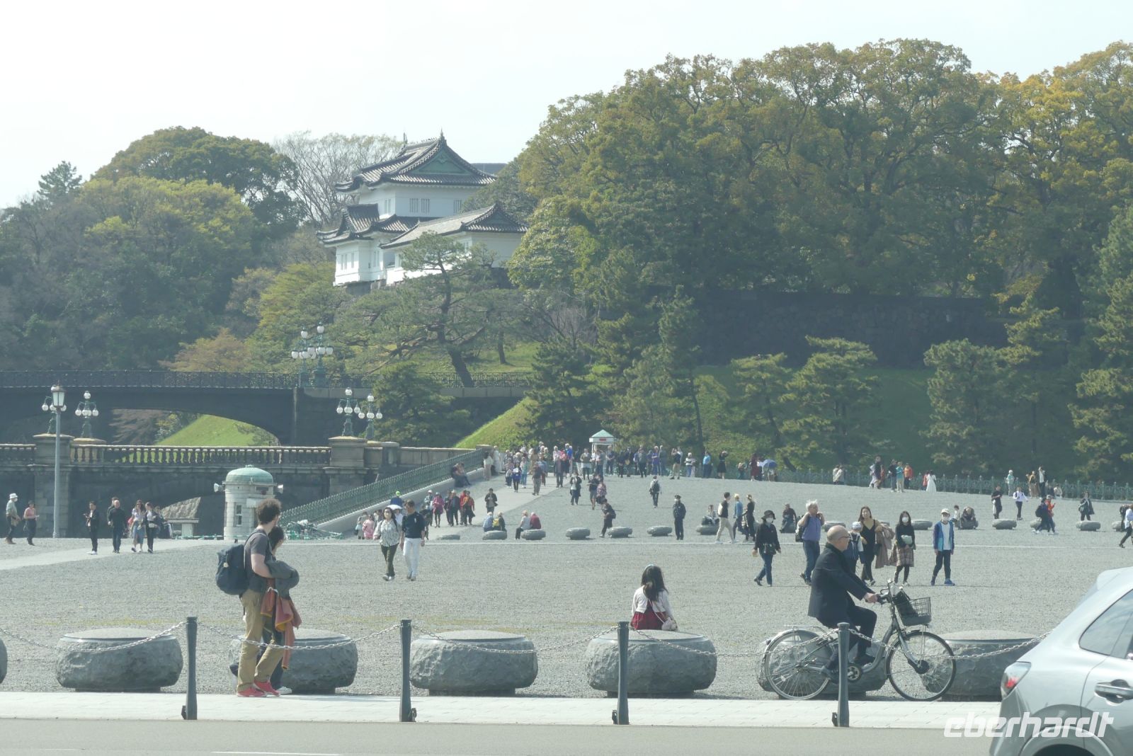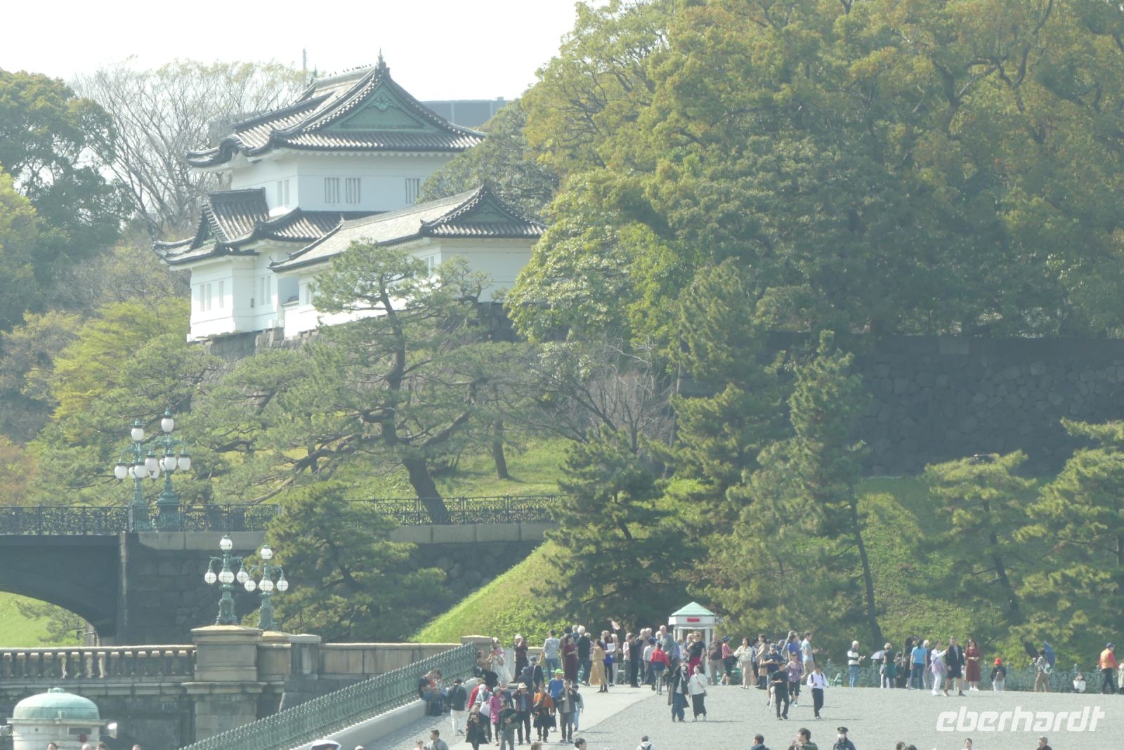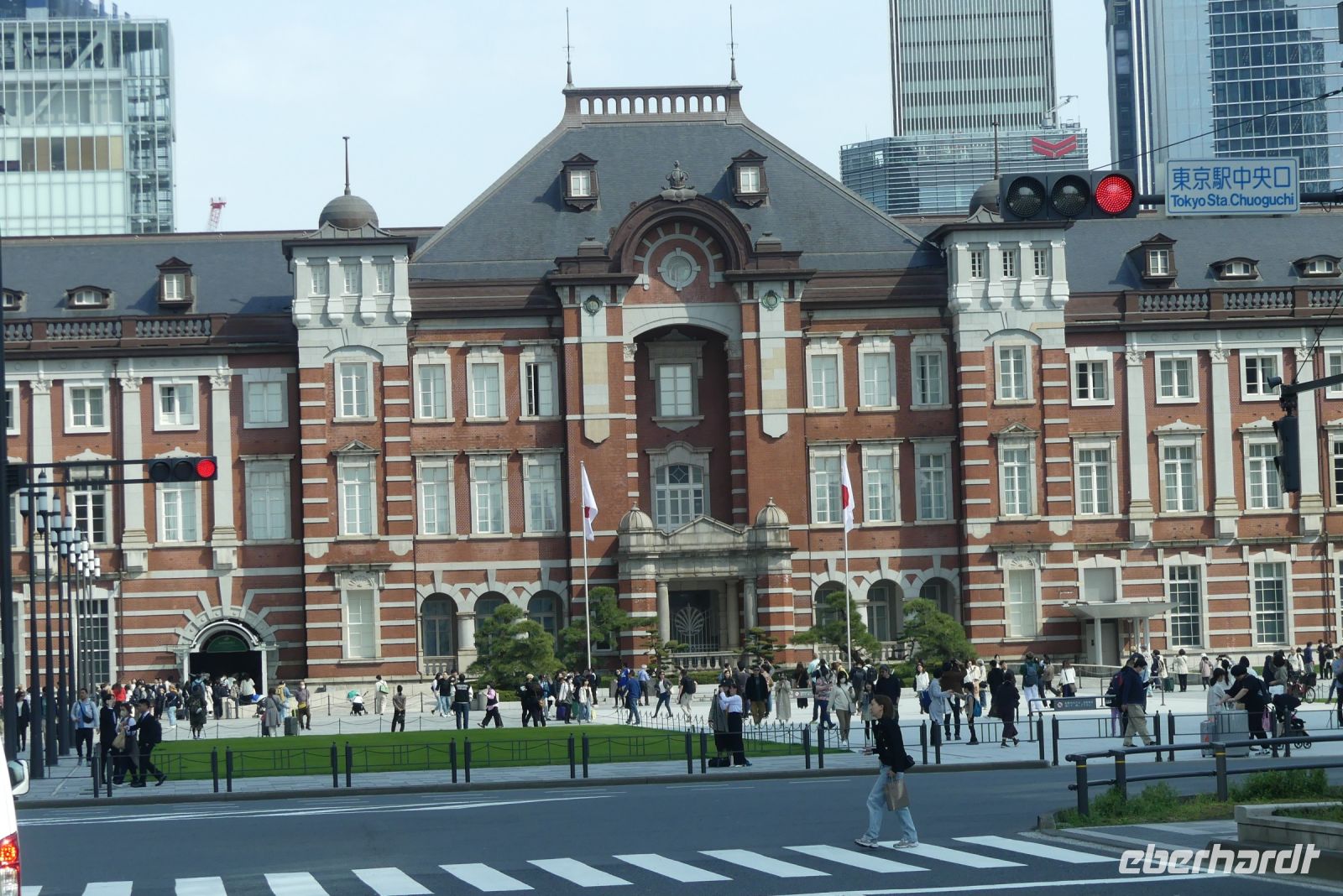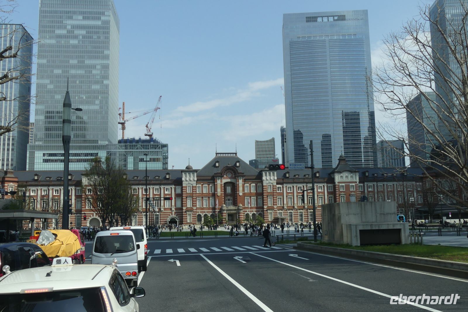 Inzwischen hat sich Herr Iwasaki Gedanken gemacht, wie er meiner Bitte nachkommen kann, am Kaiserpalast vorbeizufahren. So fahren wir nun an den äußeren Anlagen des Palastgeländes vorbei und passieren anschließend den Hauptbahnhof von Tokio – ein 1914 fertig gestellter Bau mit einer Fassade aus roten Mauerziegeln. Dem Bahnhofsgebäude wird eine gewisse Ähnlichkeit mit Bahnhof Amsterdam Centraal nachgesagt.