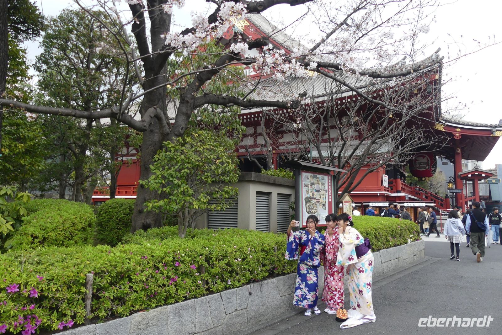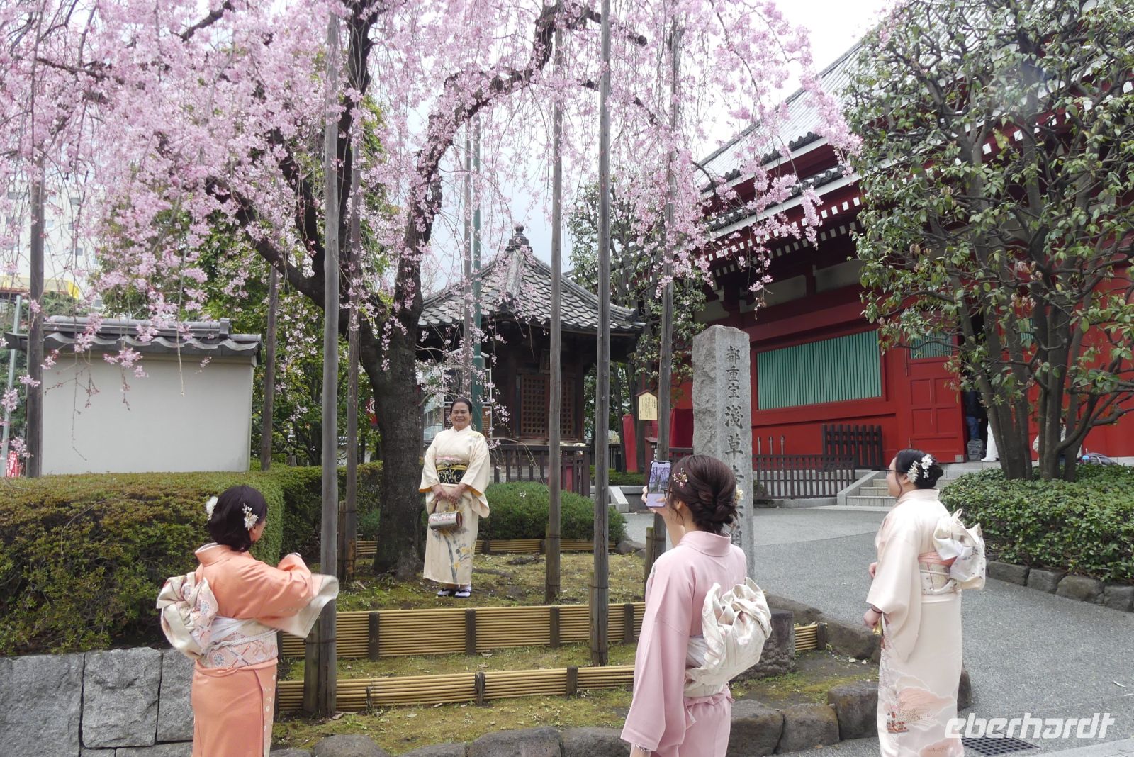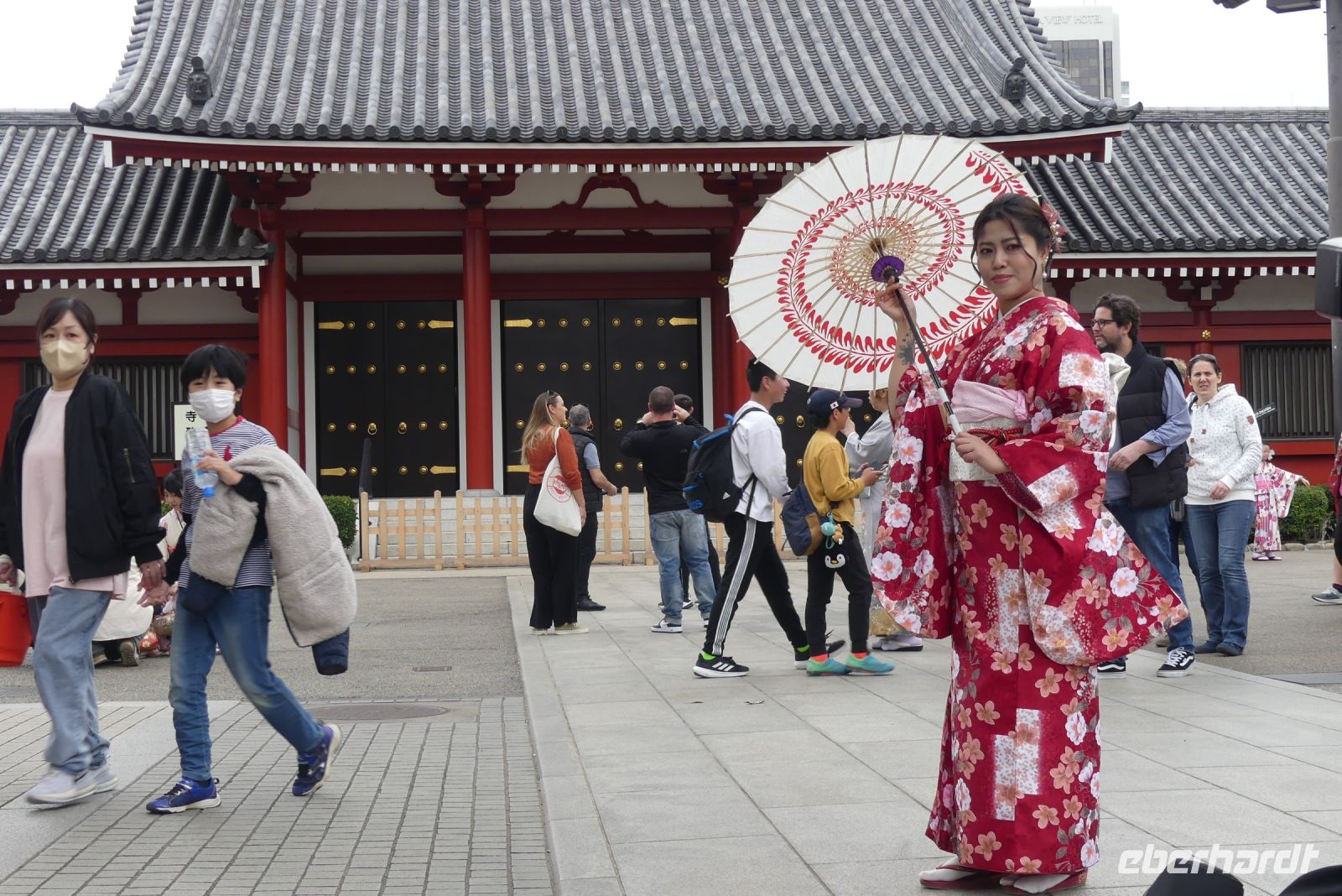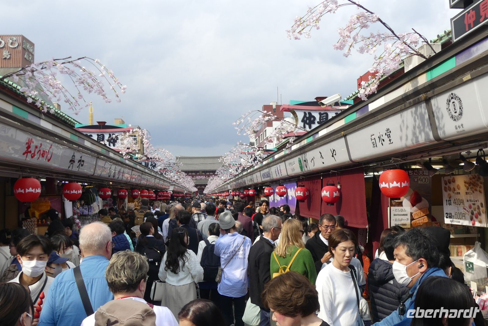 Unser nächster Halt ist das quirlige Asakusa-Viertel. Zunächst laufen wir an das Ufer des Sumida Flusses wo wir einen tollen Ausblick auf den Skytree und den Asahi Beer Tower haben – eine gute Kulisse für unser erstes Gruppenfoto. Dann folgen wir den Menschenmassen Richtung Senso-ji (auch Kannon- oder Kinryuzan-Tempels). Der Weg führt durch das eindrucksvolle Donnertor mit seiner 750 kg schweren Laterne und durch die sehr gut besuchte Ladenstraße Nakamise-dori. Auffällig ist, das viele Japanerinnen in traditioneller Kleidung, also mit einem schönen Kimono den buddhistischen Tempel besuchen. Sie wollen natürlich schöne Selfies mit dieser Kulisse für sich festhalten. Zusammen mit den blühenden Kirschbäumen und einem schönen japanischen Garten ergeben sich so auch für uns wunderbare Motive und Perspektiven, auch wenn sich die Sonne hinter den Wolken versteckt.