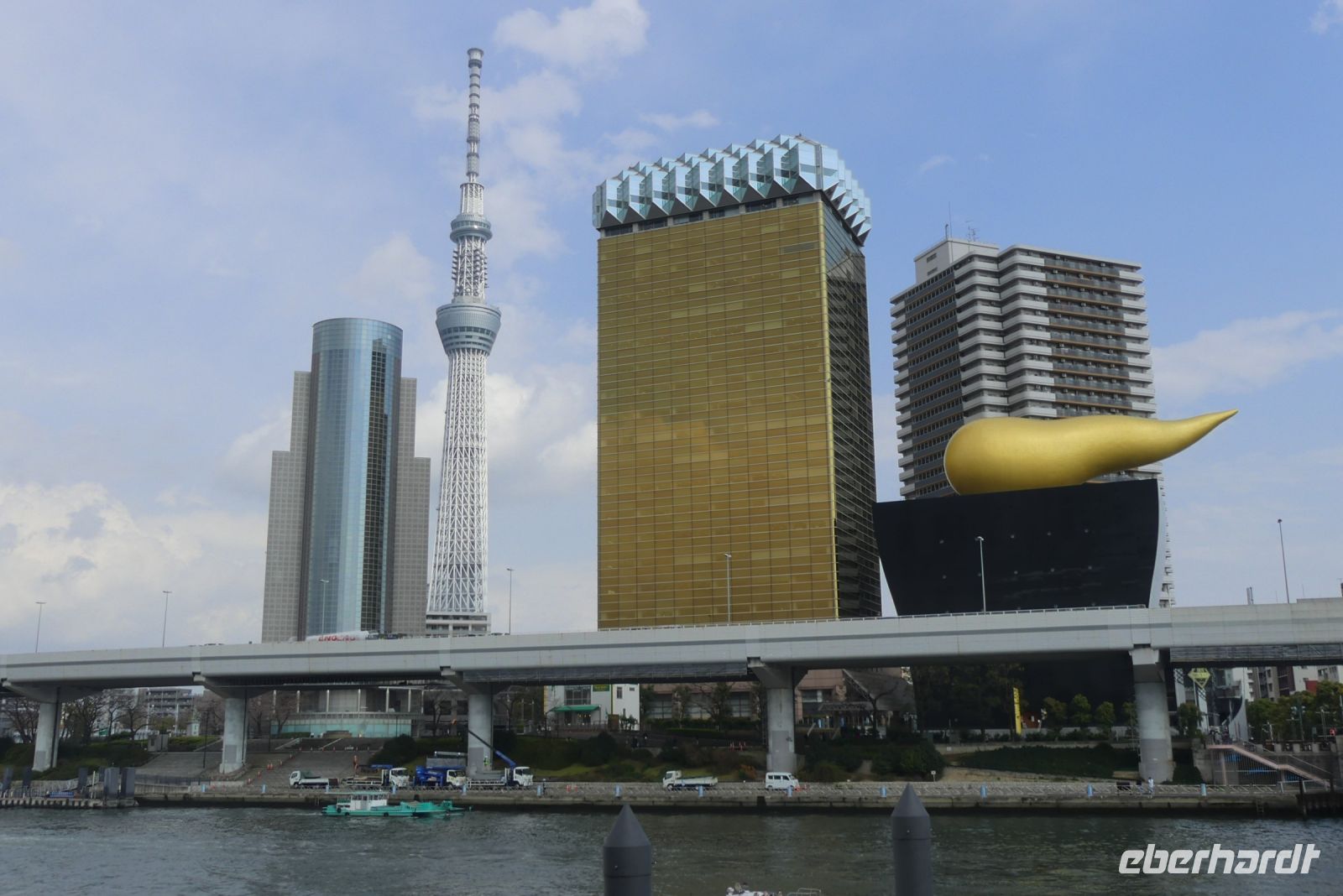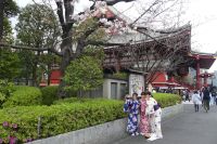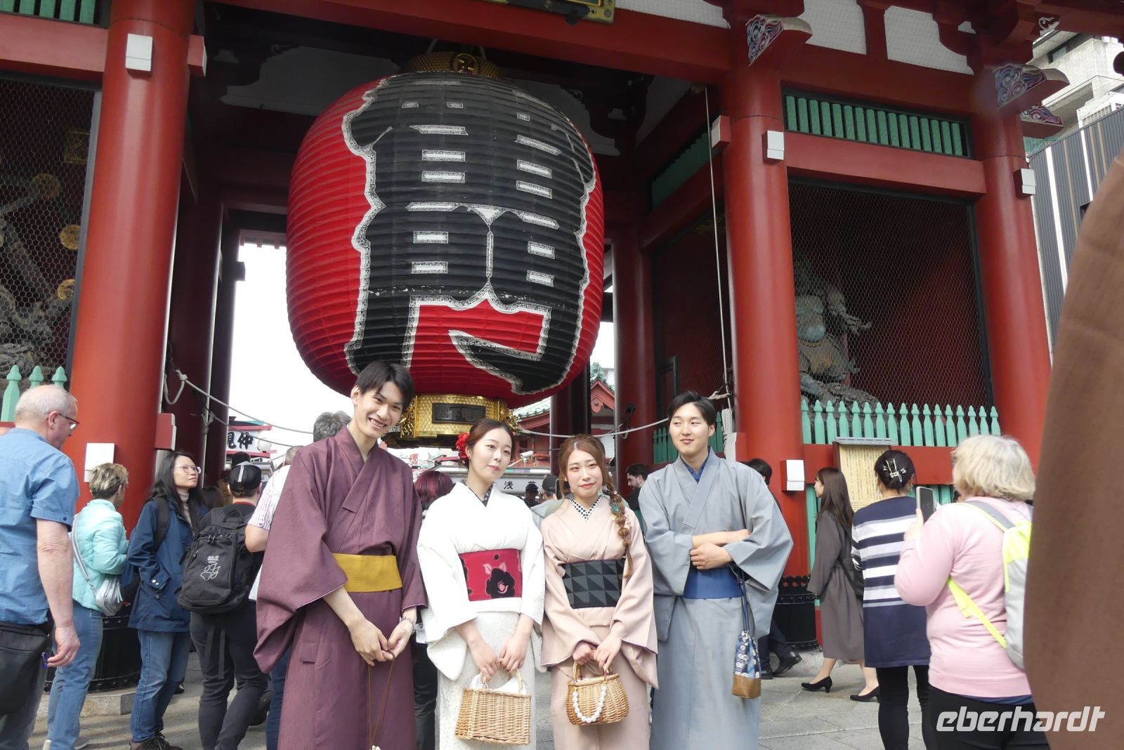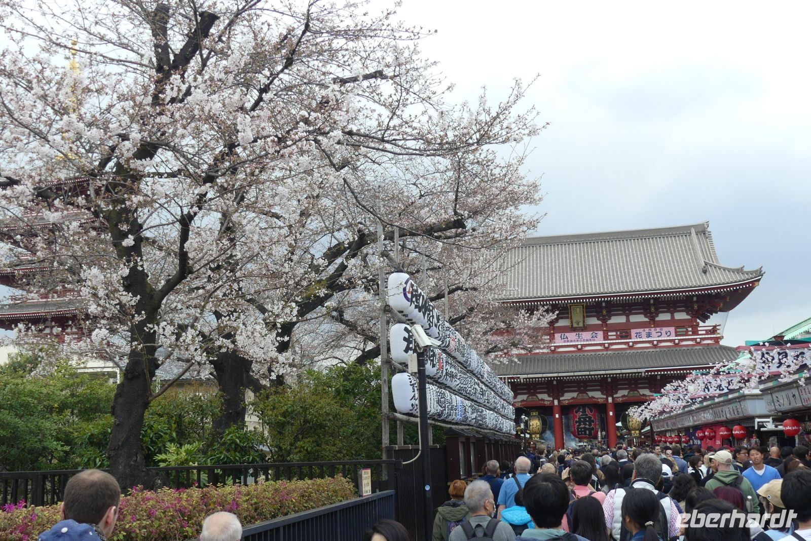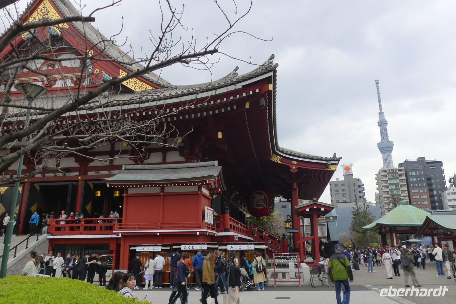 Unser nächster Halt ist das quirlige Asakusa-Viertel. Zunächst laufen wir an das Ufer des Sumida Flusses wo wir einen tollen Ausblick auf den Skytree und den Asahi Beer Tower haben – eine gute Kulisse für unser erstes Gruppenfoto. Dann folgen wir den Menschenmassen Richtung Senso-ji (auch Kannon- oder Kinryuzan-Tempels). Der Weg führt durch das eindrucksvolle Donnertor mit seiner 750 kg schweren Laterne und durch die sehr gut besuchte Ladenstraße Nakamise-dori. Auffällig ist, das viele Japanerinnen in traditioneller Kleidung, also mit einem schönen Kimono den buddhistischen Tempel besuchen. Sie wollen natürlich schöne Selfies mit dieser Kulisse für sich festhalten. Zusammen mit den blühenden Kirschbäumen und einem schönen japanischen Garten ergeben sich so auch für uns wunderbare Motive und Perspektiven, auch wenn sich die Sonne hinter den Wolken versteckt.
