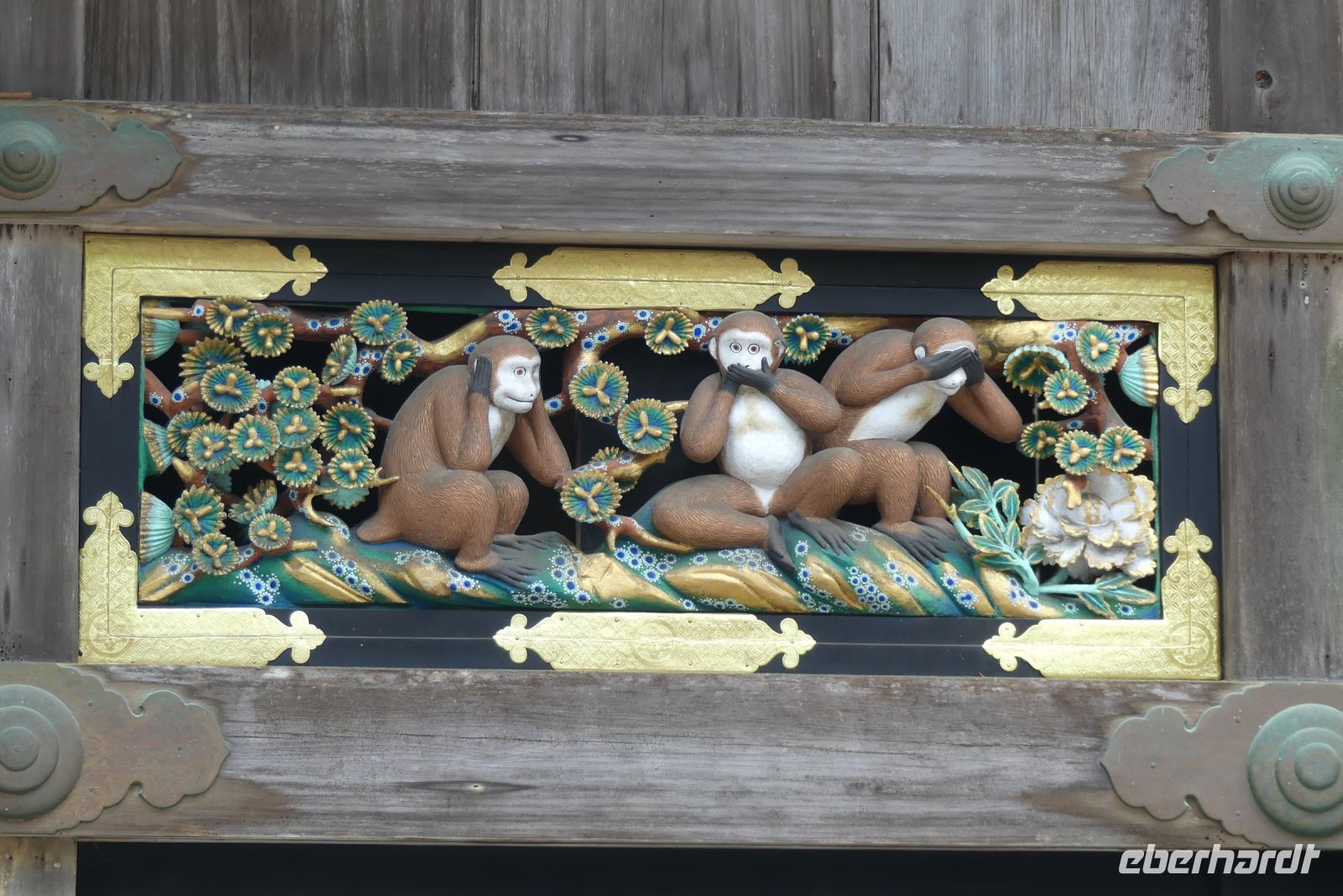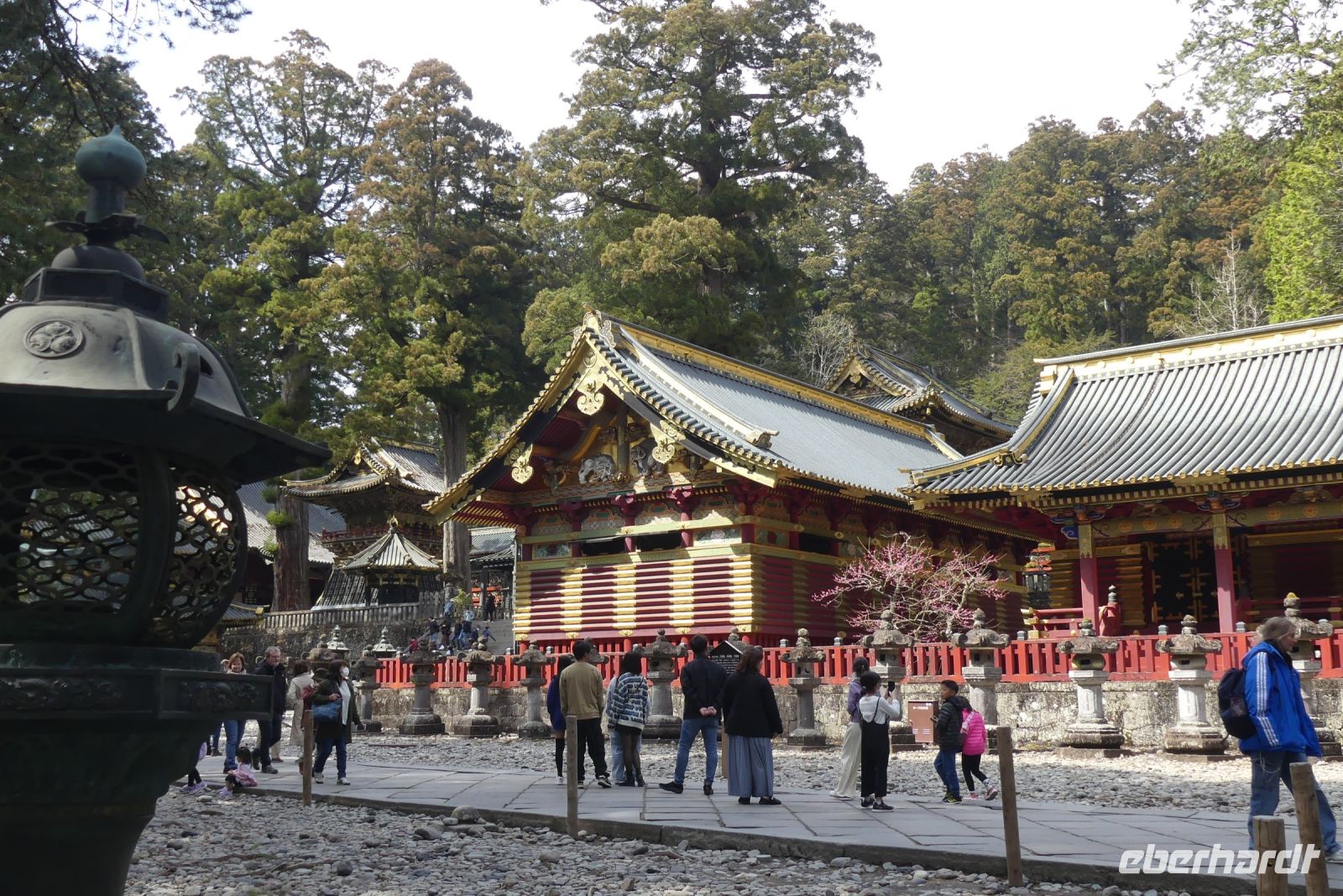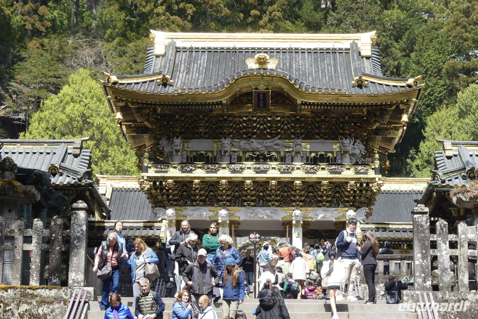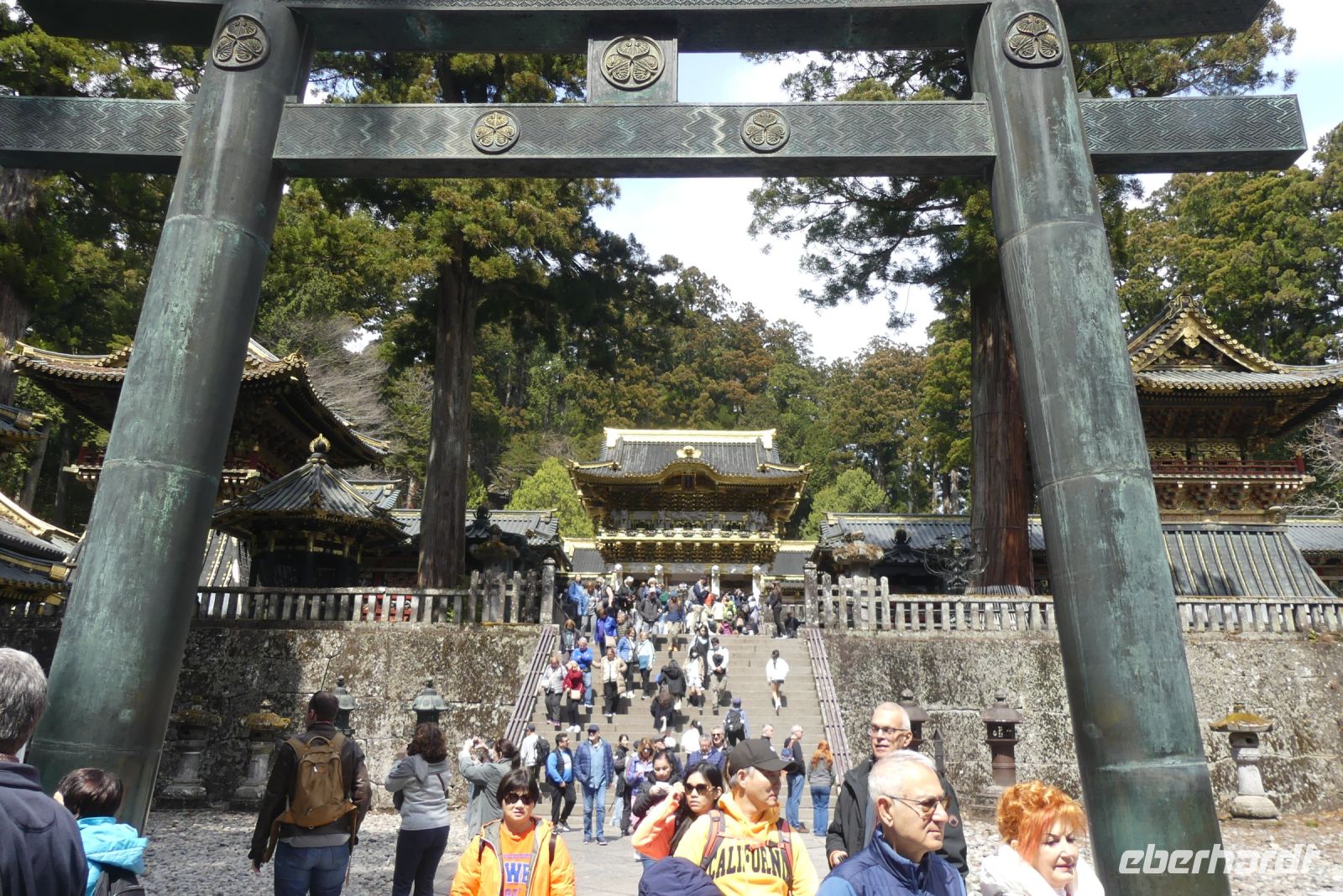 Die sehr weitläufige Anlage befindet sich eingebettet in einem imposanten Zedernwald (Japanische Zeder, auch Japanische Sicheltanne genannt). Für die Besichtigung benötigen wir mehrere Stunden und unsere Audioguides bewehren sich hier sehr gut. Mit dem Toshogu-Schrein wird der Samurai-Führer Tokugawa Ieyasu verehrt. Das Bemerkenswerte sind die vielen reich verzierten Gebäude mit zahlreichen Schnitzereien und meisterhaften Verzierungen (UNESCO-Weltkulturerbe). Hervorzuheben sind das Yomeimon-Tor als das am stärksten verzierte Tor in ganz Japan, der reich vergoldete innere Schrein (Okumiya), Schnitzereien von imaginären Elefanten, von einem Künstler geschnitzt, der niemals in der Realität einen Elefanten gesehen hat oder die berühmt gewordenen drei weisen Affen. Der erste Affe sieht nichts Böses, der zweite spricht nichts Böses und der dritte hört nichts Böses. Diese Schnitzerei ist Teil einer Bildserie am Stall des heiligen Pferdes.