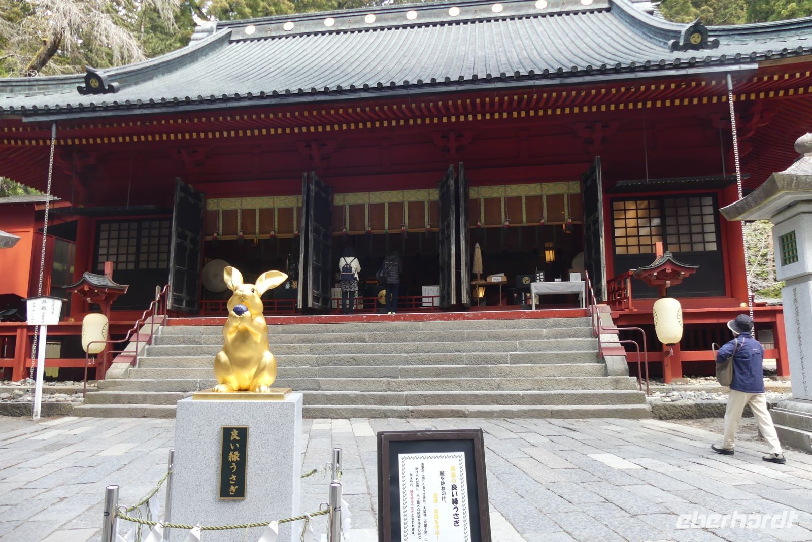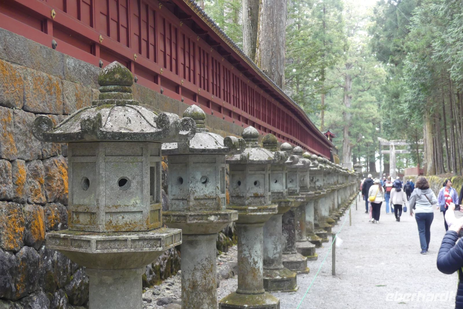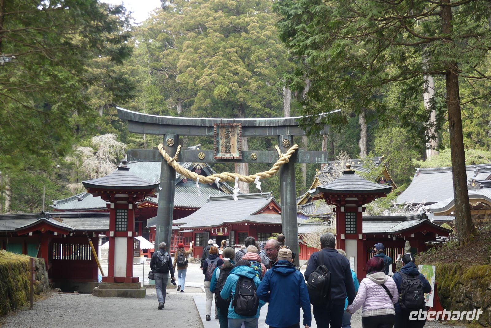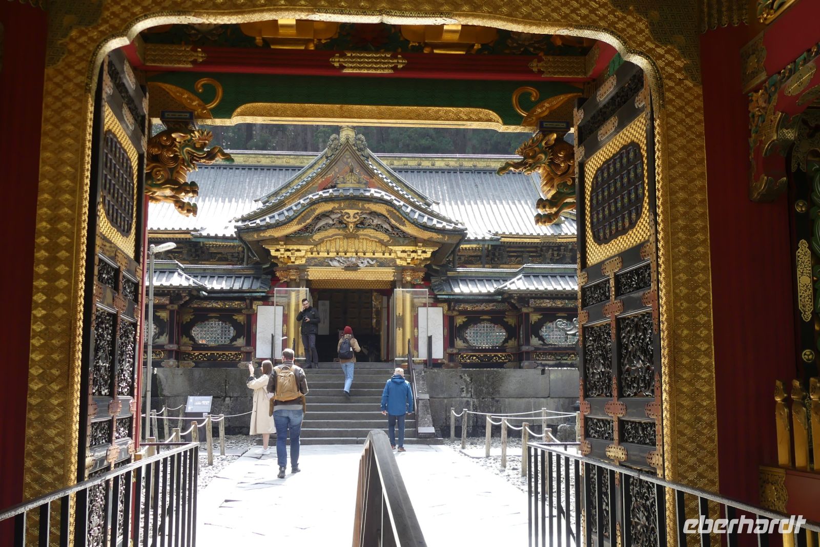 Die sehr weitläufige Anlage befindet sich eingebettet in einem imposanten Zedernwald (Japanische Zeder, auch Japanische Sicheltanne genannt). Für die Besichtigung benötigen wir mehrere Stunden und unsere Audioguides bewehren sich hier sehr gut. Mit dem Toshogu-Schrein wird der Samurai-Führer Tokugawa Ieyasu verehrt. Das Bemerkenswerte sind die vielen reich verzierten Gebäude mit zahlreichen Schnitzereien und meisterhaften Verzierungen (UNESCO-Weltkulturerbe). Hervorzuheben sind das Yomeimon-Tor als das am stärksten verzierte Tor in ganz Japan, der reich vergoldete innere Schrein (Okumiya), Schnitzereien von imaginären Elefanten, von einem Künstler geschnitzt, der niemals in der Realität einen Elefanten gesehen hat oder die berühmt gewordenen drei weisen Affen. Der erste Affe sieht nichts Böses, der zweite spricht nichts Böses und der dritte hört nichts Böses. Diese Schnitzerei ist Teil einer Bildserie am Stall des heiligen Pferdes.