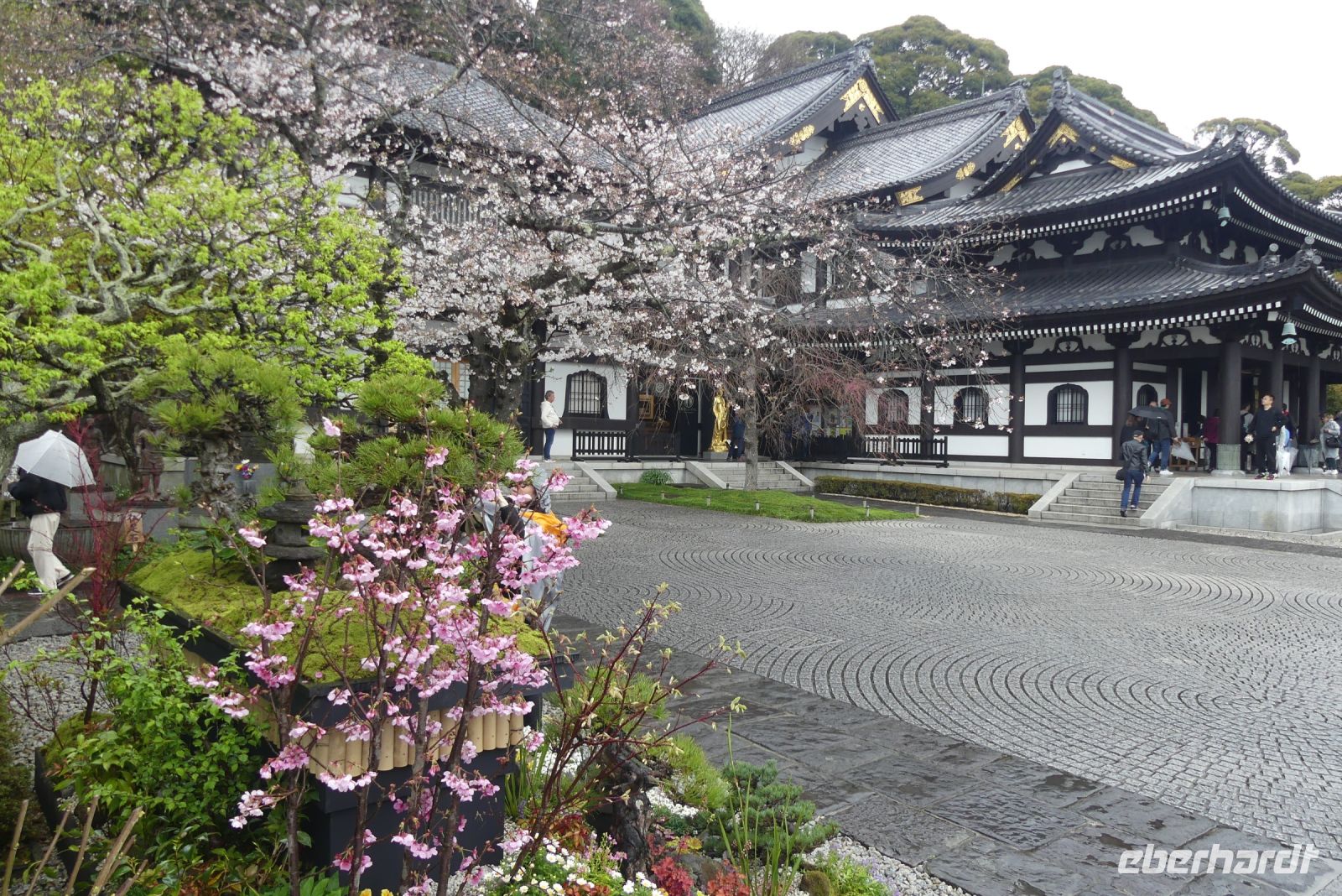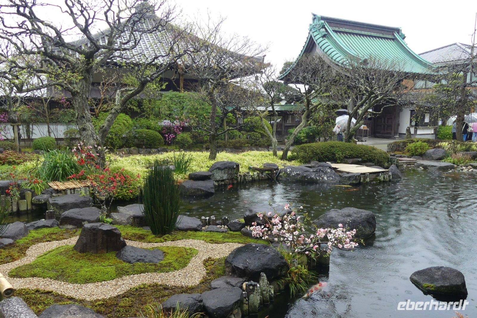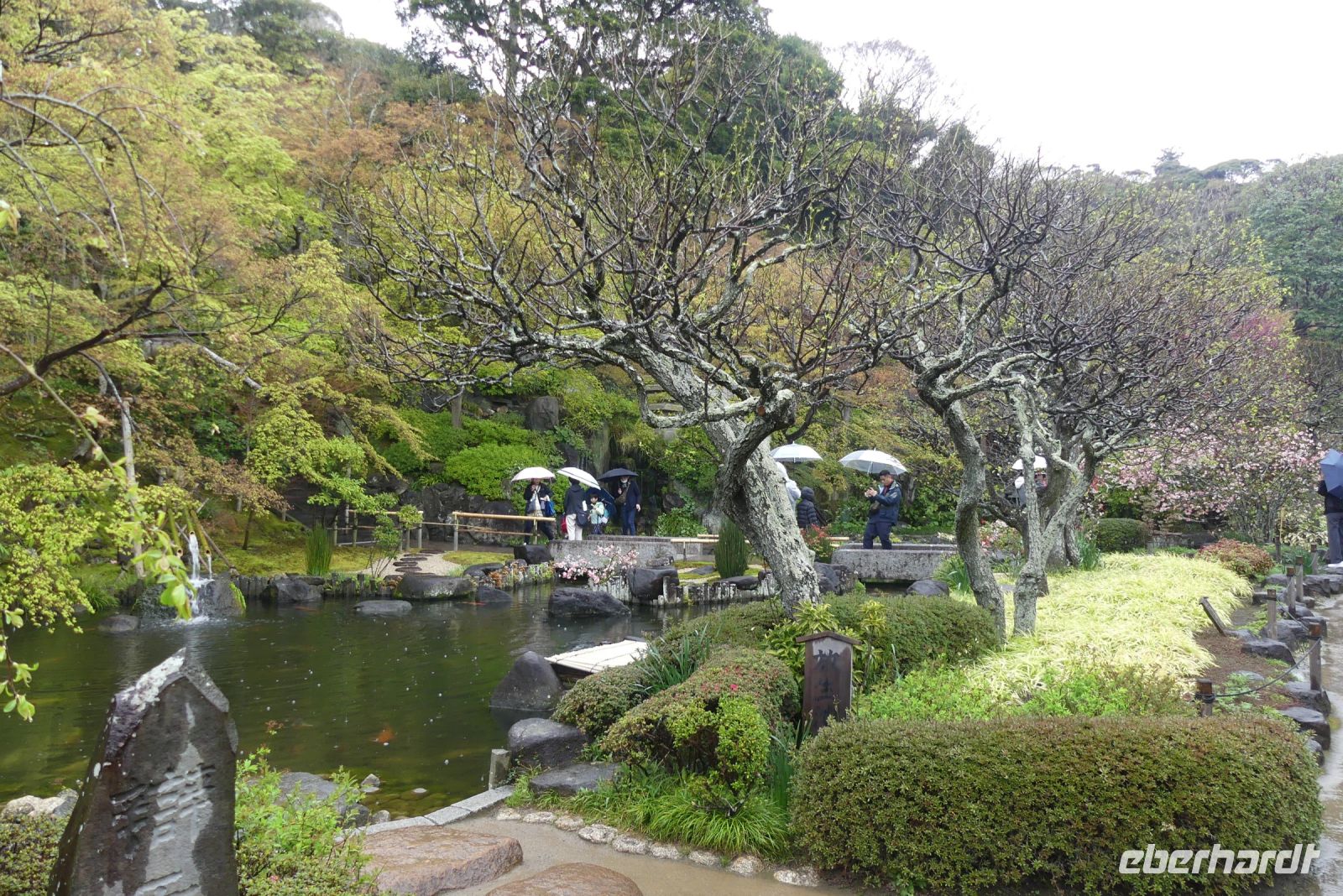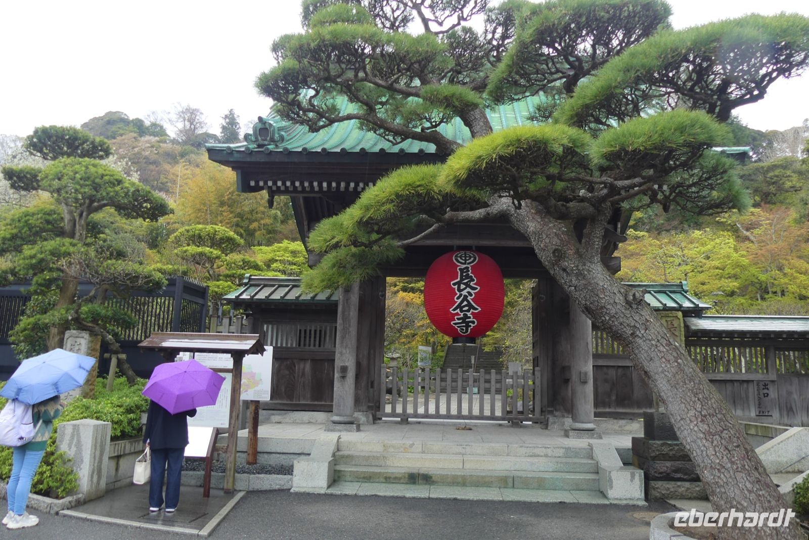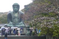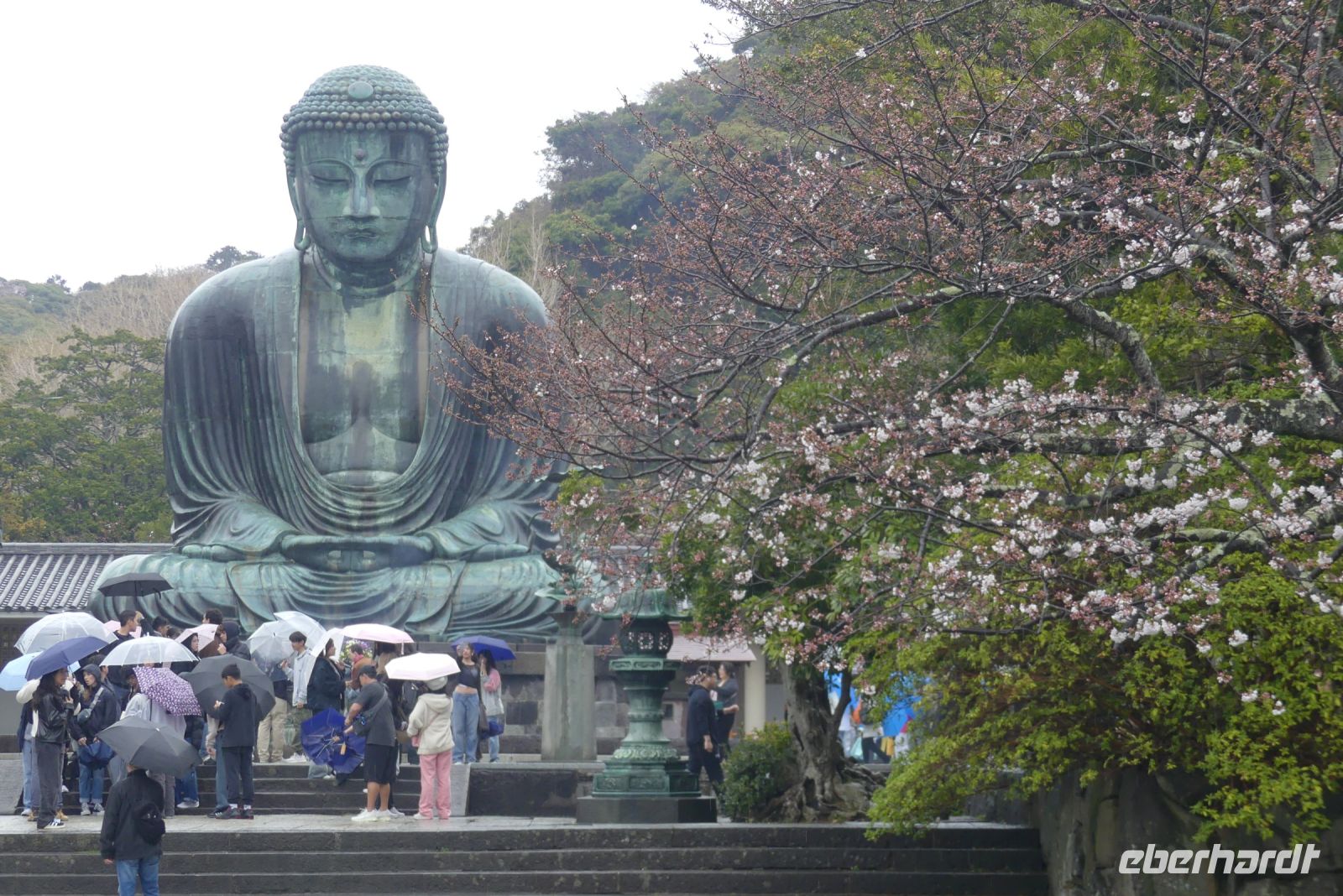 Vorbei am Flughafen Haneda kommen wir nach Kawasaki und über die ca. 2 km lange und imposante Yokohama Bay Bridge nach Yokohama. Inzwischen hat es wie vorhergesagt angefangen, leicht zu regnen. Doch trotz Regen lassen wir uns die Freude bei unseren Besichtigungen in Kamakura nicht nehmen. Außerdem meint unser Busfahrer, dass wir mit dem Regen Glück haben, weil so weniger Besucher unterwegs sind und wir besser einen Parkplatz finden. Zunächst besuchen wir den Hasedera-Tempel mit einem sehr schönen und gepflegten japanischen Zengarten. Hier blühen die Kirschbäume und die ersten Azaleen. In kleinen Teichen tummeln sich Kois. Interessant sind auch die in den Fels gehauene Grotte, viele Details am Rande und die Aussicht auf den Pazifik.