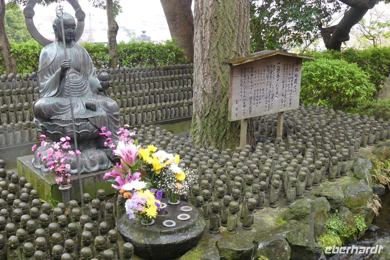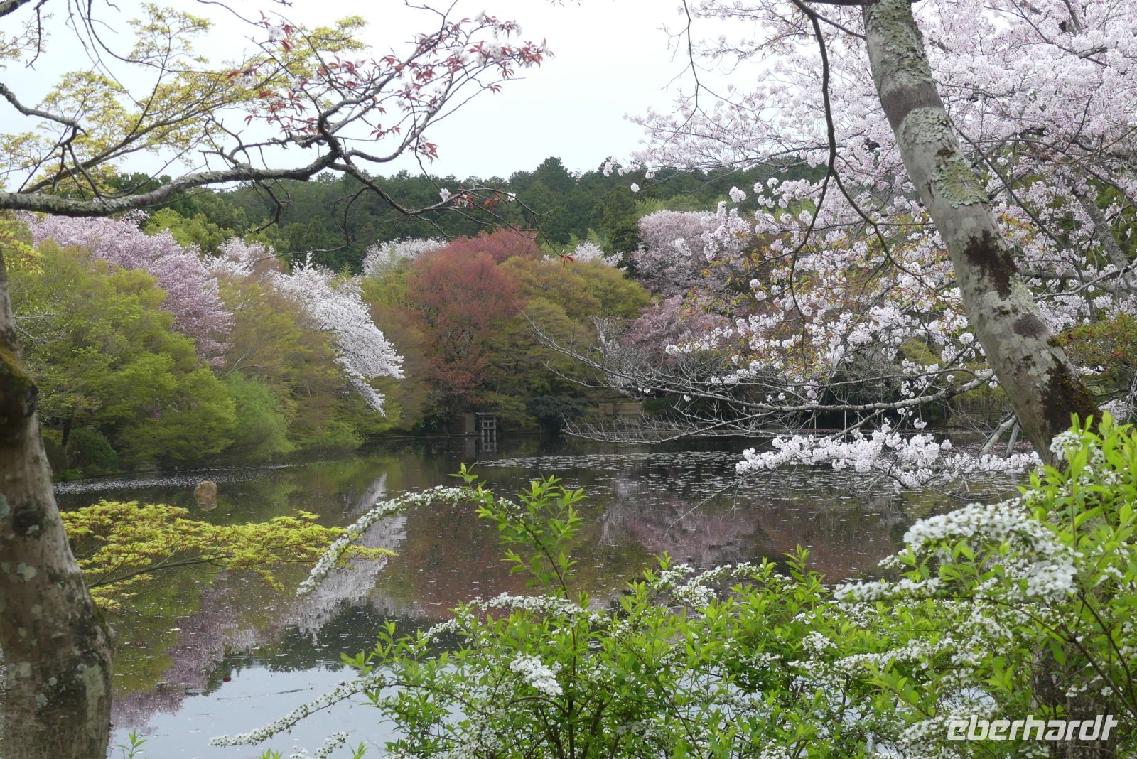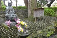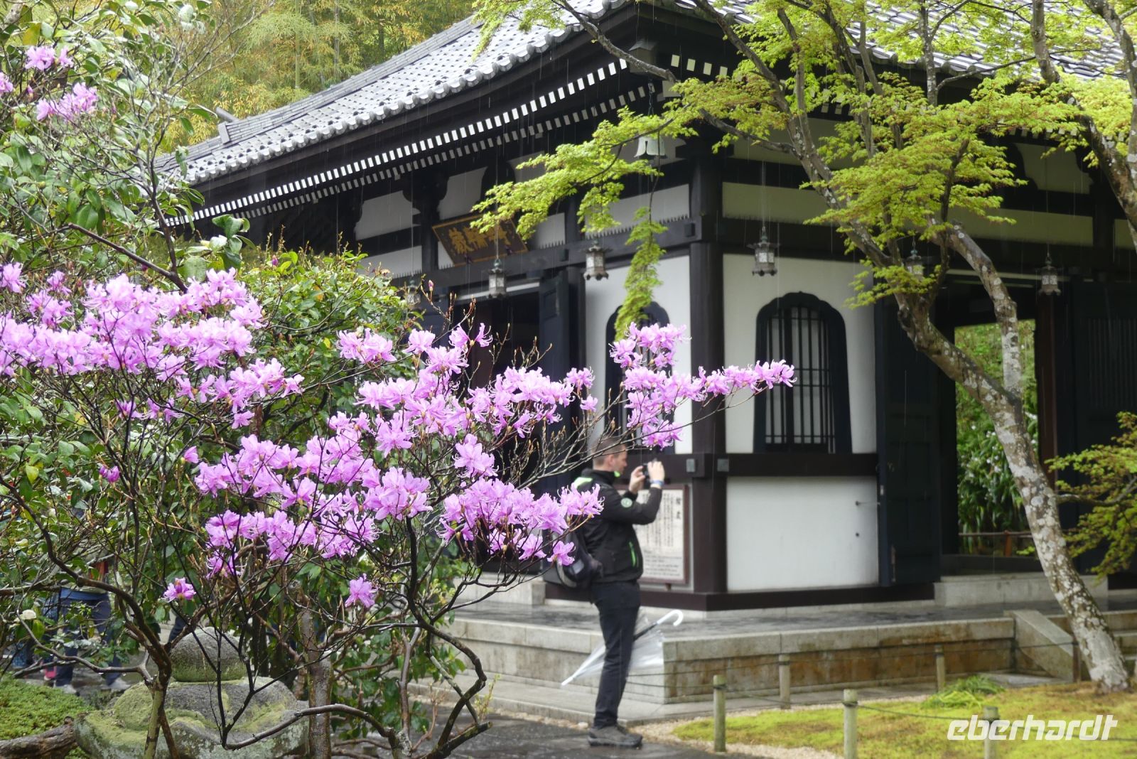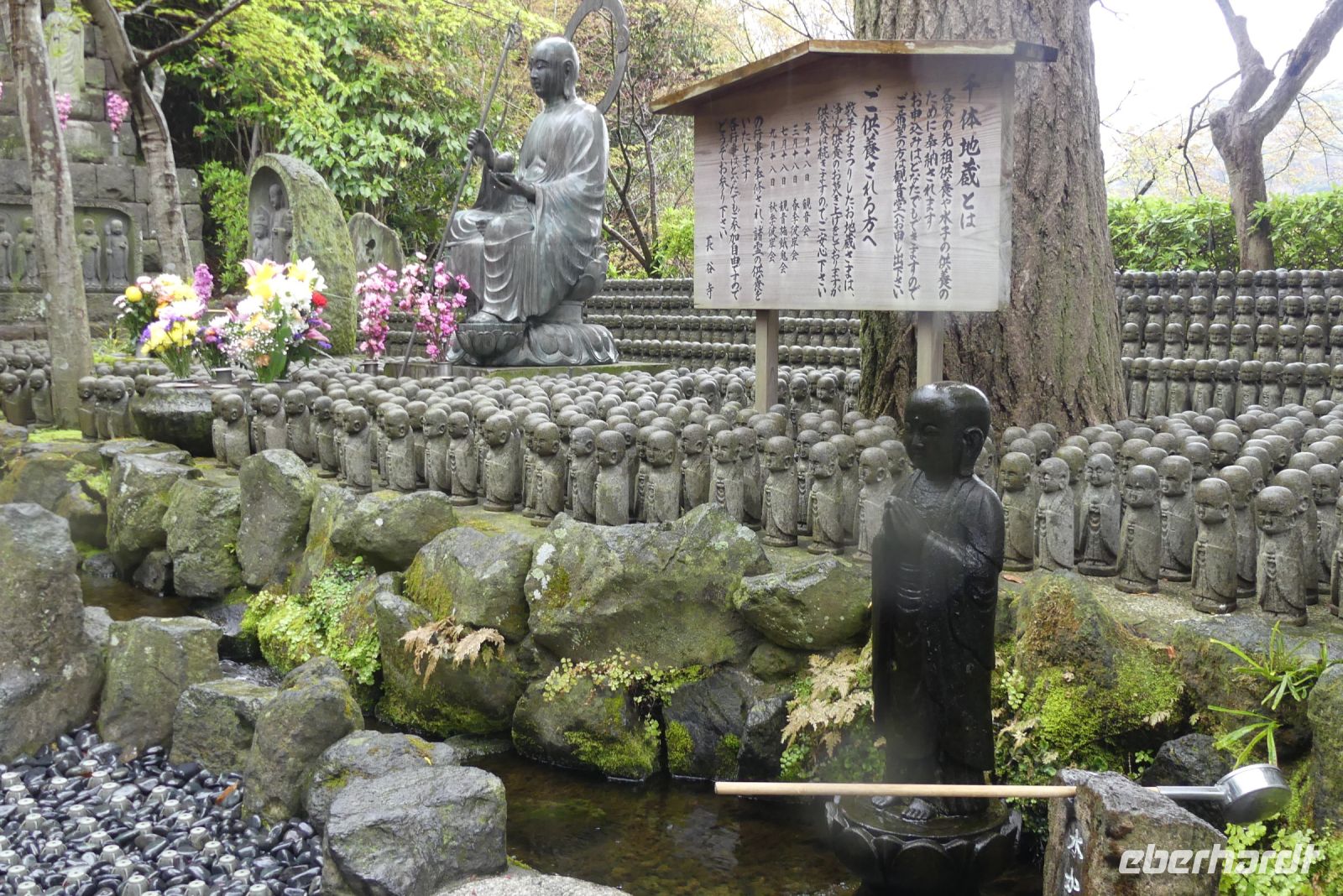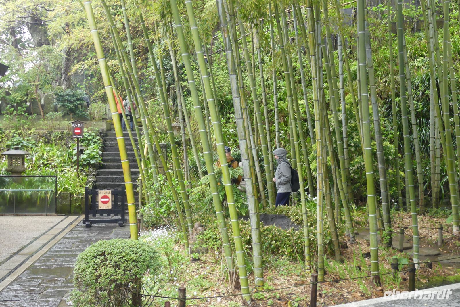 Vorbei am Flughafen Haneda kommen wir nach Kawasaki und über die ca. 2 km lange und imposante Yokohama Bay Bridge nach Yokohama. Inzwischen hat es wie vorhergesagt angefangen, leicht zu regnen. Doch trotz Regen lassen wir uns die Freude bei unseren Besichtigungen in Kamakura nicht nehmen. Außerdem meint unser Busfahrer, dass wir mit dem Regen Glück haben, weil so weniger Besucher unterwegs sind und wir besser einen Parkplatz finden. Zunächst besuchen wir den Hasedera-Tempel mit einem sehr schönen und gepflegten japanischen Zengarten. Hier blühen die Kirschbäume und die ersten Azaleen. In kleinen Teichen tummeln sich Kois. Interessant sind auch die in den Fels gehauene Grotte, viele Details am Rande und die Aussicht auf den Pazifik.