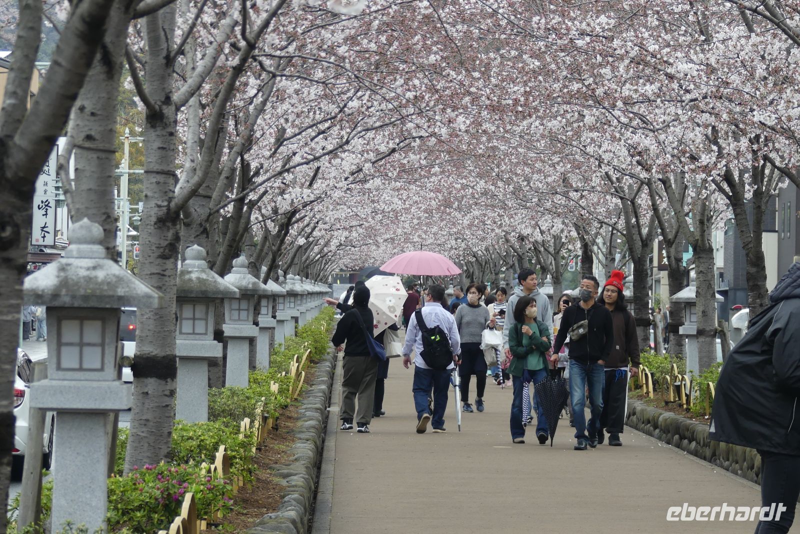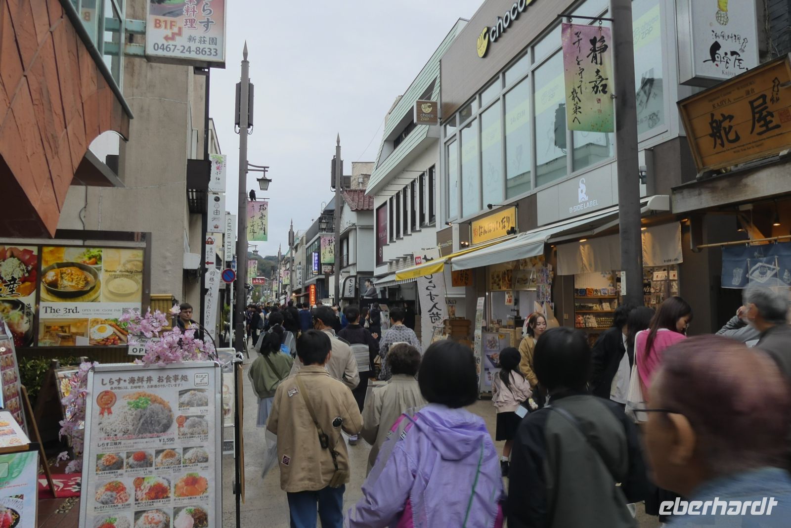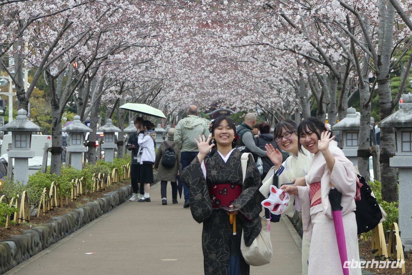 Zur Mittagszeit halten wir uns im Zentrum von Kamakura auf. Wir haben Glück, das zu dieser Zeit der Regen eine Pause macht. Blickfang ist eine mehrere hundert Meter lange Kirschbaumallee, welche auf einen Schrein zuführt. Die Kirschblüte hat hier Stufe 3 von 6 erreicht, also kurz vor der maximalen Blütenpracht :-) In der Parallelstraße befindet sich eine lange Fußgängerzone wo es neben diversen Geschäften auch eine große Auswahl an Speisen und Naschereien gibt.
