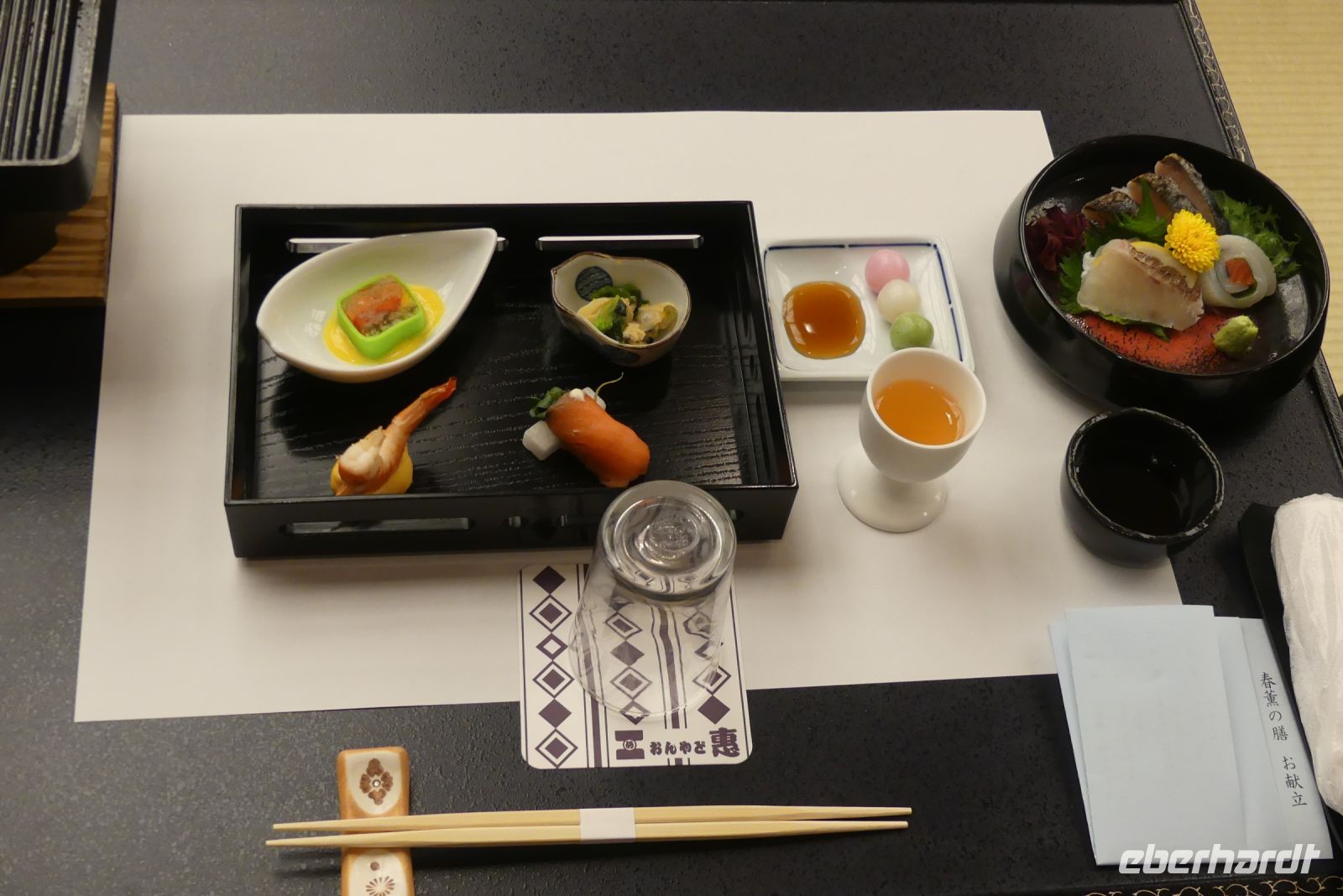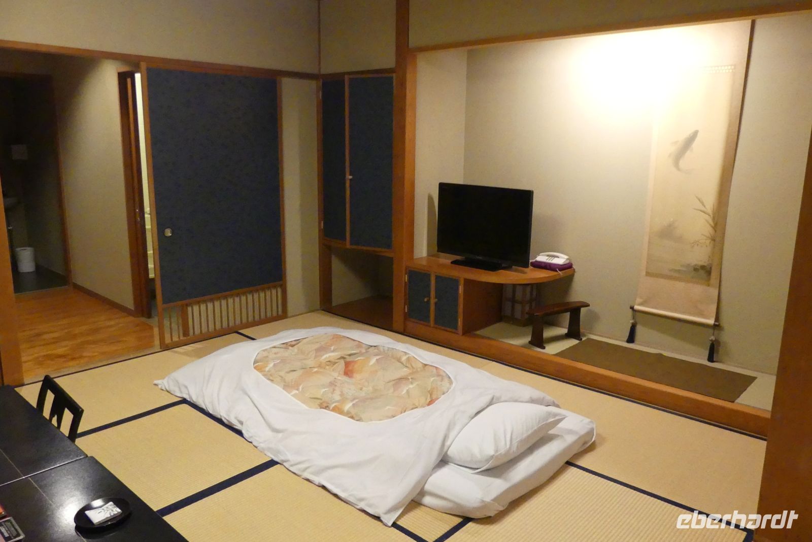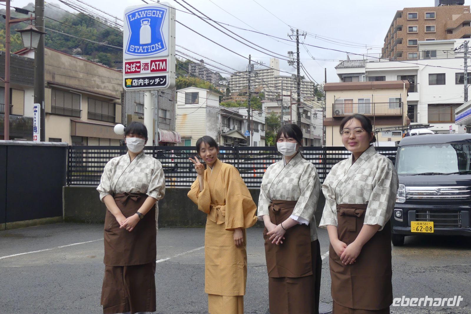 Am Nachmittag erreichen wir unser Hotel in Yugawara. Ein freundlicher Mitarbeiter des Hotels ist mit seinem Regenschirm bemüht, dass wir beim Ausstieg aus dem Bus nicht nass werden. Den Check-In nutzen wir gleich noch, um Samiras Geburtstag zu würdigen. Bei unserem Hotel handelt es sich um ein traditionelles Ryokan. Die großen Zimmer sind mit dem Nötigsten ausgestattet und mit Tatami-Matten ausgelegt. Der Schlafplatz auf dem Boden, ein Futtonbett wird während des Abendessens bereit gemacht. Vor dem Abendessen nutzen die meisten von uns die nach Geschlechtern getrennten Onsen – heiße Thermalwasserbecken. Während unseres Aufenthaltes im Ryokan tragen wir das traditionelle Gewand Yukata. Mit dem Yukata erscheinen wir auch zum Abendessen, welches aus vielen traditionellen Spezialitäten besteht.