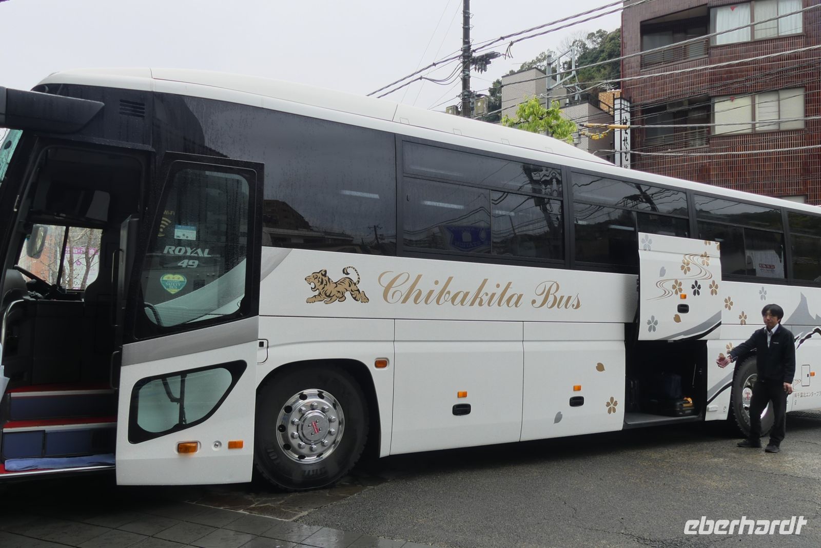 Draußen wartet schon Herr Iwasaki mit dem Reisebus auf uns. Samira erzählt uns von ihrem ersten Kontakt mit ihm: er war wohl sehr erleichtert, dass sie fliesend Japanisch spricht, eine gute Grundlage für das Arbeitsverhältnis beider, was uns natürlich zu Gute kommen wird….