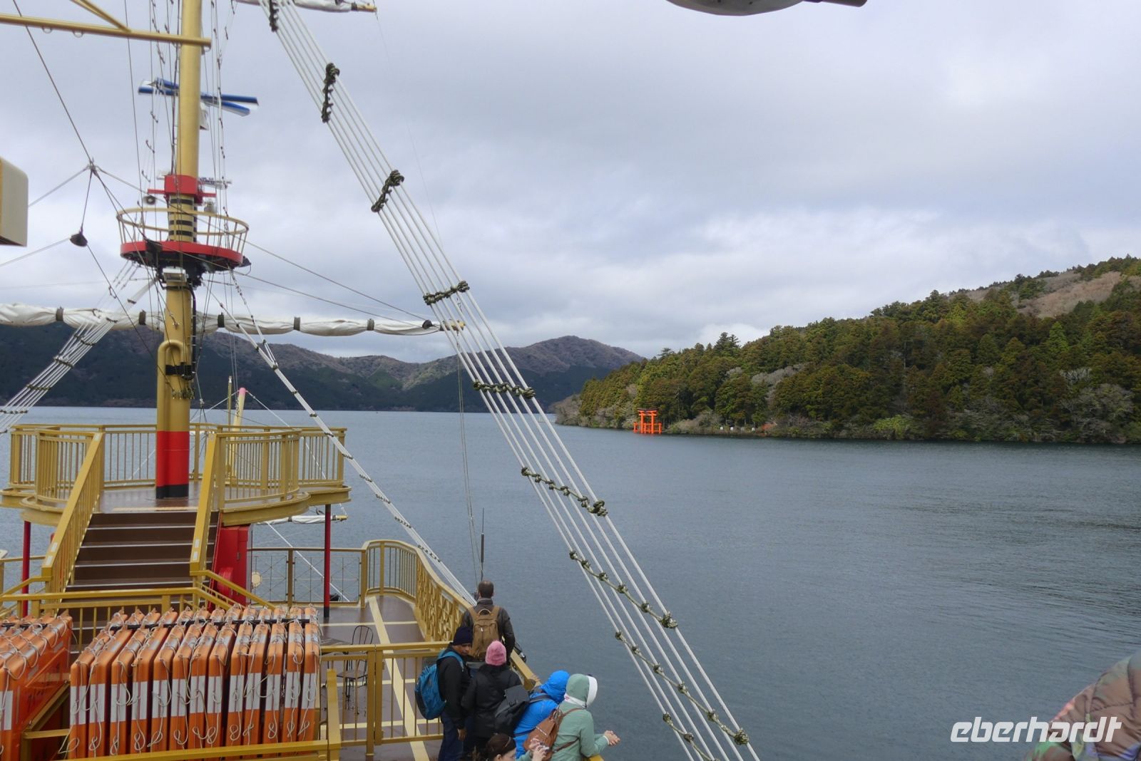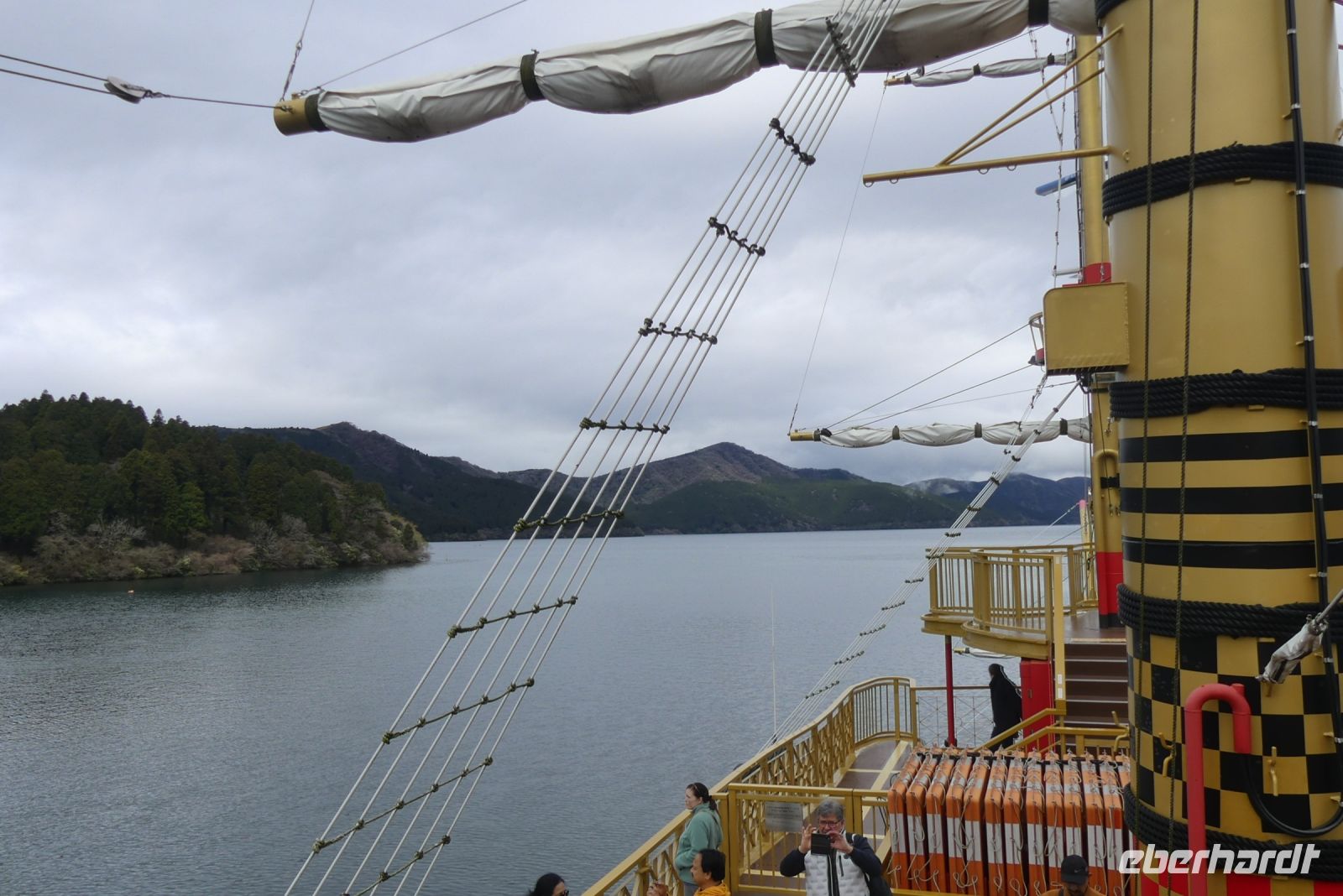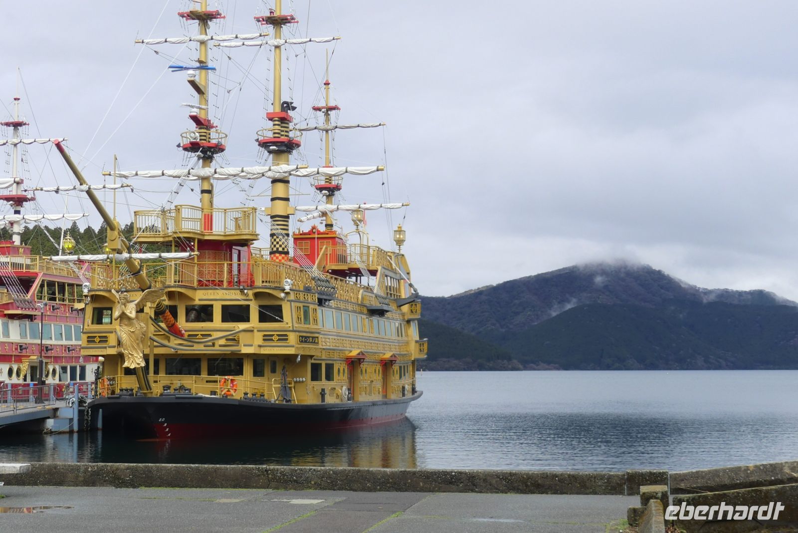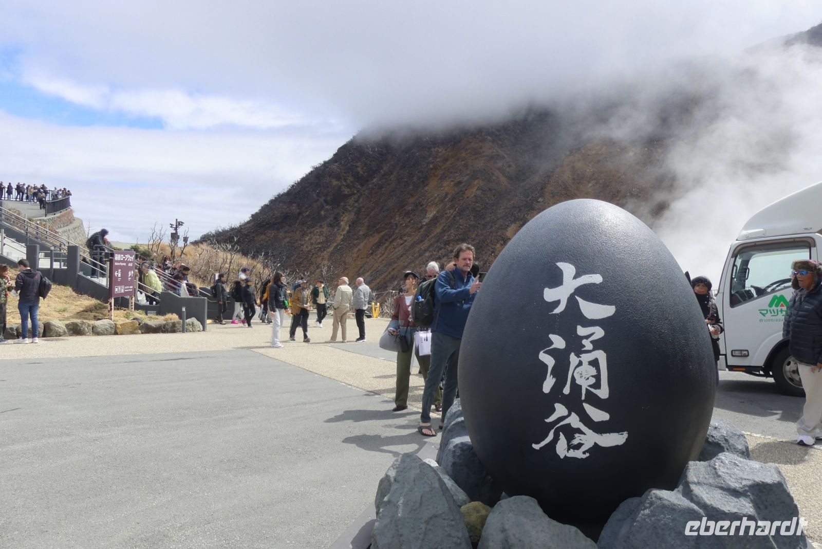 Nach dem Dauerregen der letzten Nacht ist es noch bewölkt, aber wider Erwarten können wir unser Programm durchführen und müssen nicht auf die Schlechtwettervariante ausweichen. Über den Hakone Pass (845 m) erreichen wir den Ashi See (Lake Ashinoko). Mit der „Queen Ashinoko“, ein Ausflugsschiff im Stile eines Piratenschiffs, überqueren wir den Kratersee. Gleich neben dem Schiffsanleger können wir in die Gondelbahn steigen, welche uns auf etwas über 1.000 m zum Owakudani Tal befördert. Wie wir sehen und riechen können, ist das Tal geprägt von Schwefelquellen und -schloten. Der Verkaufsschlager sind gegarte schwarze Eier – beim Garen der Eier über dem Schweldampf färbt sich die Eischale schwarz. Der Verzehr eines Eis verlängert das Leben um 7 Jahre, sagt man (…fördert aber ganz bestimmt den Umsatz). Theoretisch könnte man von hier aus den Fuji sehen, doch dafür hängen die Wolken noch zu tief…