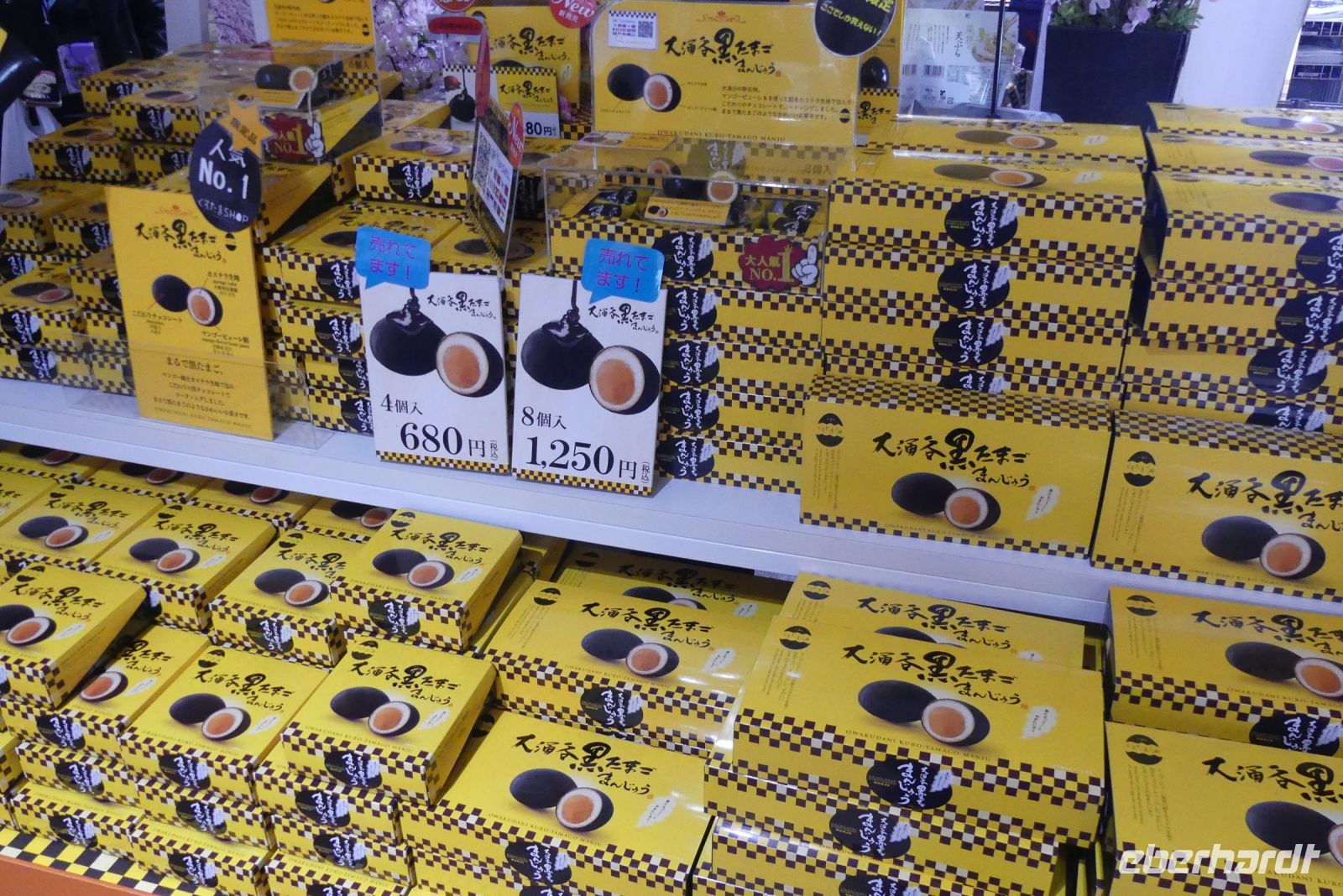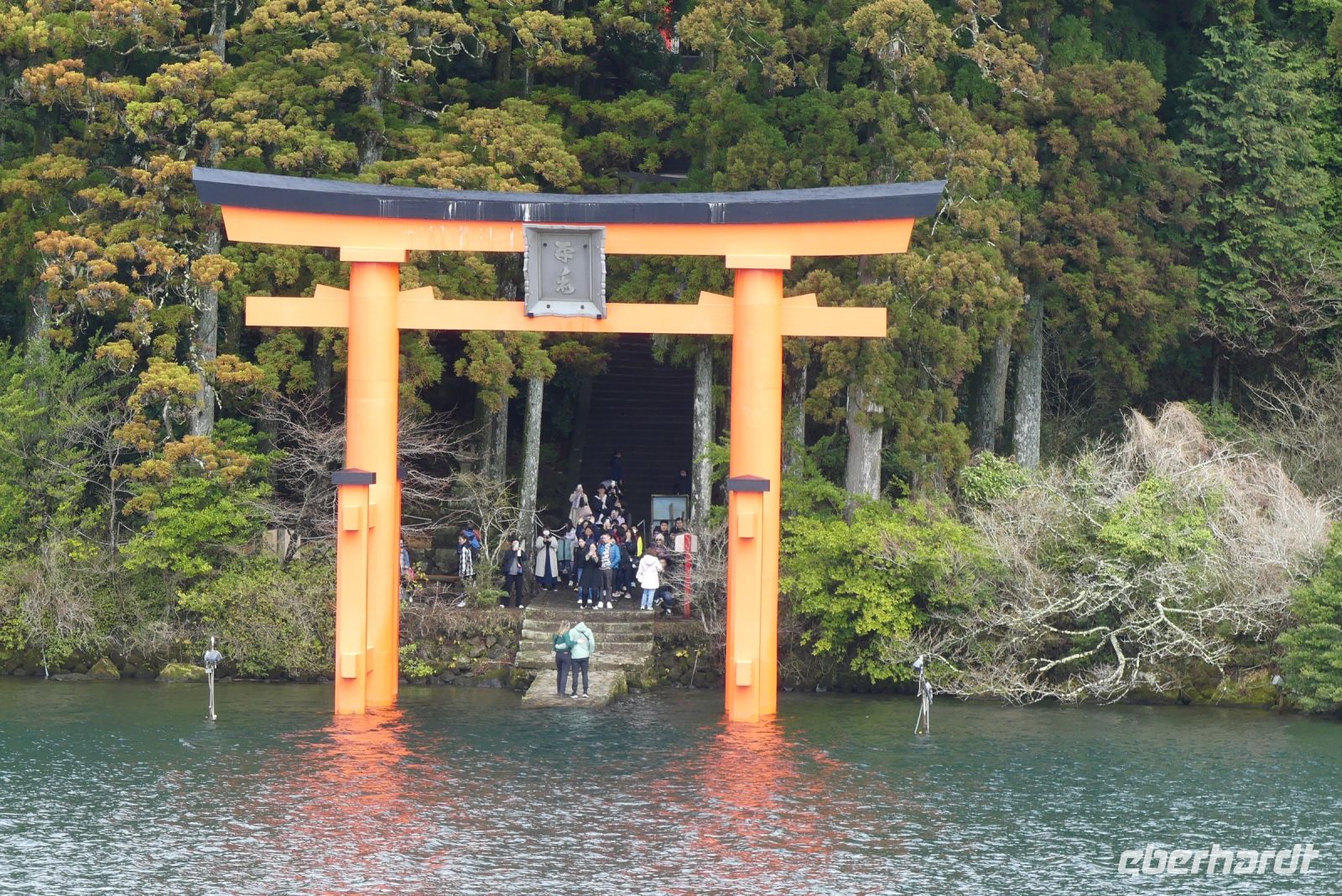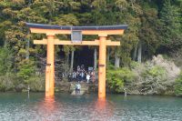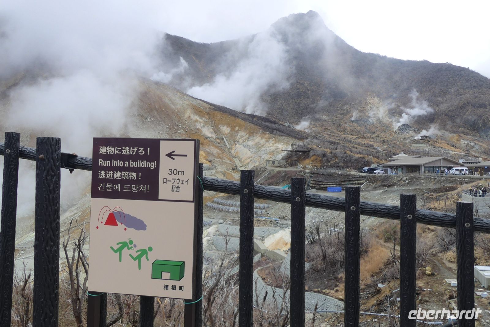 Nach dem Dauerregen der letzten Nacht ist es noch bewölkt, aber wider Erwarten können wir unser Programm durchführen und müssen nicht auf die Schlechtwettervariante ausweichen. Über den Hakone Pass (845 m) erreichen wir den Ashi See (Lake Ashinoko). Mit der „Queen Ashinoko“, ein Ausflugsschiff im Stile eines Piratenschiffs, überqueren wir den Kratersee. Gleich neben dem Schiffsanleger können wir in die Gondelbahn steigen, welche uns auf etwas über 1.000 m zum Owakudani Tal befördert. Wie wir sehen und riechen können, ist das Tal geprägt von Schwefelquellen und -schloten. Der Verkaufsschlager sind gegarte schwarze Eier – beim Garen der Eier über dem Schweldampf färbt sich die Eischale schwarz. Der Verzehr eines Eis verlängert das Leben um 7 Jahre, sagt man (…fördert aber ganz bestimmt den Umsatz). Theoretisch könnte man von hier aus den Fuji sehen, doch dafür hängen die Wolken noch zu tief…