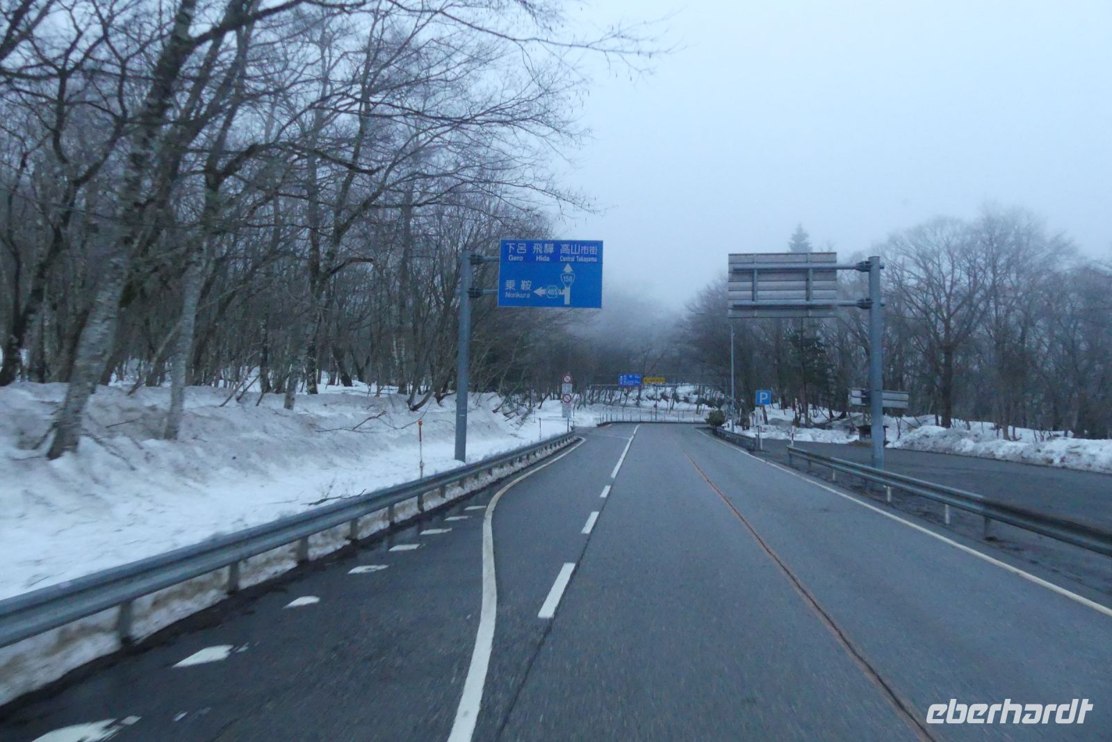 Am Nachmittag haben wir eine längere Fahrt Richtung Takayama. Es ist eine interessante und abwechslungsreiche Busfahrt. So durchqueren wir ein Tal, wo Obst angebaut wird. Die Pfirsiche stehen gerade in voller Blüte. Später nähern wir uns den Japanischen Alpen, wo wir dutzende Tunnel durchfahren. Wir sehen eine Skipiste, steil abfallende Berge, Flüsse und Stauseen. In den höheren Lagen kommen wir bei nur noch 5 Grad in eine Winterlandschaft. Nach Sonnenuntergang erreichen wir schließlich unser Hotel. Schlüsselausgabe und Informationen erhalten wir noch vorm Aussteigen im Bus. Mit einigen hungrigen Gästen suchen wir noch ein Restaurant mit freien Plätzen und werden letztendlich beim Inder fündig.