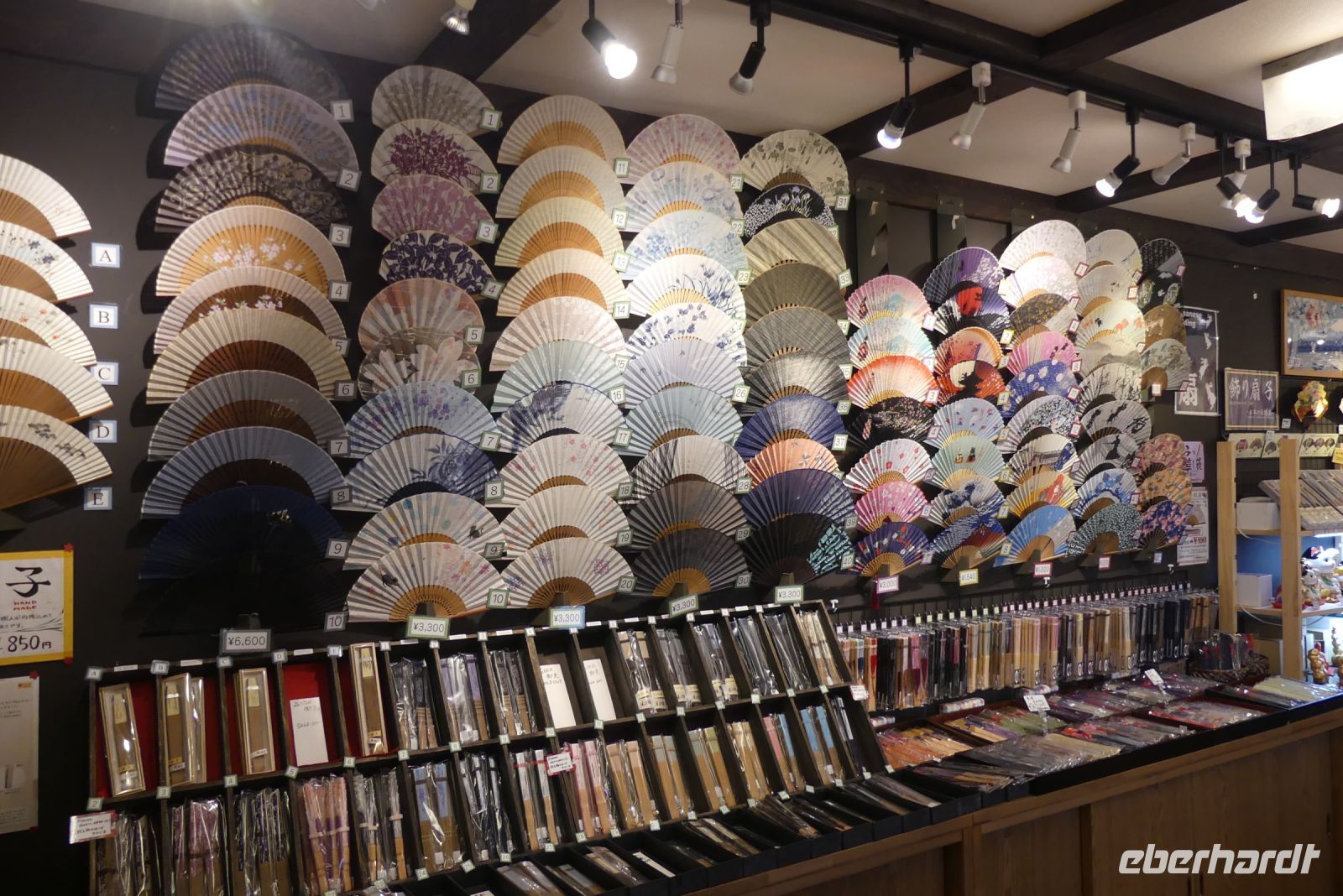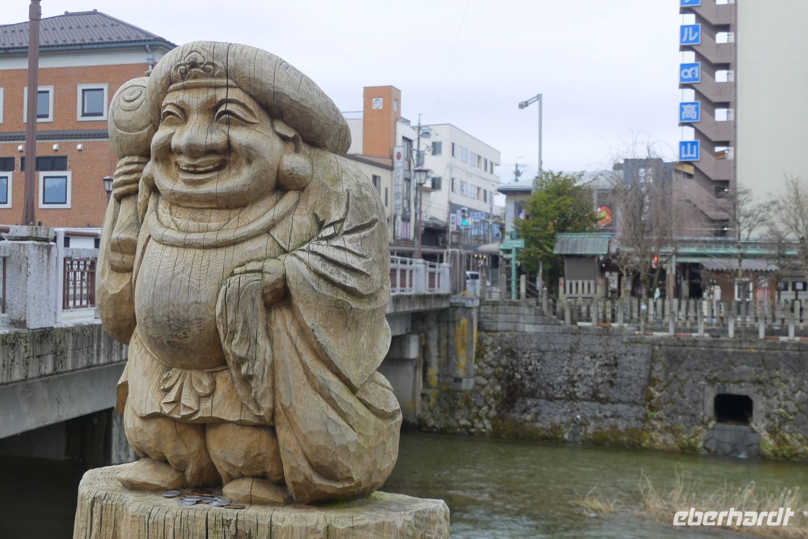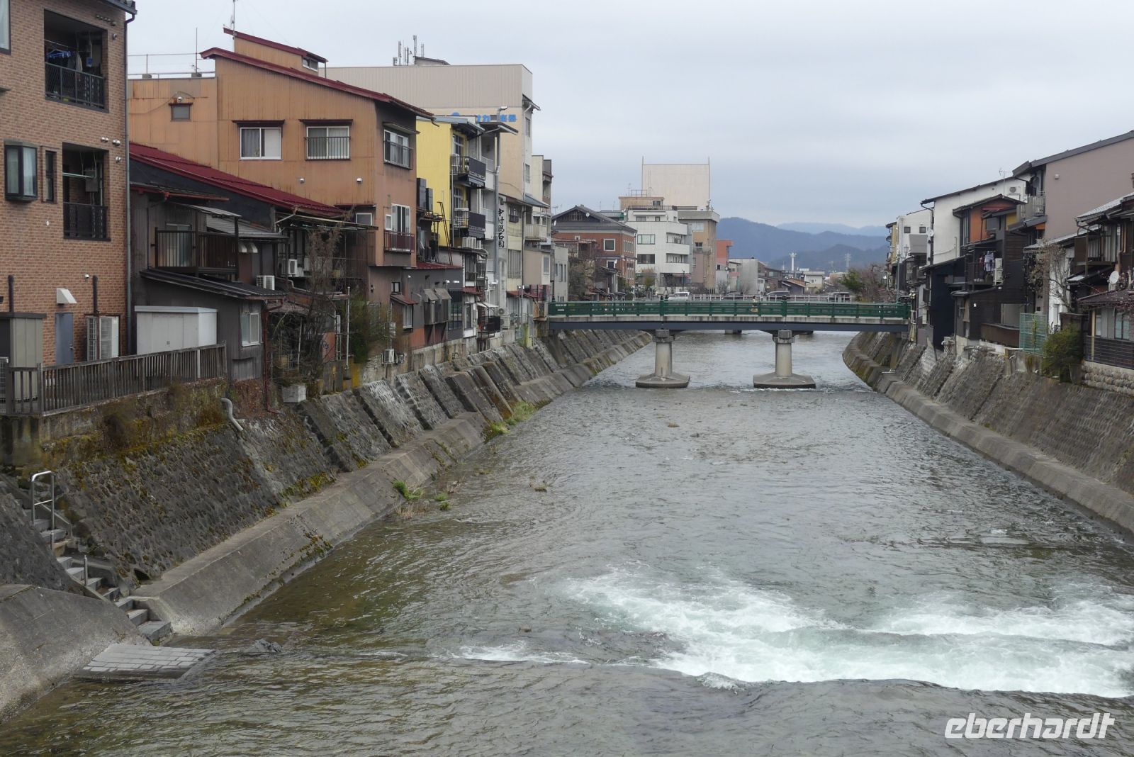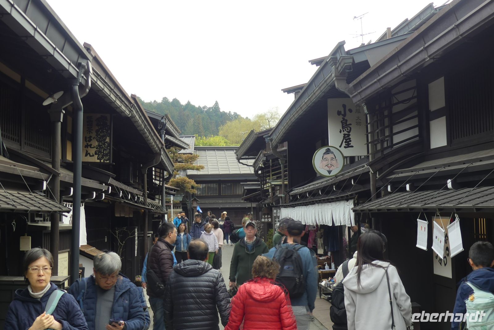 Nachmittags, zurück in Takayama, verabschieden wir unseren netten Busfahrer Herrn Iwasaki, der jetzt nach Tokio zurückkehren wird. Nach einer kurzen Pause im Hotel geht es noch einmal zu Fuß in die Altstadt. In der beliebtesten Ladenstraße des Viertels nahe der Nakabashi-Brücke laden viele Geschäfte zum Verweilen ein, darunter einige Sake-Läden, die mit kostengünstigen Kostproben die Kundschaft locken. Gleich in der Nähe, über den Fluß besichtigen wir schließlich noch das Historische Regierungshaus (Jinya).