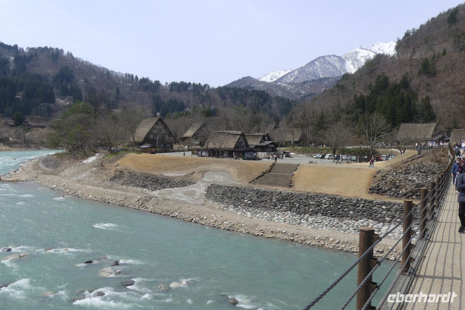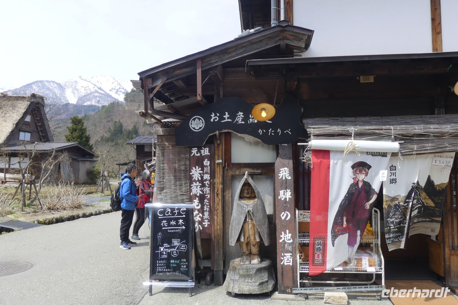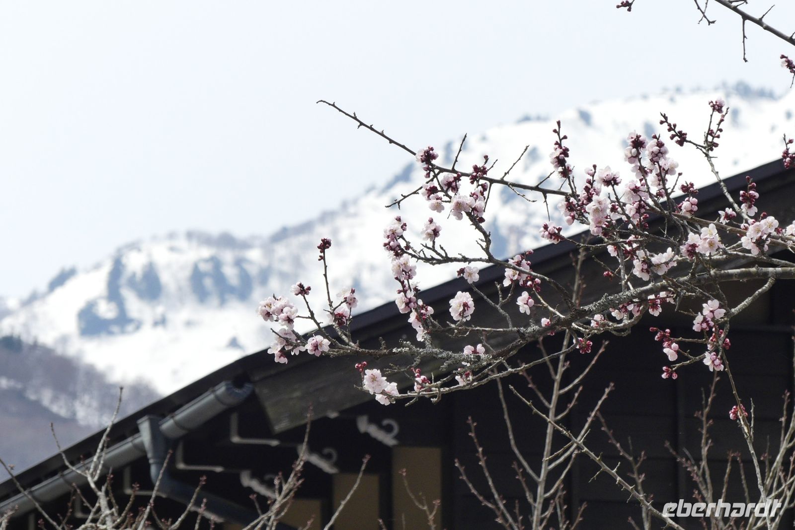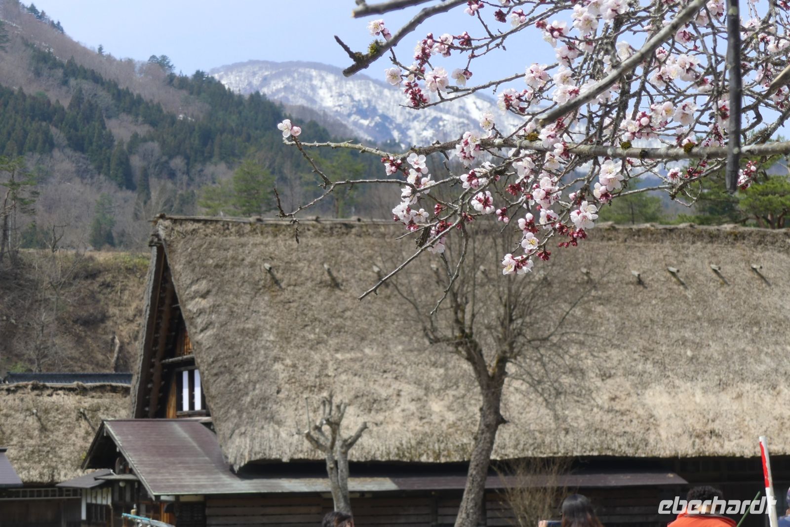 Indes setzen wir unser Programm fort: Nach dem Frühstück laufen wir zum Morgenmarkt am Fluß und sehen uns die Stände mit regionalen Produkten von Bonsai über Trockenfrüchte bis allerlei Souvenirs an. Anschließend unternehmen wir mit dem Bus einen Abstecher nach Shirakawago. Die einstündige Fahrt verläuft hauptsächlich durch Straßentunnel und manchmal sind zwischen durch die Berge zu sehen. Bei sehr schönem Wetter besichtigen wir Shirakawago (UNESCO-Weltkulturerbe). Das malerisches Dorf mit Stroh gedeckten Bauernhäusern ist einerseits ein Museumsdorf, andererseits werden einige der traditionellen Häuser noch bewohnt. Im Prinzip erleben wir gerade Winter und Frühling zu gleich – da sind einerseits noch Schneereste am Wegesrand und weiße Berggipfel und andererseits blüht es bei frühlingshaften Temperaturen, darunter natürlich auch die beliebte Zierkirsche.