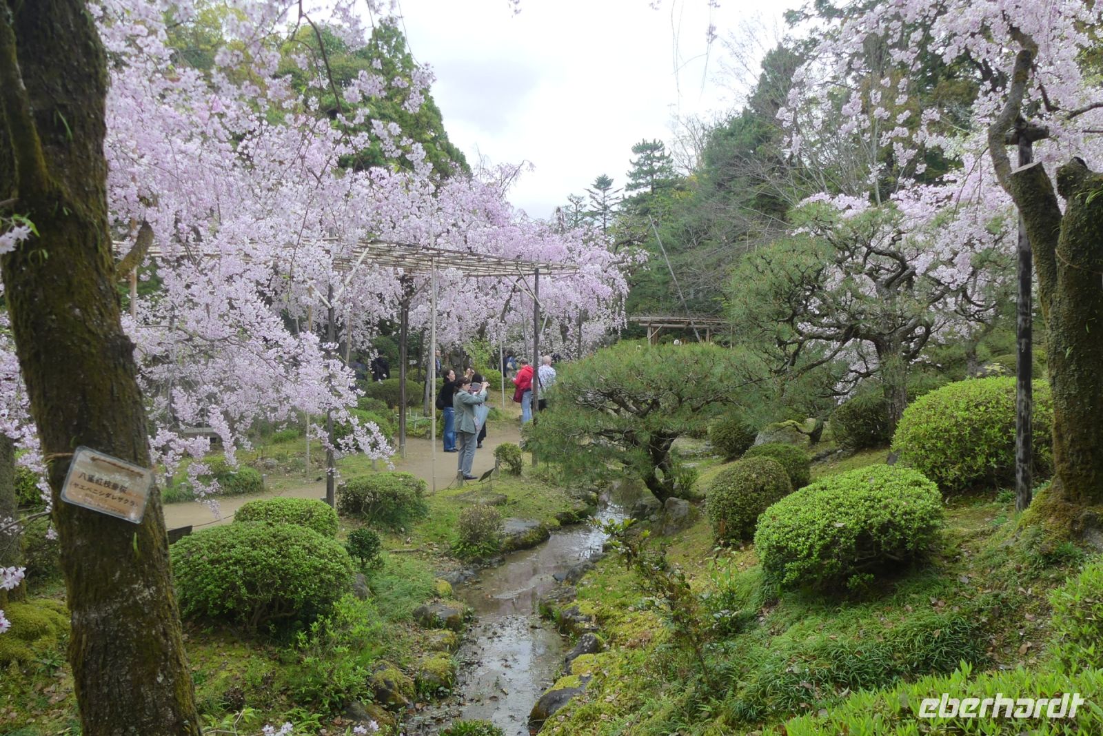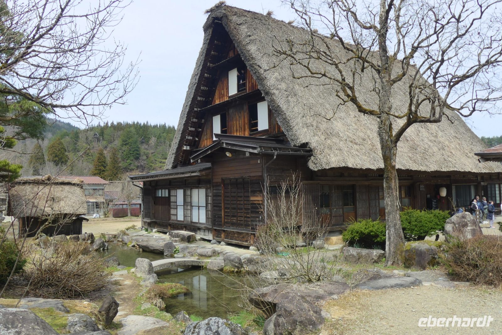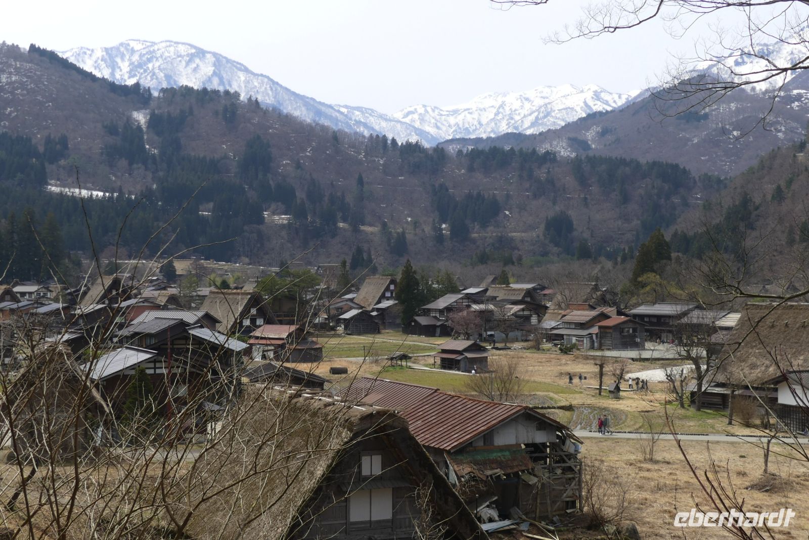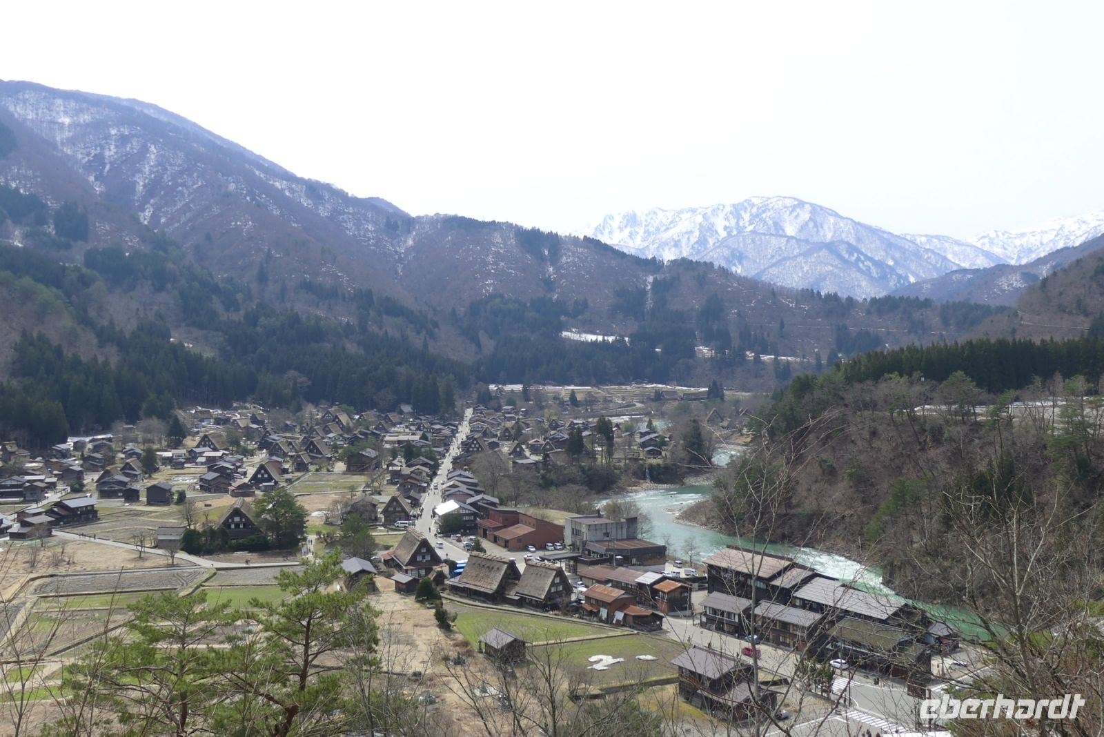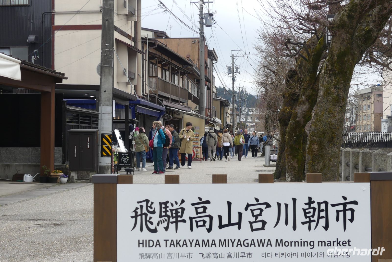 Indes setzen wir unser Programm fort: Nach dem Frühstück laufen wir zum Morgenmarkt am Fluß und sehen uns die Stände mit regionalen Produkten von Bonsai über Trockenfrüchte bis allerlei Souvenirs an. Anschließend unternehmen wir mit dem Bus einen Abstecher nach Shirakawago. Die einstündige Fahrt verläuft hauptsächlich durch Straßentunnel und manchmal sind zwischen durch die Berge zu sehen. Bei sehr schönem Wetter besichtigen wir Shirakawago (UNESCO-Weltkulturerbe). Das malerisches Dorf mit Stroh gedeckten Bauernhäusern ist einerseits ein Museumsdorf, andererseits werden einige der traditionellen Häuser noch bewohnt. Im Prinzip erleben wir gerade Winter und Frühling zu gleich – da sind einerseits noch Schneereste am Wegesrand und weiße Berggipfel und andererseits blüht es bei frühlingshaften Temperaturen, darunter natürlich auch die beliebte Zierkirsche.
