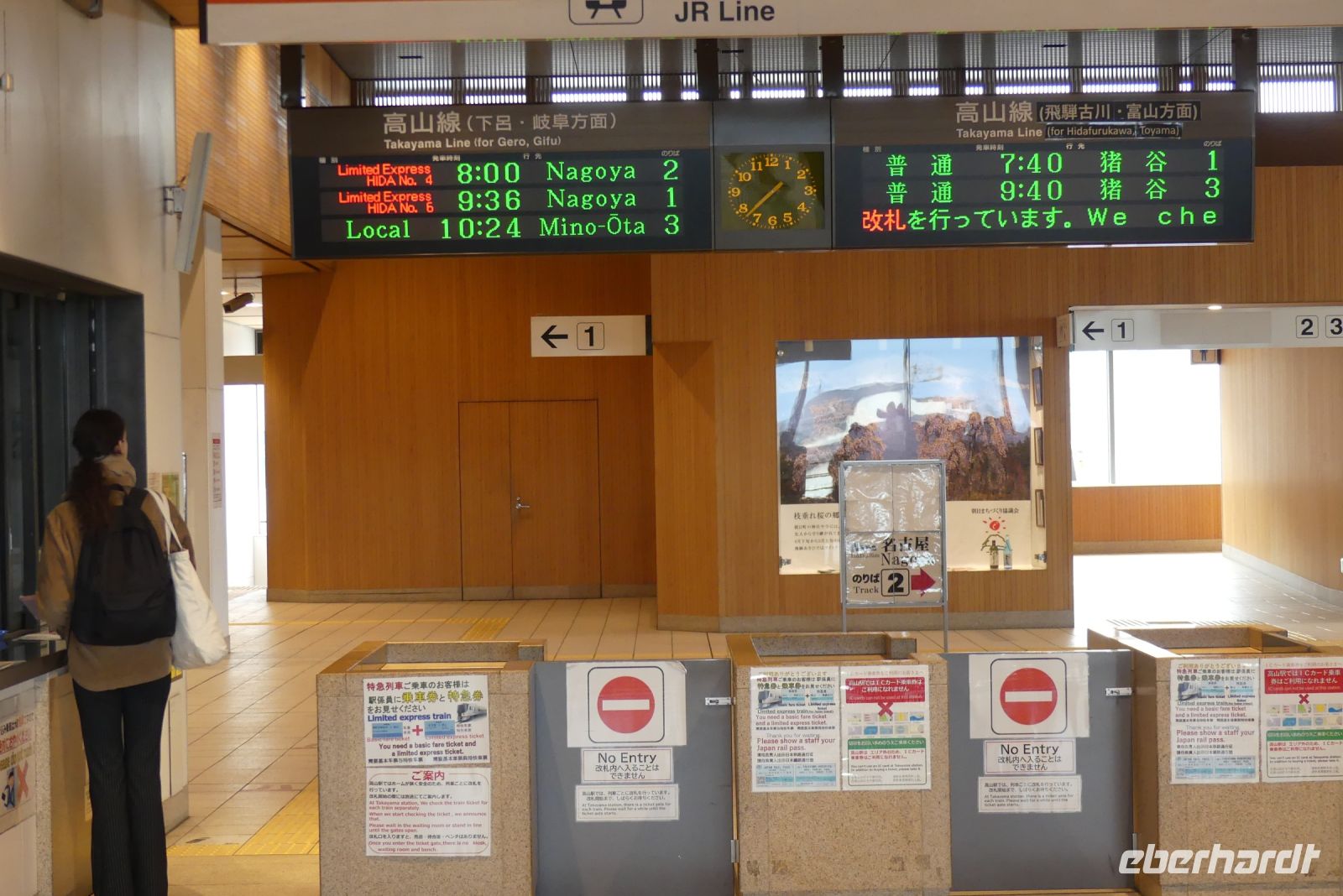 Zunächst fahren wir mit dem „Limited Express“, eine Art Regionalzug durch eine abwechslungsreiche Bergwelt nach Nagoya. Der Zug verspätet sich um 15 Minuten, das heißt hier „erhebliche Verspätung“. Dennoch schaffen wir es in Nagoya, noch rechtzeitig in den Shinkansen umzusteigen. Am Bahnhof von Osaka verabschieden wir uns von G. und R. – gute Heimreise und gute Besserung! Ich selbst begleite beide noch ins Hotel in Osaka und nehme dann einen Zug, um zur Gruppe in Himeji aufzuschließen.