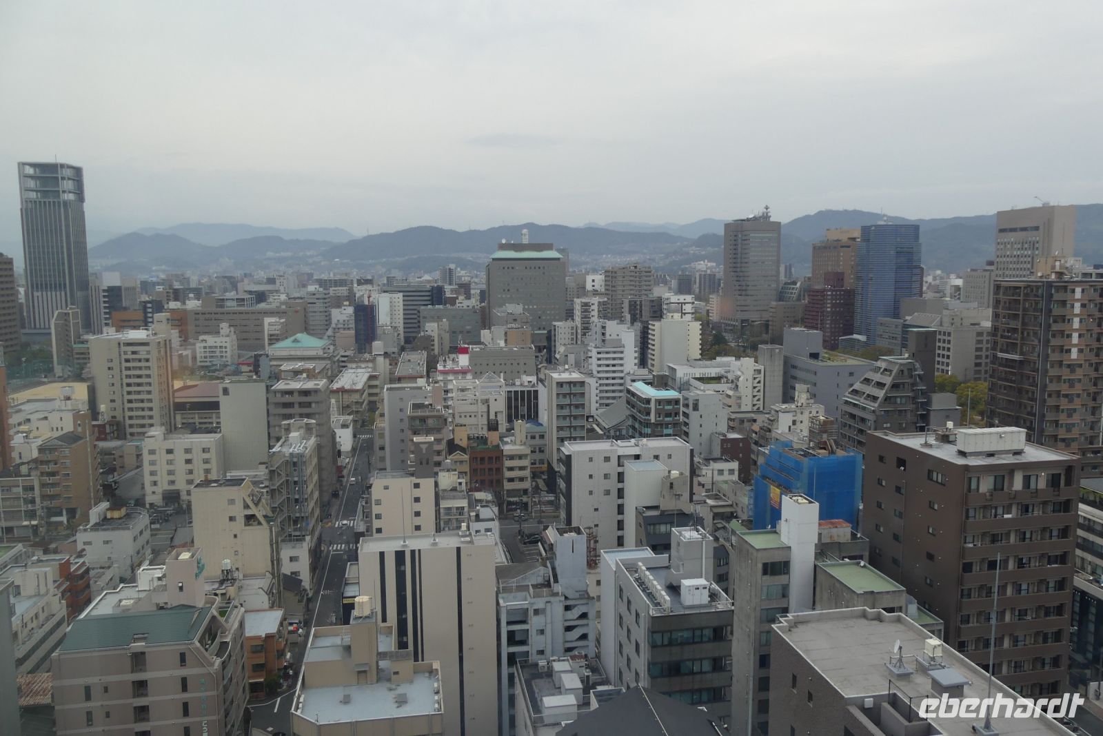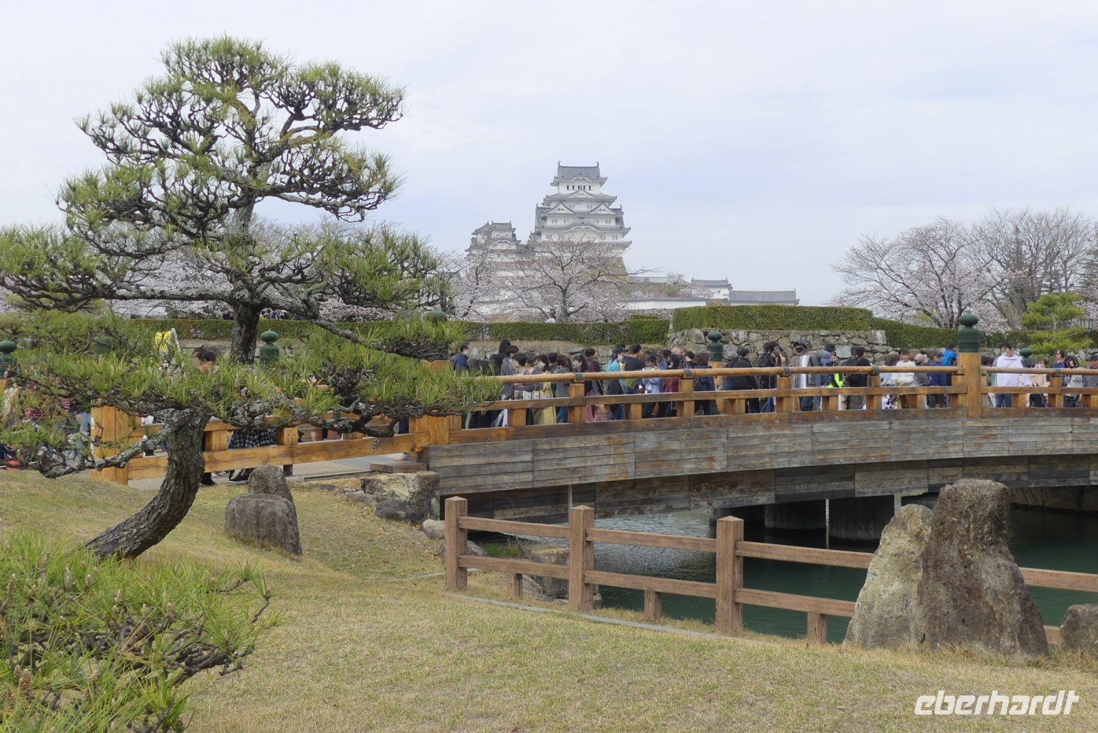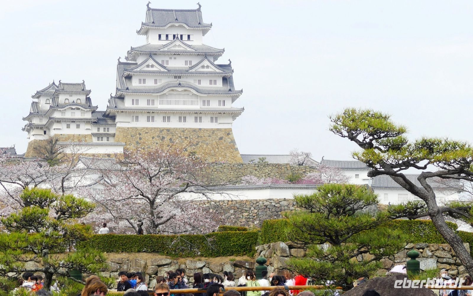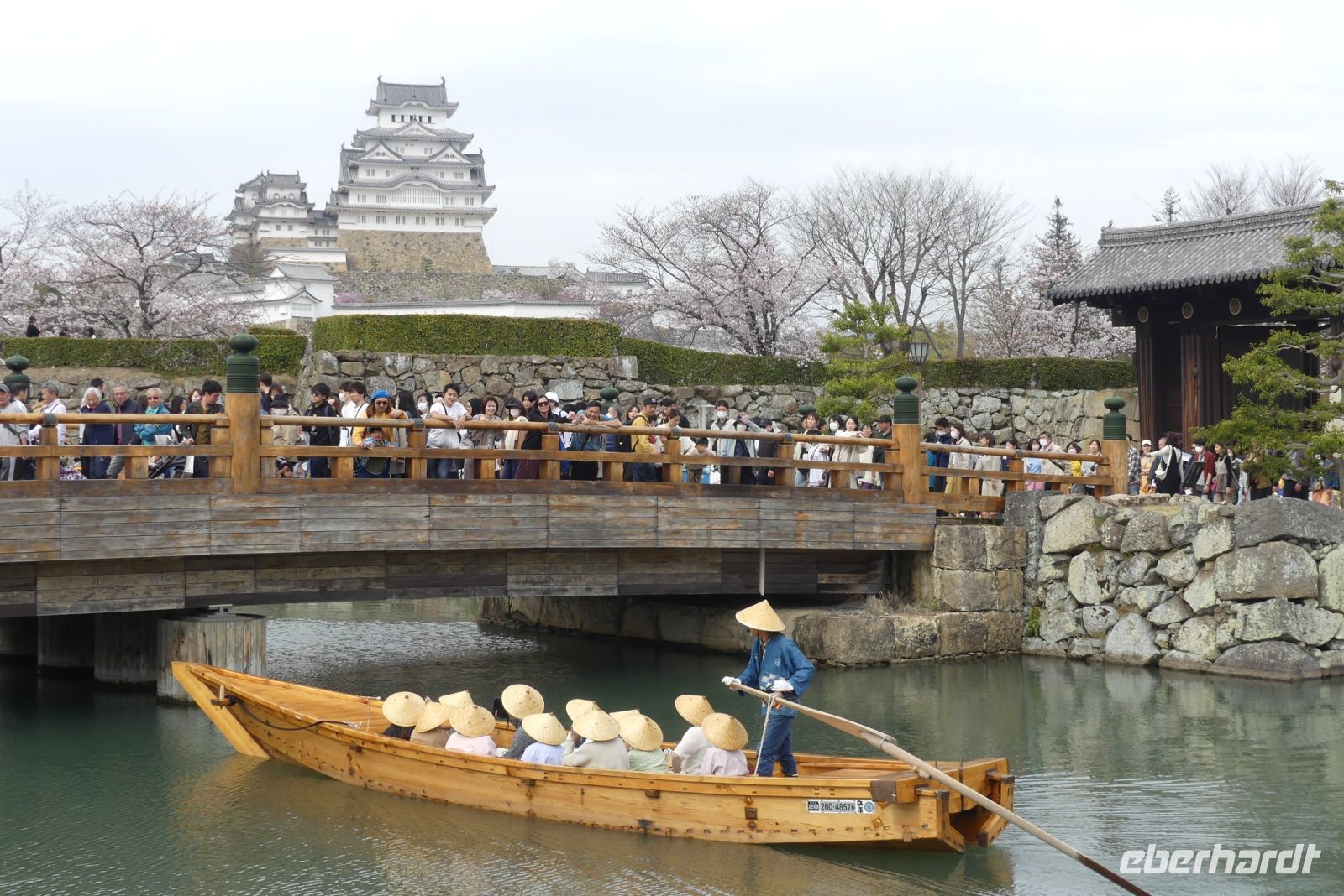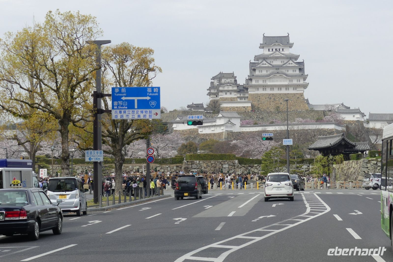 Die Stadt Himeji ist bekannt für seine imposante Burg, die Burg des weißen Reihers. Bereits wenn man den Bahnhof von Himeji verlässt, ist in einem Kilometer Entfernung die Burg nicht zu übersehen. Es ist Sonnabend, schönes Frühlingswetter und die Kirschbäume stehen in voller Blüte. Der Park um die Burg ist als ein besonders schöner Ort der Kirschblüte bekannt. So zieht es heute tausende Einheimische zur Burg. Aufgrund des großen Andrangs entfällt die geplante Burgbesichtigung. Statt dessen halten wir uns in den Außenanlagen auf und erfreuen uns an der Kirschblüte, der besonderen Atmosphäre und tollen Motiven. Dann geht’s auch schon weiter, zurück zum Bahnhof und weiter mit dem Shinkansen nach Hiroshima. In Hiroshima nehmen wir Taxis, um zum Hotel zu gelangen. Mit dem Hilton Hiroshima haben wir ein gutes Hotel mit komfortablen Zimmern in der 15. Etage.