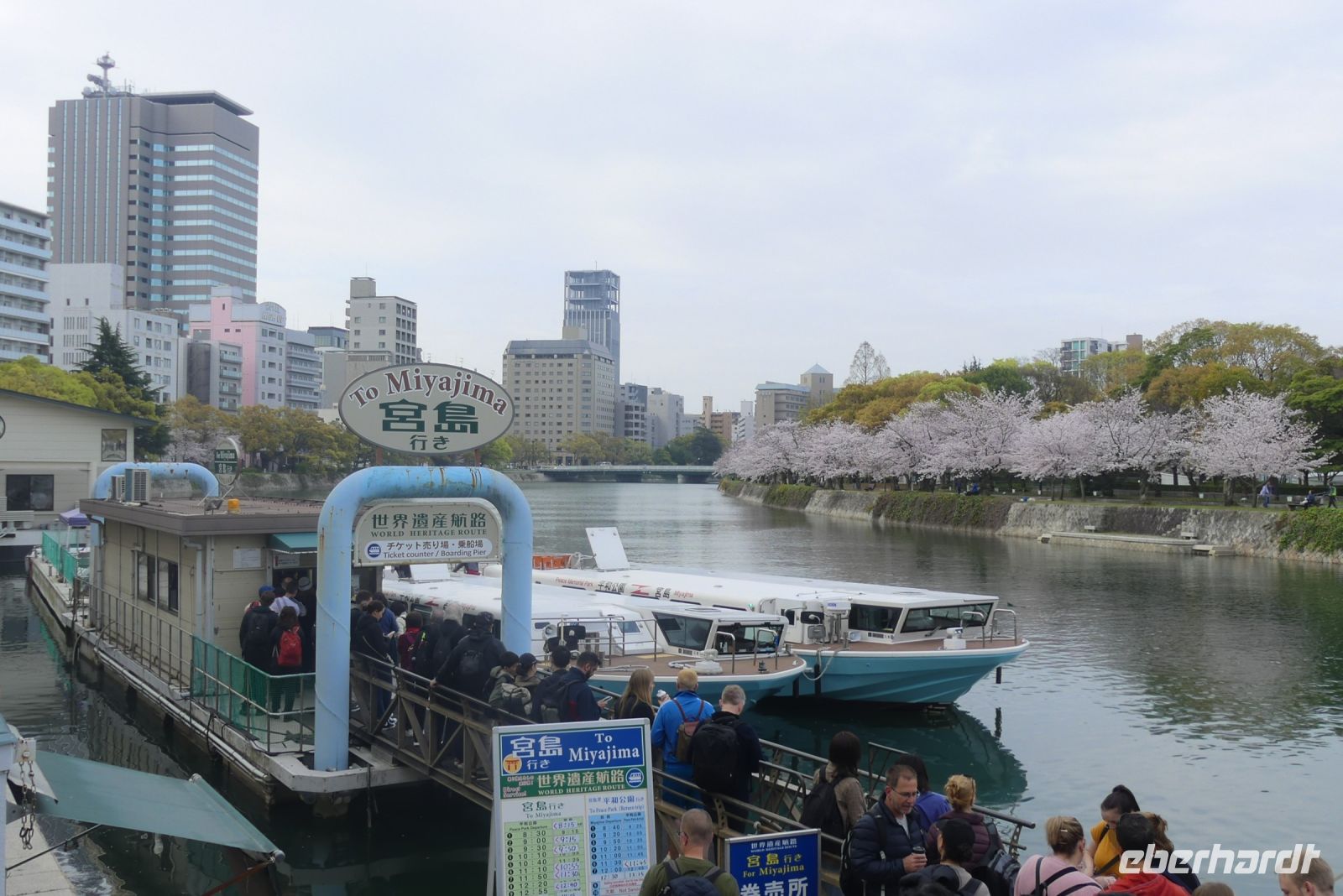 Es ist Sonntag, aber ausschlafen geht nicht, denn auf uns wartet ein langer und ereignisreicher Tag. Schon kurz nach sieben Uhr starten wir mit Taxis, zunächst zum Bahnhof, um nicht benötigtes Handgepäck in Schließfächern zu deponieren und um letztendlich zur Fährstation am Motoyasu Fluss zu gelangen. Von hier aus setzen wir mit der Fähre zur Insel Miyajima über.
