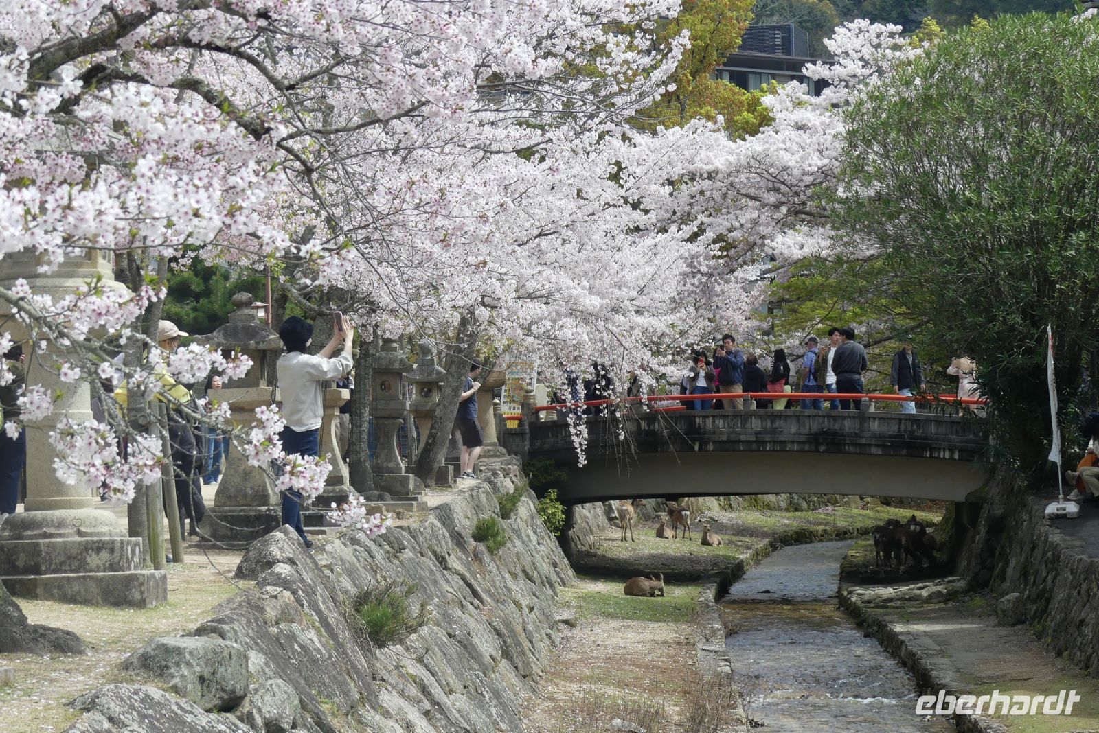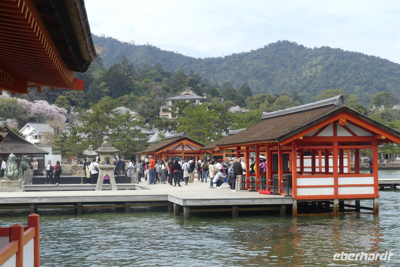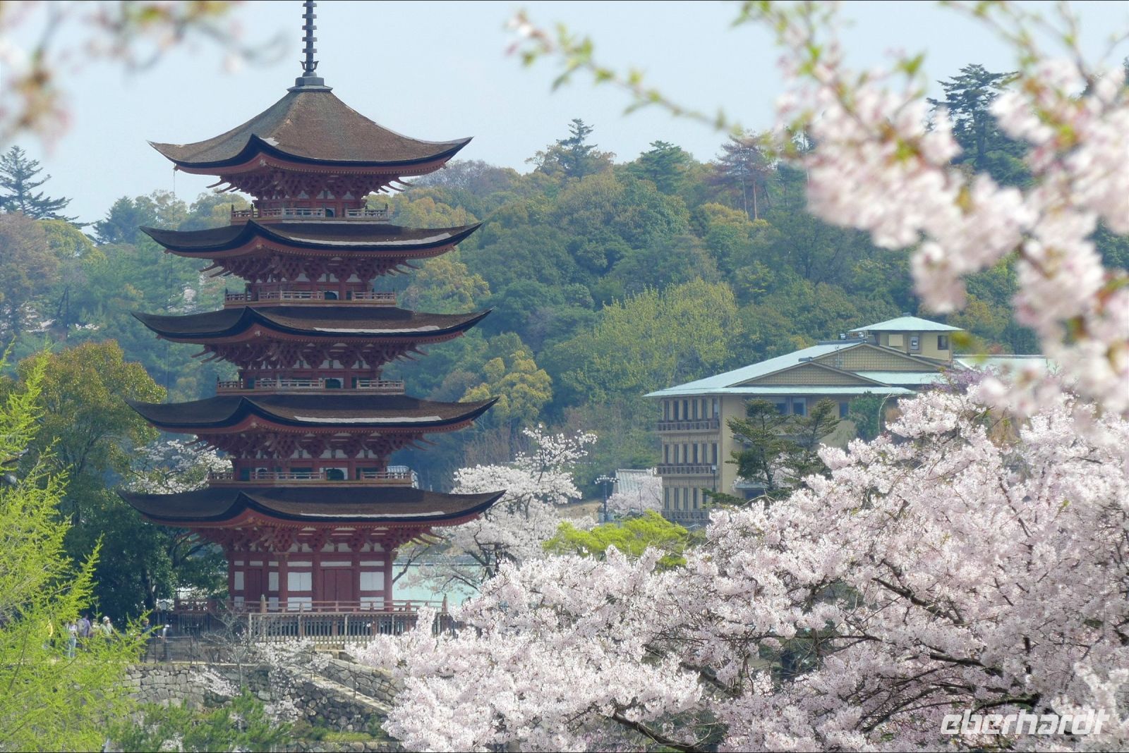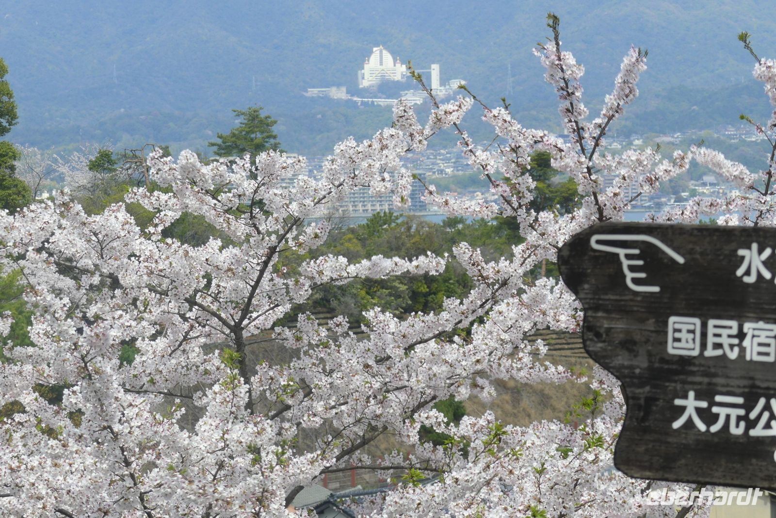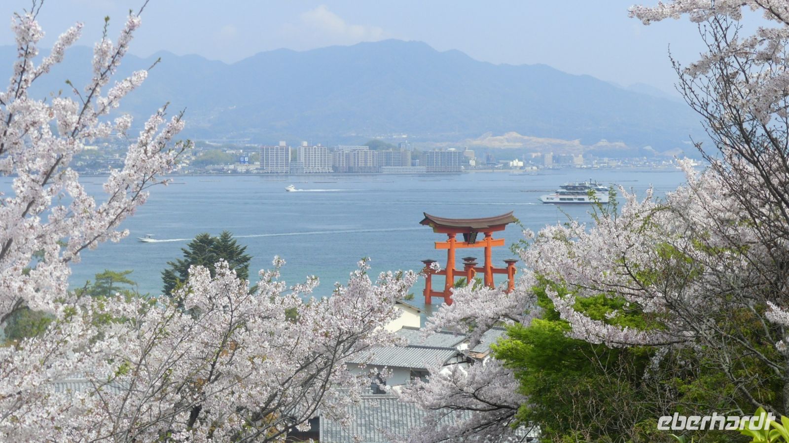 Miyajima ist besonders, ich denke, sie wird zu Recht zu den schönsten Landschaften Japans gezählt. Auf der grünen und hügeligen Insel läuft zahmes Rotwild frei umher. Berühmt ist der Itsukushima-Schrein mit dem (bei Flut) im Meer stehenden rot-orangen Torii. Das Torii, also das symbolische Eingangstor des Schreins, ist das Fotomotiv – im Itsukushima-Schrein stehen hunderte von Japanern geduldig in einer langen Schlange an, nur um das ultimative Foto zu schießen… Nach der Besichtigung des Schreins erkunden wir die Insel individuell. Mich zieht es hinauf in die Hügel, wo Kirschbäume in voller Blüte stehen und man eine gute Aussicht genießen kann. Sicher könnte man auf Miyajima noch viel unternehmen. Doch bevor die Ebbe kommt, müssen wir mittags mit der Fähre wieder zurück.