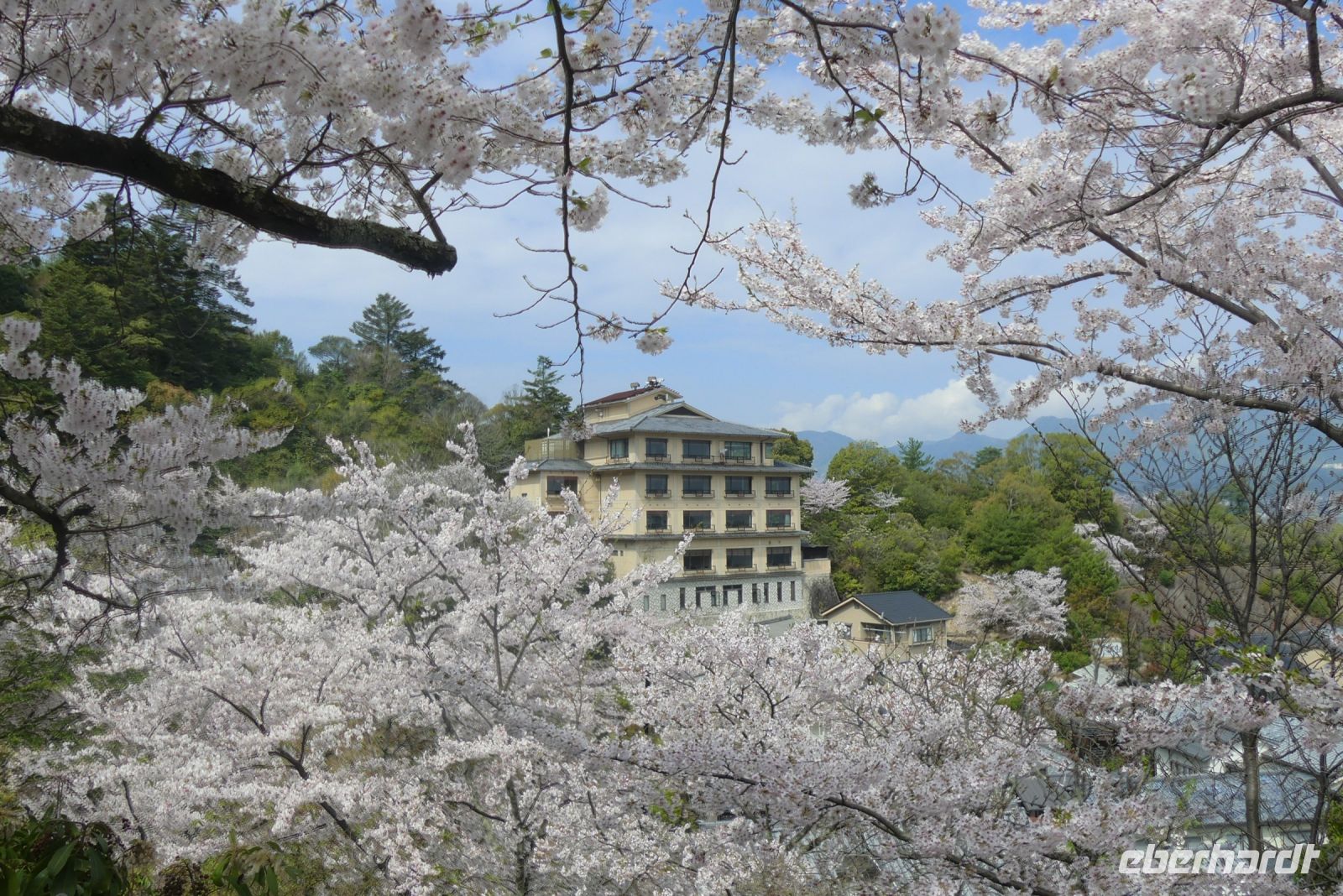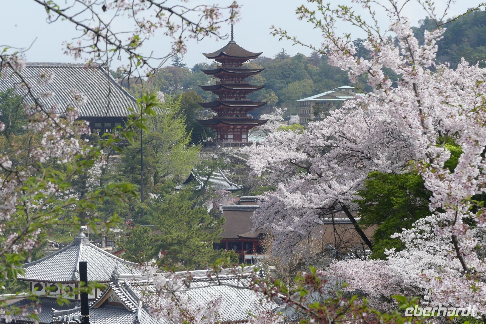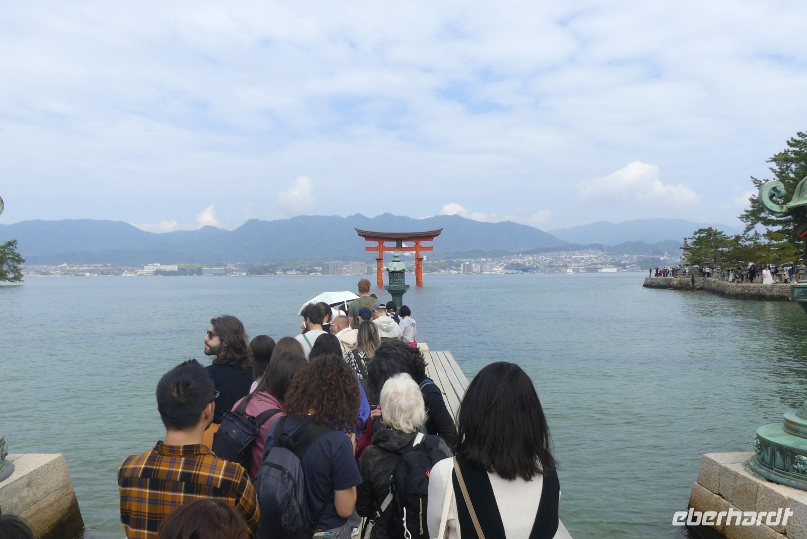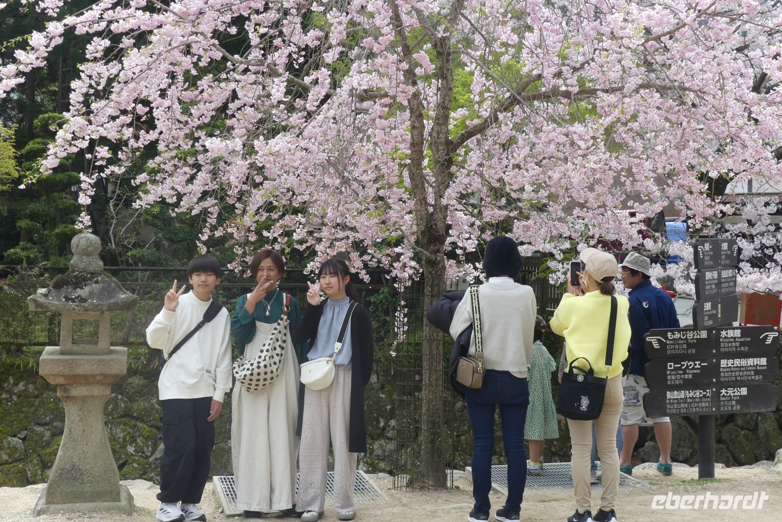 Miyajima ist besonders, ich denke, sie wird zu Recht zu den schönsten Landschaften Japans gezählt. Auf der grünen und hügeligen Insel läuft zahmes Rotwild frei umher. Berühmt ist der Itsukushima-Schrein mit dem (bei Flut) im Meer stehenden rot-orangen Torii. Das Torii, also das symbolische Eingangstor des Schreins, ist das Fotomotiv – im Itsukushima-Schrein stehen hunderte von Japanern geduldig in einer langen Schlange an, nur um das ultimative Foto zu schießen… Nach der Besichtigung des Schreins erkunden wir die Insel individuell. Mich zieht es hinauf in die Hügel, wo Kirschbäume in voller Blüte stehen und man eine gute Aussicht genießen kann. Sicher könnte man auf Miyajima noch viel unternehmen. Doch bevor die Ebbe kommt, müssen wir mittags mit der Fähre wieder zurück.