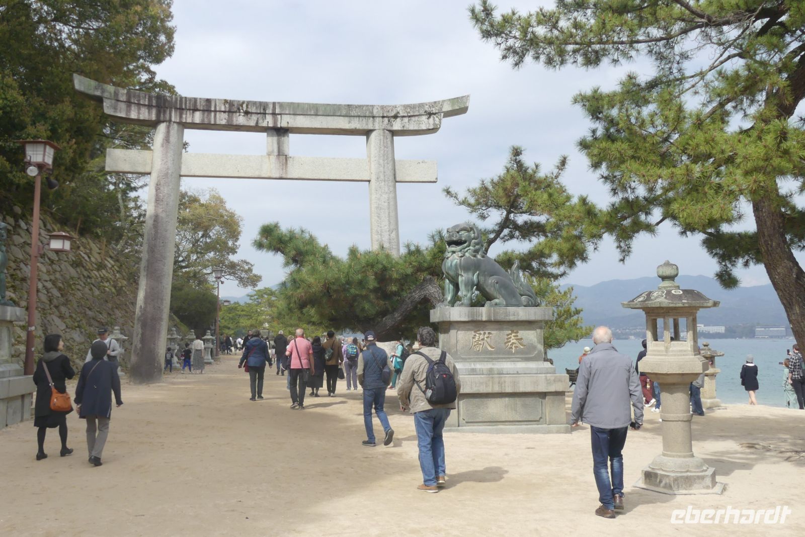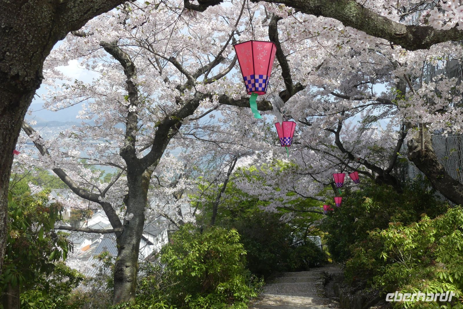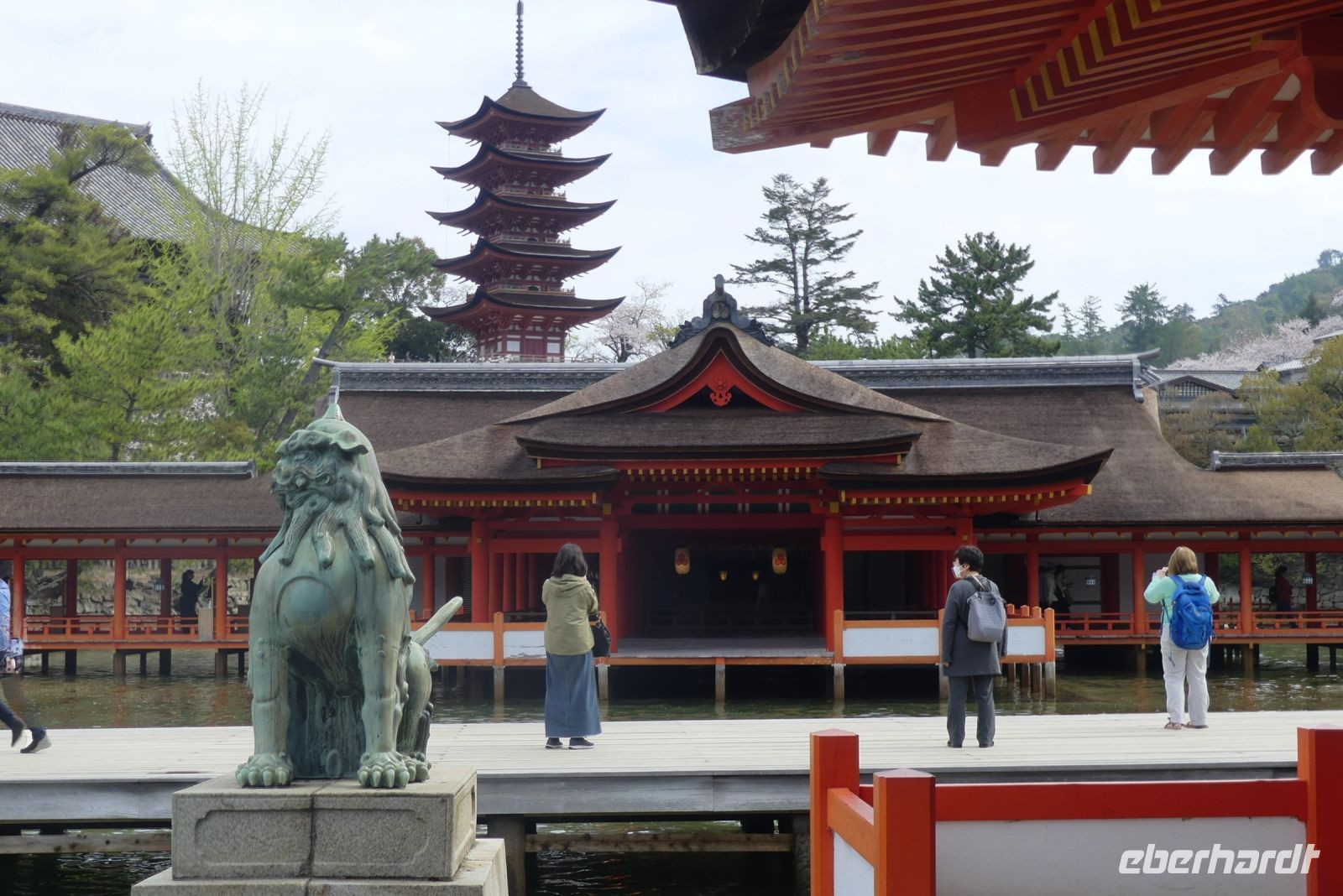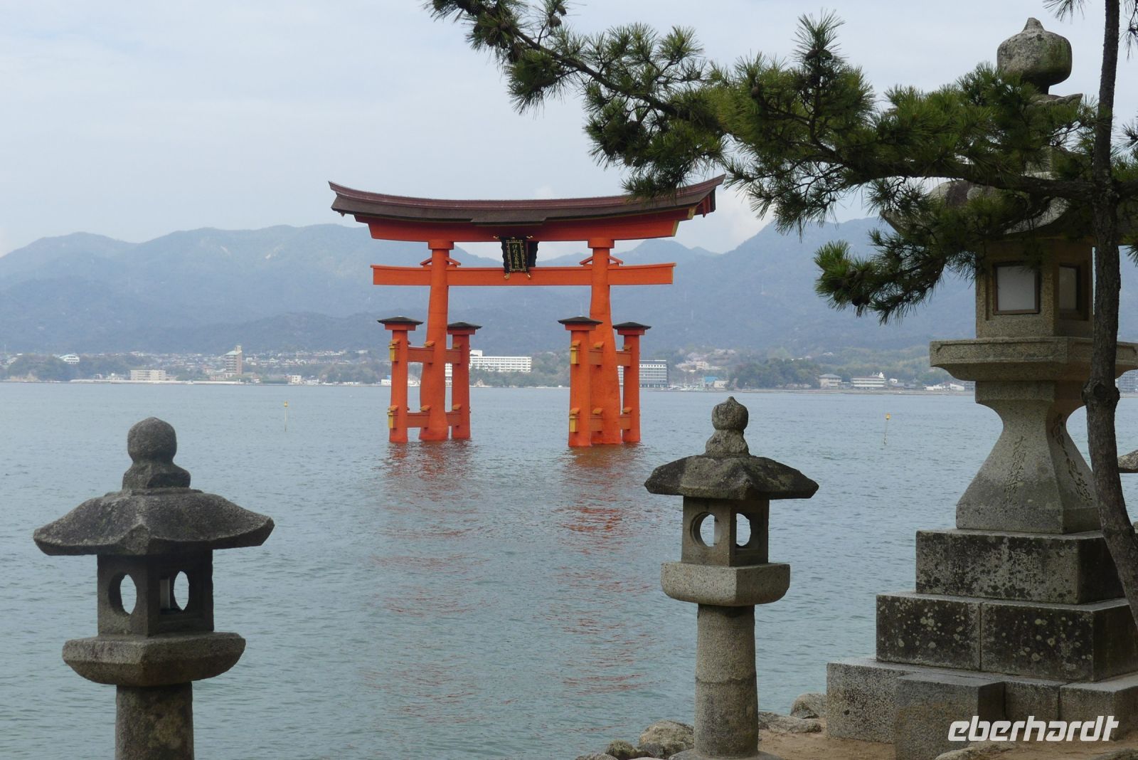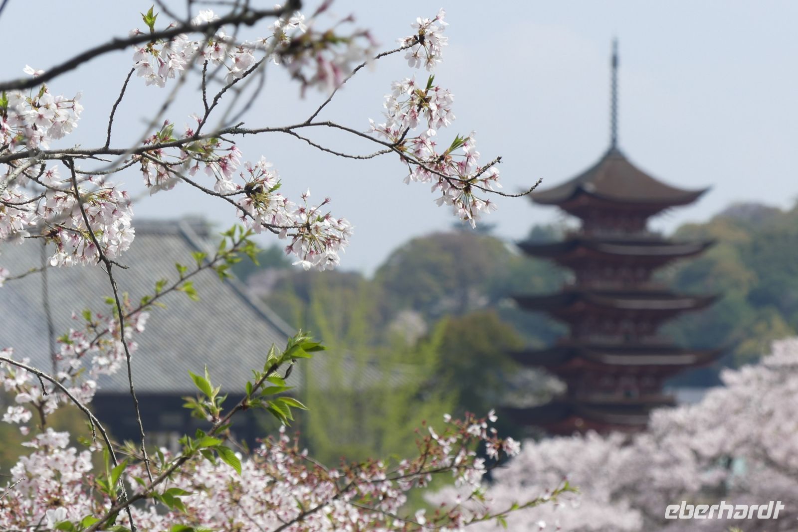 Miyajima ist besonders, ich denke, sie wird zu Recht zu den schönsten Landschaften Japans gezählt. Auf der grünen und hügeligen Insel läuft zahmes Rotwild frei umher. Berühmt ist der Itsukushima-Schrein mit dem (bei Flut) im Meer stehenden rot-orangen Torii. Das Torii, also das symbolische Eingangstor des Schreins, ist das Fotomotiv – im Itsukushima-Schrein stehen hunderte von Japanern geduldig in einer langen Schlange an, nur um das ultimative Foto zu schießen… Nach der Besichtigung des Schreins erkunden wir die Insel individuell. Mich zieht es hinauf in die Hügel, wo Kirschbäume in voller Blüte stehen und man eine gute Aussicht genießen kann. Sicher könnte man auf Miyajima noch viel unternehmen. Doch bevor die Ebbe kommt, müssen wir mittags mit der Fähre wieder zurück.