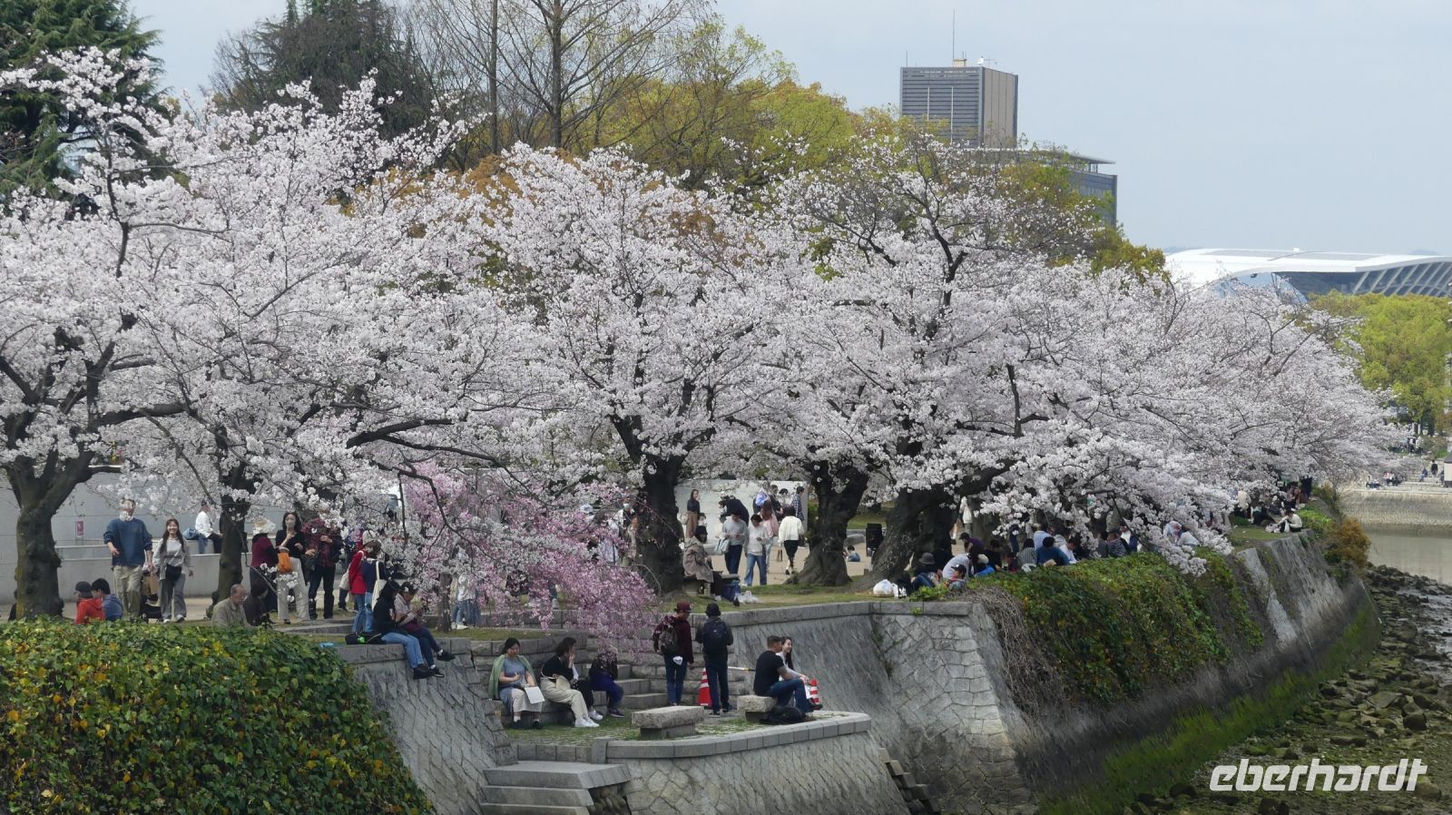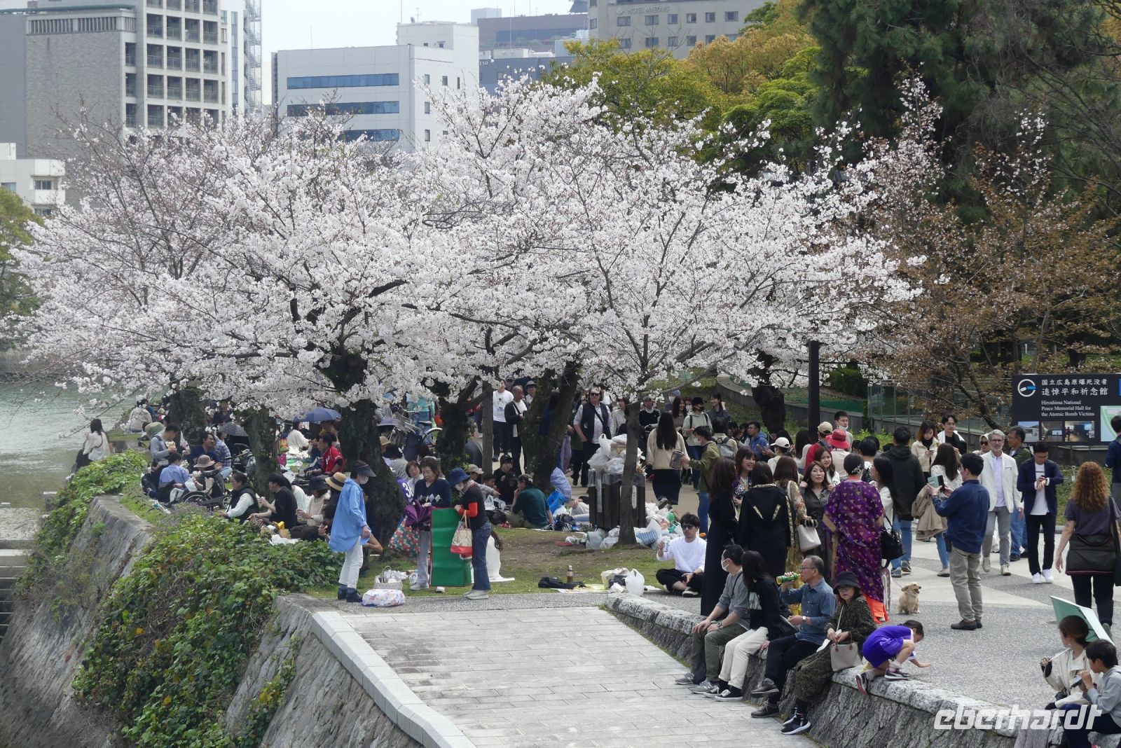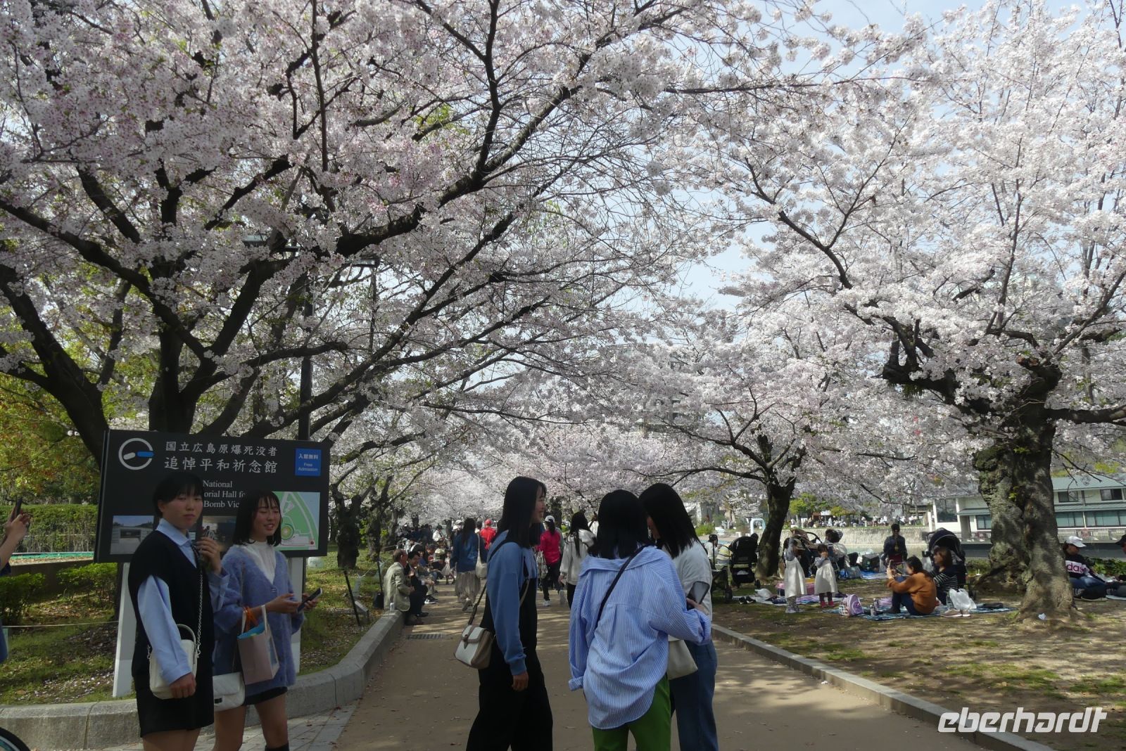 Den Nachmittag verbringen wir im Friedenspark von Hiroshima. Verschiedene Monumente wie die Atombomben-Kuppel, das Kinderdenkmal, die ewige Flamme oder das Gedenkmuseum erinnern an das schreckliche Ereignis vom 6. August 1945 und machen nachdenklich. Der Friedenspark ist Erinnerungsort, Mahnmal, ein Wahrzeichen für den Frieden aber auch ein Naherholungsgebiet für die Bewohner Hiroshimas. Und das kann man an diesem Frühlingssonntag auch gut erleben: die Einheimischen erfreuen sich an den blühenden Kirschbäumen. Am Ufer des Motoyasu Flusses drängen sich viele Japaner unter einer langen Allee mit Kirschbäumen. Hier werden Selfies gemacht, Blüten fotografiert und vor allem setzt man sich zum Picknick unter einen blühenden Kirschbaum…wenn man noch einen Platz findet.