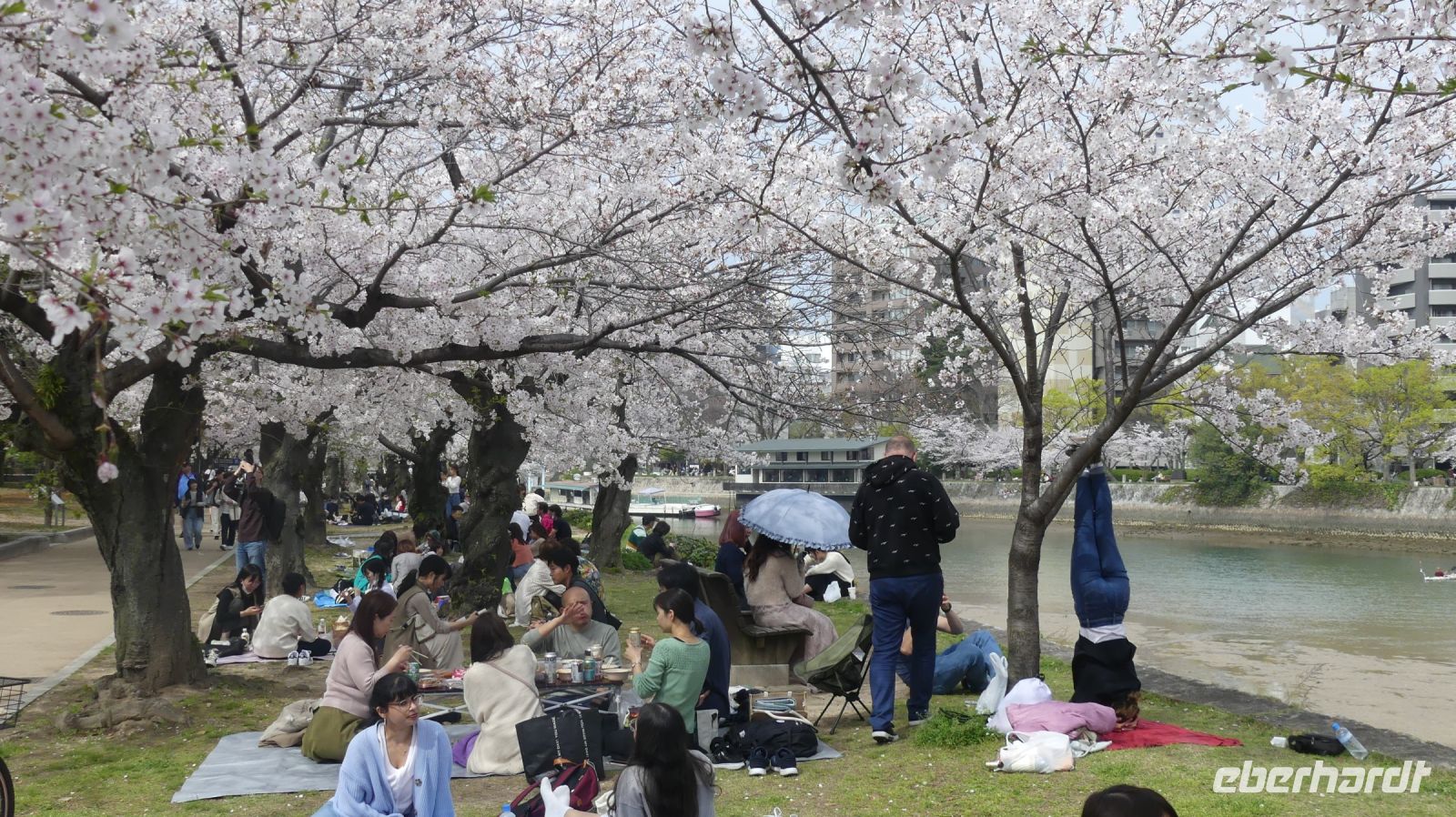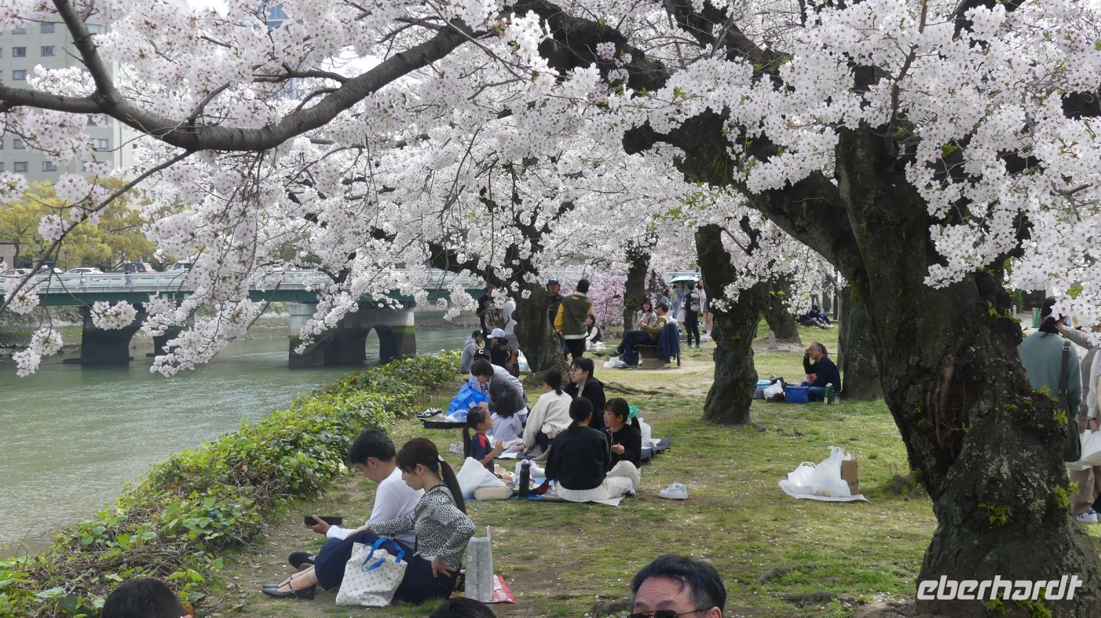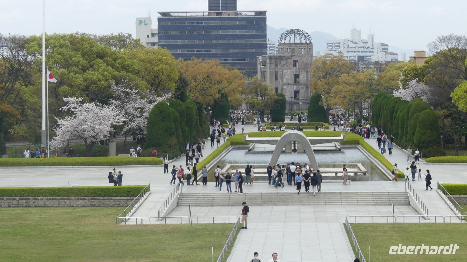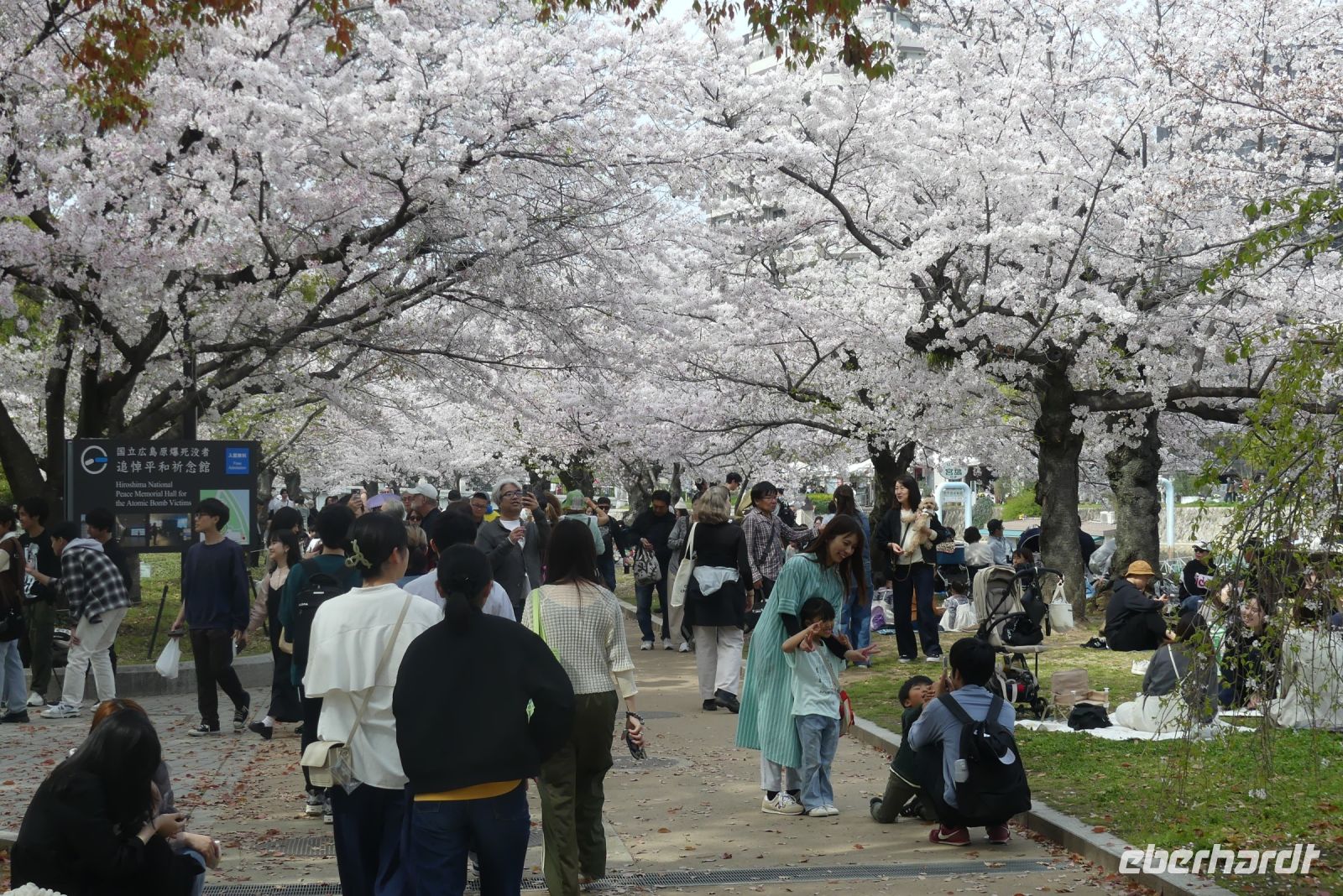 Den Nachmittag verbringen wir im Friedenspark von Hiroshima. Verschiedene Monumente wie die Atombomben-Kuppel, das Kinderdenkmal, die ewige Flamme oder das Gedenkmuseum erinnern an das schreckliche Ereignis vom 6. August 1945 und machen nachdenklich. Der Friedenspark ist Erinnerungsort, Mahnmal, ein Wahrzeichen für den Frieden aber auch ein Naherholungsgebiet für die Bewohner Hiroshimas. Und das kann man an diesem Frühlingssonntag auch gut erleben: die Einheimischen erfreuen sich an den blühenden Kirschbäumen. Am Ufer des Motoyasu Flusses drängen sich viele Japaner unter einer langen Allee mit Kirschbäumen. Hier werden Selfies gemacht, Blüten fotografiert und vor allem setzt man sich zum Picknick unter einen blühenden Kirschbaum…wenn man noch einen Platz findet.
