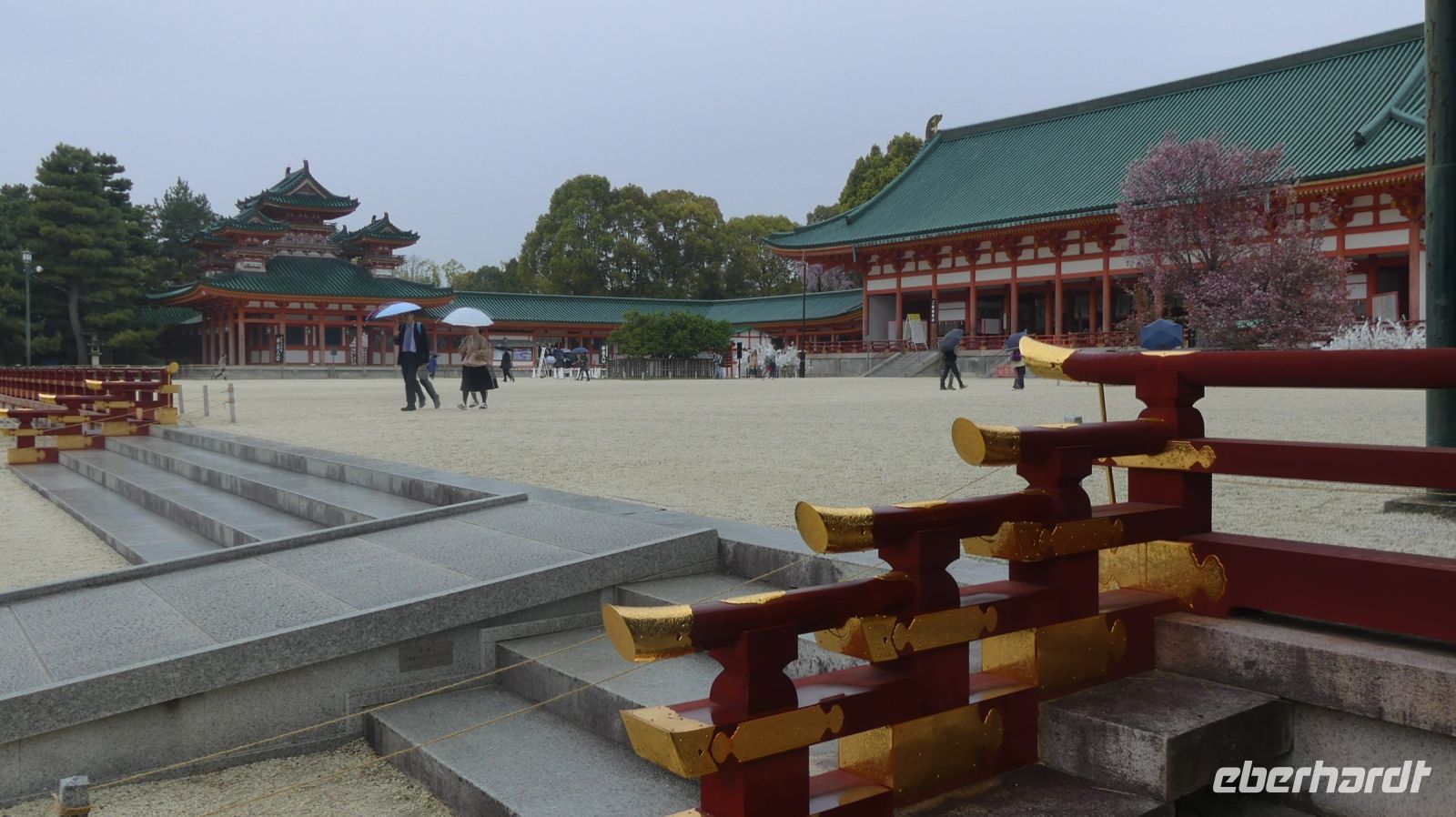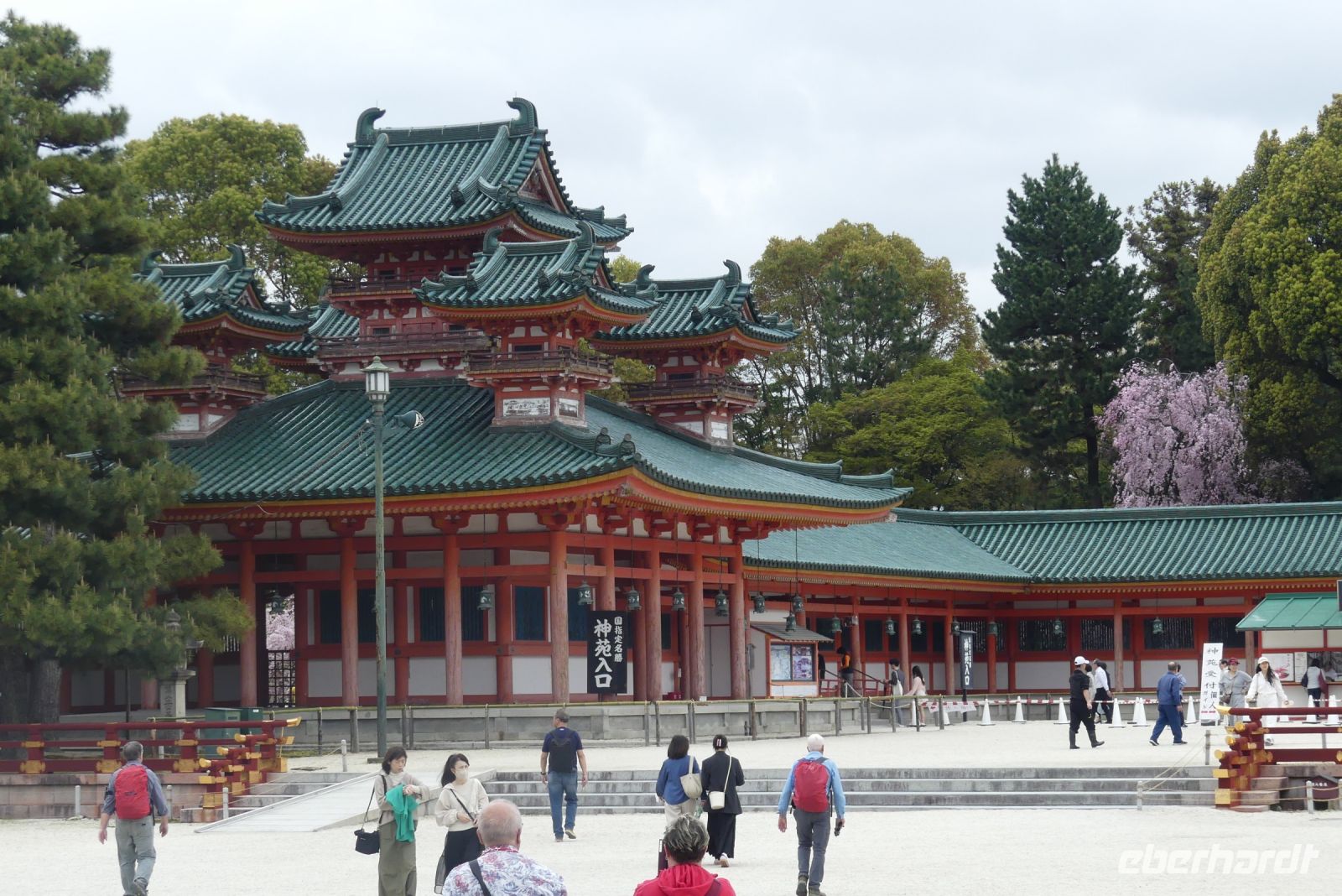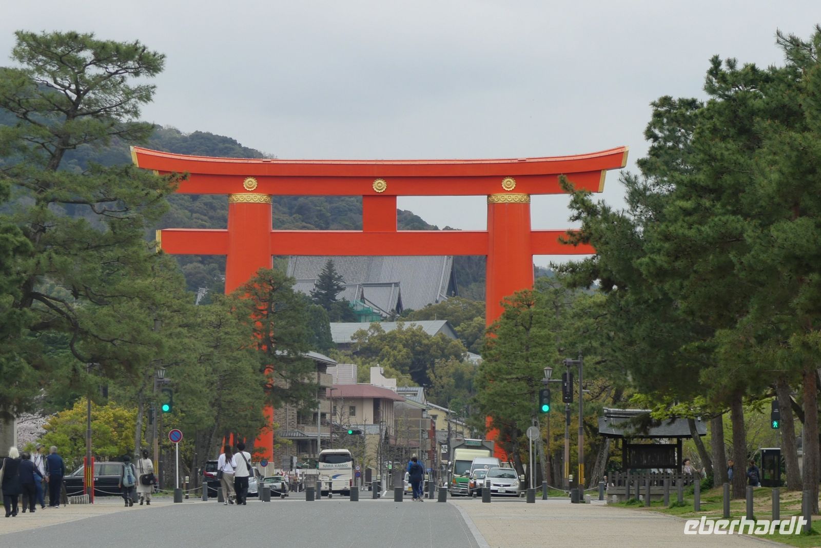 Wir konzentrieren uns heute Vormittag auf drei historische Tempel bzw. Schreine: Zunächst sind wir im Ryoanji-Tempel. Dieser hat einen weitläufigen gepflegten Garten und einen großen Teich sowie den für die Anlage bekannten Zen-Garten. Außer uns sind hier nur wenige Besucher. Das ist im folgenden buddhistischen Kinkaku-ji Tempel ganz anders. Der als „Goldene Pavillon“ bekannte Tempel steht bei Touristen offensichtlich hoch im Kurs. Allerdings ist der großflächig mit Blattgold überzogene Tempel, eingebettet in eine Landschaft mit Teich und üppigem Grün auch wirklich ein Juwel. Samira meinte, dass einmal ein Priester von der Schönheit so überwältigt war und den Anblick nicht mehr ertragen konnte, dass er ihn in Brand setzte (1950). Zum Glück wurde der Goldene Pavillon wieder aufgebaut. Schließlich besuchen wir noch den Heian-Schrein. Bei dem Shinto-Schrein handelt es sich teilweise um eine Rekonstruktion eines alten Kaiserpalastes. Die weitläufige Anlage mit seinen knallroten, monumentalen Gebäuden erinnert mich entfernt an die Verbotene Stadt in Peking. Und tatsächlich wurde die Architektur des Heian-Schreins durch China geprägt.