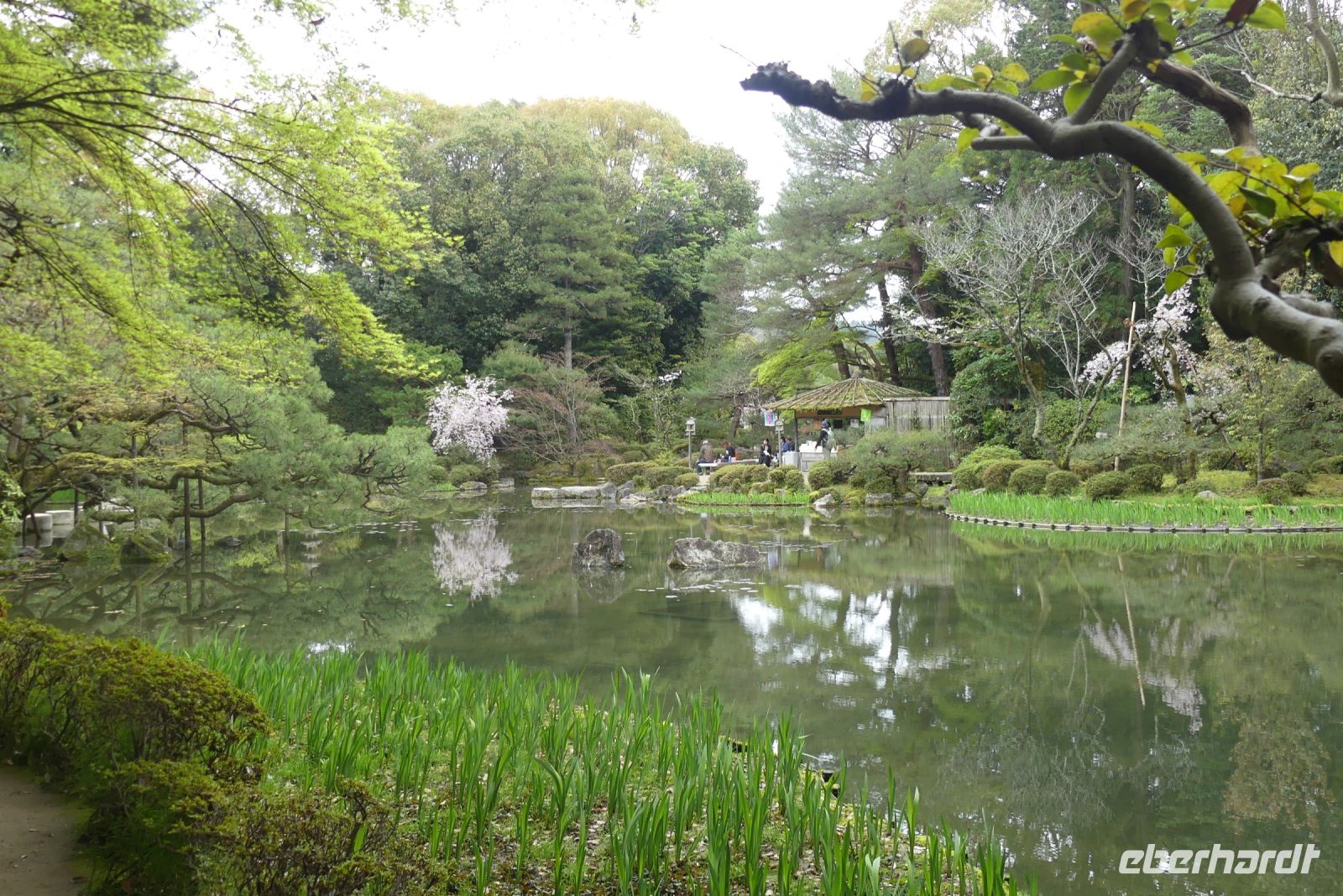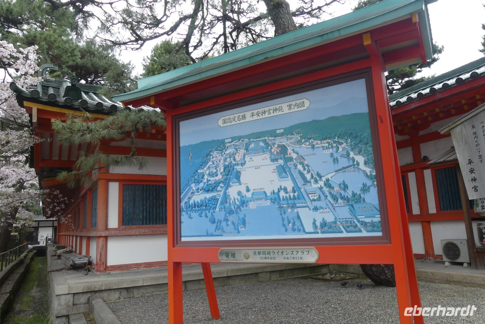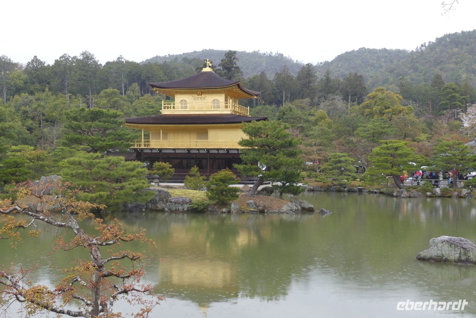 Wir konzentrieren uns heute Vormittag auf drei historische Tempel bzw. Schreine: Zunächst sind wir im Ryoanji-Tempel. Dieser hat einen weitläufigen gepflegten Garten und einen großen Teich sowie den für die Anlage bekannten Zen-Garten. Außer uns sind hier nur wenige Besucher. Das ist im folgenden buddhistischen Kinkaku-ji Tempel ganz anders. Der als „Goldene Pavillon“ bekannte Tempel steht bei Touristen offensichtlich hoch im Kurs. Allerdings ist der großflächig mit Blattgold überzogene Tempel, eingebettet in eine Landschaft mit Teich und üppigem Grün auch wirklich ein Juwel. Samira meinte, dass einmal ein Priester von der Schönheit so überwältigt war und den Anblick nicht mehr ertragen konnte, dass er ihn in Brand setzte (1950). Zum Glück wurde der Goldene Pavillon wieder aufgebaut. Schließlich besuchen wir noch den Heian-Schrein. Bei dem Shinto-Schrein handelt es sich teilweise um eine Rekonstruktion eines alten Kaiserpalastes. Die weitläufige Anlage mit seinen knallroten, monumentalen Gebäuden erinnert mich entfernt an die Verbotene Stadt in Peking. Und tatsächlich wurde die Architektur des Heian-Schreins durch China geprägt.