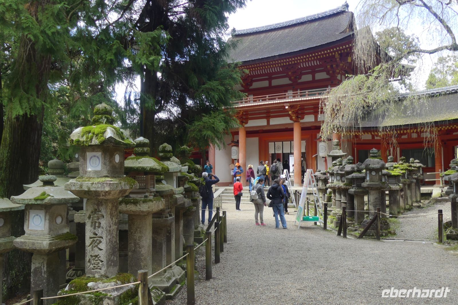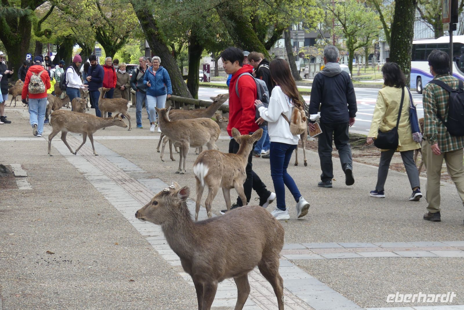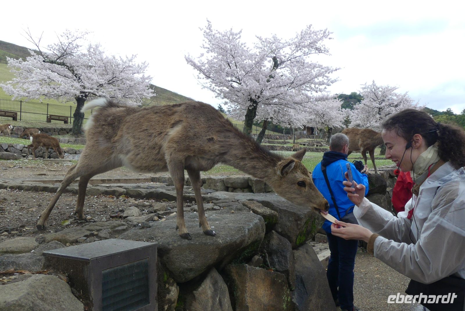 Die letzte Nacht gab es Dauerregen. Aber wir haben Glück, jetzt da wir starten, hat der Regen gerade aufgehört. Ziel unseres letzten Ausflugtages ist Nara. Nara war im 8. Jahrhundert Hauptstadt Japans und kann aus dieser Zeit bedeutende Tempelanlagen und Kunstwerke vorweisen. Untrennbar mit Nara verbunden sind die zutraulichen, aber wild lebenden Sikahirsche. Schon kurz nach unserer Ankunft mit der Bahn in Nara begegnen uns auf dem Fußweg die ersten Hirsche. Auch später im Nara-Park treffen wir immer wieder auf sie. Viele von ihnen haben die Eigenheit, dass sie sich dreimal verbeugen, bevor sie einen Hirsch-Cracker bekommen. Übrigens ist der Tempel einer Gottheit gewidmet, die auf einem heiligen Hirsch nach Nara gekommen sein soll. Deshalb werden die Tiere verehrt und genießen einen besonderen Status. An diesem Vormittag besichtigen wir natürlich auch den bekanntesten Tempel, den Todaiji-Tempel, größte Holzgebäude der Welt und Standort der größten bronzenen Buddhastatue der Welt.