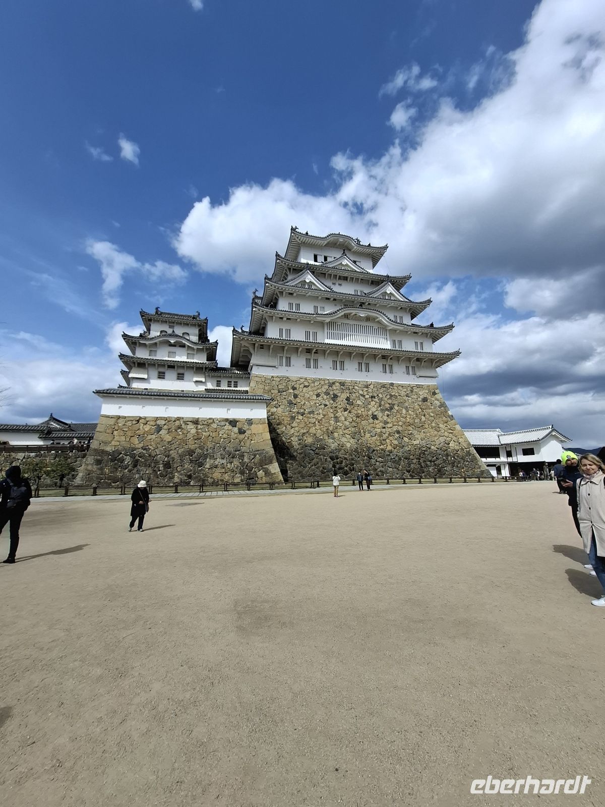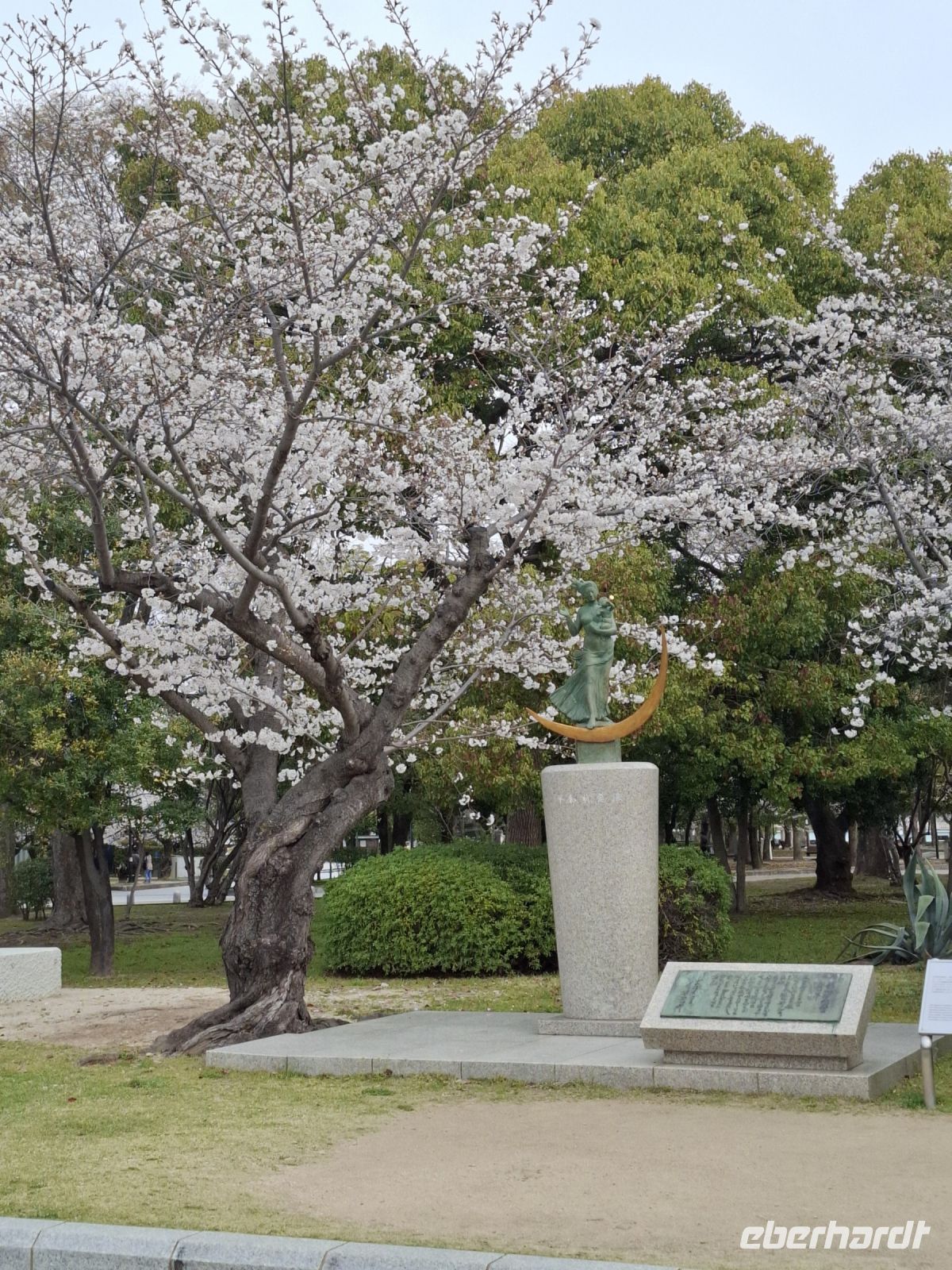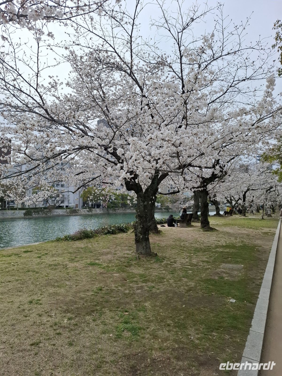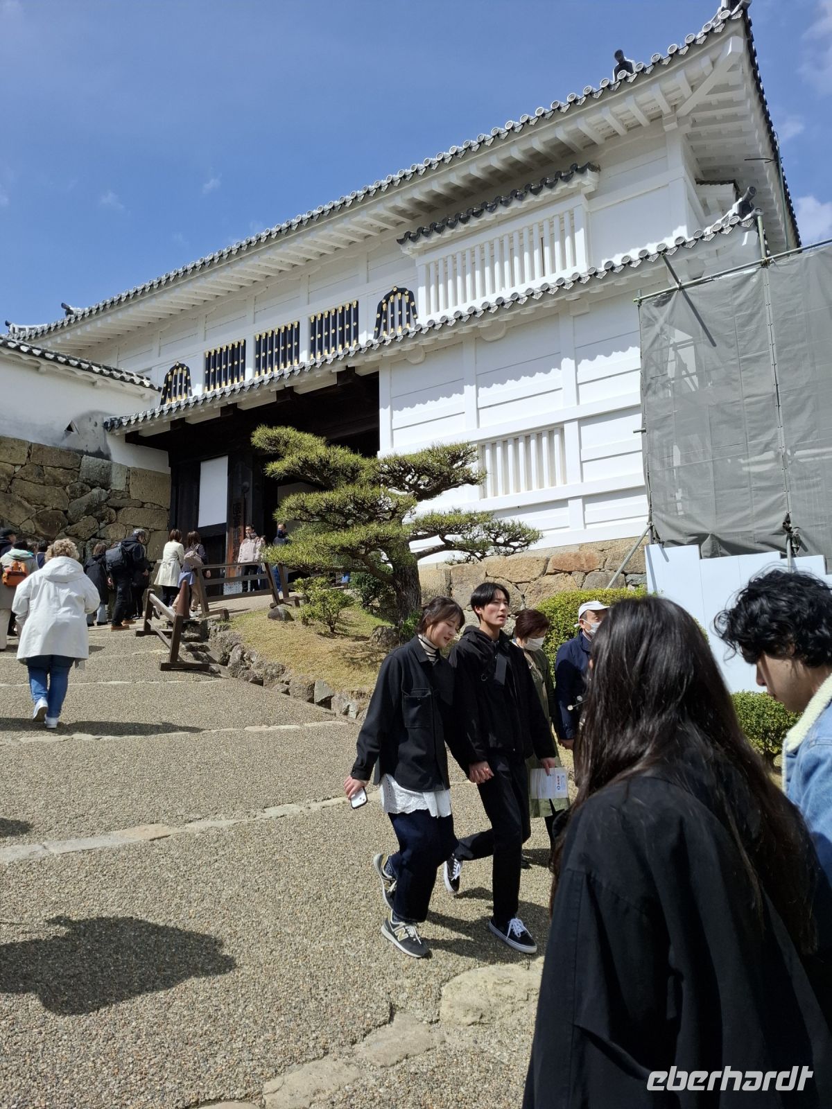 Zeitgleich mit uns checken zwei weitere Gruppen aus dem Hotel in Takayama aus und wir spazieren rund fünf Minuten zum Bahnhof. Unsere Koffer haben wir bereits am Vorabend an der Rezeption abgegeben und nun reisen wir mit kleinem Gepäck weiter. Zunächst fahren wir rund 2,5 Stunden mit dem Zug von Takayama nach Nagoya. Die Landschaft als auch kleinere Städte, Dörfer und einige Wasserkraftanlagen ziehen an unseren Fenstern vorbei. Auf dem Weg sehen wir auch die ersten zarten Kirschblüten am Baum sich öffnen. In Nagoya haben wir rund dreißig Minuten Zeit, um uns ein Bento (ein Mittagssnack) zu kaufen und das Gleis zu wechseln, dann ab jetzt geht es weiter im bekannten japanischen Shinkanzen, der Schnellzug unter den Schnellzügen. Auch hier nehmen wir auf unseren vorreservierten Sitzplätzen Platz und schon legen wir mit rund 300 km/h die Strecke von Nagoya nach Himeji zurück. Nach rund anderthalb Stunden Fahrt erreichen wir Himeji. Das die Burg sehr voll sein wird, merken wir daran, dass wir keine Schließfächer für unser Gepäck finden. Die Lösung ist, dass wir unser Gepäck in einem Laden abstellen dürfen, der mit der Touristinformation zusammen arbeitet und dies innerhalb dieser Kooperation erlaubt. Um Zeit zu sparen, fahren wir dann mit dem Bus vom Hauptbahnhof zur Burg. Dabei lernen wir das japanische Ticketzahlen auch einmal kennen. Schließlich erreichen wir die Burg und erkunden diese gemeinsam mit Gudrun. Die Burg wird seit 1993 durch die UNESCO geschützt und diente schon mehrfach als Kulisse für so manchen Hollywood-Blockbuster. Da die Burg nie angegriffen wurde, ist sie auch noch so gut erhalten. Sie wurde im Jahr 1616 fertig gestellt und mit einer Höhe von 51 Metern, zudem auf einem Hügel stehend, ist dieses Bauwerk so oder so schon ein imposantes Gebäude, auch sehr schönes noch hinzu. Wir strömen mit den Massen hinauf zum Burgareal und genießen sowohl die Blicke auf die Burg als auch auf die Stadt Himeji selbst. Gudrun führt uns auch durch die zwei Gartenanlagen der Burg und hier sehen wir sie nun richtig, die beginnenden Kirschblüte mit den weißen und rosafarbenen Blüten. Da wir durch die vielen Menschen im Burgareal viel Zeit verloren haben, fahren wir mit dem Bus zurück zum Hauptbahnhof von Himeji, wo wir unsere Fahrt in einem anderen Shinkanzen weiter fortsetzen in Richtung Hiroshima. Hier angekommen, fahren wir mit Taxen zu unserem gebuchten Hotel. Dieser Abend steht uns frei zur individuellen Gestaltung. Einige meiner Reisegäste nutzen die Gelegenheit, um in einem Restaurant Kugelfisch zu probieren, andere Gäste wiederum spazieren nach einem fakultativen Abendessen in den hotelnahgelegenen Friedenspark, um schon erste Impressionen auf sich wirken zu lassen.