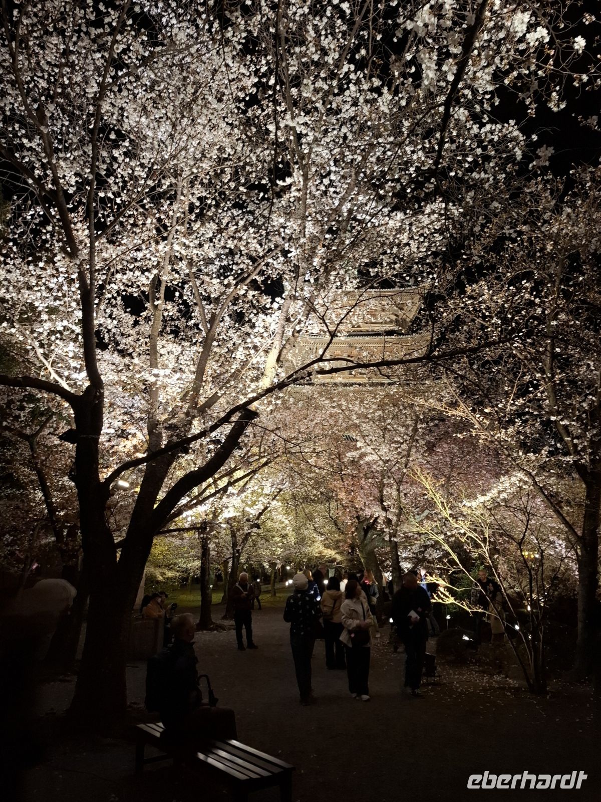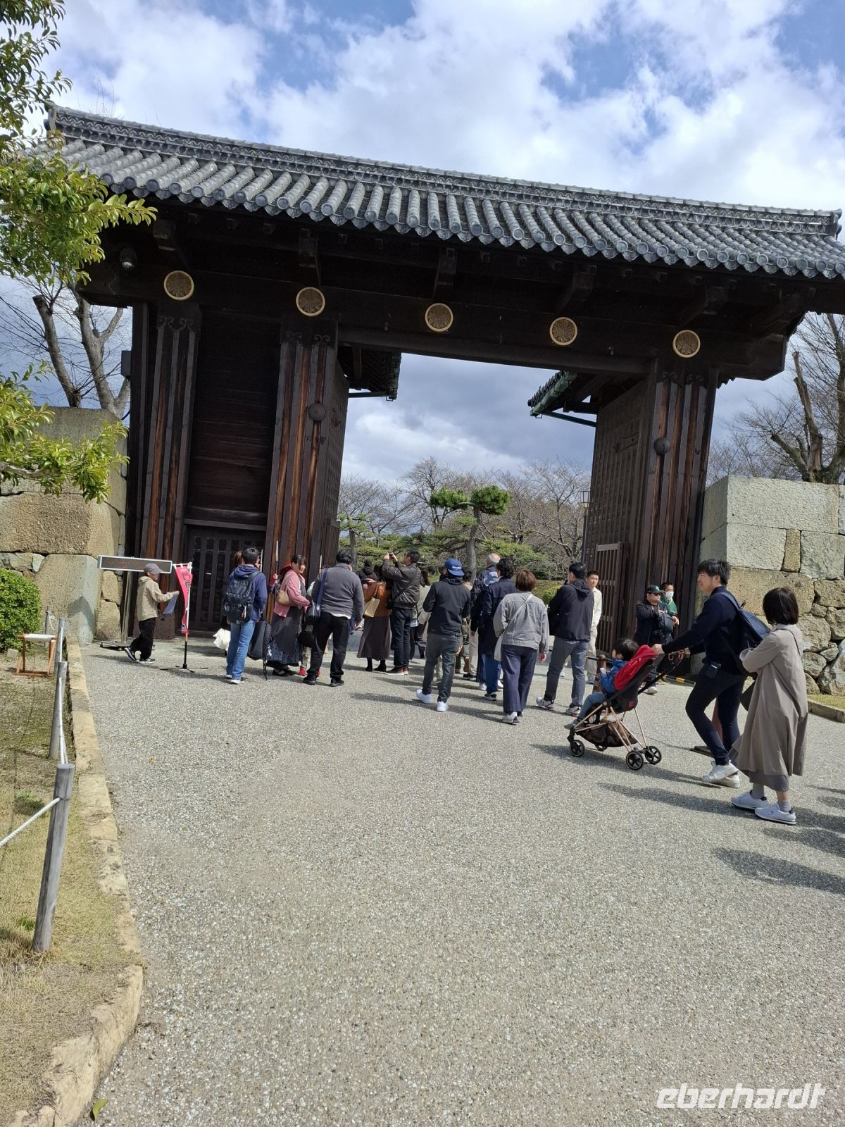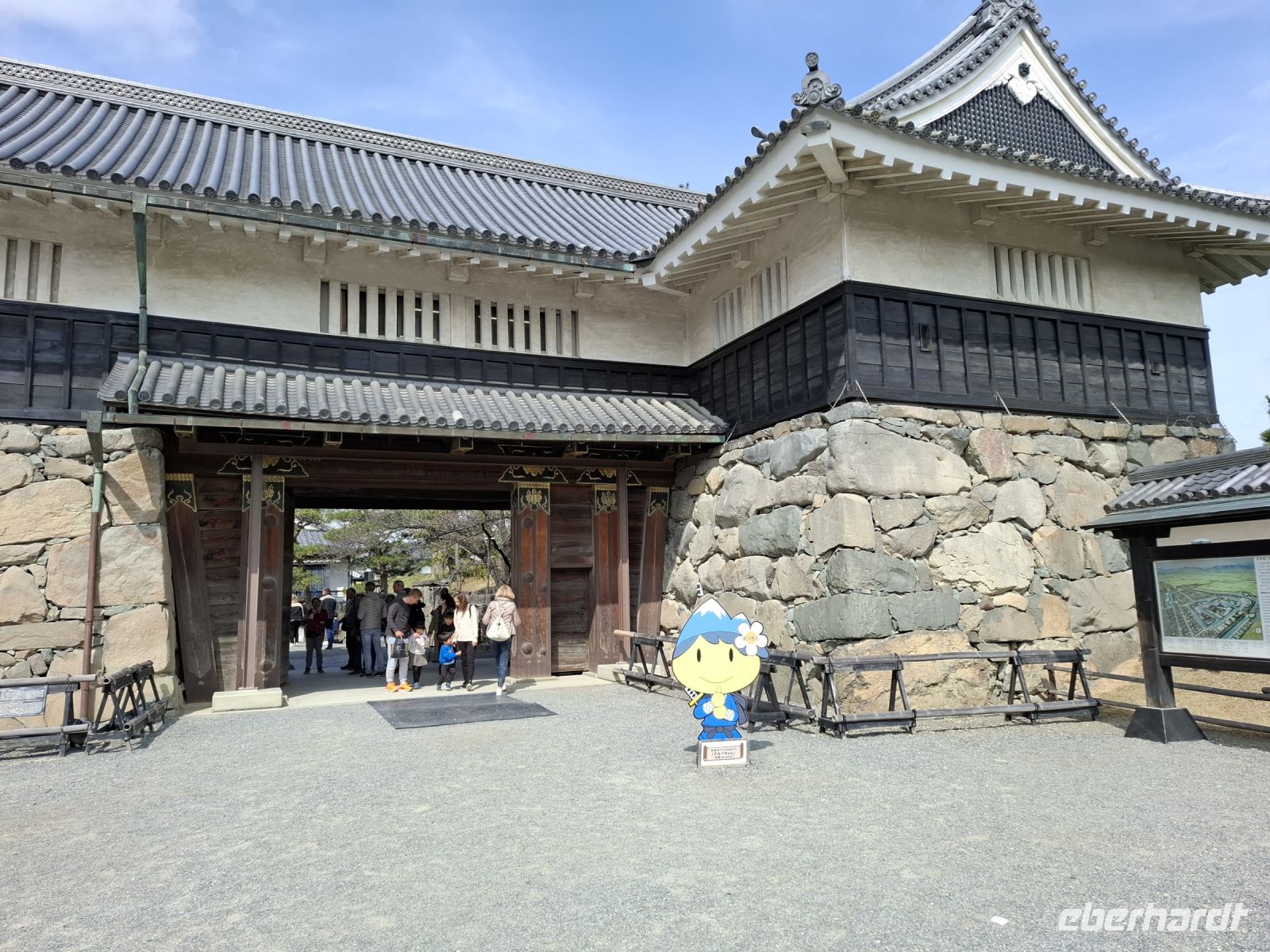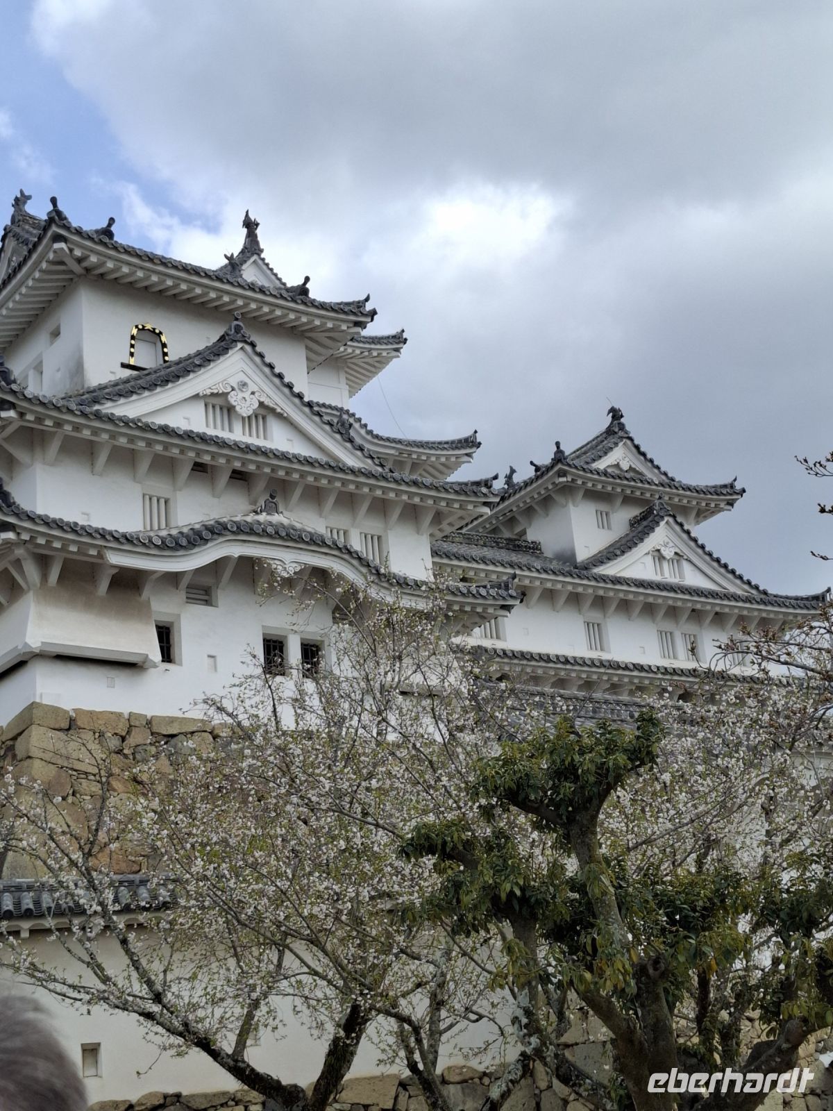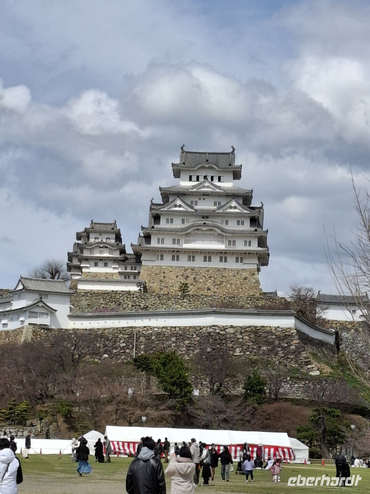 Zeitgleich mit uns checken zwei weitere Gruppen aus dem Hotel in Takayama aus und wir spazieren rund fünf Minuten zum Bahnhof. Unsere Koffer haben wir bereits am Vorabend an der Rezeption abgegeben und nun reisen wir mit kleinem Gepäck weiter. Zunächst fahren wir rund 2,5 Stunden mit dem Zug von Takayama nach Nagoya. Die Landschaft als auch kleinere Städte, Dörfer und einige Wasserkraftanlagen ziehen an unseren Fenstern vorbei. Auf dem Weg sehen wir auch die ersten zarten Kirschblüten am Baum sich öffnen. In Nagoya haben wir rund dreißig Minuten Zeit, um uns ein Bento (ein Mittagssnack) zu kaufen und das Gleis zu wechseln, dann ab jetzt geht es weiter im bekannten japanischen Shinkanzen, der Schnellzug unter den Schnellzügen. Auch hier nehmen wir auf unseren vorreservierten Sitzplätzen Platz und schon legen wir mit rund 300 km/h die Strecke von Nagoya nach Himeji zurück. Nach rund anderthalb Stunden Fahrt erreichen wir Himeji. Das die Burg sehr voll sein wird, merken wir daran, dass wir keine Schließfächer für unser Gepäck finden. Die Lösung ist, dass wir unser Gepäck in einem Laden abstellen dürfen, der mit der Touristinformation zusammen arbeitet und dies innerhalb dieser Kooperation erlaubt. Um Zeit zu sparen, fahren wir dann mit dem Bus vom Hauptbahnhof zur Burg. Dabei lernen wir das japanische Ticketzahlen auch einmal kennen. Schließlich erreichen wir die Burg und erkunden diese gemeinsam mit Gudrun. Die Burg wird seit 1993 durch die UNESCO geschützt und diente schon mehrfach als Kulisse für so manchen Hollywood-Blockbuster. Da die Burg nie angegriffen wurde, ist sie auch noch so gut erhalten. Sie wurde im Jahr 1616 fertig gestellt und mit einer Höhe von 51 Metern, zudem auf einem Hügel stehend, ist dieses Bauwerk so oder so schon ein imposantes Gebäude, auch sehr schönes noch hinzu. Wir strömen mit den Massen hinauf zum Burgareal und genießen sowohl die Blicke auf die Burg als auch auf die Stadt Himeji selbst. Gudrun führt uns auch durch die zwei Gartenanlagen der Burg und hier sehen wir sie nun richtig, die beginnenden Kirschblüte mit den weißen und rosafarbenen Blüten. Da wir durch die vielen Menschen im Burgareal viel Zeit verloren haben, fahren wir mit dem Bus zurück zum Hauptbahnhof von Himeji, wo wir unsere Fahrt in einem anderen Shinkanzen weiter fortsetzen in Richtung Hiroshima. Hier angekommen, fahren wir mit Taxen zu unserem gebuchten Hotel. Dieser Abend steht uns frei zur individuellen Gestaltung. Einige meiner Reisegäste nutzen die Gelegenheit, um in einem Restaurant Kugelfisch zu probieren, andere Gäste wiederum spazieren nach einem fakultativen Abendessen in den hotelnahgelegenen Friedenspark, um schon erste Impressionen auf sich wirken zu lassen.