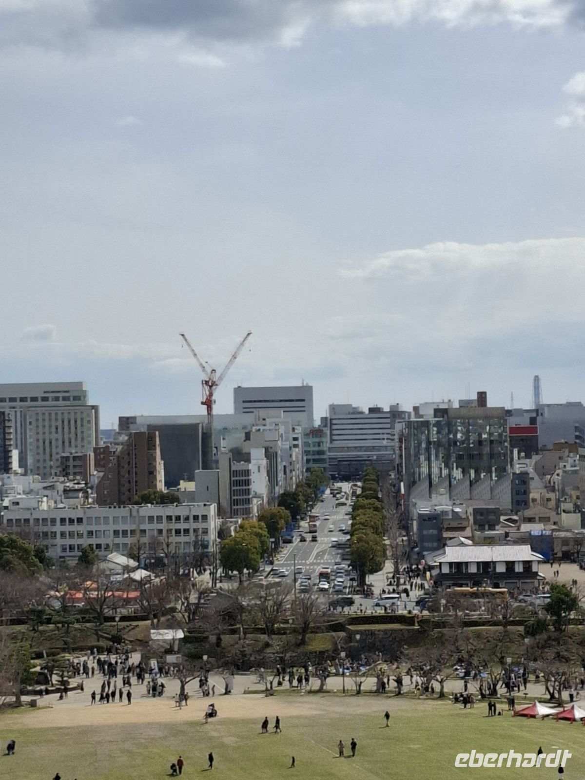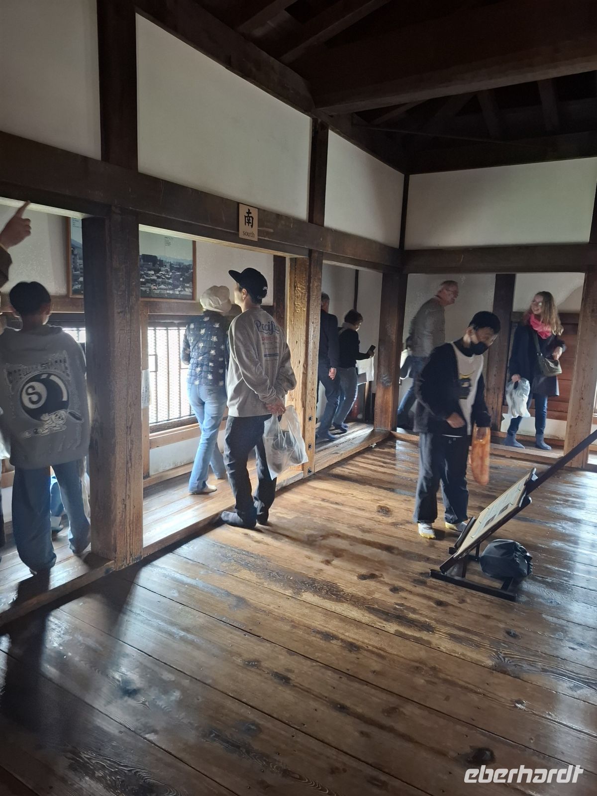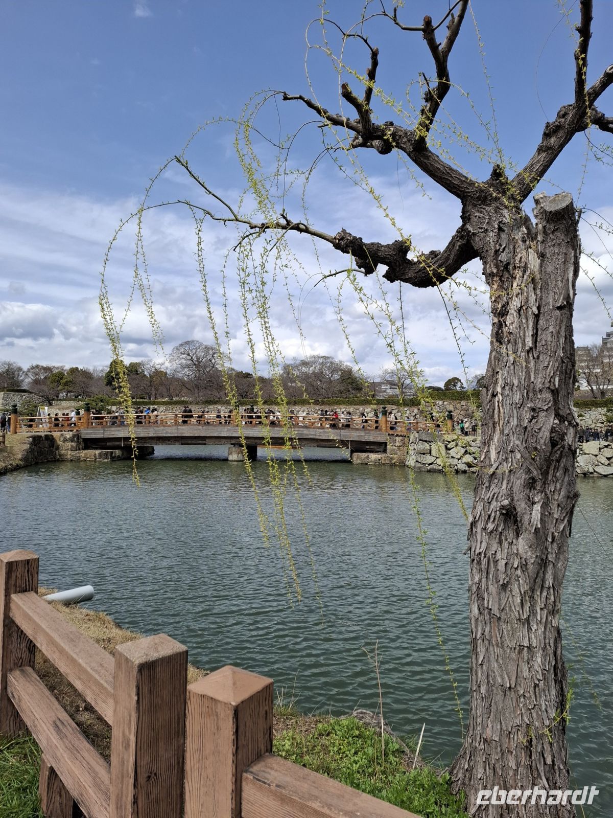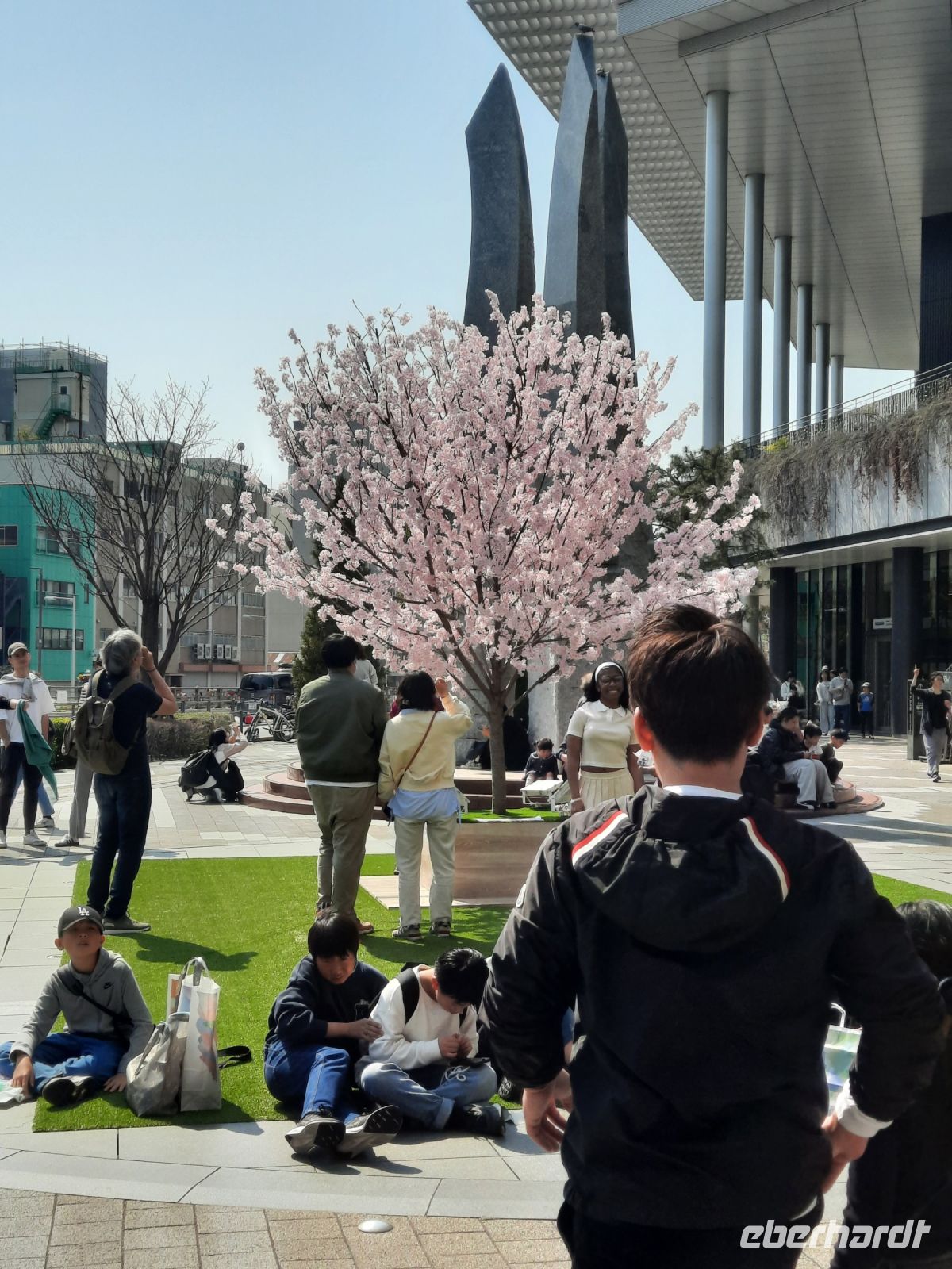 Zeitgleich mit uns checken zwei weitere Gruppen aus dem Hotel in Takayama aus und wir spazieren rund fünf Minuten zum Bahnhof. Unsere Koffer haben wir bereits am Vorabend an der Rezeption abgegeben und nun reisen wir mit kleinem Gepäck weiter. Zunächst fahren wir rund 2,5 Stunden mit dem Zug von Takayama nach Nagoya. Die Landschaft als auch kleinere Städte, Dörfer und einige Wasserkraftanlagen ziehen an unseren Fenstern vorbei. Auf dem Weg sehen wir auch die ersten zarten Kirschblüten am Baum sich öffnen. In Nagoya haben wir rund dreißig Minuten Zeit, um uns ein Bento (ein Mittagssnack) zu kaufen und das Gleis zu wechseln, dann ab jetzt geht es weiter im bekannten japanischen Shinkanzen, der Schnellzug unter den Schnellzügen. Auch hier nehmen wir auf unseren vorreservierten Sitzplätzen Platz und schon legen wir mit rund 300 km/h die Strecke von Nagoya nach Himeji zurück. Nach rund anderthalb Stunden Fahrt erreichen wir Himeji. Das die Burg sehr voll sein wird, merken wir daran, dass wir keine Schließfächer für unser Gepäck finden. Die Lösung ist, dass wir unser Gepäck in einem Laden abstellen dürfen, der mit der Touristinformation zusammen arbeitet und dies innerhalb dieser Kooperation erlaubt. Um Zeit zu sparen, fahren wir dann mit dem Bus vom Hauptbahnhof zur Burg. Dabei lernen wir das japanische Ticketzahlen auch einmal kennen. Schließlich erreichen wir die Burg und erkunden diese gemeinsam mit Gudrun. Die Burg wird seit 1993 durch die UNESCO geschützt und diente schon mehrfach als Kulisse für so manchen Hollywood-Blockbuster. Da die Burg nie angegriffen wurde, ist sie auch noch so gut erhalten. Sie wurde im Jahr 1616 fertig gestellt und mit einer Höhe von 51 Metern, zudem auf einem Hügel stehend, ist dieses Bauwerk so oder so schon ein imposantes Gebäude, auch sehr schönes noch hinzu. Wir strömen mit den Massen hinauf zum Burgareal und genießen sowohl die Blicke auf die Burg als auch auf die Stadt Himeji selbst. Gudrun führt uns auch durch die zwei Gartenanlagen der Burg und hier sehen wir sie nun richtig, die beginnenden Kirschblüte mit den weißen und rosafarbenen Blüten. Da wir durch die vielen Menschen im Burgareal viel Zeit verloren haben, fahren wir mit dem Bus zurück zum Hauptbahnhof von Himeji, wo wir unsere Fahrt in einem anderen Shinkanzen weiter fortsetzen in Richtung Hiroshima. Hier angekommen, fahren wir mit Taxen zu unserem gebuchten Hotel. Dieser Abend steht uns frei zur individuellen Gestaltung. Einige meiner Reisegäste nutzen die Gelegenheit, um in einem Restaurant Kugelfisch zu probieren, andere Gäste wiederum spazieren nach einem fakultativen Abendessen in den hotelnahgelegenen Friedenspark, um schon erste Impressionen auf sich wirken zu lassen.