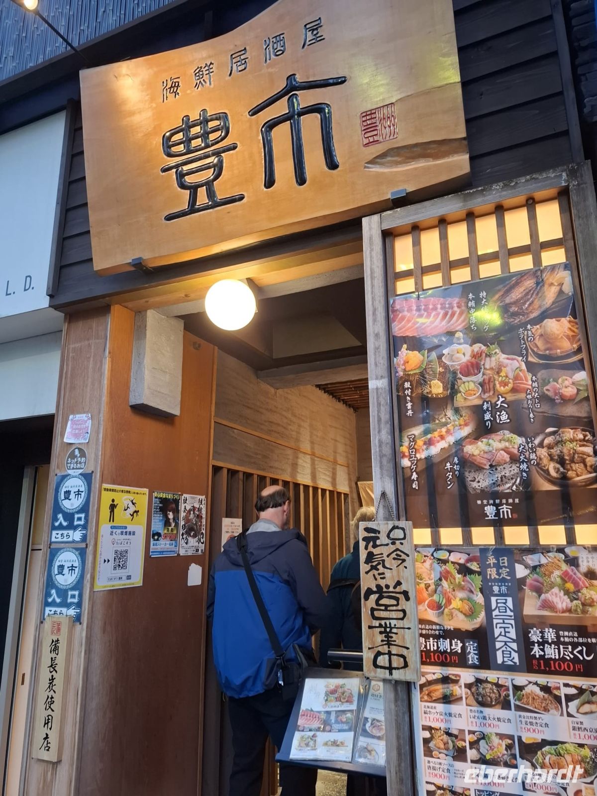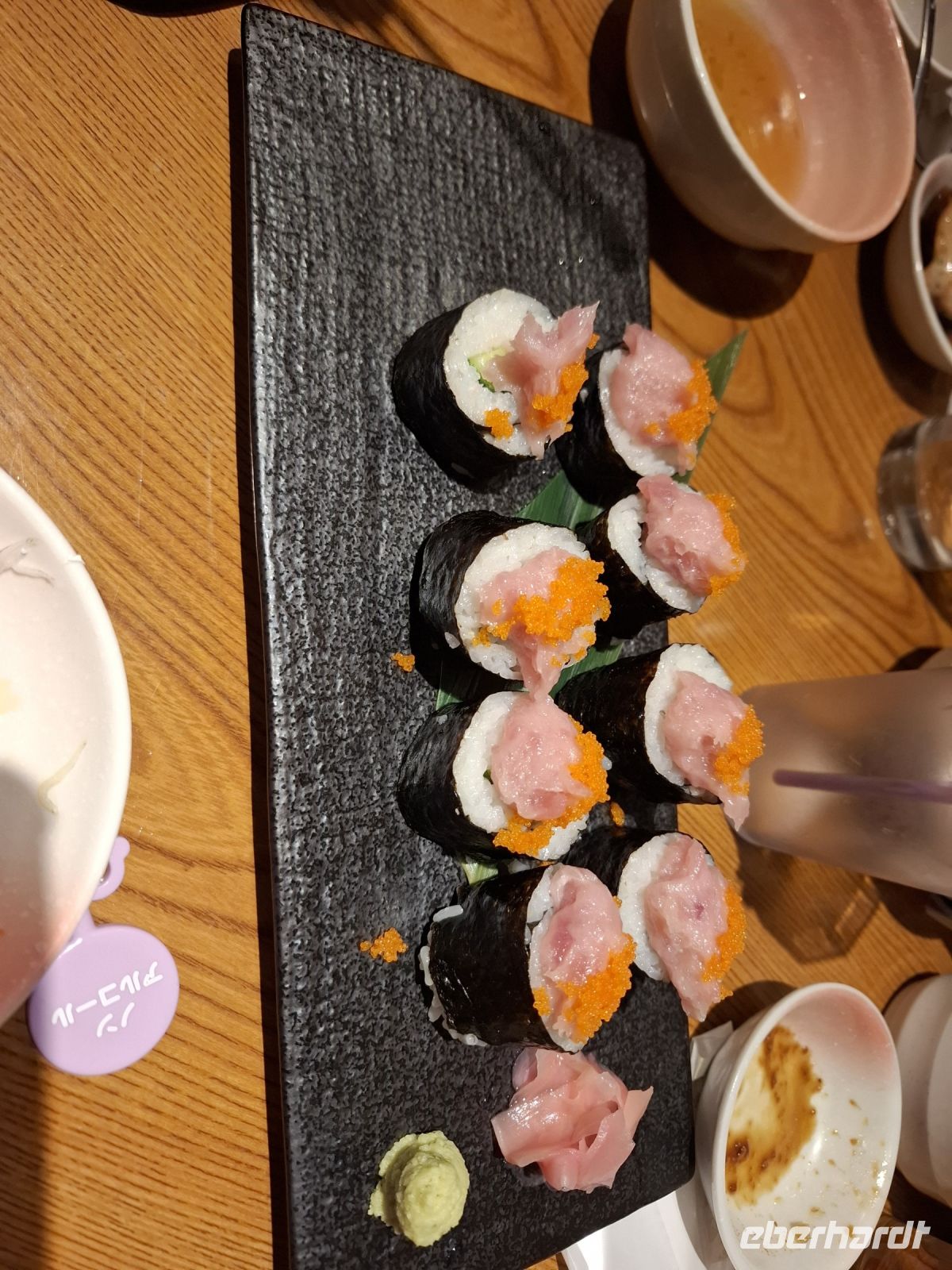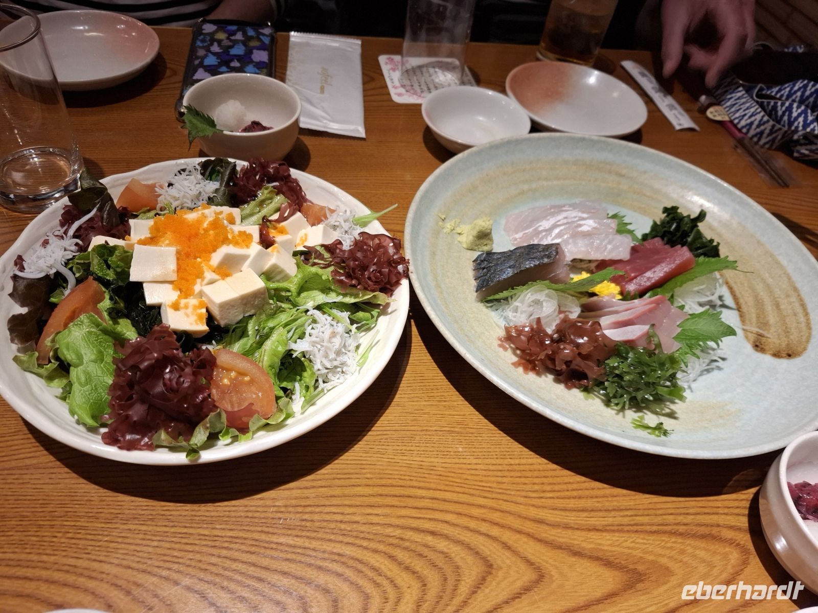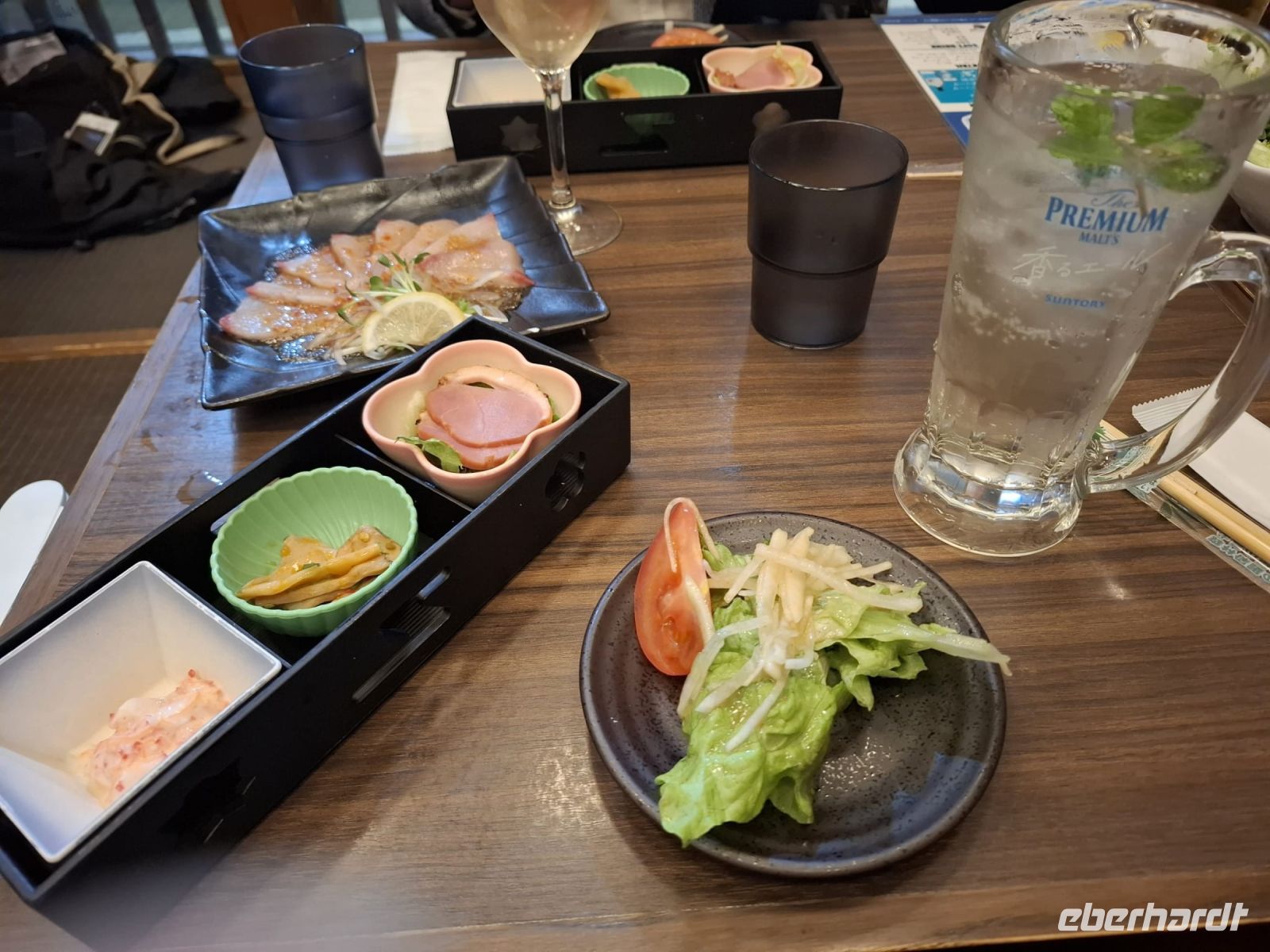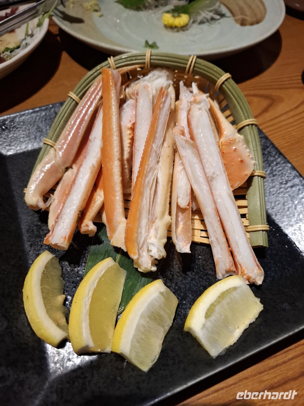 Unser Abschiedsabendessen genießen wir in einem lokalen Restaurant. Zunächst lassen wir die Reise noch einmal Revue passieren und bedanken uns bei Gudrun, die uns in den letzten zwei Wochen das japanische Land mit viel Wissen, Hintergrundinformationen und einem reibunglosen Ablauf näher gebracht hat. Danach lassen wir uns ein letztes Mal ein typische japanisches Abendessen schmecken, diesmal bestehend aus rohem Lachs, Sushi-Variationen und vor allem der hier sehr beliebten Schneekrabbe.