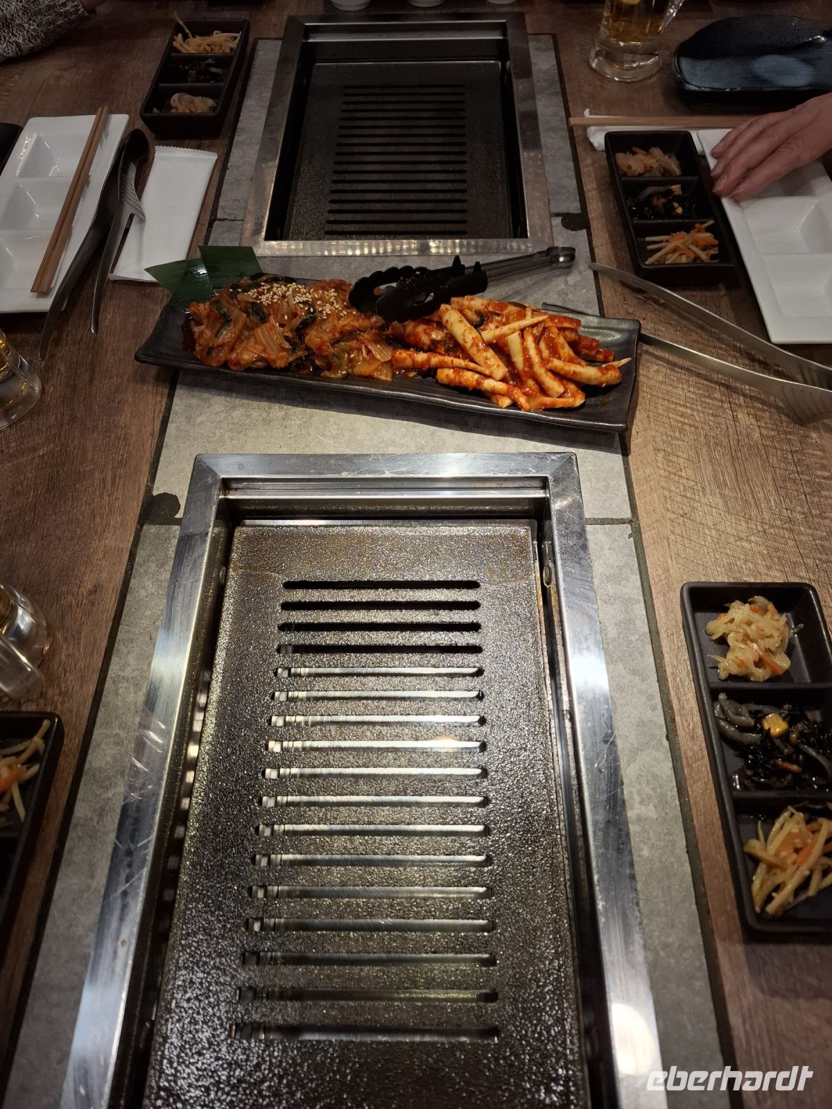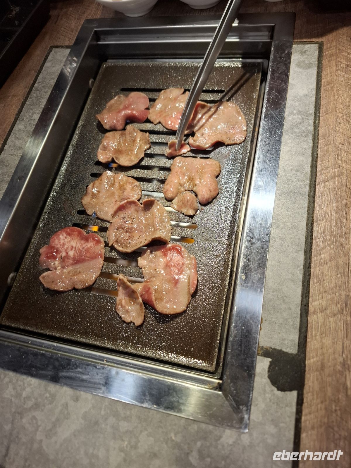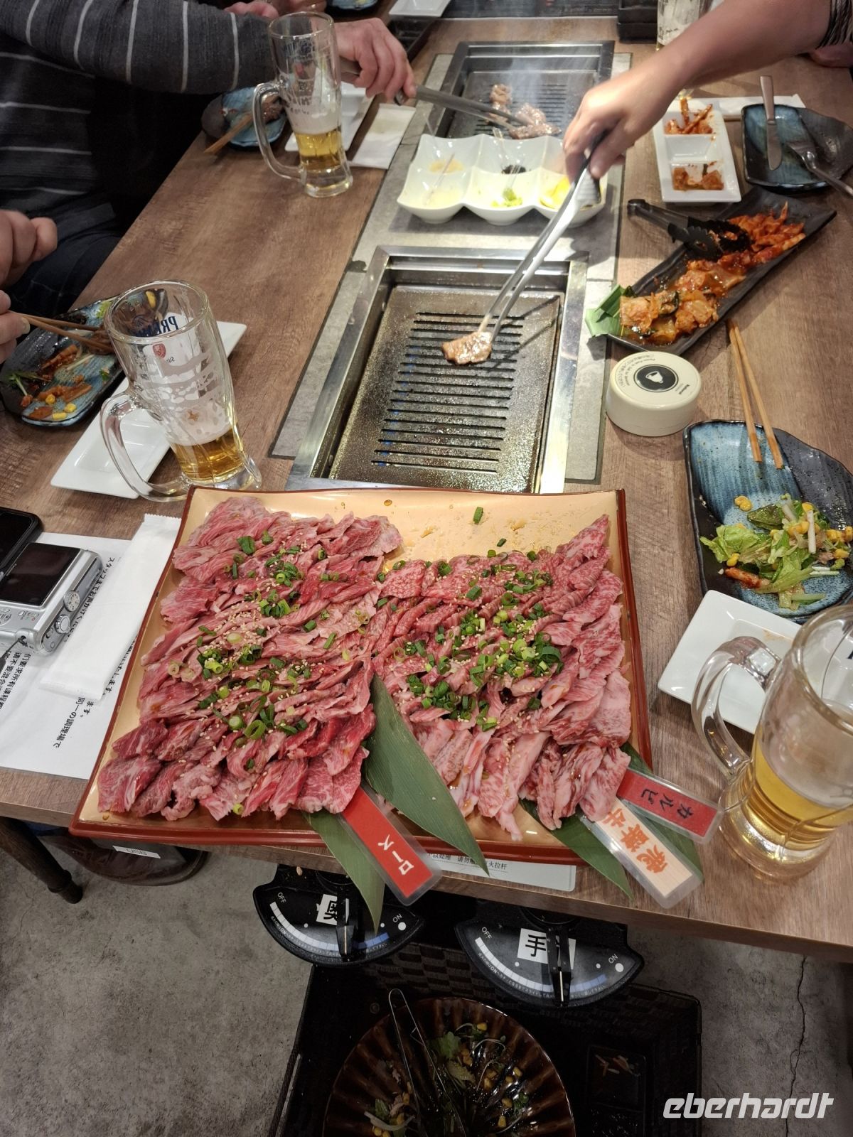 Am Abend treffen wir uns erneut, um in einem lokalen Restaurant das bekannte Hida-Rindfleisch zu probieren. Wir werden an vier Tischen platziert. In der Mitte eines jeden Tisches befinden sich Gasgrills und wir bekommen dazu zwei Platten Hida-Beef serviert, die wir nun grillen und uns schmecken lassen.