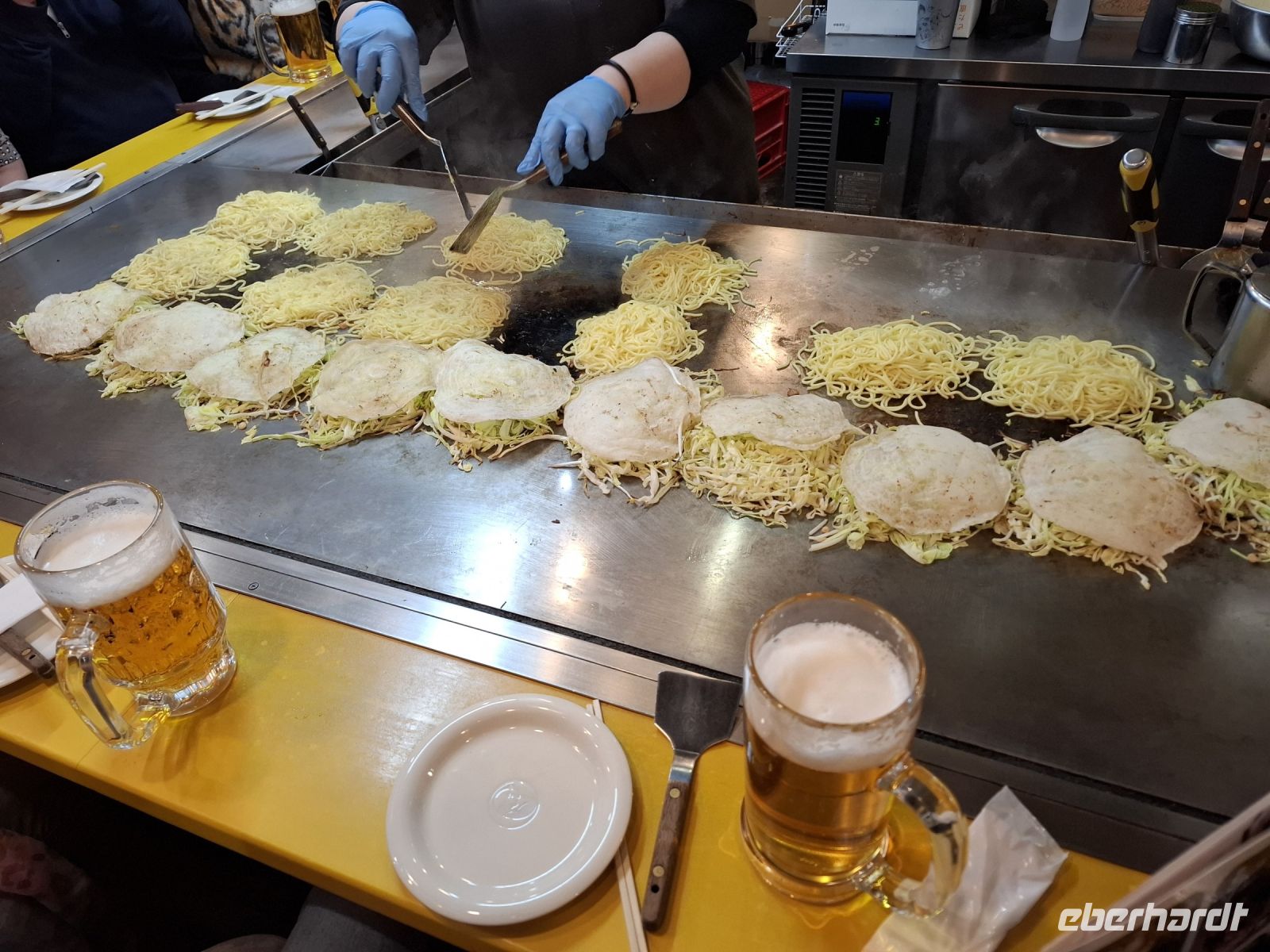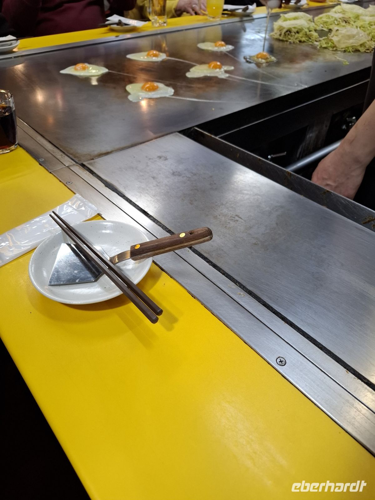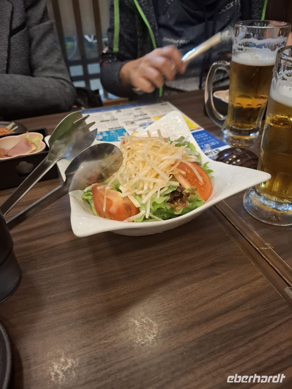 Am Abend treffen wir uns erneut, um in einem lokalen Restaurant das bekannte Hida-Rindfleisch zu probieren. Wir werden an vier Tischen platziert. In der Mitte eines jeden Tisches befinden sich Gasgrills und wir bekommen dazu zwei Platten Hida-Beef serviert, die wir nun grillen und uns schmecken lassen.