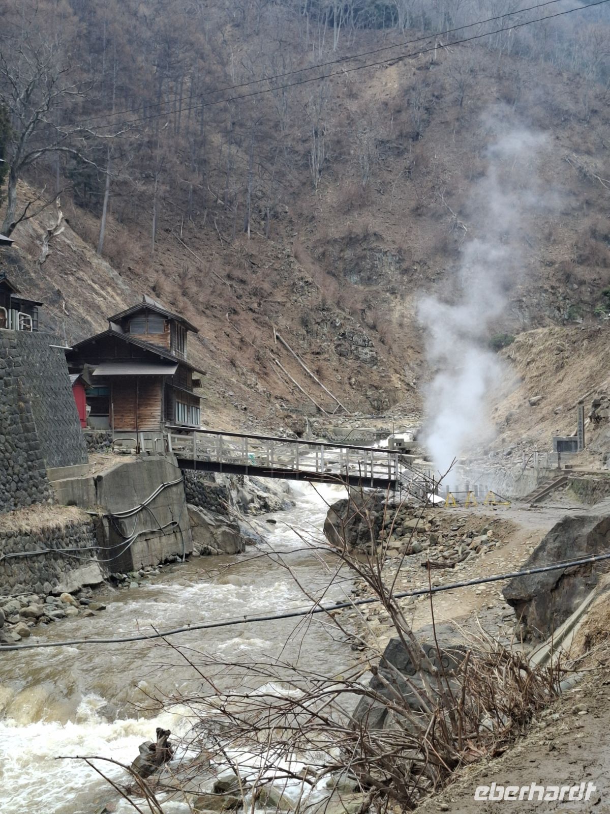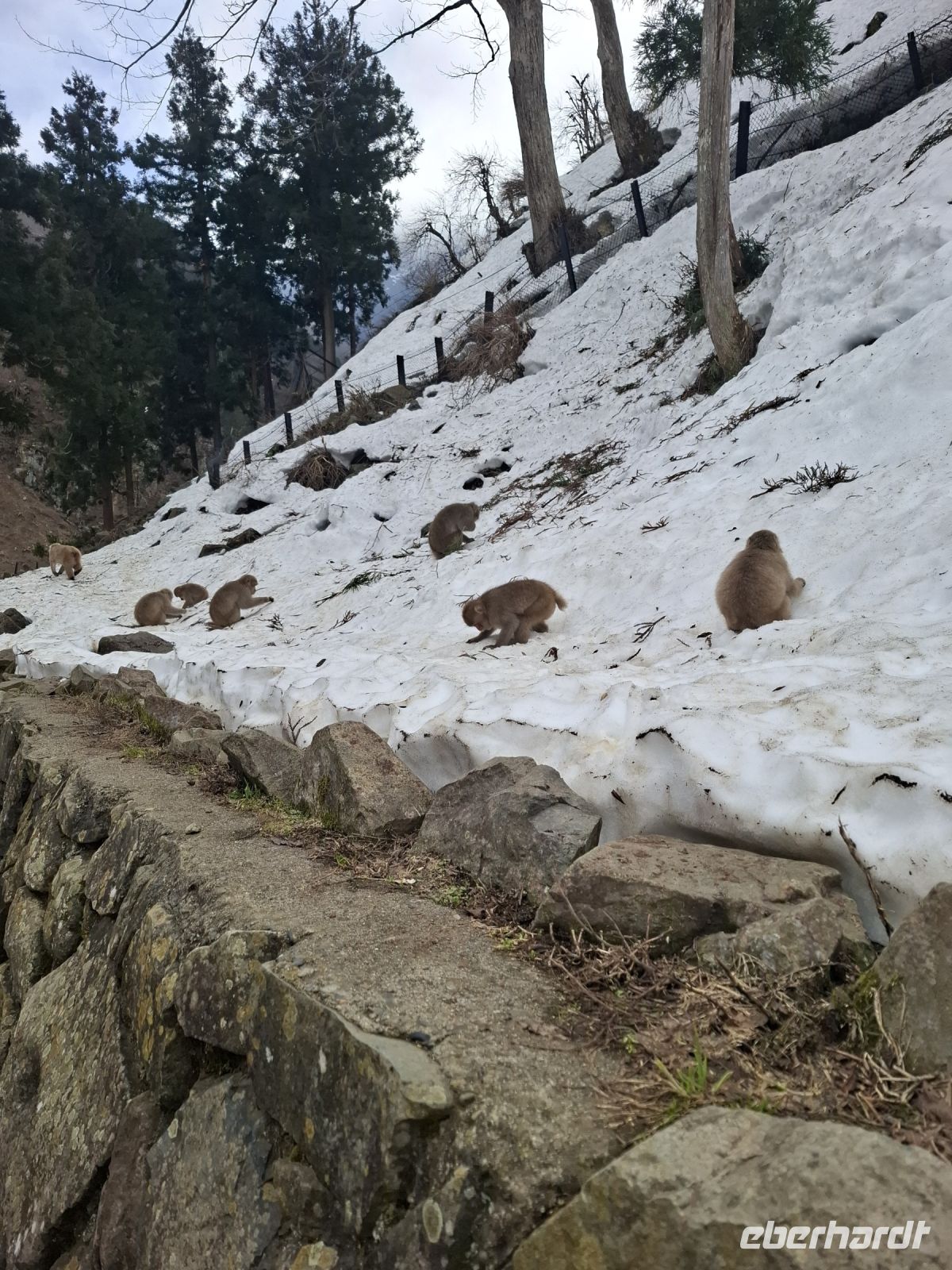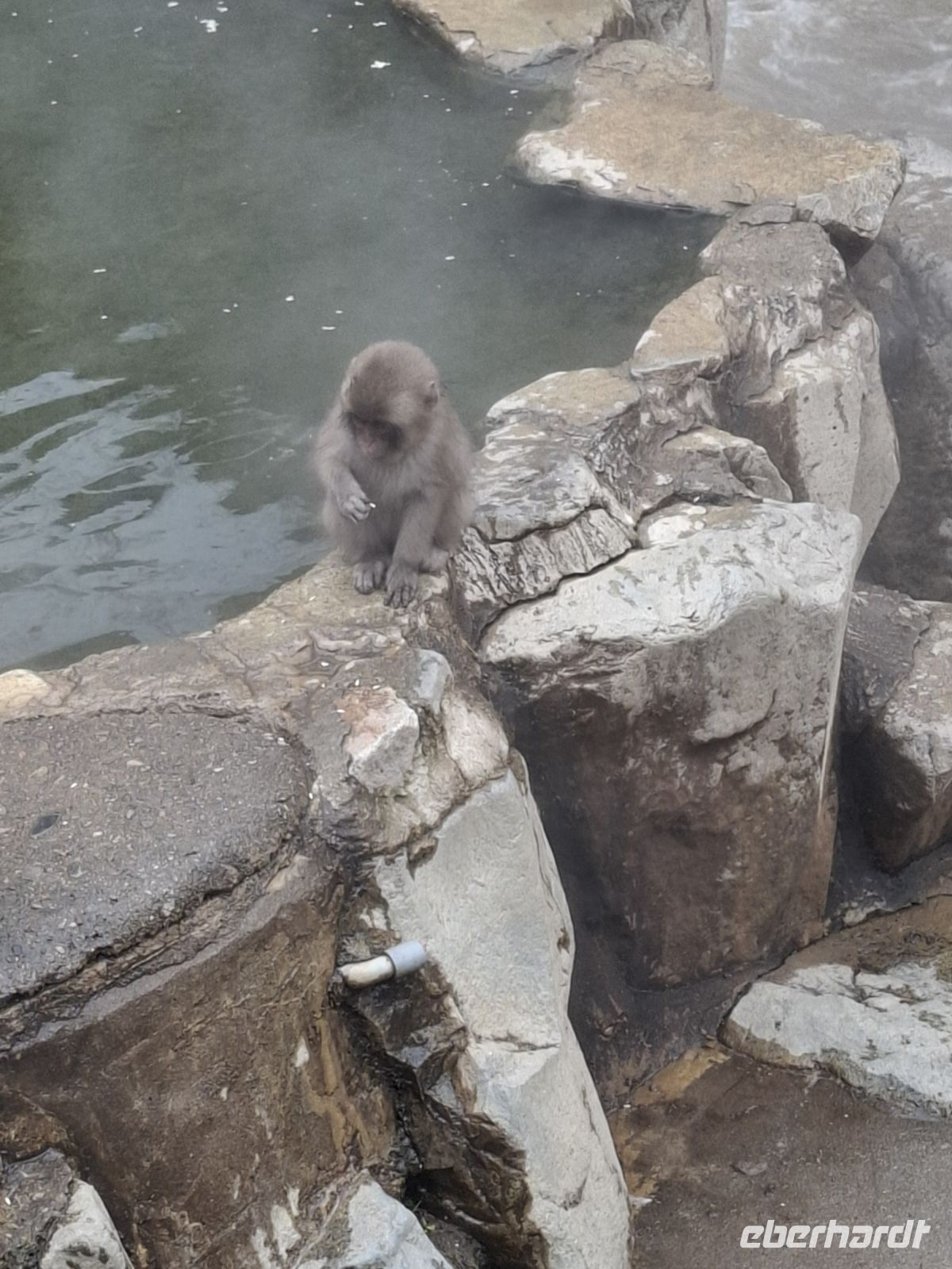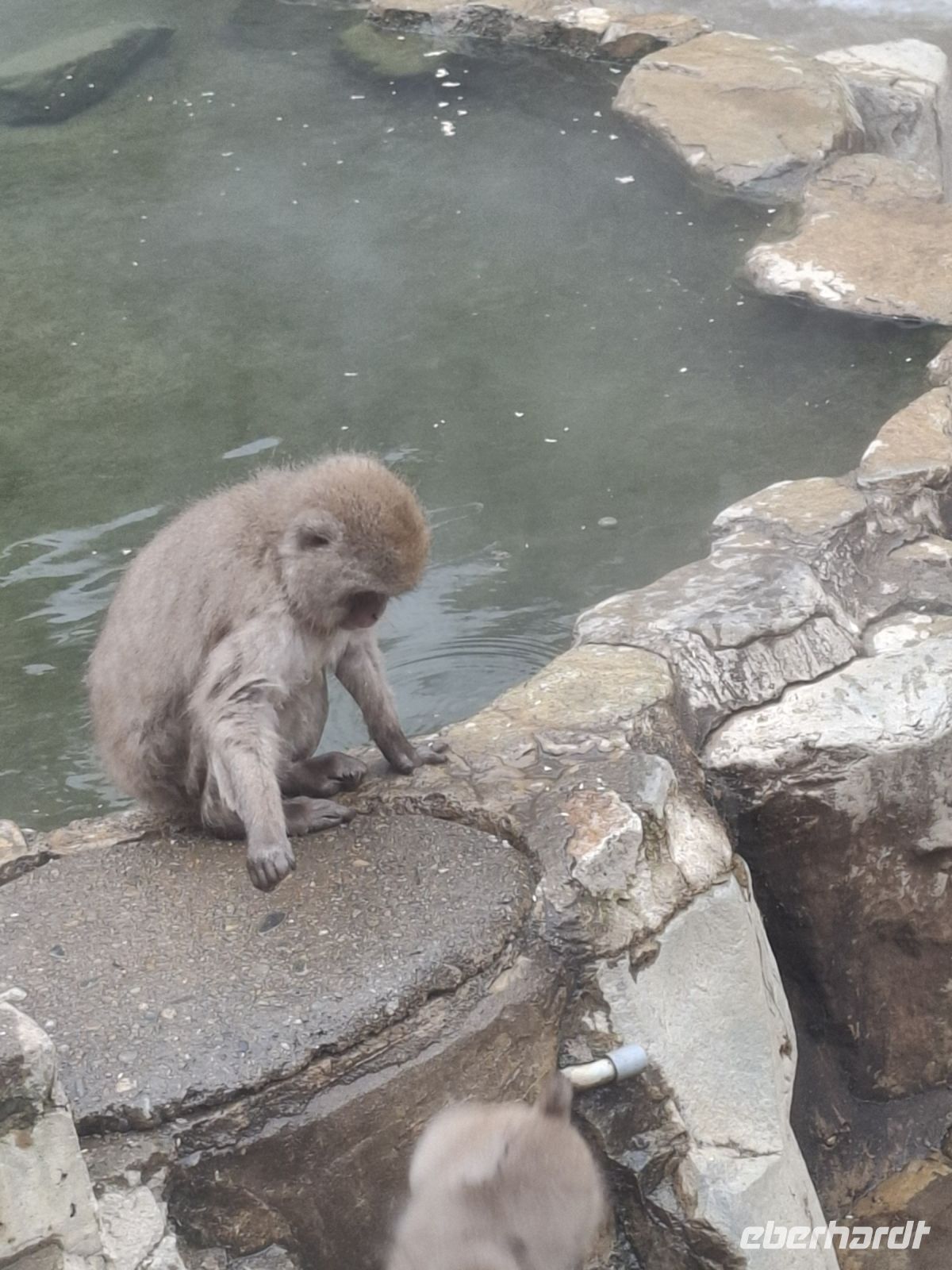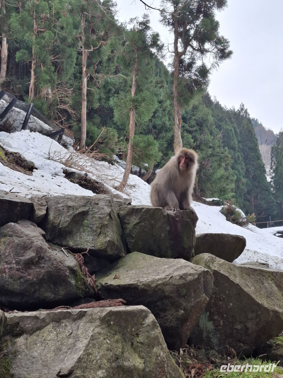 Heute ist der ersten Morgen, der uns einmal nicht mit Sonnenstrahlen begrüßt. Es ist wolkig aber dennoch hellen Lichtes, als wir die Stadt Nagano am Morgen verlassen. Beim Herausfahren aus der Stadt erzählt uns Gudrun, auf vorheriger Nachfrage einiger Gäste, etwas von einem Theaterbesuch in Kyoto und macht meiner Reisegruppe den Besuch sehr schmackhaft. Zack, werden die Handys gezückt und aus dem Bus heraus die noch wenigen vorhandenen Tickets gekauft. Die Technik heutzutage ist schon sehr nützlich. Wir lassen das Einzugsgebiet der Stadt Nagano hinter uns und langsam ändert sich die Umgebung in landwirtschaftliches Gebiet. Nach rund einer Stunde Fahrt erreichen wir den Parkplatz des Wildzoos und wandern zu dessen Eingang. Dafür spazieren wir rund 30 Minuten entlang eines doch sehr schlammigen Weges, da aufgrund der Schneeschmelze der Weg noch nicht wieder fest geworden ist. Hin und wieder laufen wir auch über Reste des gefrorenen Schnees. Zum Schluss hin überwinden wir noch einige Treppen und dann sehen wir Sie endlich, die freilebenden Affen. Wir haben wirklich großes Glück, dass diese da sind und sogar in einer beachtlichen Zahl. Wir werden von ihnen aber kaum beachtet. Die ganze Zeit sind sie am essen, hocken an der heißen Quelle oder jagen sich durch das Gebiet. Aber Obacht: auf einmal geben die Affen starke Laute von sich und kurz darauf sehen wir auf der gegenüberliegenden Seite, wie sich ein großer Stein lockert und den Hang herunter poltert. Für einen kurzen Moment sind wir vom Schrecken erfasst aber Gott sei Dank verflüchtigt sich dies schnell, da der Steinschlag doch etwas weiter von uns entfernt ist. Der Rückweg ist der gleiche, den wir auf der Hinroute genommen haben und in der Nähe des Busses haben wir die Möglichkeit, unsere verunreinigten Schuhe etwas zu säubern. Zurück im Bus ist unser nächstes Ziel Matsumoto. Aber bevor wir das beschauliche Städtchen erreichen, stoppen wir noch für eine Mittagspause, damit wir gut gestärt am zeitigen Nachmittag gemeinsam mit Gudrun die Burganlage von Matsumoto erkunden können. Wir spazieren zunächst durch das mächtige Tor und Gudrun erklärt uns die Rüstung eines Samurais. Danach sehen wir die schwarze Burg, die auch den Beinamen Krähenburg trägt, in ihrer vollständigen Pracht. Mit ihren ausgebreiteten Armen ist sie besonders schön anzusehen. Der noch gut erhaltene Burgturm möchte jetzt durch uns erklommen werden. Auf vielen schmalen und steilen Treppen (teilweise 61 Grad Steigung) erreichen wir den sechsten Stock der Burg und genießen von hier aus den Ausblick auf die Stadt Matsumoto. Wir haben auch hier wieder Glück: die Sonne zieht auf und taucht den Anblick in ein leuchtendes Bild. Und es sind nicht so viele Menschen in der Burganlage, so dass wir auch die Möglichkeit am heutigen Tag hatten, auf den Turm zu gelangen. Dem ist nicht immer so, wie uns Gudrun berichtet. Nach diesem Programmpunkt gelangen wir erneut zum Bus und Makino San bringt uns weiter nach Takayama. Langsam ändert sich einmal wieder die Landschaft aber auch das Wetter. Durch kleine Städtchen und durch einige Tunnel geht es hinauf in das Gebirge. Die Wolken hängen tief und es wird recht schnell dunkel. Je höher wir kommen, desto mehr Schnee sehen wir auch noch. Der Kontrast zu den letzten Tagen ist da. Auf dem Weg nach Takayama telefoniert Gudrun mit dem Chef eines kleinen Lokals und reserviert für uns alle Plätze. Damit ist der Laden ausgebucht und als wir nach unserem Hotel-Checkin-In am Restaurant ankommen, steht dran "sorry, we are closed". Durch uns ist tatsächlich jeder Platz besetzt. Der Chef kocht hier noch persönlich und so bestellt jeder das von der Speisekarte, was ihm am besten anspricht. Guten Appetit.