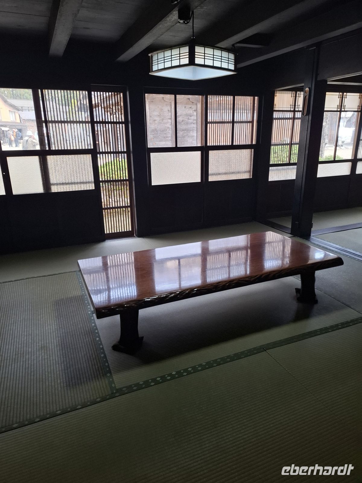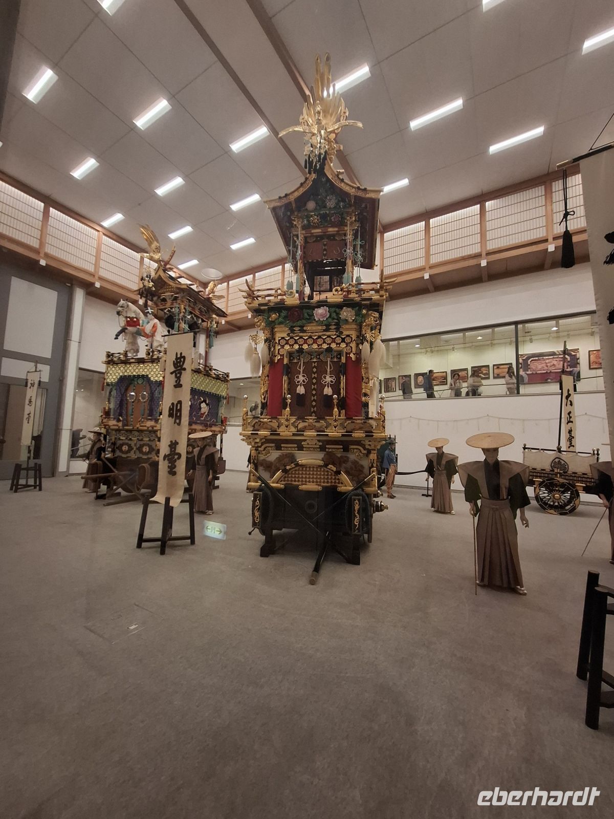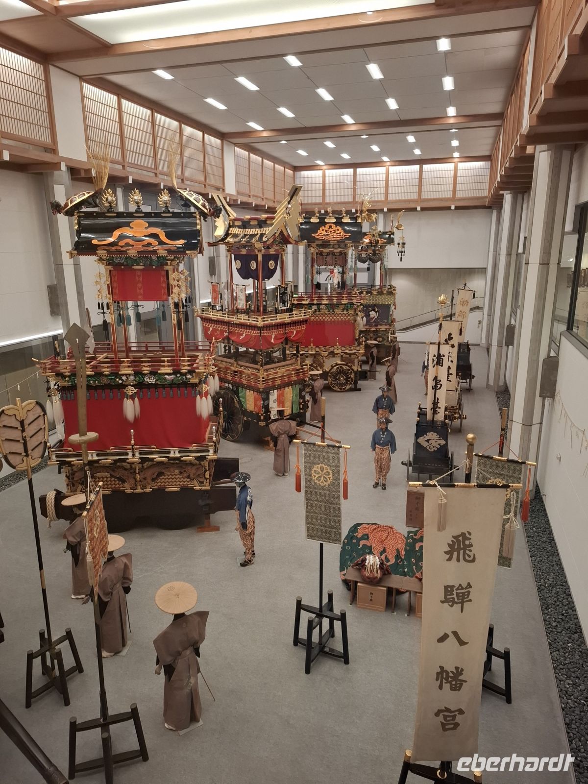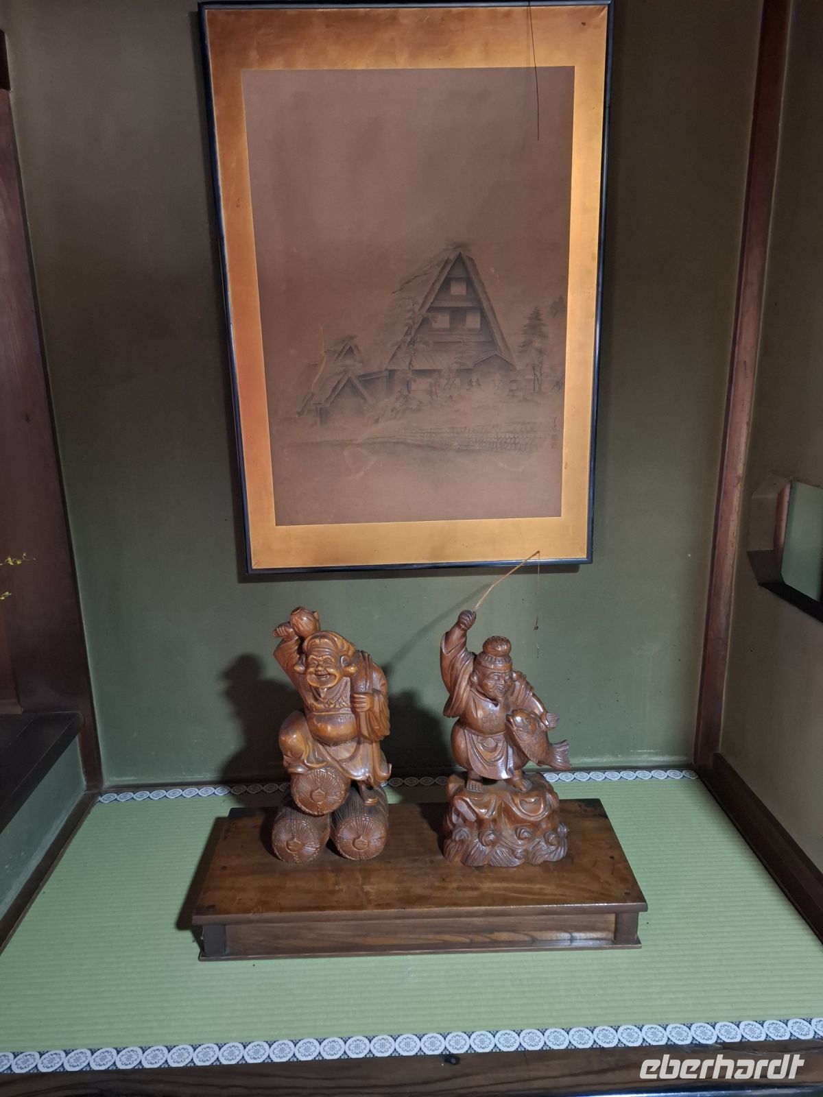 Am späten Vormittag treffen wir uns am Hotel wieder und gemeinsam mit Makino San fahren wir zum ca. eine Stunde entfernten Dorf Shirakawago, ein malerischer Ort mit schilfgedeckten Bauernhäusern, das von der UNESCO in seiner Gesamtheit zum Weltkulturerbe erklärt wurde. Gemeinsam mit Gudrun spazieren wir entlang der Straßen, da wir noch ein wenig Zeit haben, bis wir eines der Häuser von innen besichtigen dürfen. Aber hinter jeder Ecke verbirgt sich ein neues, tolles Fotomotiv. Das Dorf, das auch heute noch von ca. 1.600 Einwohnern belebt wird, würde in Deutschland unter dem Begriff Museumsdorf zu erleben sein. Bis 1929 betrieb man hier in Shirakawago noch Seidenraupenzucht und es war nicht unüblich, dass bis 40 Personen in einem der Häuser gemeinsam lebten. Schließlich dürfen wir eines der Kanda-Häuser betreten und bei einer Führung lauschen wir den Ausführungen Gudruns zum Aufbau eines solchen Hauses, was wichtig war für die Einrichtung und sie zeigt uns auch die reetgedeckten Dächer von Innen. Nach einer gewissen Zeit, die wir individuell in Shirakawago gestalten, kehren wir nach Takayama zurück und besuchen den Kaikan Takayama Yatai, der sich vor dem wichtigen Shinto Schrein Sakurayama Hachimangu befindet. Hier bestaunen wir die berühmten Yatai-Wagen, die während des sogenannten Takayama Float Cart Festival aus den "Garagen" geholt und präsentiert werden. Diese Wagen bestechen durch ihre Farbenfreude und aufwendigen Details und erzählen von der Geschichte und Tradition der Stadt Takayama.