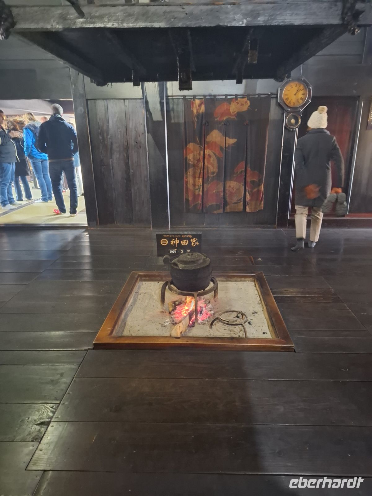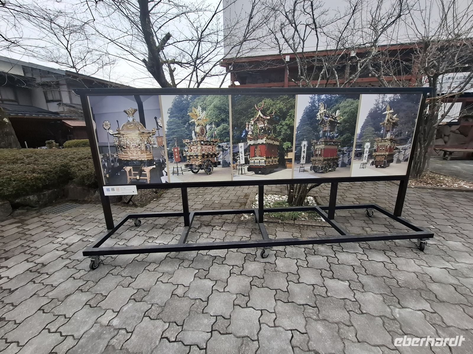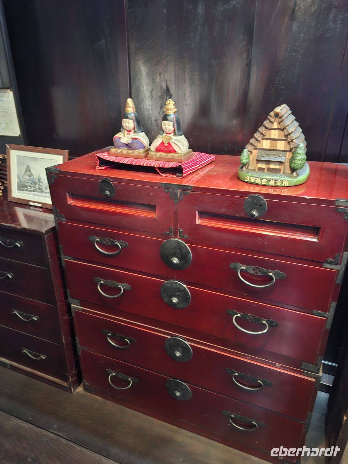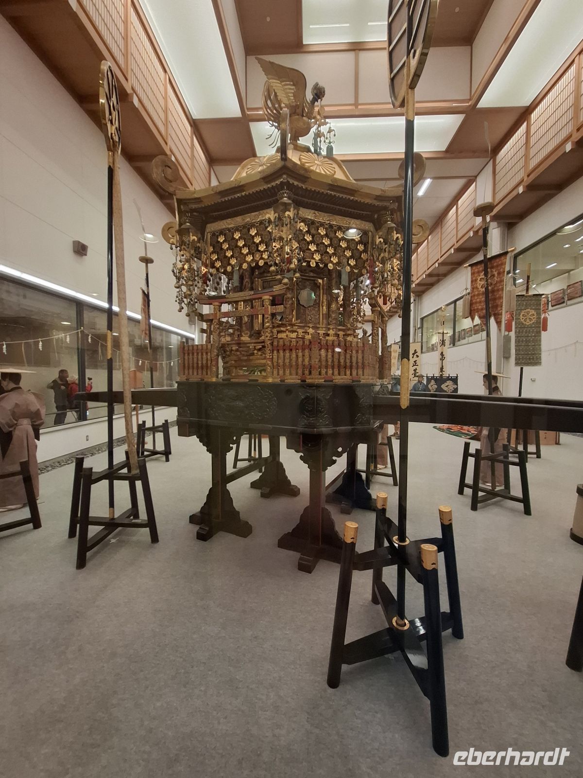 Am späten Vormittag treffen wir uns am Hotel wieder und gemeinsam mit Makino San fahren wir zum ca. eine Stunde entfernten Dorf Shirakawago, ein malerischer Ort mit schilfgedeckten Bauernhäusern, das von der UNESCO in seiner Gesamtheit zum Weltkulturerbe erklärt wurde. Gemeinsam mit Gudrun spazieren wir entlang der Straßen, da wir noch ein wenig Zeit haben, bis wir eines der Häuser von innen besichtigen dürfen. Aber hinter jeder Ecke verbirgt sich ein neues, tolles Fotomotiv. Das Dorf, das auch heute noch von ca. 1.600 Einwohnern belebt wird, würde in Deutschland unter dem Begriff Museumsdorf zu erleben sein. Bis 1929 betrieb man hier in Shirakawago noch Seidenraupenzucht und es war nicht unüblich, dass bis 40 Personen in einem der Häuser gemeinsam lebten. Schließlich dürfen wir eines der Kanda-Häuser betreten und bei einer Führung lauschen wir den Ausführungen Gudruns zum Aufbau eines solchen Hauses, was wichtig war für die Einrichtung und sie zeigt uns auch die reetgedeckten Dächer von Innen. Nach einer gewissen Zeit, die wir individuell in Shirakawago gestalten, kehren wir nach Takayama zurück und besuchen den Kaikan Takayama Yatai, der sich vor dem wichtigen Shinto Schrein Sakurayama Hachimangu befindet. Hier bestaunen wir die berühmten Yatai-Wagen, die während des sogenannten Takayama Float Cart Festival aus den "Garagen" geholt und präsentiert werden. Diese Wagen bestechen durch ihre Farbenfreude und aufwendigen Details und erzählen von der Geschichte und Tradition der Stadt Takayama.