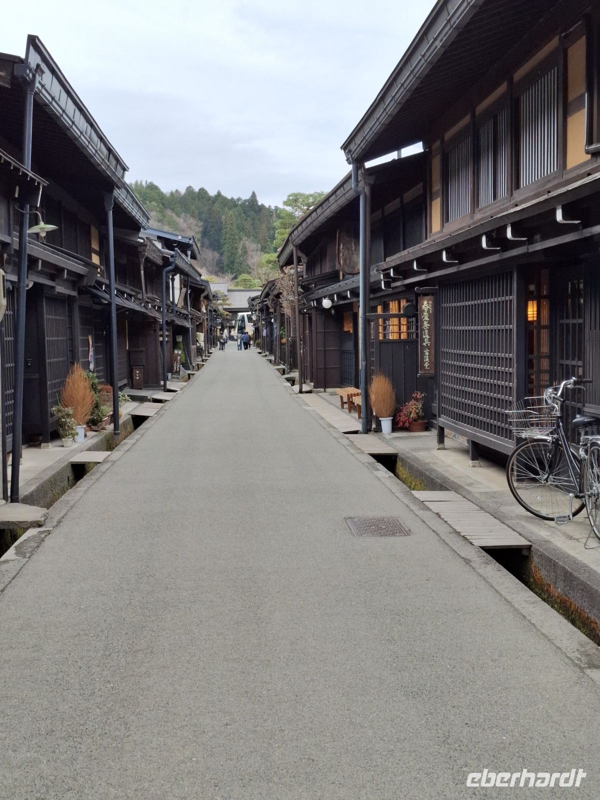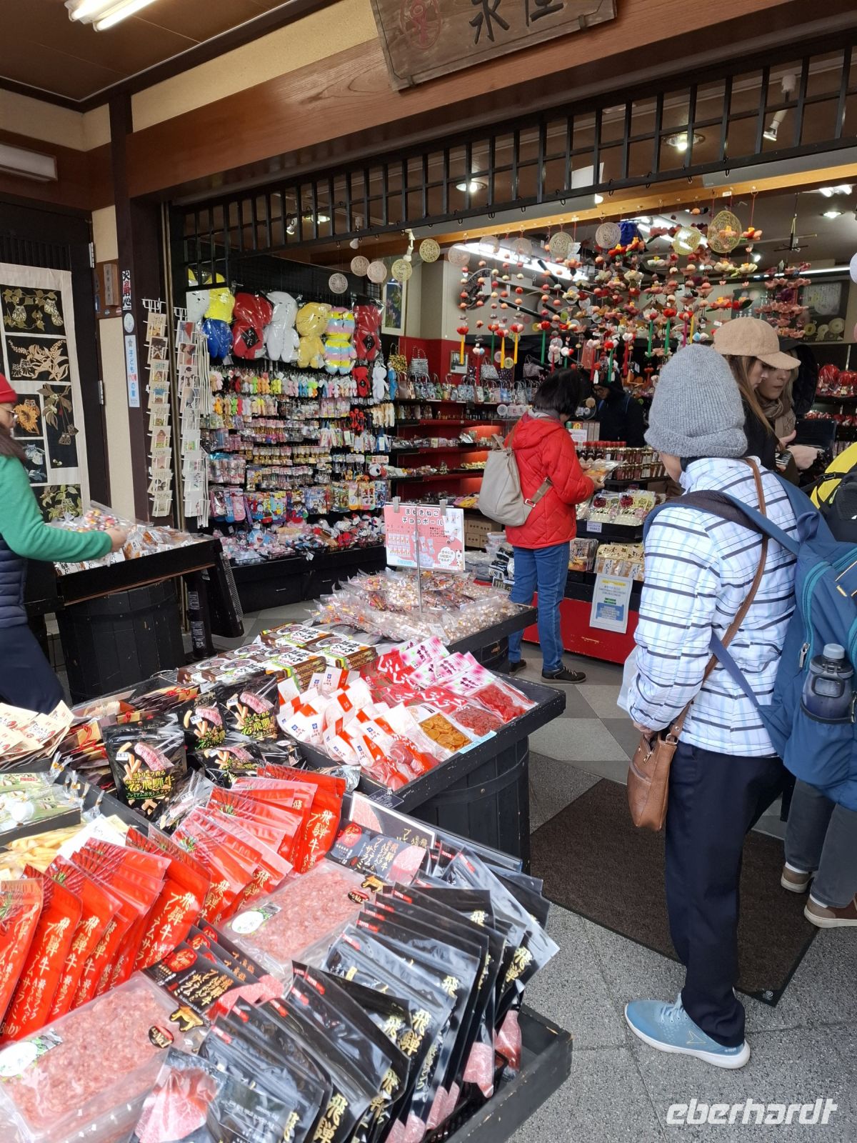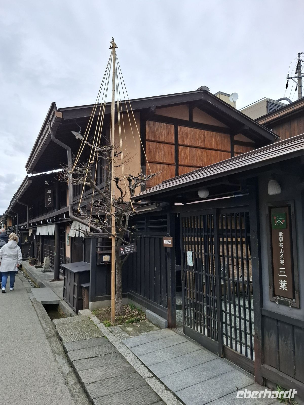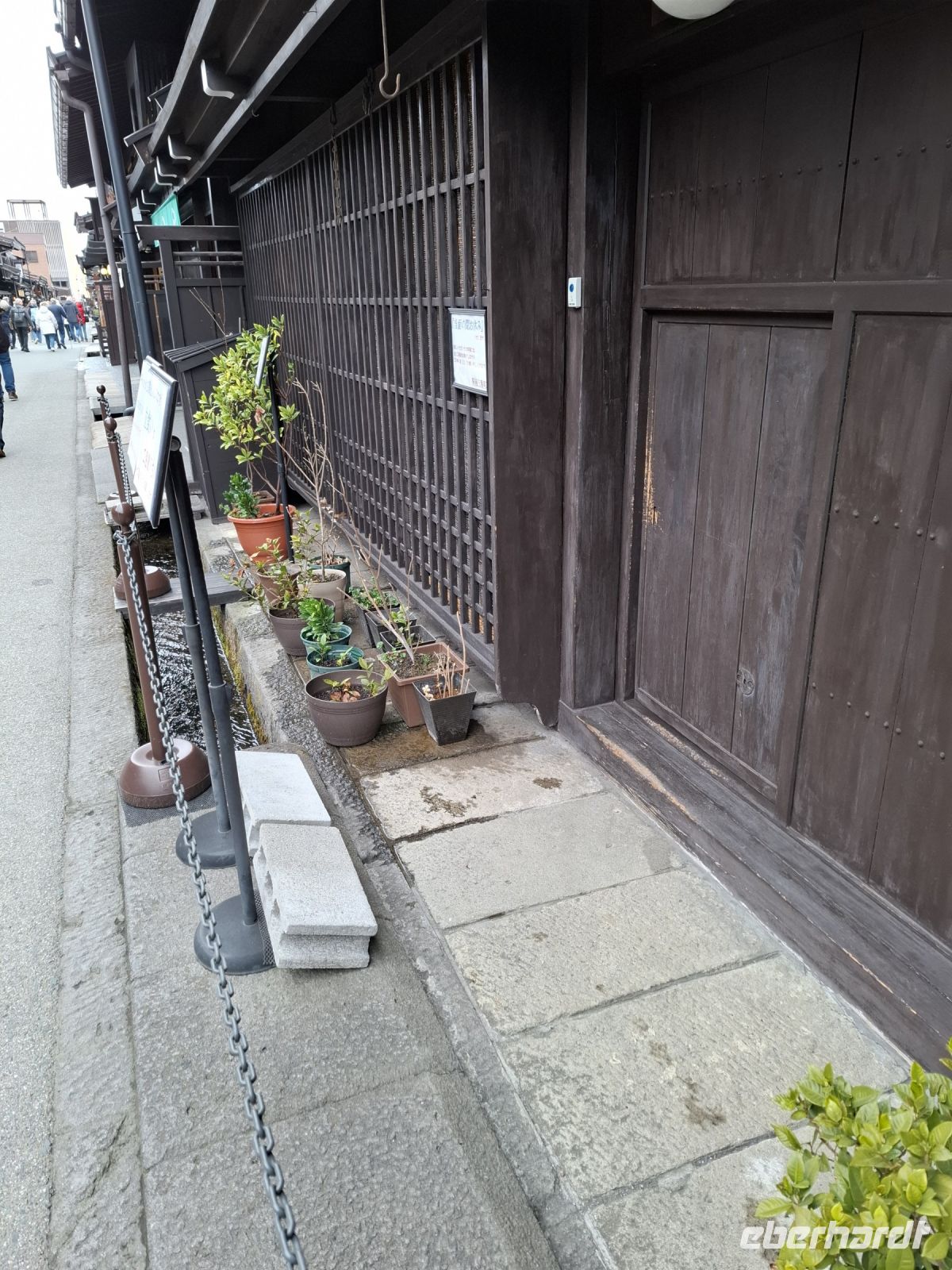 Wir dürfen heute etwas länger schlafen und treffen uns 09:00 Uhr an der Hotelrezeption. Noch schnell werden die letzten deutschsprachigen Stadtpläne ausgeteilt und schon beginnen wir mit unserer kleinen Stadtbesichtigung durch die architektonisch noch gut erhaltene Altstadt Takayamas. Dafür spazieren wir rund 10 Minuten zu Fuß von unserem Hotel bis wir die Hauptgasse/-straße in der Altstadt erreicht haben. Wir flanieren entlang der Straße und Gudrun erzählt uns die ein oder andere wichtige Information zu den Läden und Restaurants, die langsam aber sicher zum Leben erwecken, sozusagen langsam ihre Ladentüren öffnen. Hier gibt es neben Souvenirs auch die Ess-Stäbchen zu kaufen, für deren Produktion Takayama bekannt ist. Anschließend schlendern wir über den großen Morgenmarkt, der sich entlang des Flusses Myagawas erstreckt. Auch hier findet sich der ein oder andere Souvenirladen aber auch kleine Imbisse an den man süße Leckereien, Süßkartoffelbrei aber auch Fisch sowie frisches Obst kaufen kann. Der Einblick ist schon sehr interessant, auch wenn es uns aufgrund des kalten Wetters ziemlich fröstelt. Nachdem Gudrun ihre Ausführungen beendet hat, genießen wir ein wenig freie Zeit, die wir zum Einkauf von Souvenirs nutzen sollten, denn so viel Freizeitmöglichkeiten werden wir in den kommenden Tagen nicht mehr haben um zu shoppen.